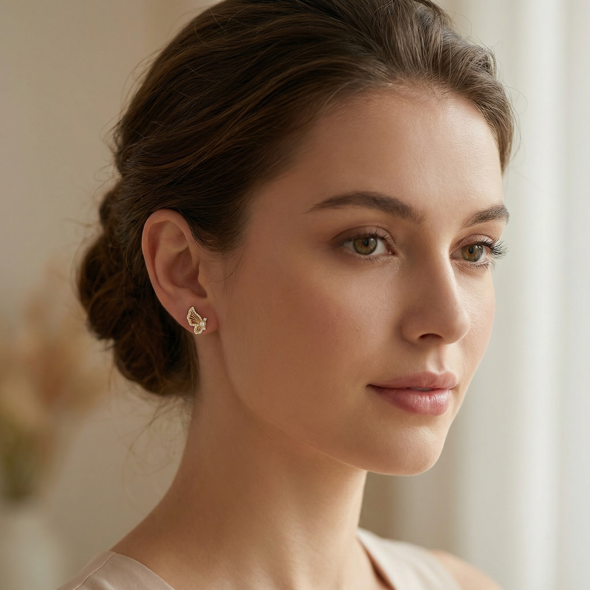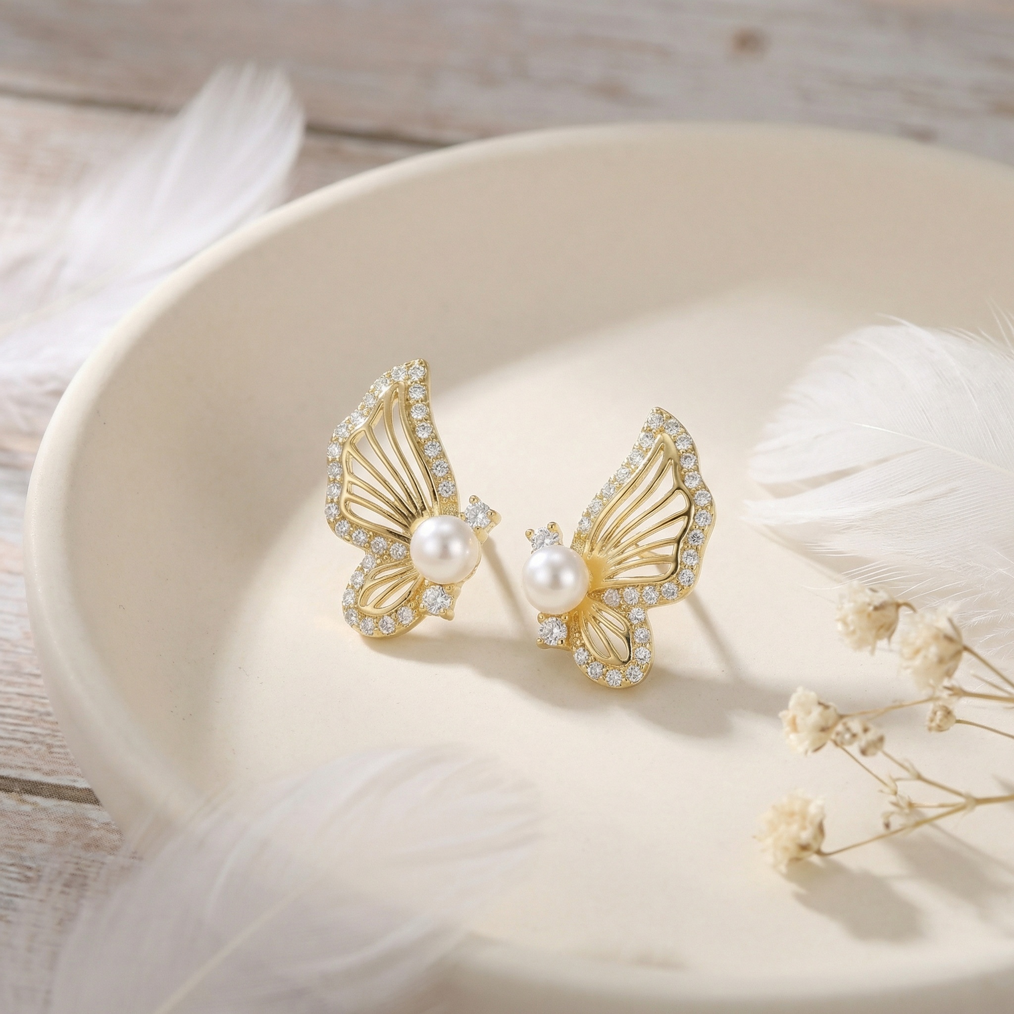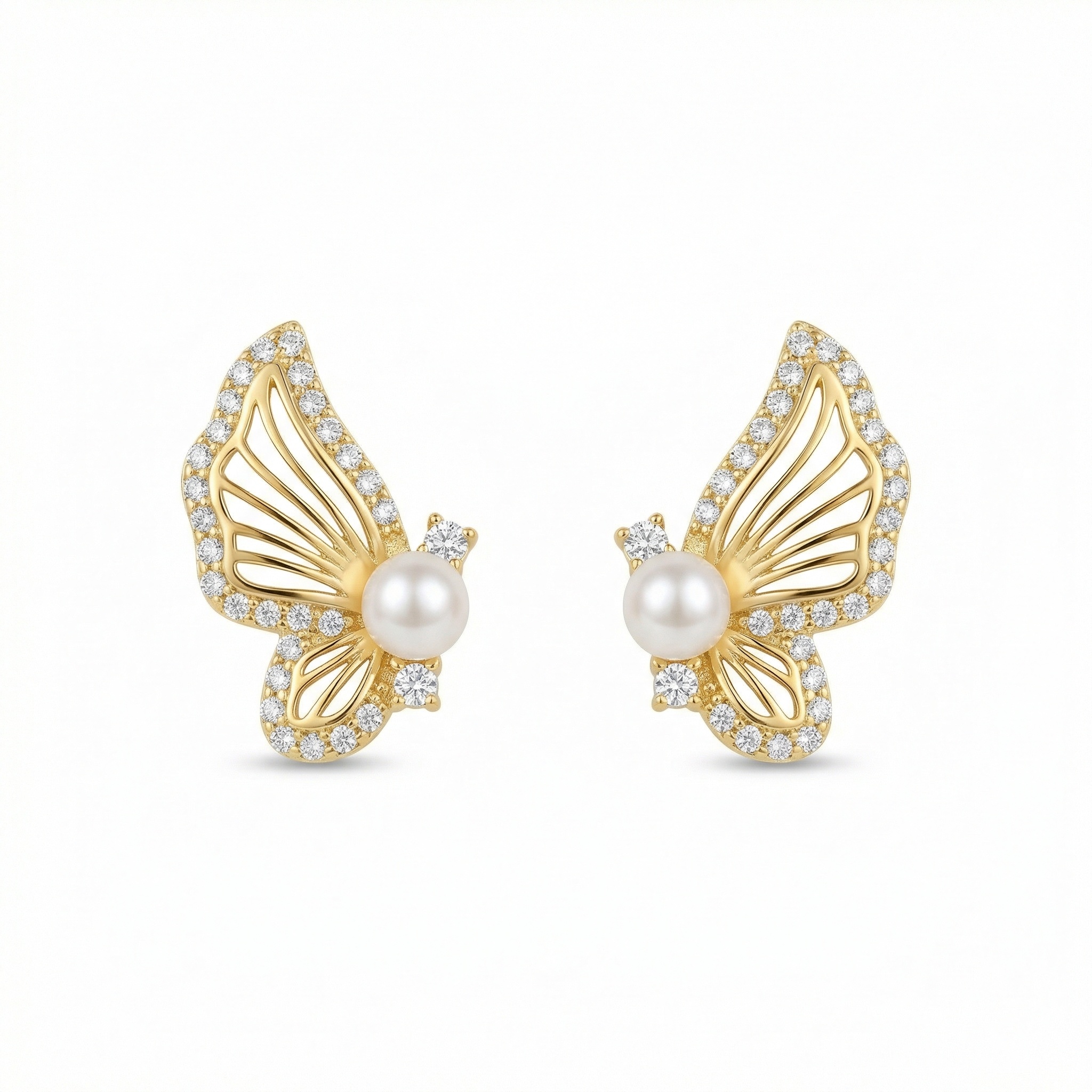 These stunning butterfly wing earrings capture the delicate beauty of nature in a sophisticated design. Crafted with a warm metallic luster, each earring features a gracefully curved wing silhouette adorned with a sparkling row of pavé-set white stones along the outer rim. At the heart of each piece sits a perfectly round, creamy white pearl that serves as the butterfly's body, flanked by two larger brilliant-cut accent stones for added radiance. The intricate openwork detailing within the wings creates a sense of lightness and ethereal charm. Perfect for both everyday elegance and special occasions, these earrings offer a timeless look that blends classic pearl sophistication with modern whimsical flair. Securely held with stud backings, they are a versatile addition to any jewelry collection, symbolizing grace and transformation. | Brand: jewelryodm