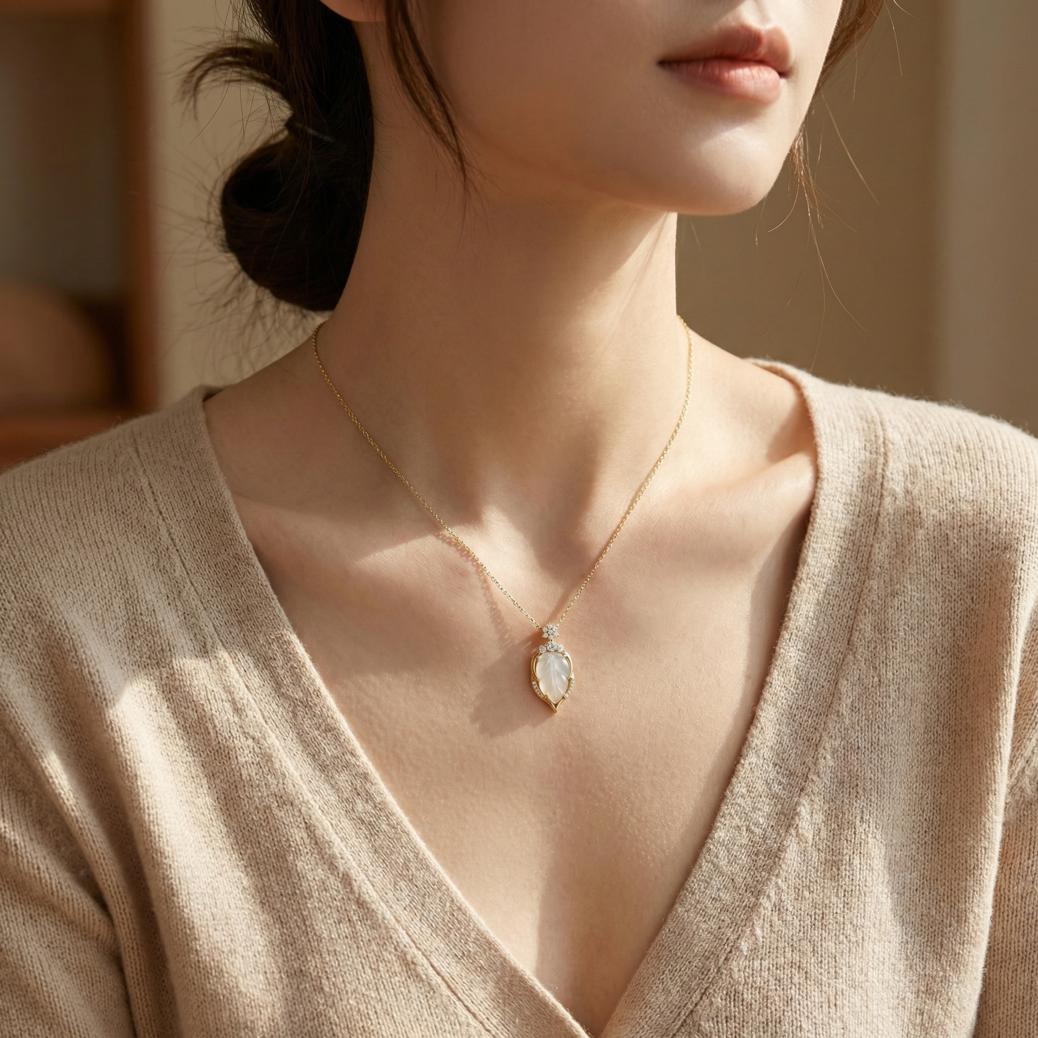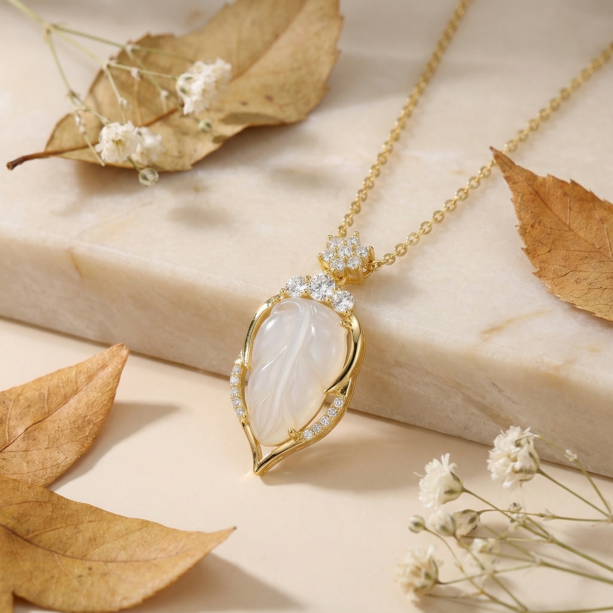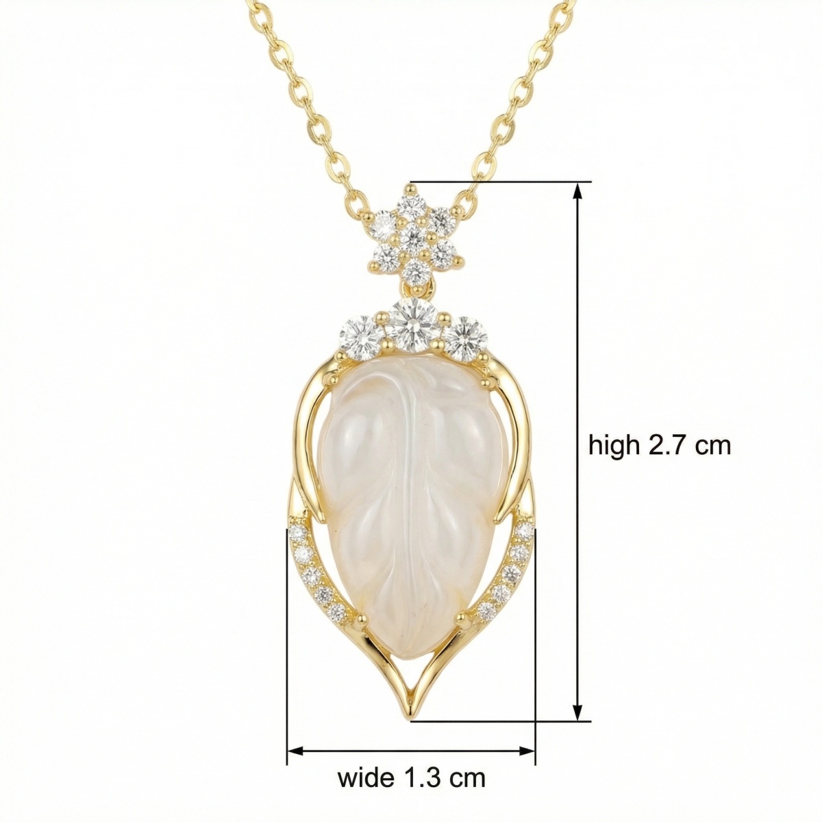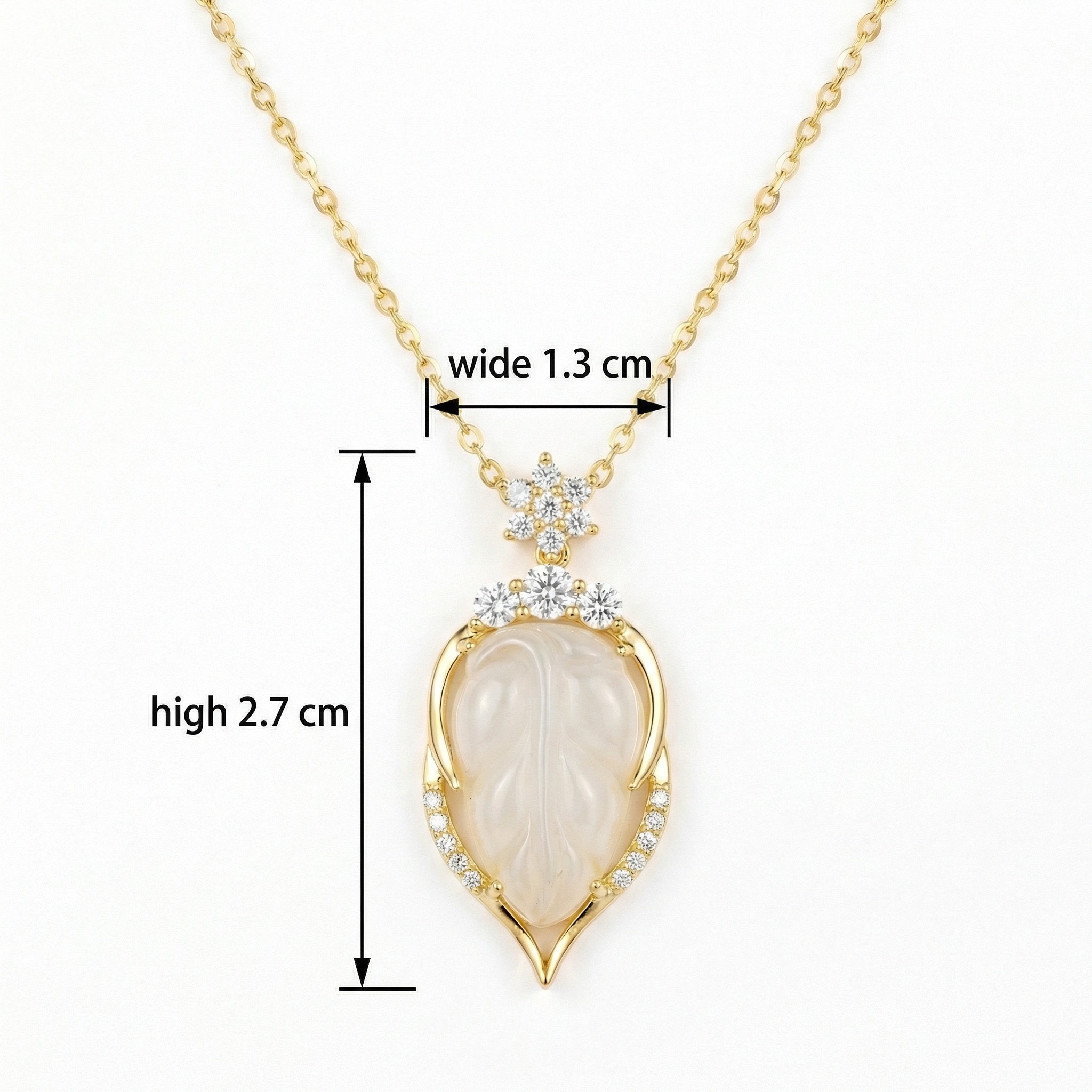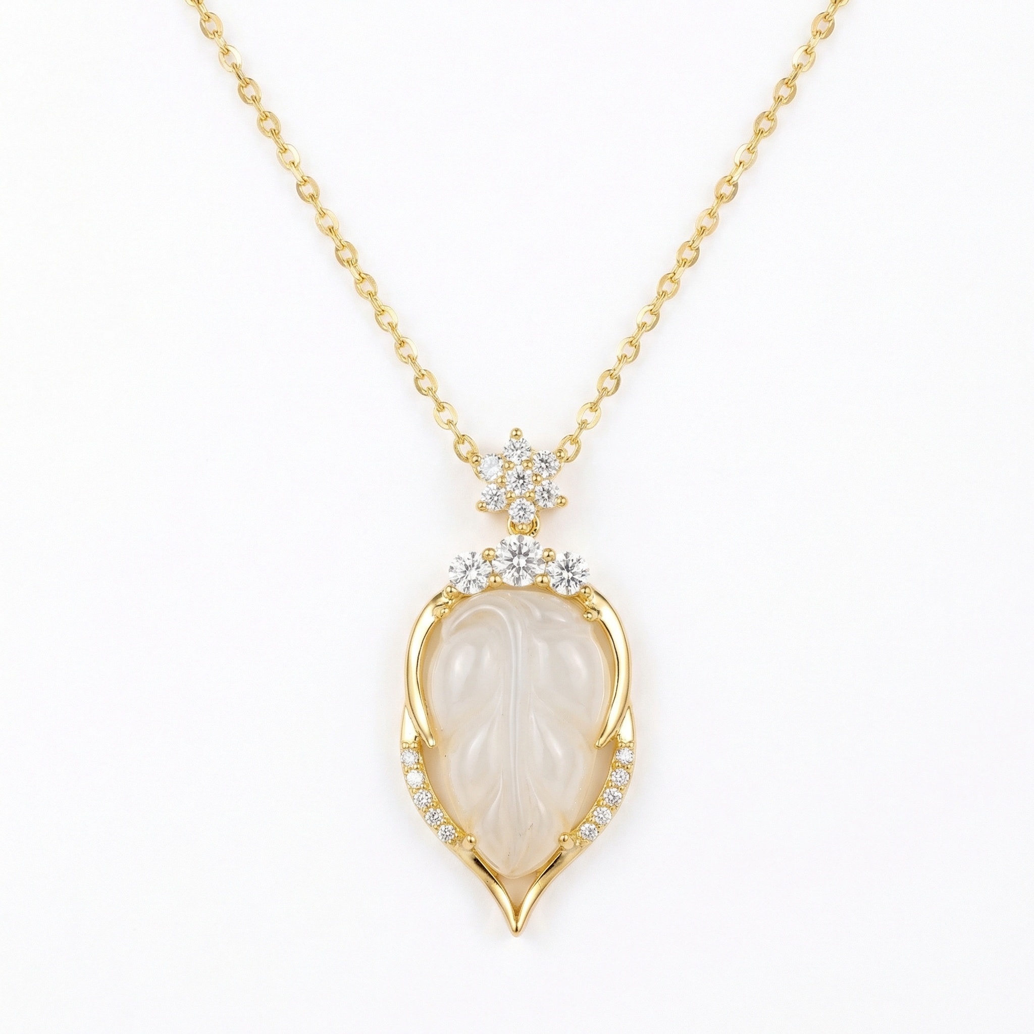 This exquisite necklace showcases a finely carved white jade pendant shaped like a delicate leaf, capturing the essence of natural beauty. The translucent gemstone is encased in a polished setting that enhances its soft glow. Adorning the bail is an intricate floral motif set with brilliant round diamonds, while three larger stones crown the top of the leaf for added radiance. The lower portion of the frame is delicately pave-set with shimmering accents, creating a seamless play of light. Suspended from a graceful cable chain, this piece offers a sophisticated blend of classic jade artistry and contemporary luxury. Ideal for special occasions or daily elegance, it serves as a timeless statement of grace and refinement. | Brand: jewelryodm