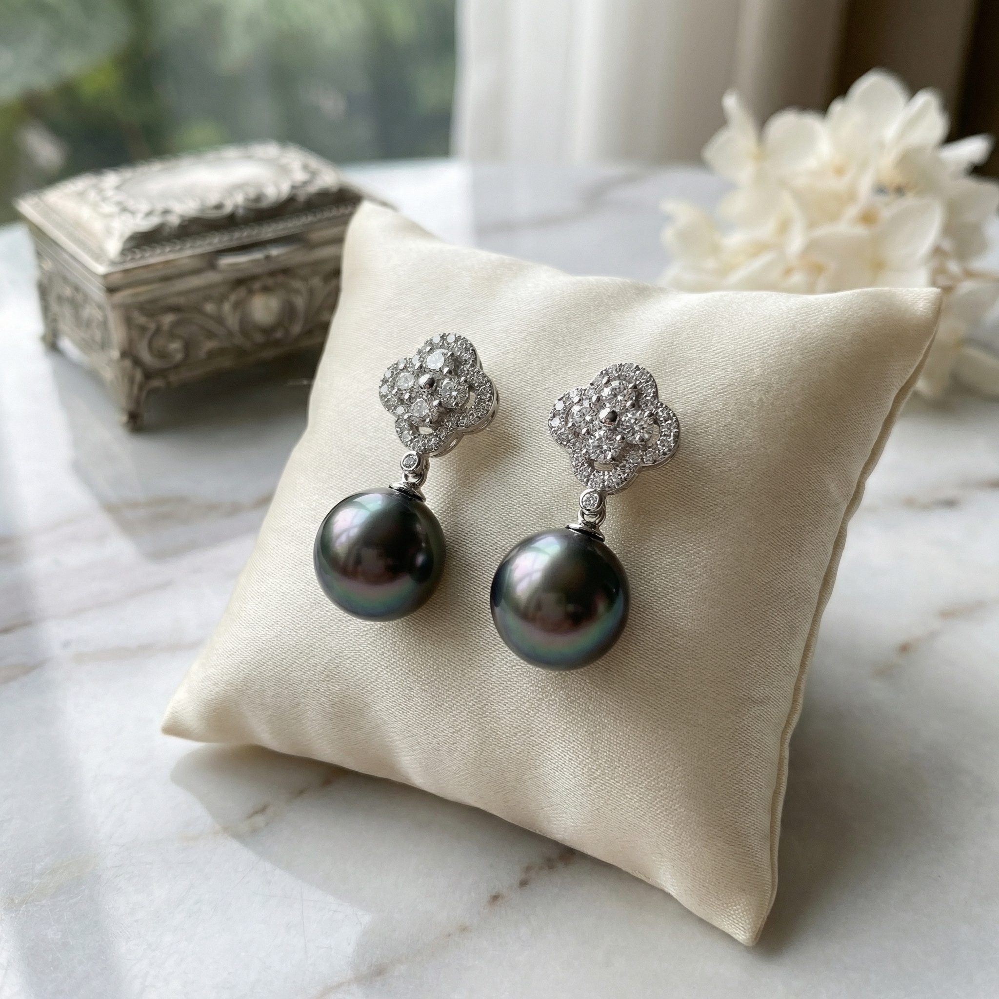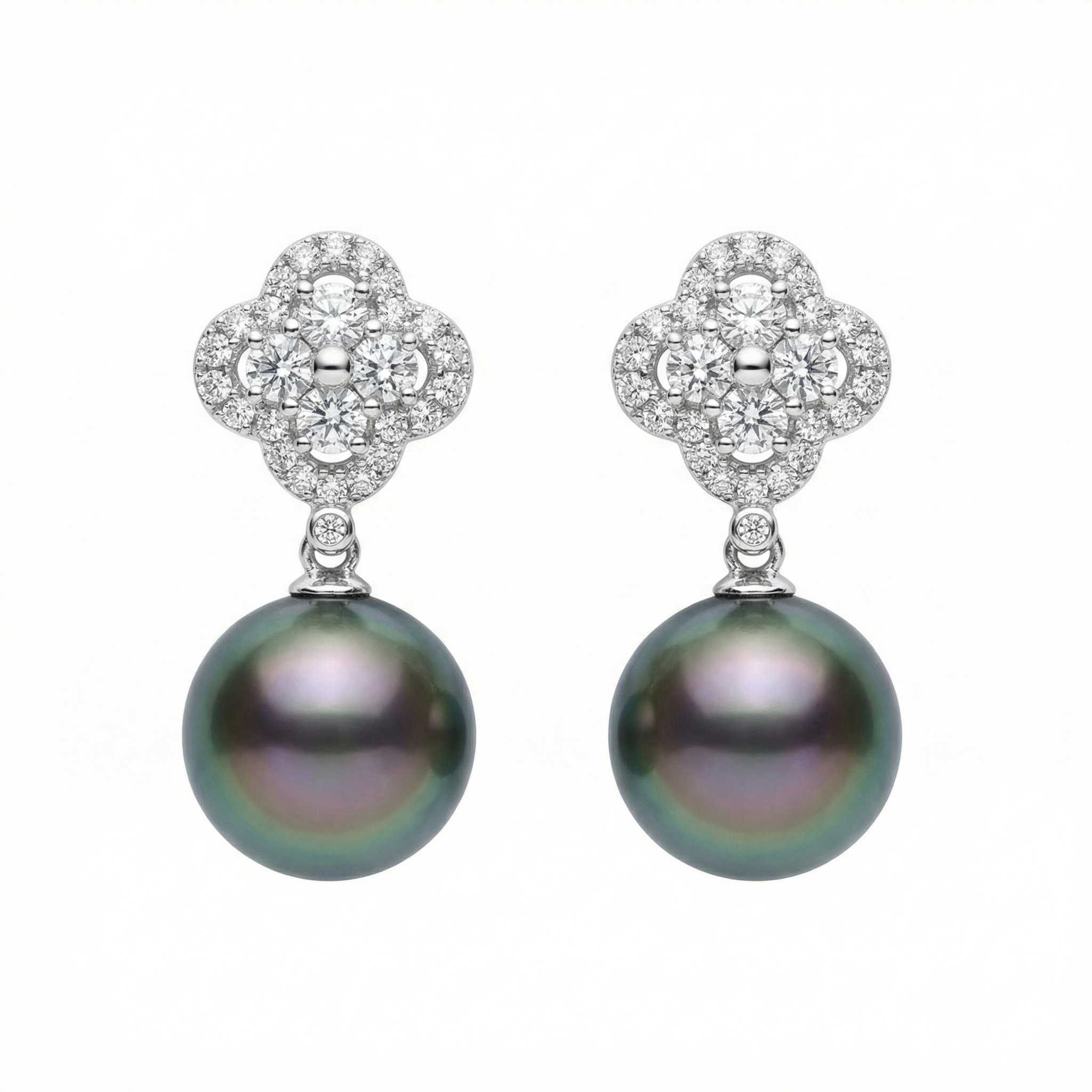 These exquisite drop earrings combine the timeless allure of Tahitian pearls with the sophisticated sparkle of diamonds. Each earring features a lustrous, round Tahitian pearl with deep peacock overtones of green and purple. Suspended from a brilliant clover-shaped stud, the pearls sway gracefully with every movement. The quatrefoil design is meticulously set with shimmering round diamonds, creating a luxurious and floral-inspired aesthetic. Crafted in a polished white precious metal, these earrings offer a refined contrast between the dark, iridescent pearls and the white brilliance of the stones. Perfect for special occasions or adding a touch of glamour to evening wear, this pair showcases exceptional craftsmanship and classic elegance. | Brand: jewelryodm