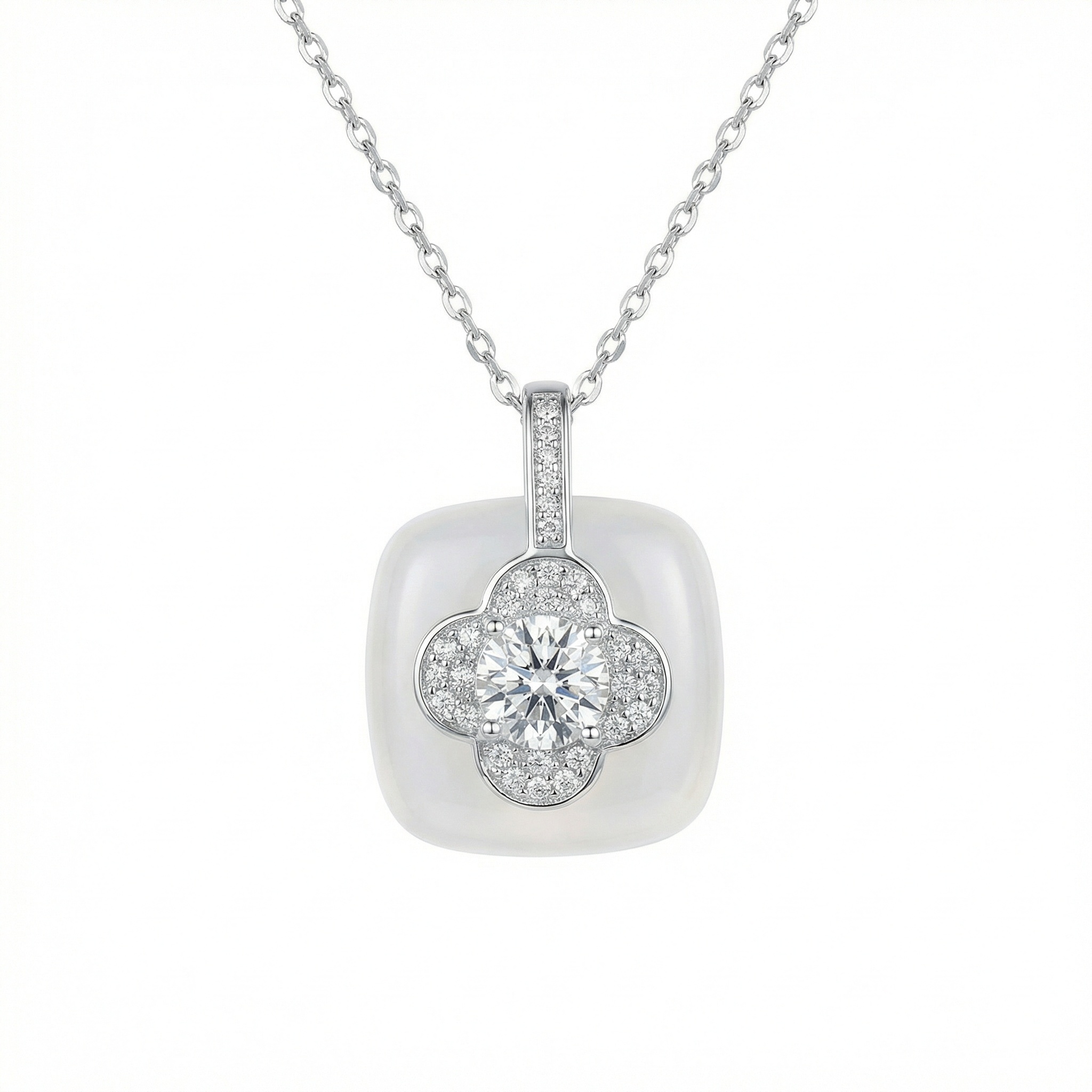 925 Sterling Silver Elegant Diamond Four-Leaf Clover and White Gemstone Pendant Necklace