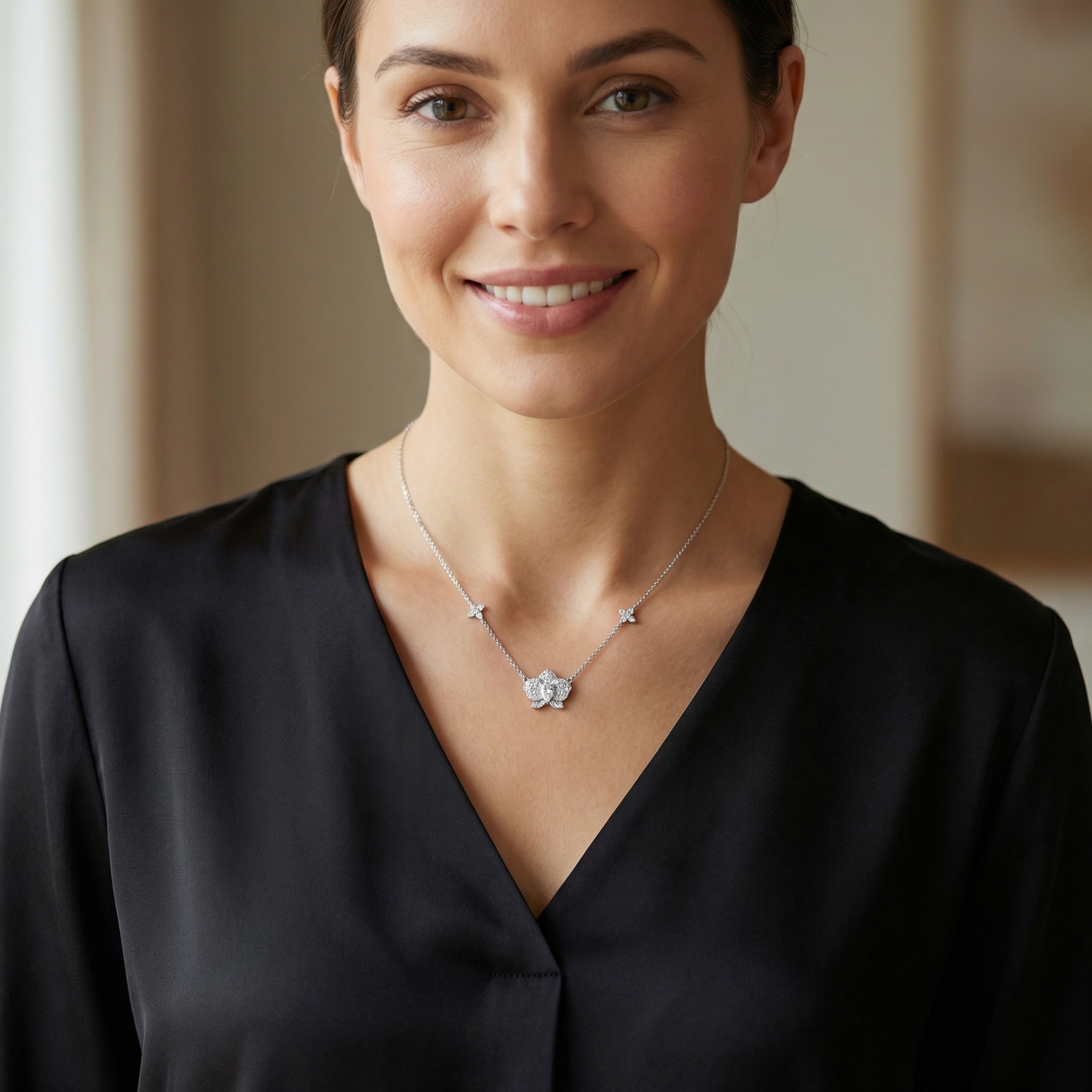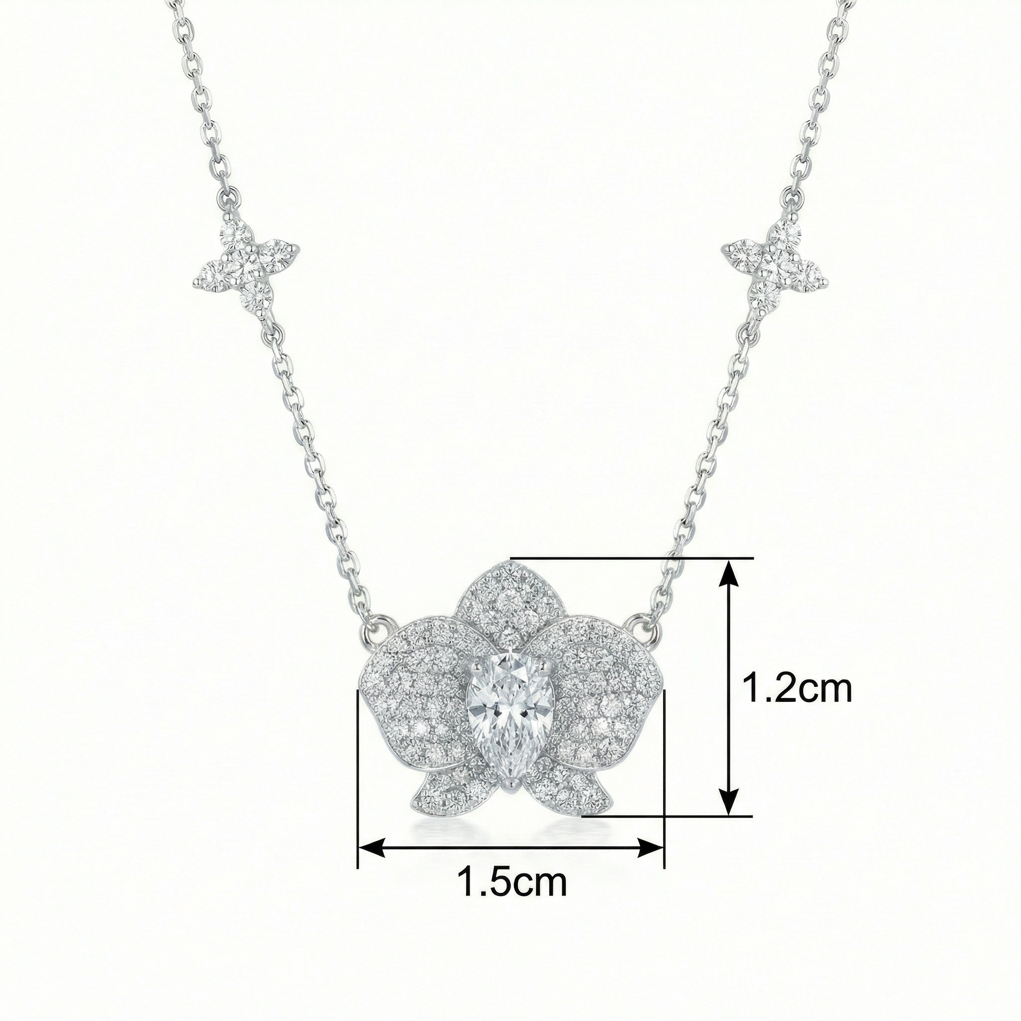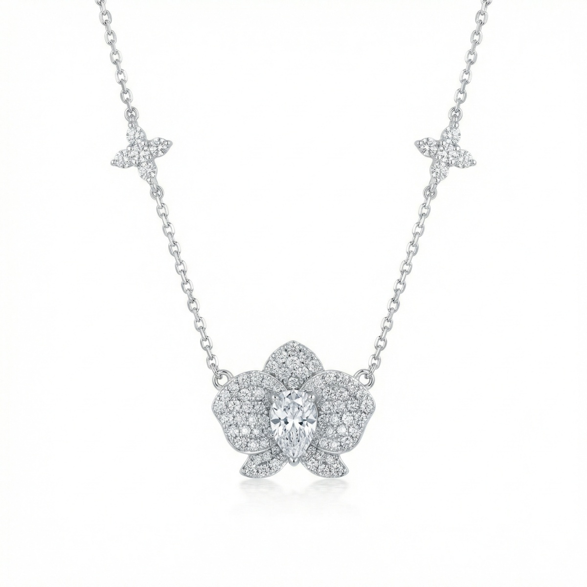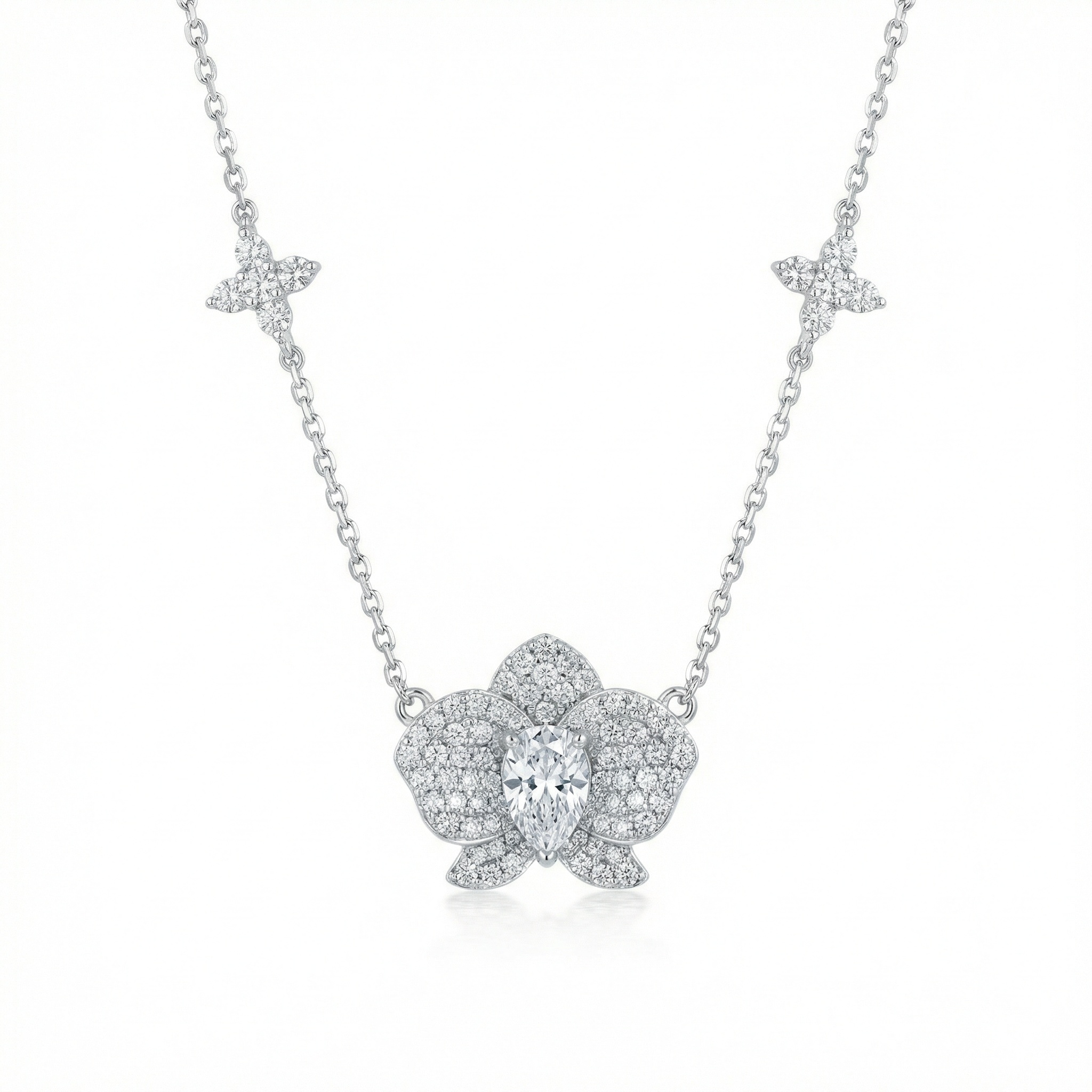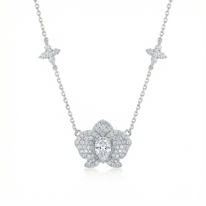 This exquisite necklace features a breathtaking orchid-inspired pendant as its centerpiece, meticulously crafted in a lustrous silver-tone finish. At the heart of the floral design is a brilliant pear-cut gemstone, surrounded by intricately layered petals encrusted with pavé-set diamonds that capture and reflect light from every angle. The delicate link chain is further accented with two matching clover-shaped motifs, providing a balanced and symmetrical aesthetic. Combining the ethereal beauty of a blooming orchid with sophisticated craftsmanship, this piece serves as a timeless symbol of elegance and grace. Whether worn for a formal gala or to elevate a sophisticated daily ensemble, its radiant design and nature-inspired charm make it a standout addition to any fine jewelry collection. | Brand: jewelryodm