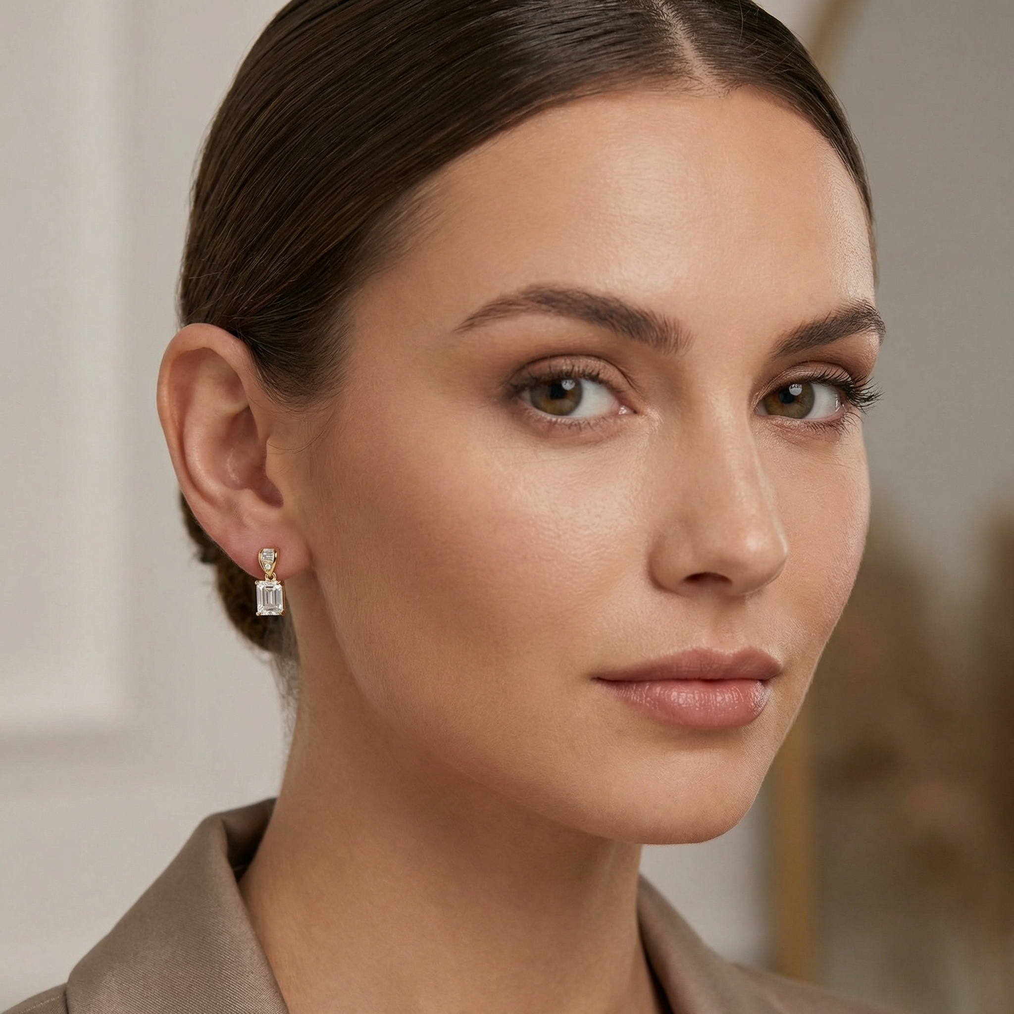 These sophisticated drop earrings showcase a magnificent emerald-cut center stone that radiates timeless brilliance. Each earring is suspended from a delicately crafted bail, embellished with a combination of sparkling baguette and round-cut gems for an extra touch of glamour. Set in a lustrous, warm-toned metallic finish, the design highlights the clean lines and geometric beauty of the faceted stones. The secure prong settings ensure both durability and maximum light reflection, creating a dazzling effect with every movement. Ideal for weddings, gala events, or as a thoughtful gift, these earrings bring a touch of vintage-inspired luxury to any outfit. The harmonious blend of different stone cuts creates a multi-dimensional sparkle that is sure to captivate. Experience the perfect balance of classic style and contemporary elegance with this exquisite pair. | Brand: jewelryodm