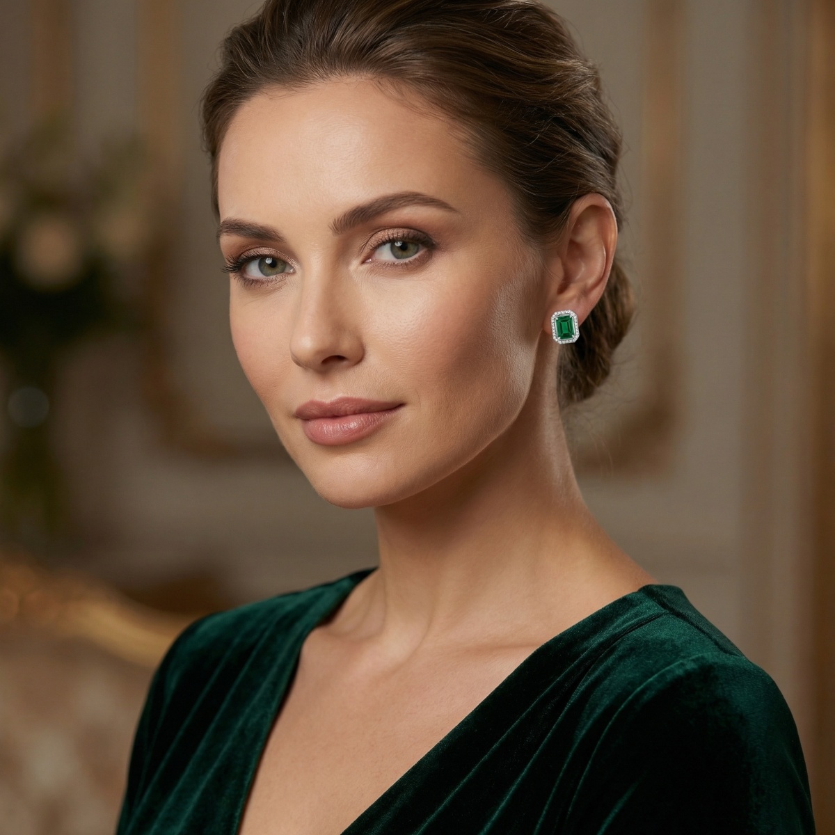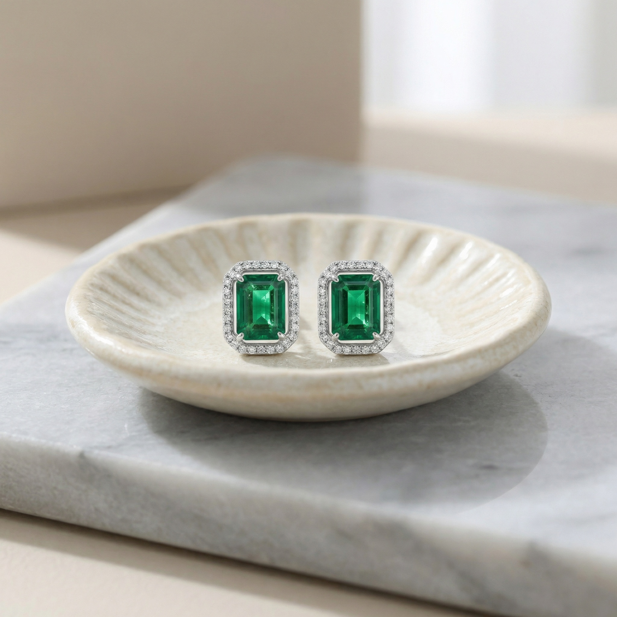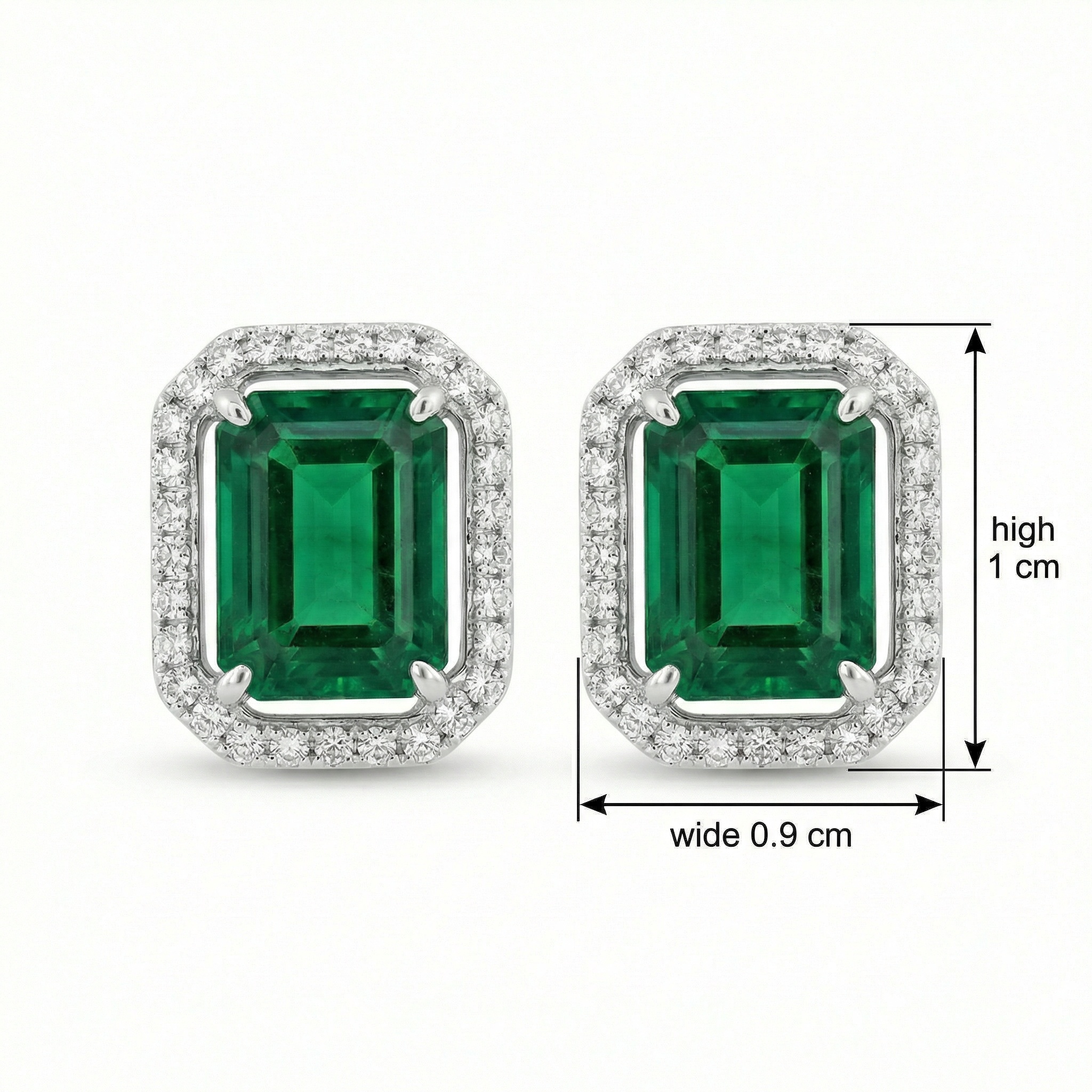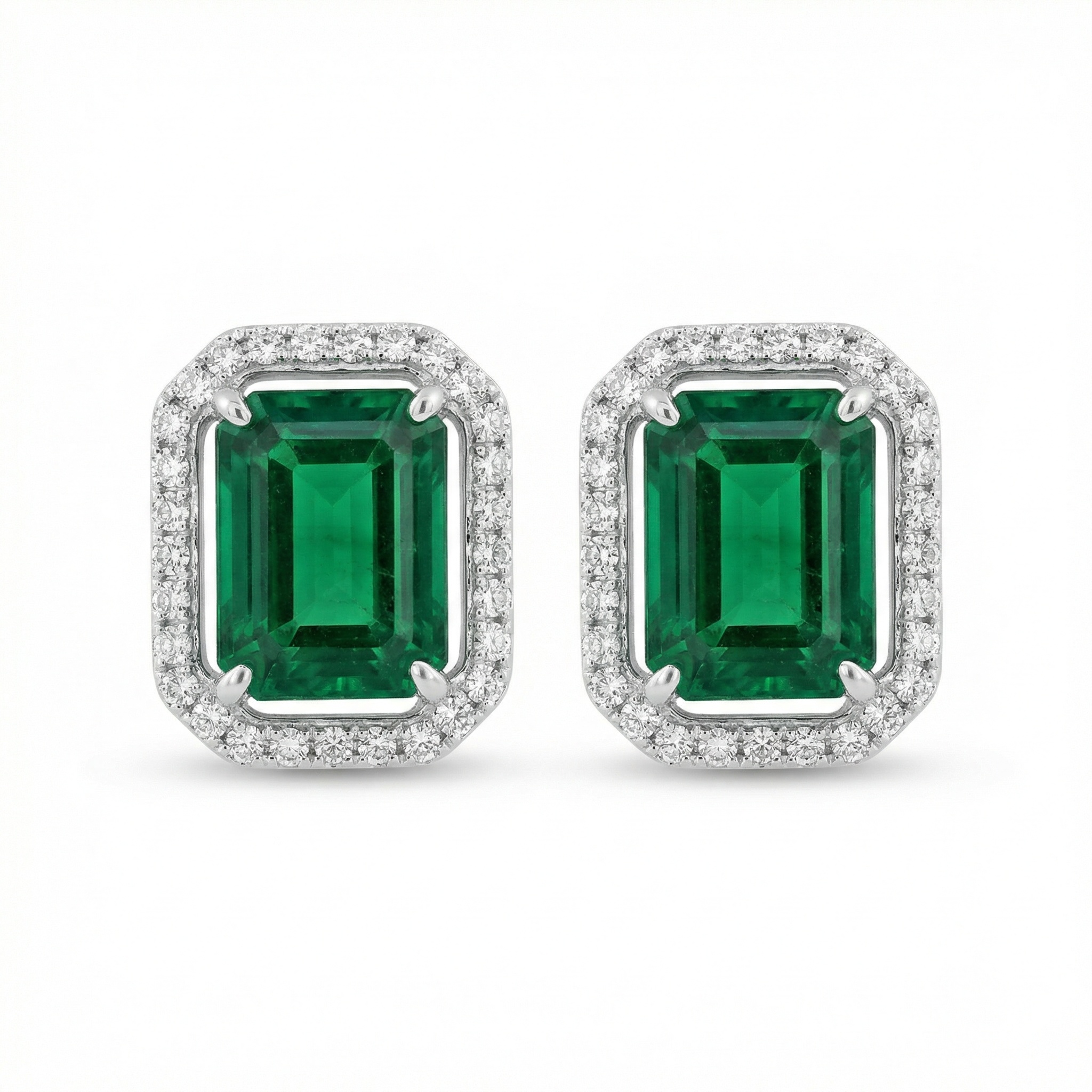 These exquisite stud earrings showcase two vibrant emerald-cut green gemstones, renowned for their deep, captivating color and sophisticated silhouette. Each center stone is elegantly encircled by a halo of brilliant round diamonds, designed to catch the light and enhance the natural beauty of the green gems. The timeless combination of the step-cut facets and the surrounding sparkle creates a look of refined luxury. Crafted in a polished white metal setting, these earrings offer a sleek and modern finish that complements any style. Ideal for adding a touch of glamour to special occasions or elevating everyday attire, these halo studs are a classic choice for a sophisticated look. Their understated elegance and brilliant craftsmanship make them a cherished gift or a standout piece in any jewelry collection. | Brand: jewelryodm