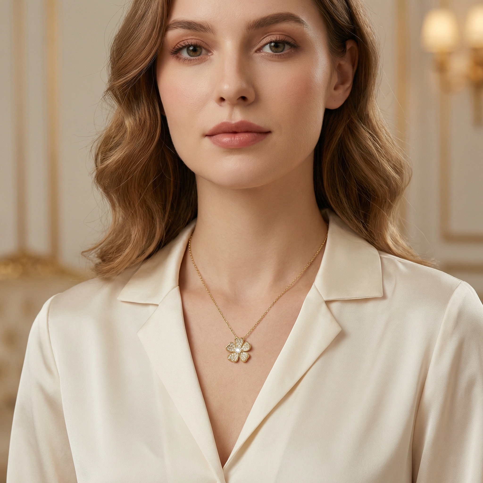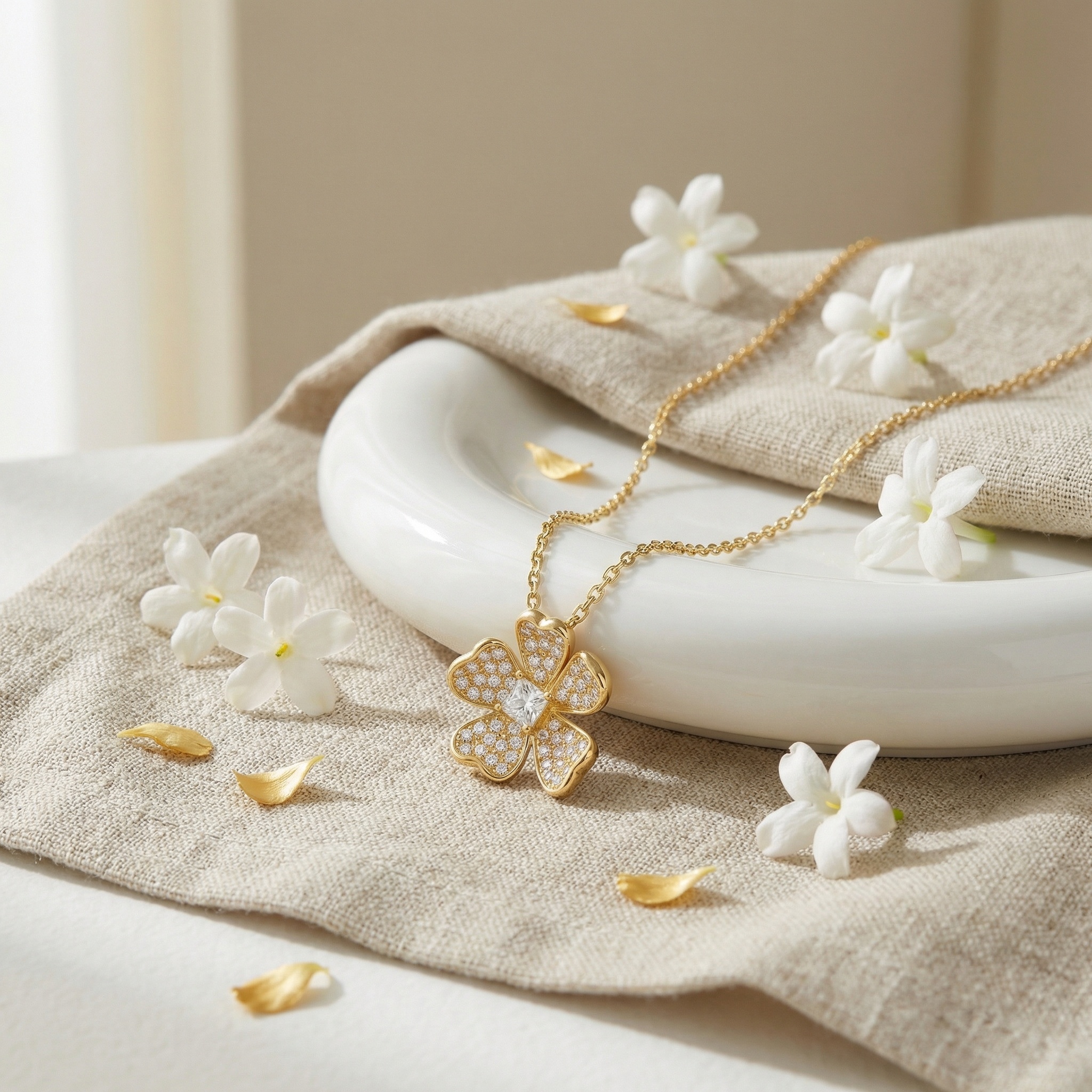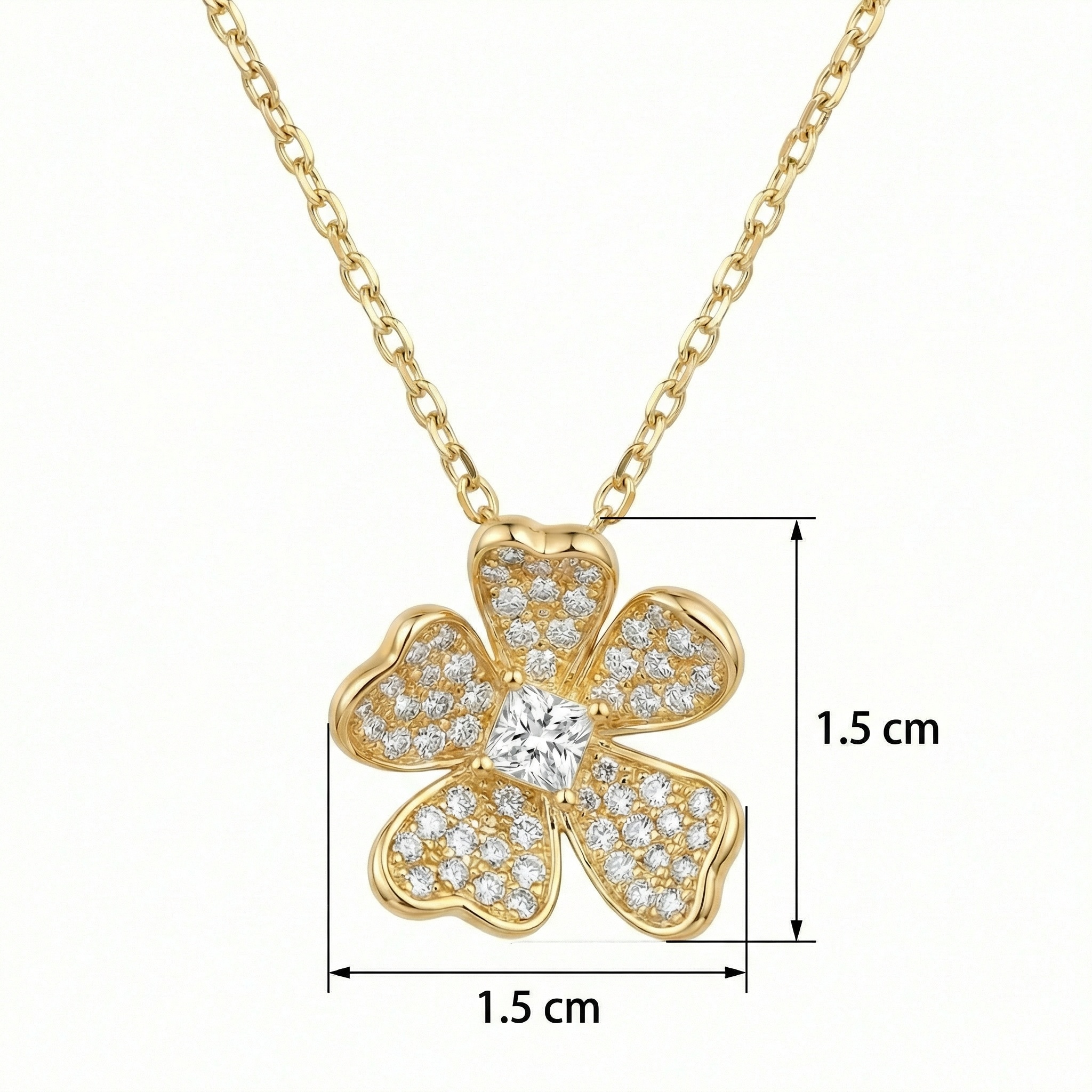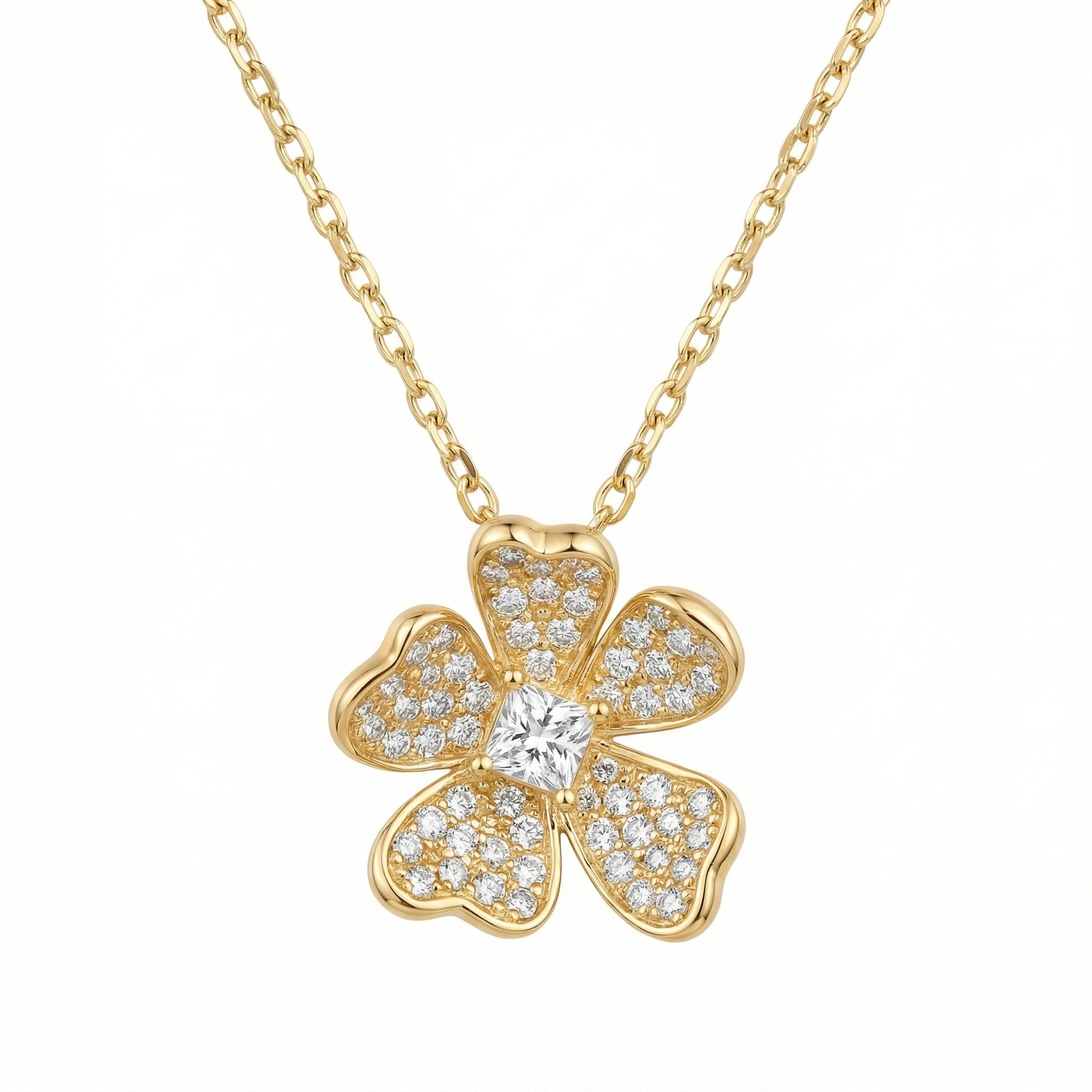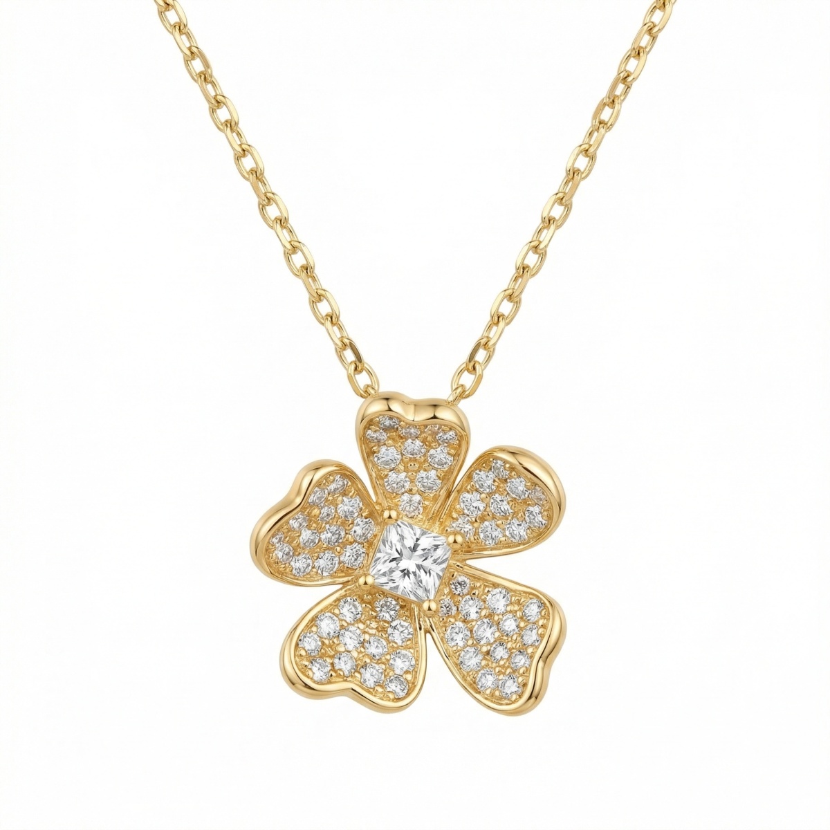 This exquisite pendant features a beautifully crafted five-petal flower design, exuding a sense of timeless elegance and natural grace. Each petal is meticulously adorned with a shimmering pavé of brilliant round diamonds that capture and reflect light from every angle. At the heart of the blossom lies a striking princess-cut diamond, serving as a radiant centerpiece that adds a touch of modern sophistication. The pendant is suspended from a delicate link chain, creating a harmonious and luxurious aesthetic. Its warm, polished finish provides a perfect backdrop for the icy sparkle of the gems, making it a versatile piece suitable for both daily wear and special occasions. This floral-inspired jewelry piece is a celebration of fine craftsmanship, designed to bring a touch of nature-inspired brilliance to any ensemble. | Brand: jewelryodm