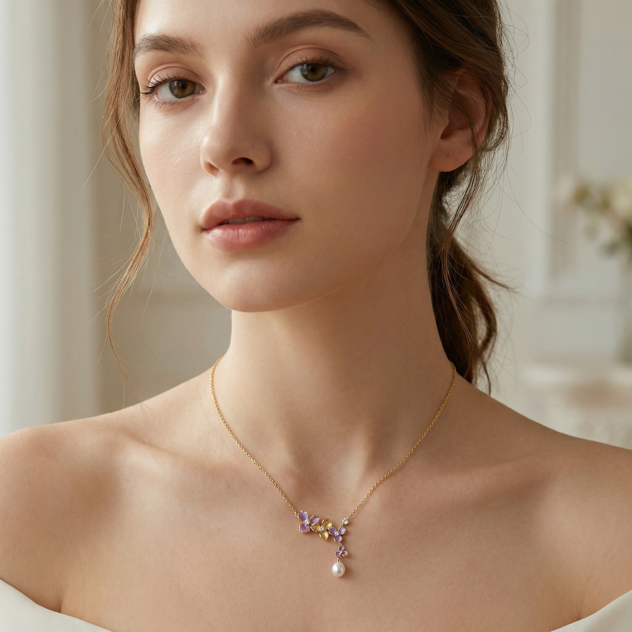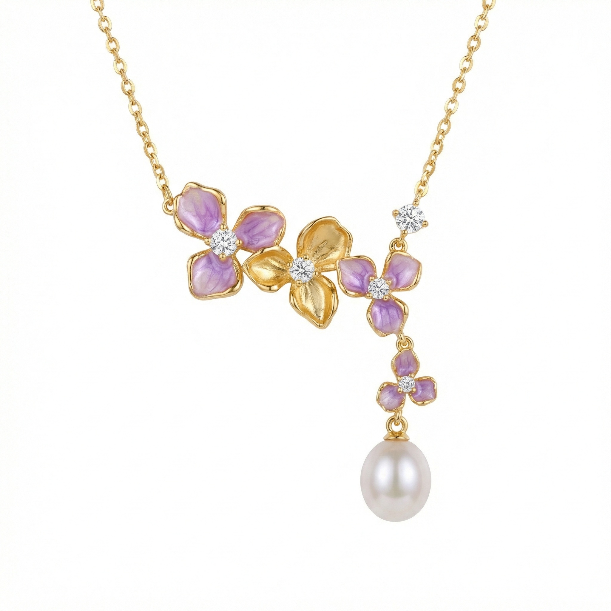 This exquisite necklace features a delicate botanical design, showcasing a cascade of hand-enameled purple flowers paired with a lustrous metallic bloom. Each floral center is adorned with a brilliant, sparkling stone that catches the light beautifully. The design is finished with a graceful, teardrop-shaped white pearl drop that adds a touch of classic sophistication. The fine chain complements the intricate pendant, making it a perfect accessory for special occasions or to add a romantic flair to your everyday attire. Crafted with meticulous attention to detail, this piece captures the essence of a spring garden in bloom, offering a timeless and feminine aesthetic for any jewelry collection. | Brand: jewelryodm