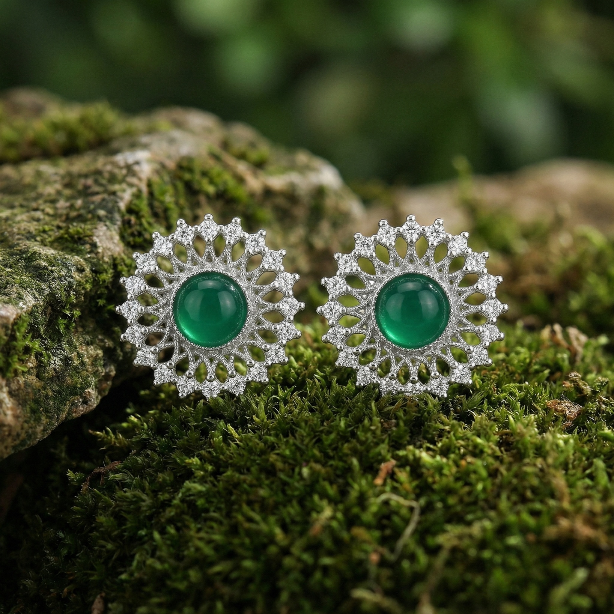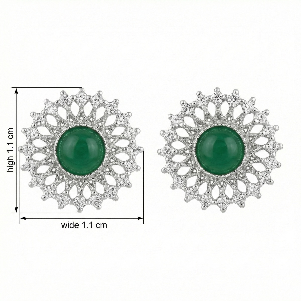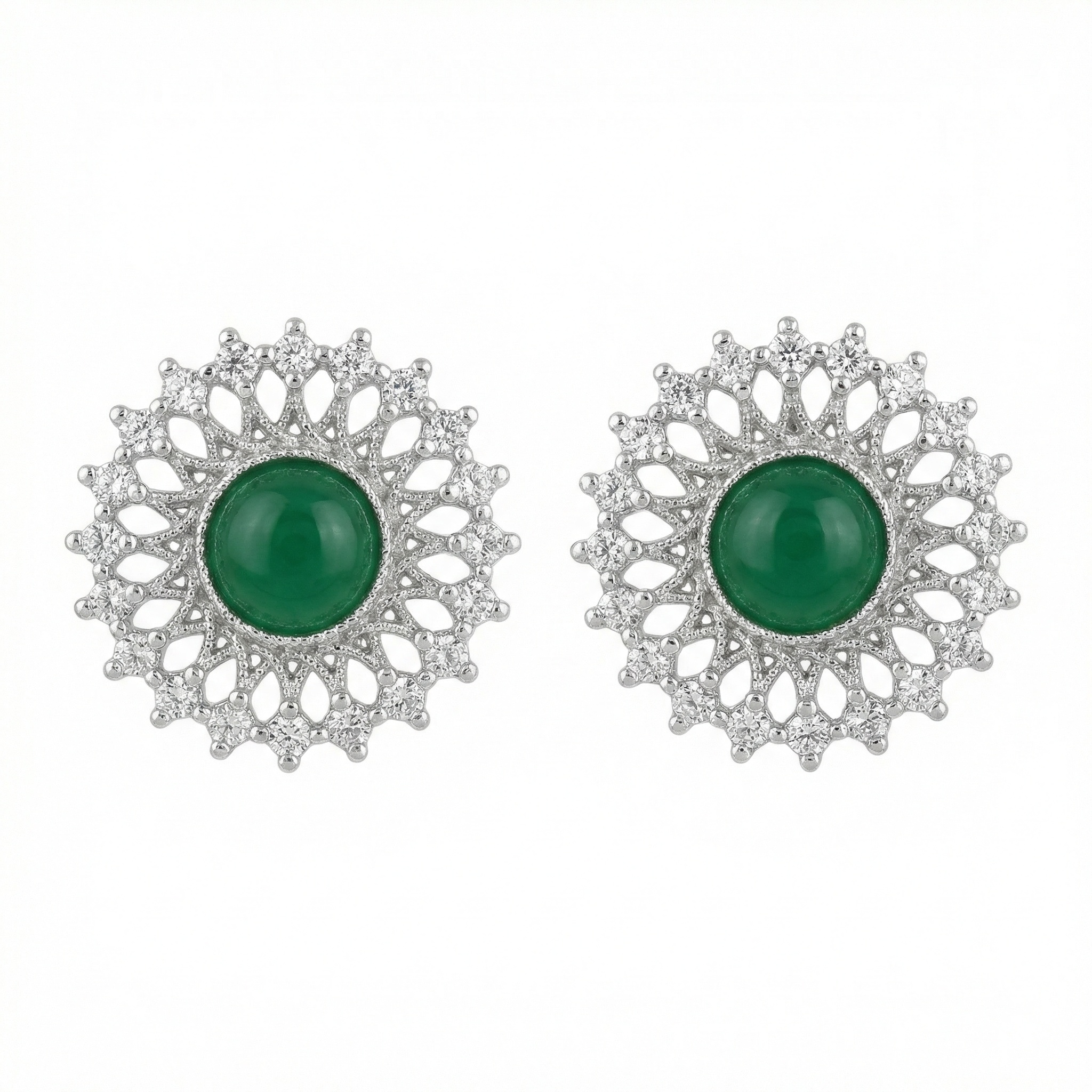 These stunning stud earrings feature a vibrant green cabochon centerpiece, radiating a rich and sophisticated hue. Encased in a delicate silver-toned filigree frame, the design mimics a blooming flower or a vintage sunburst. The outer edge is meticulously adorned with shimmering white cubic zirconia stones, adding a touch of brilliance and luxury to the overall aesthetic. Crafted with intricate detail, these earrings blend classic elegance with a modern twist, making them a perfect accessory for both formal events and everyday wear. The secure stud backing ensures a comfortable fit throughout the day. These timeless pieces serve as a beautiful gift or a personal treat, elevating any outfit with their refined charm and striking color contrast between the deep green and polished silver. | Brand: jewelryodm