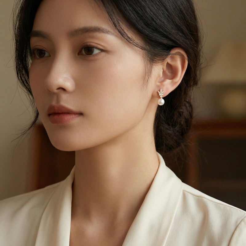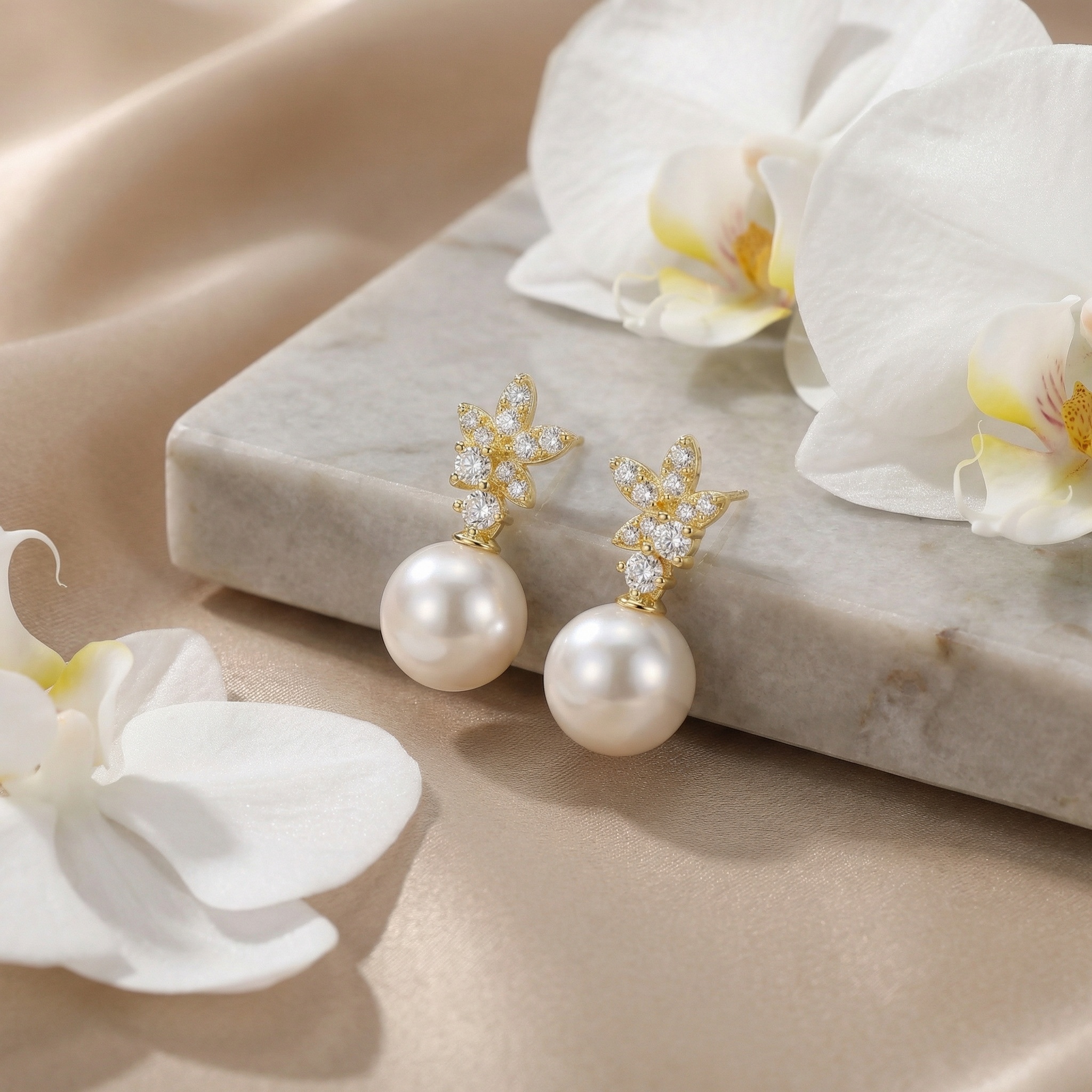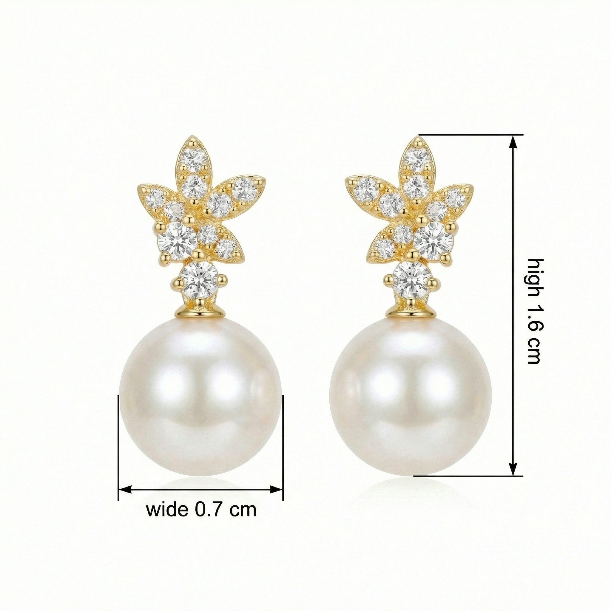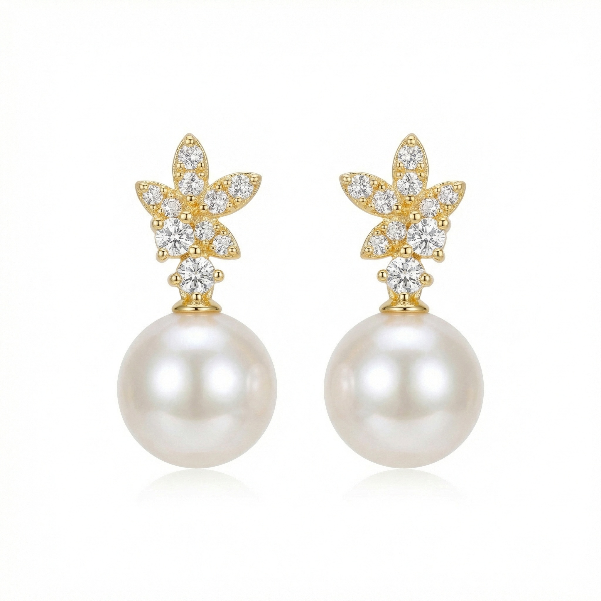 These exquisite earrings feature a stunning combination of nature-inspired design and timeless elegance. At the top, a delicately crafted floral motif shines with numerous brilliant-cut clear stones, catching the light from every angle. Suspending from this sparkling garden is a large, perfectly round white pearl, known for its deep luster and smooth surface. The warm yellow-toned setting beautifully complements the creamy glow of the pearls, creating a luxurious and sophisticated look. Perfect for brides, special occasions, or as a thoughtful gift, these drop earrings offer a refined aesthetic that bridges the gap between classic jewelry and contemporary floral artistry. Their balanced design ensures they remain a centerpiece of any collection, bringing a touch of grace and brilliance to any ensemble. | Brand: jewelryodm