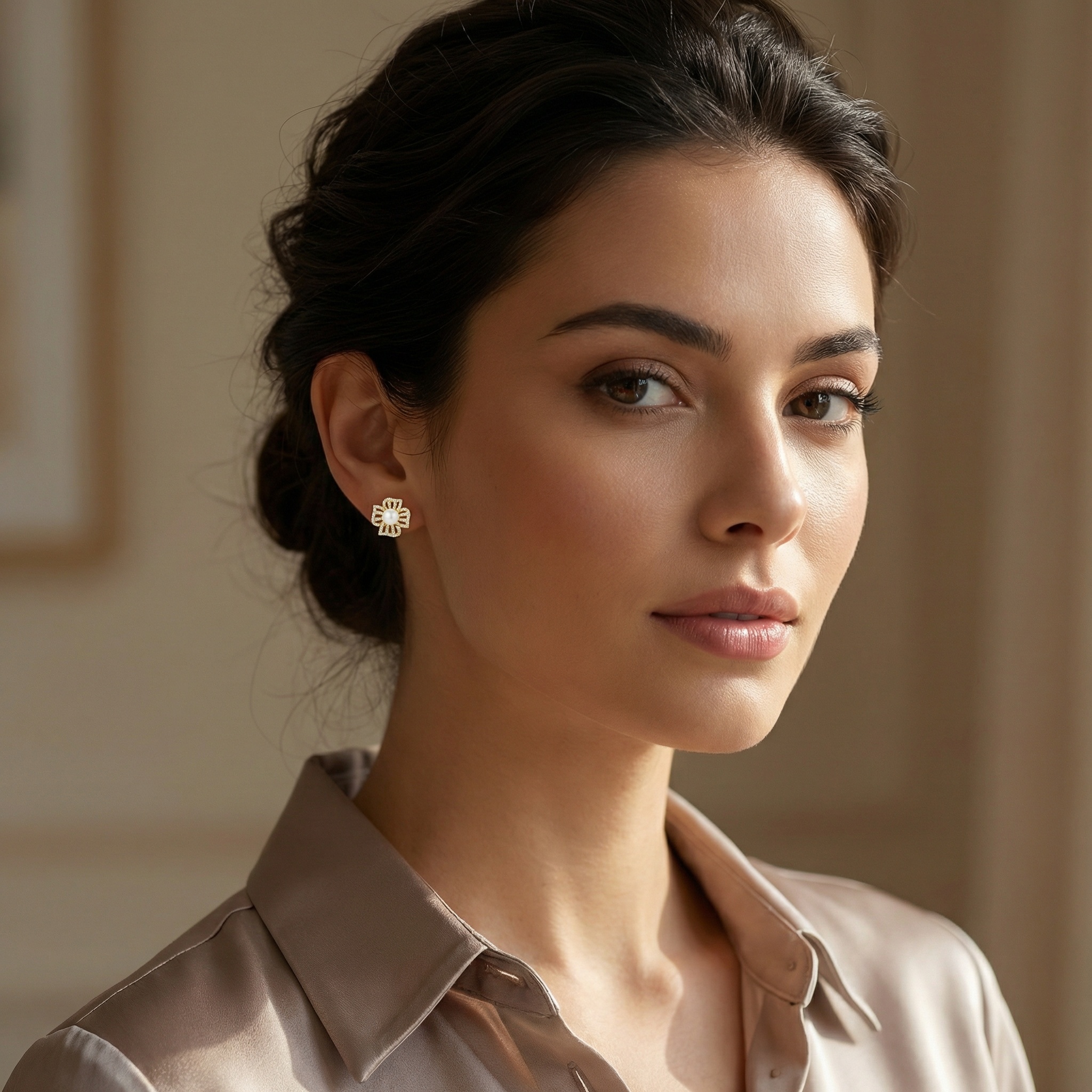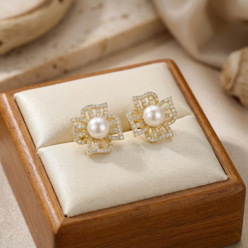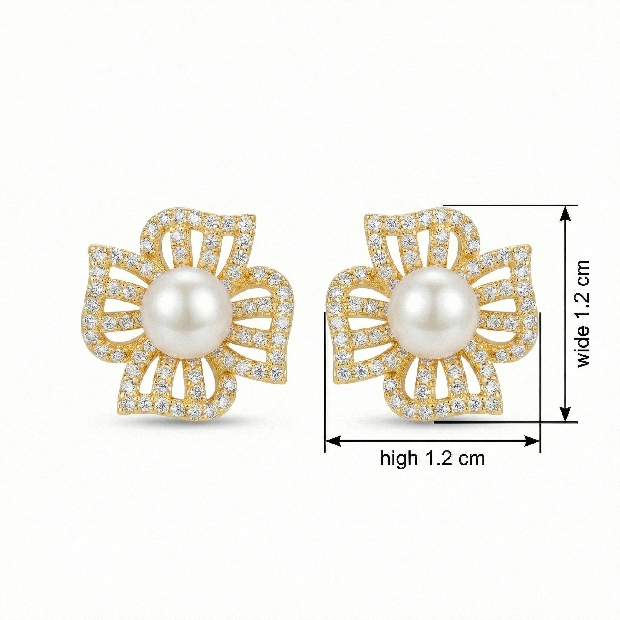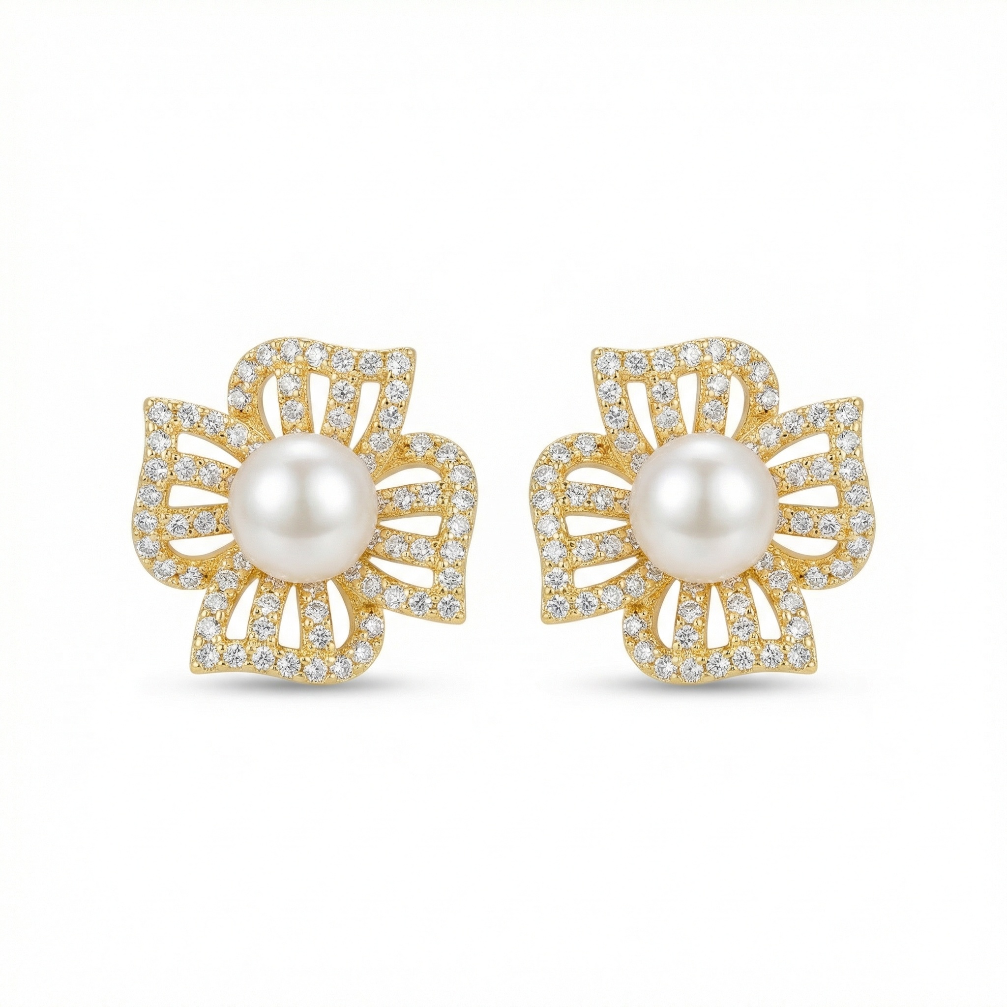 Embrace timeless elegance with these stunning floral-inspired stud earrings. Each piece showcases a luminous, round white pearl nestled in the center of a beautifully detailed flower motif. The four petals feature sophisticated openwork detailing, encrusted with a multitude of sparkling pavé-set stones that offer a brilliant shimmer. The polished warm-toned setting enhances the radiance of the pearls, creating a luxurious look suitable for any formal event or bridal attire. These earrings blend intricate craftsmanship with a classic aesthetic, making them a versatile addition to any jewelry collection. Designed for both comfort and style, they provide a secure fit for all-day wear. Whether as a treat for yourself or a meaningful gift, these exquisite pearl and stone earrings are sure to leave a lasting impression of grace and sophistication. | Brand: jewelryodm
