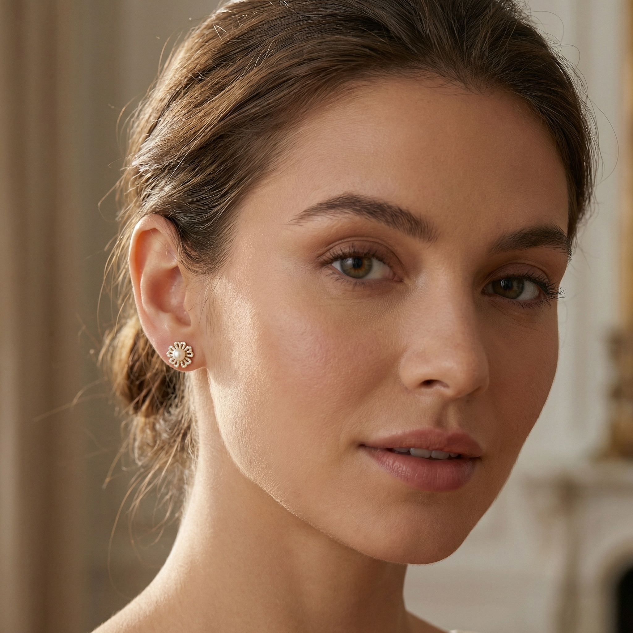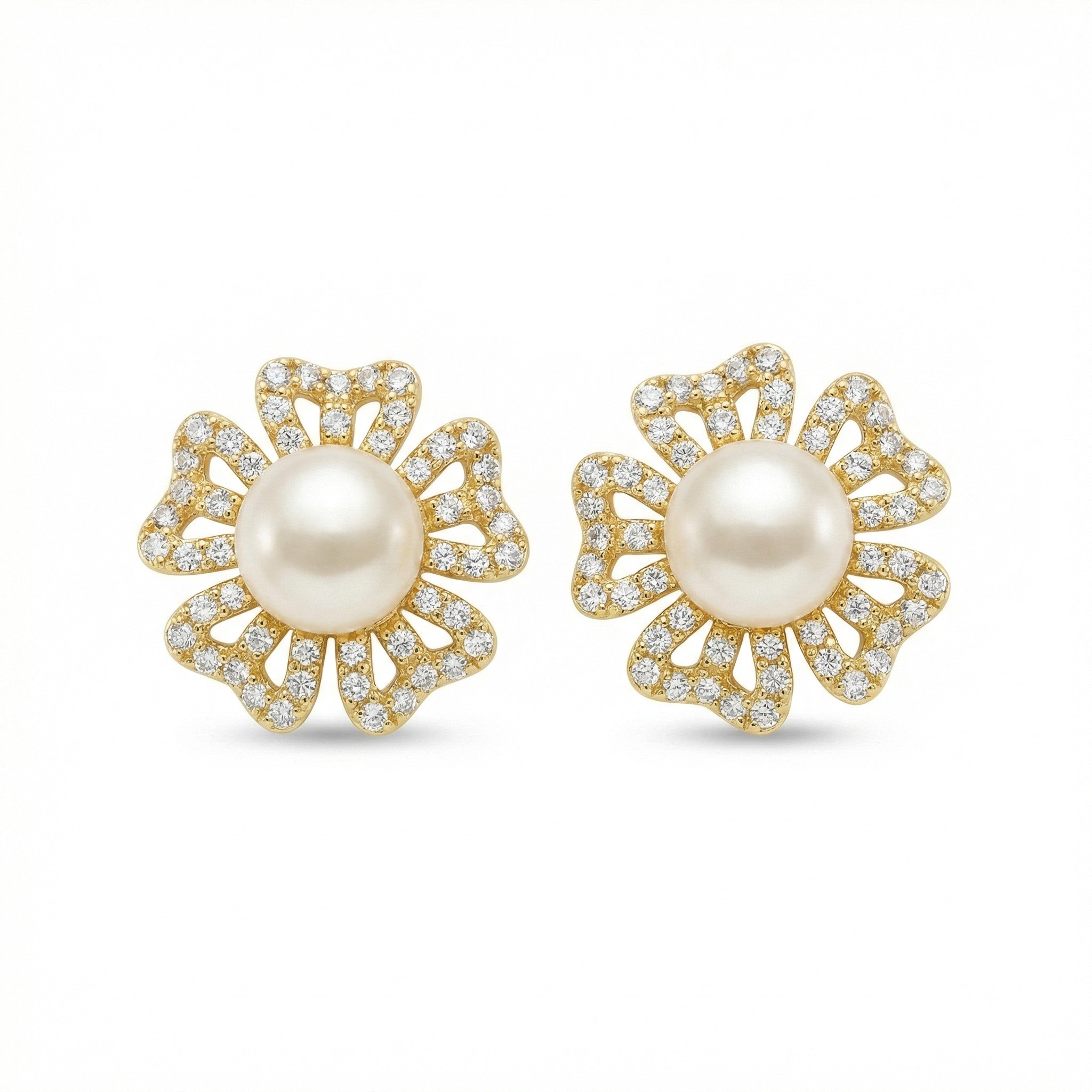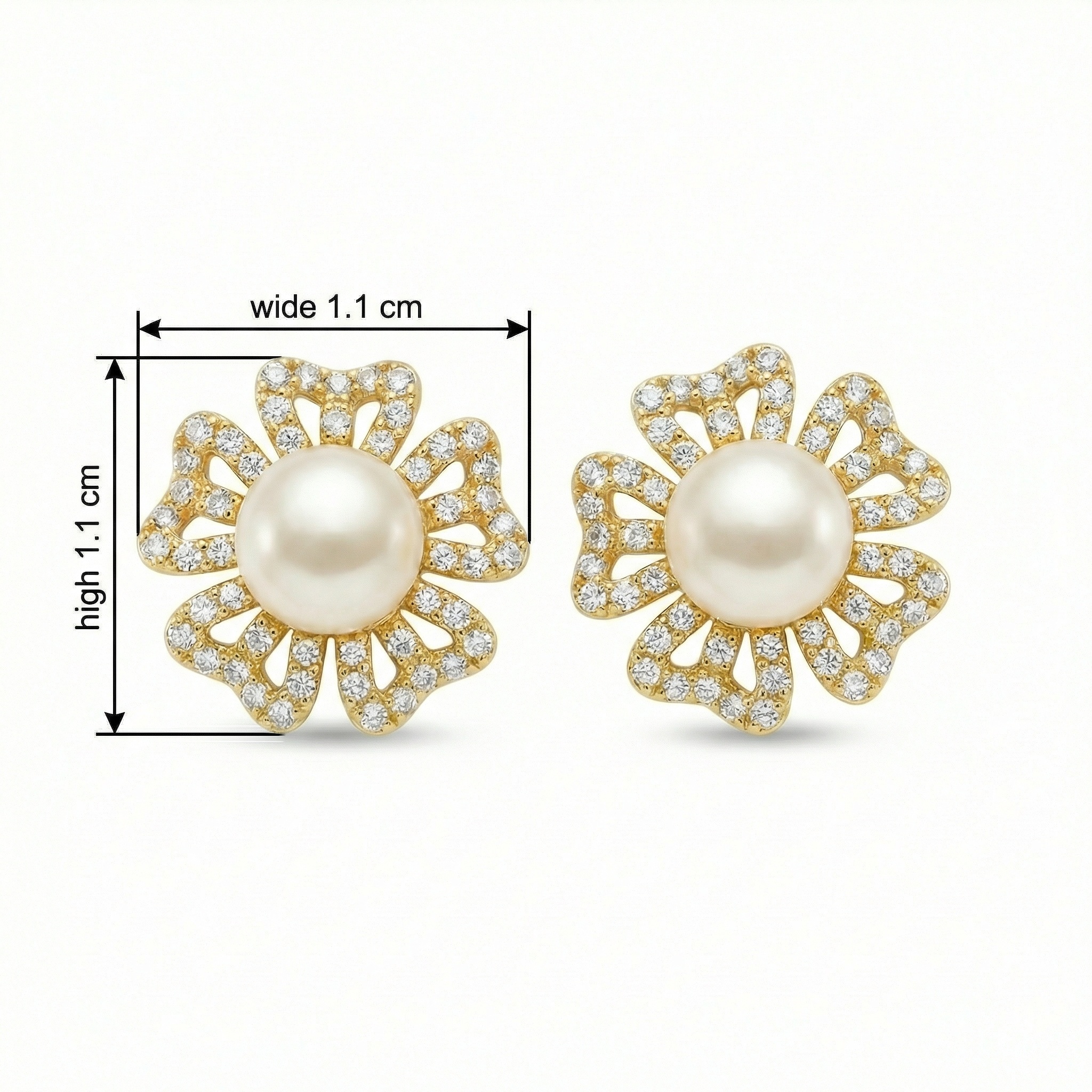 These exquisite floral-inspired stud earrings feature a lustrous white pearl at the center of a delicate openwork design. Each petal is meticulously set with shimmering round-cut stones that catch the light from every angle, creating a radiant halo effect. The warm-toned metal setting enhances the natural glow of the pearls, making them a sophisticated choice for both formal events and daily elegance. These earrings blend timeless charm with modern craftsmanship, offering a floral aesthetic that symbolizes beauty and grace. Ideal as a gift for a loved one or a luxurious addition to your personal jewelry collection, these studs provide a lightweight yet impactful look that complements any outfit beautifully. | Brand: jewelryodm