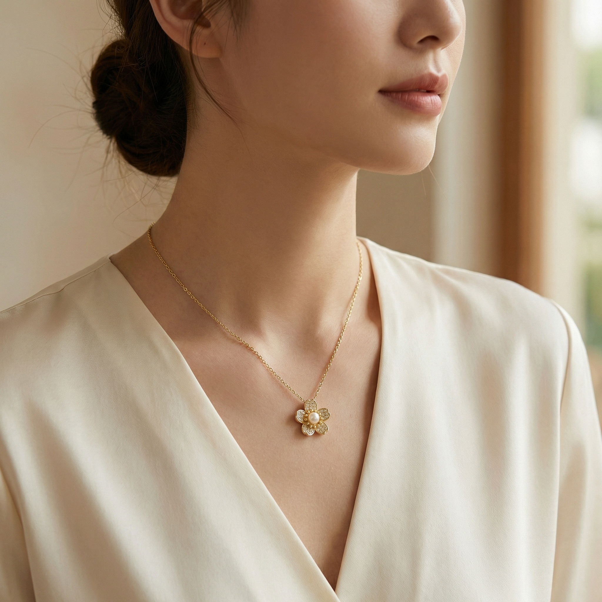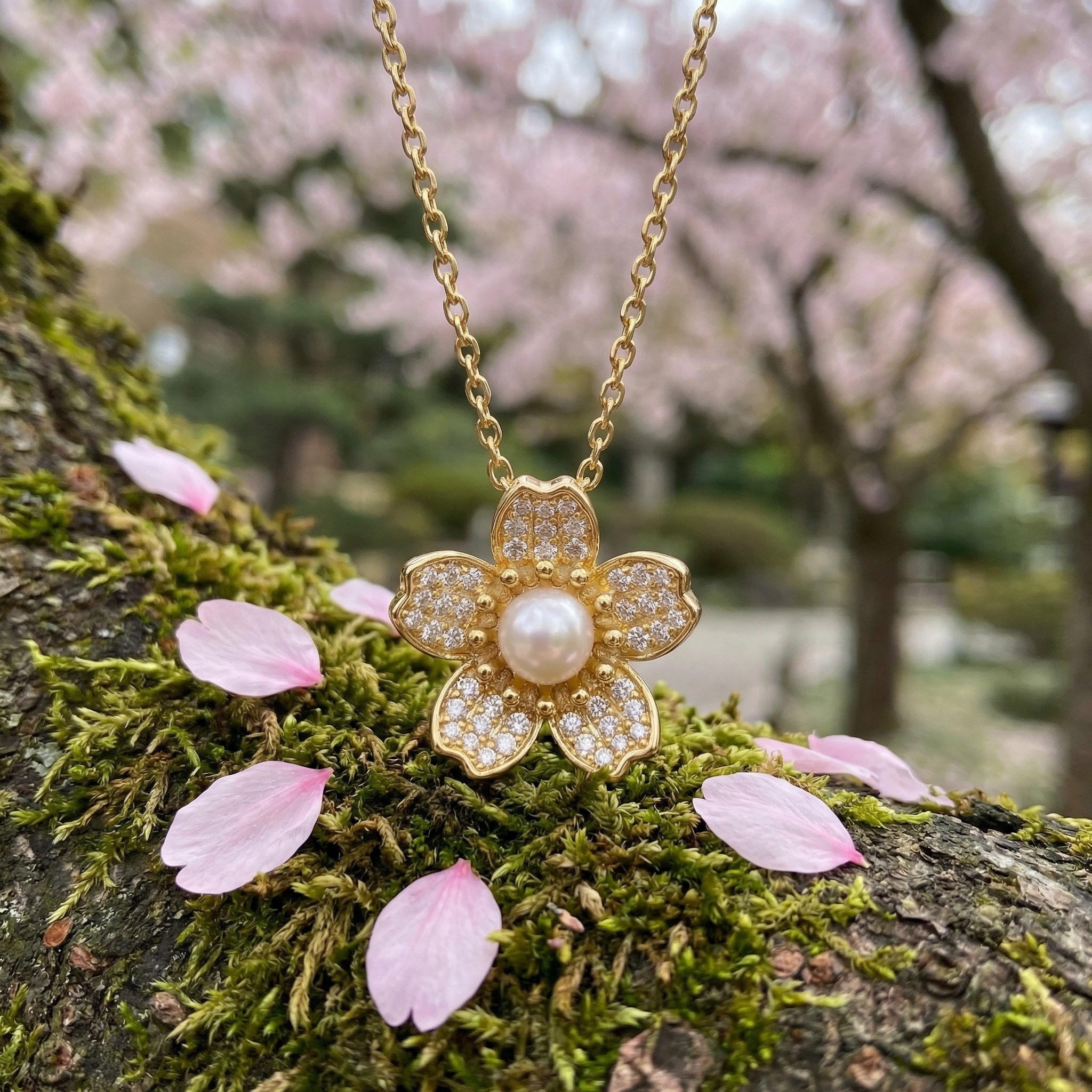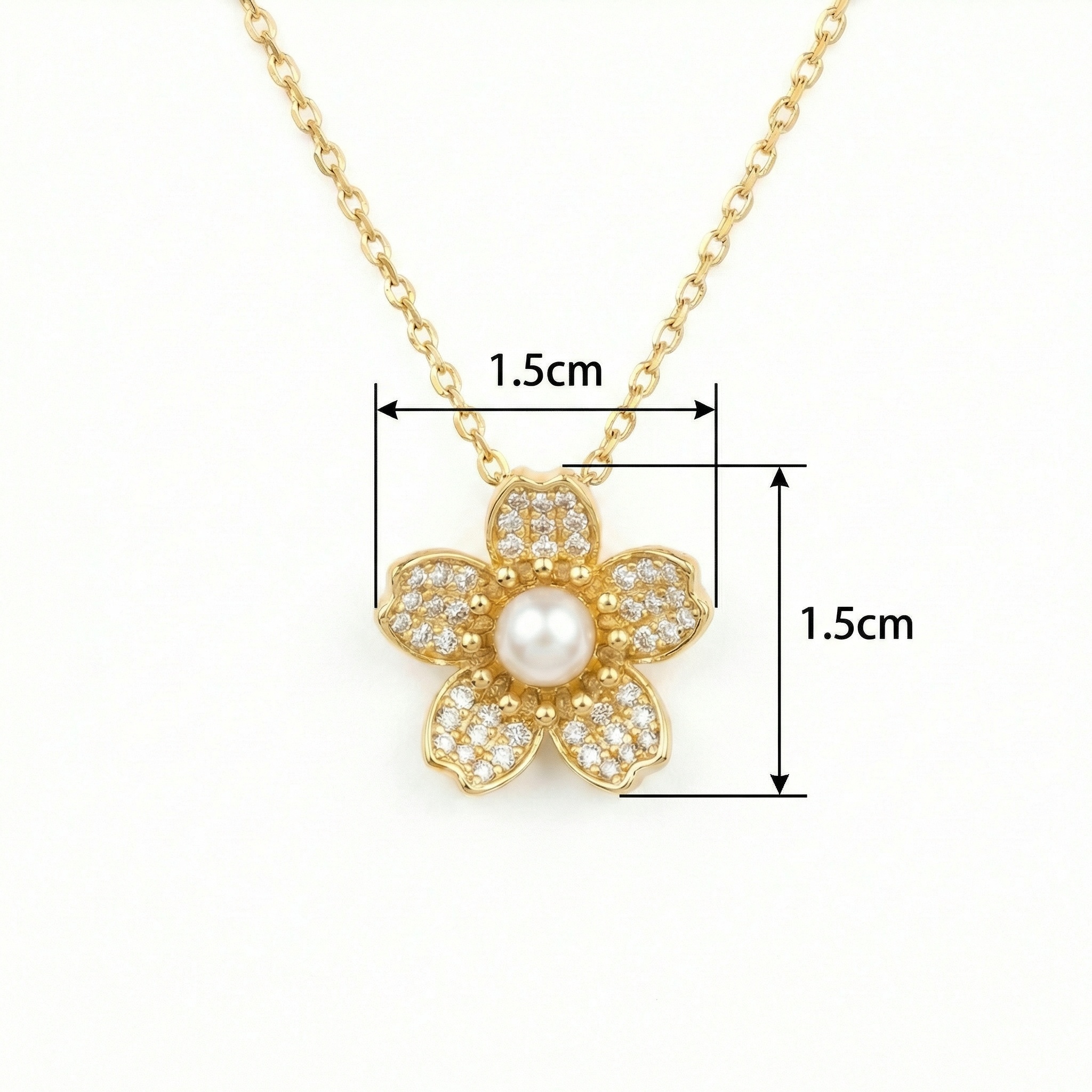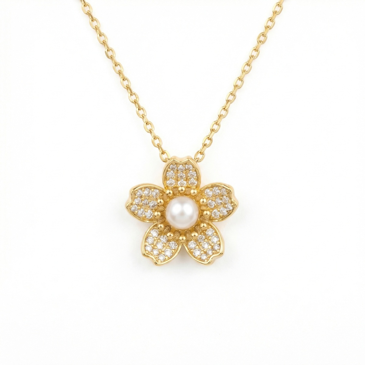 This stunning necklace showcases a meticulously detailed five-petal flower pendant, embodying grace and sophistication. Each petal is encrusted with brilliant pavé-set crystals that offer a dazzling shimmer, beautifully framing a creamy, high-luster pearl nestled at the center. The combination of sparkling accents and the timeless appeal of the pearl creates a harmonious balance of modern luxury and classic charm. The pendant hangs from a fine, high-polish chain that complements the warm metallic tones of the piece. Perfectly suited for both everyday wear and formal occasions, this necklace adds a refined feminine touch to any outfit. It serves as an ideal gift for someone special, celebrating beauty and elegance in every detail. | Brand: jewelryodm