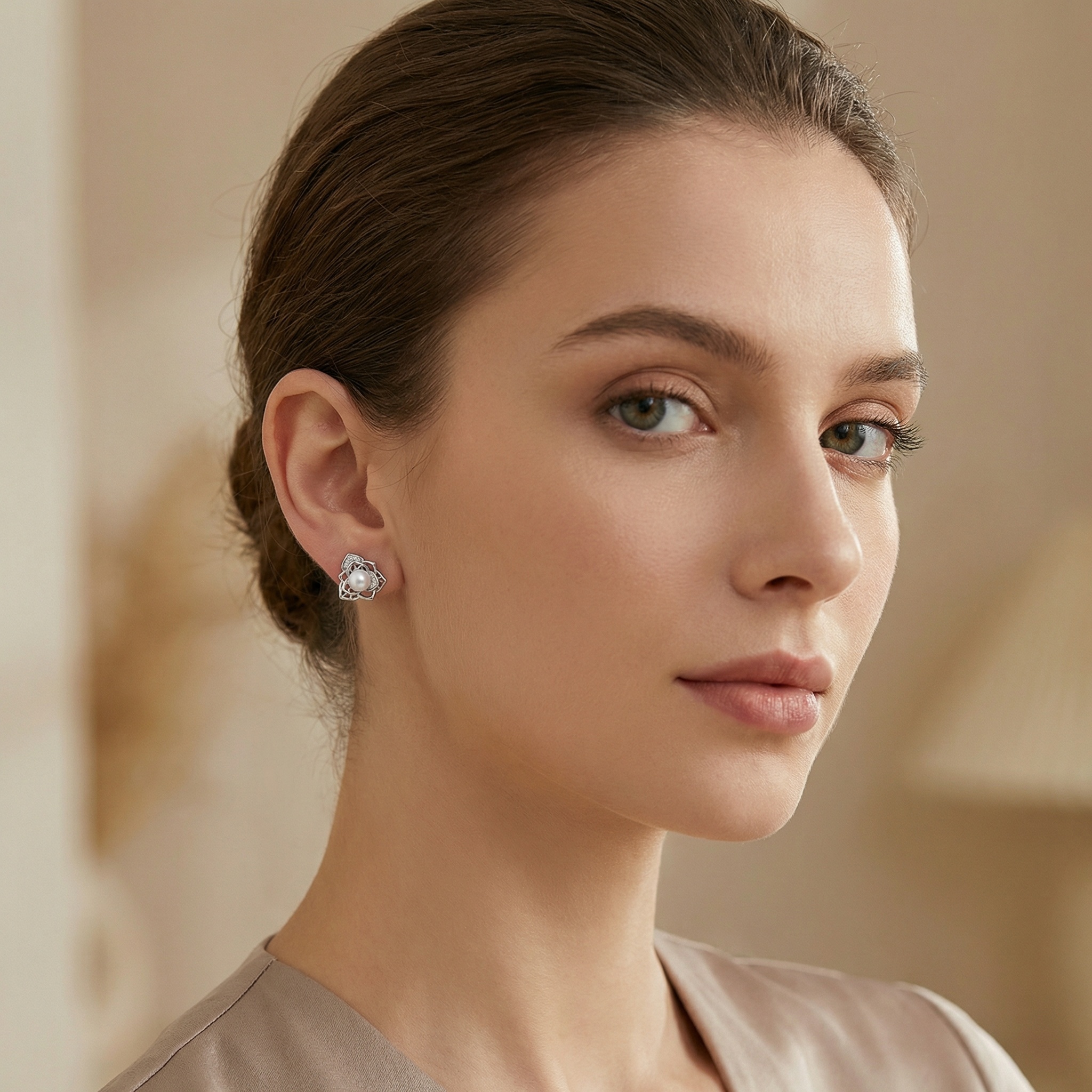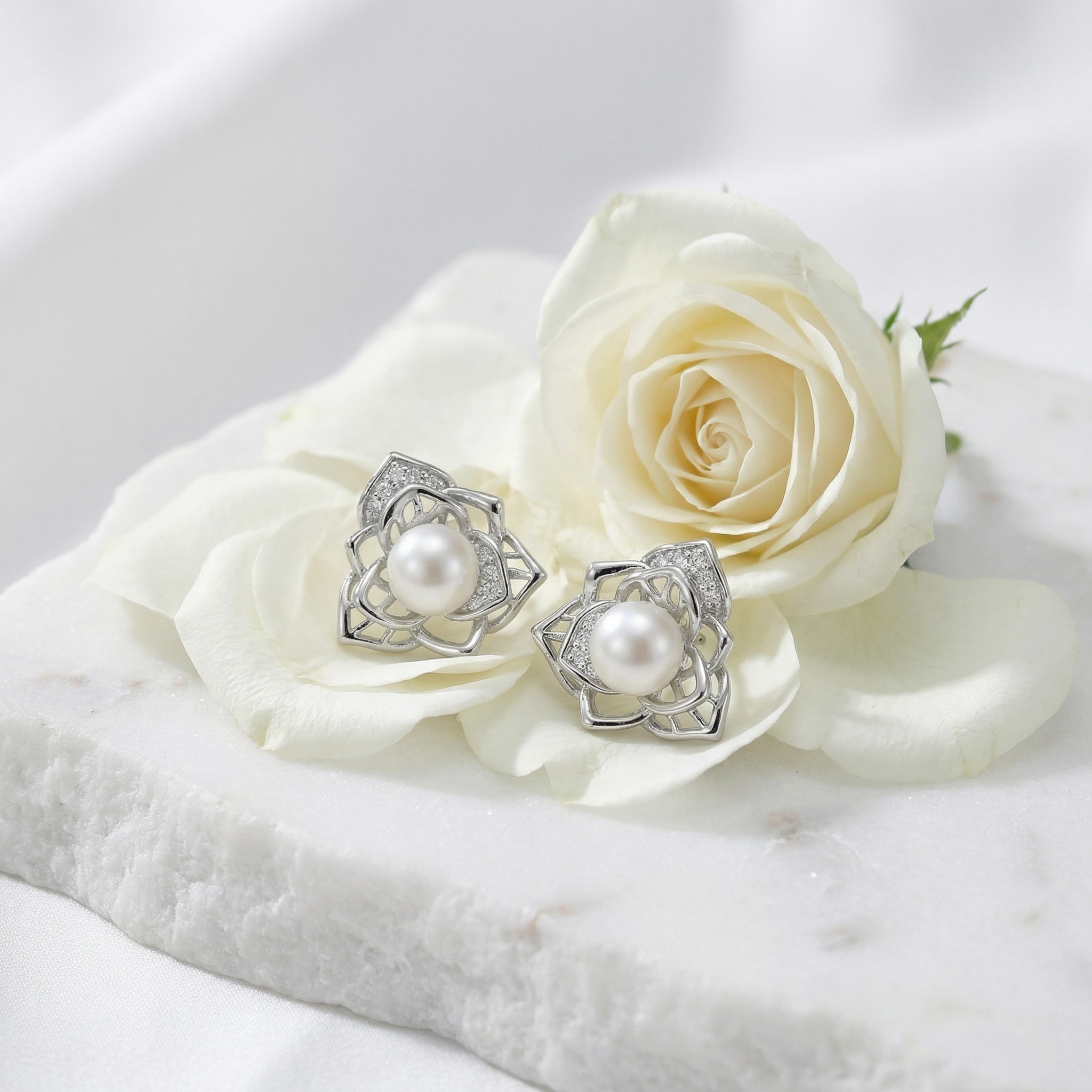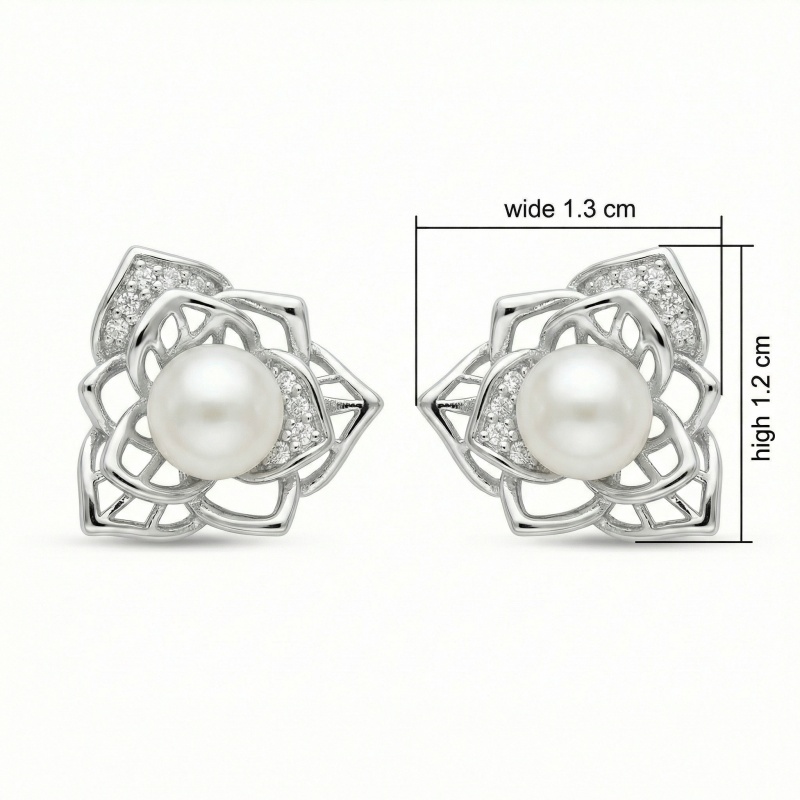 These exquisite stud earrings feature a luminous white pearl nestled at the center of a delicate, silver-toned floral frame. The intricate openwork design mimics the graceful petals of a blooming lotus, crafted from high-quality sterling silver. To add a touch of brilliance, sections of the floral motif are meticulously pavé-set with shimmering cubic zirconia stones, catching the light with every movement. These earrings blend classic sophistication with contemporary artistry, making them a perfect accessory for weddings, special occasions, or elevating daily attire. The secure post backings ensure comfortable and reliable wear throughout the day. A timeless addition to any jewelry collection, they offer a soft glow and understated glamour that beautifully complements any style. | Brand: jewelryodm