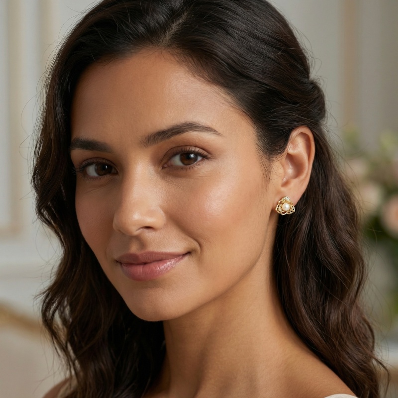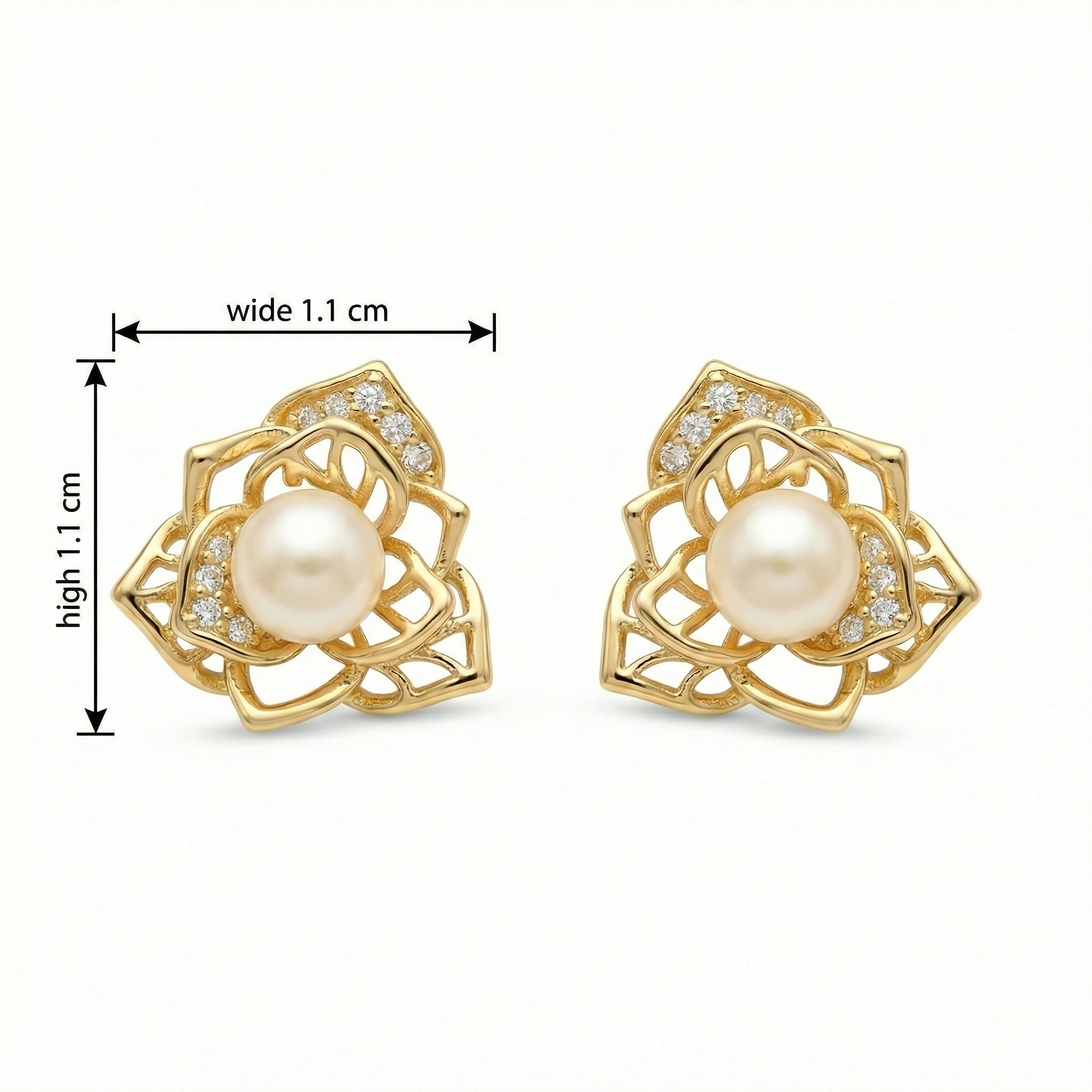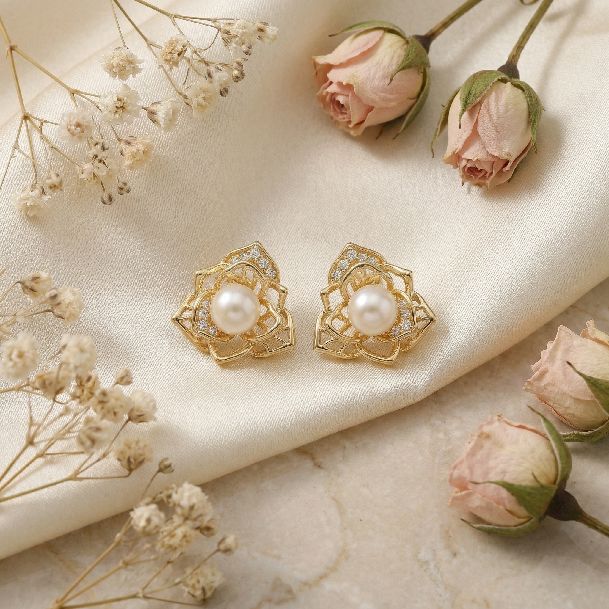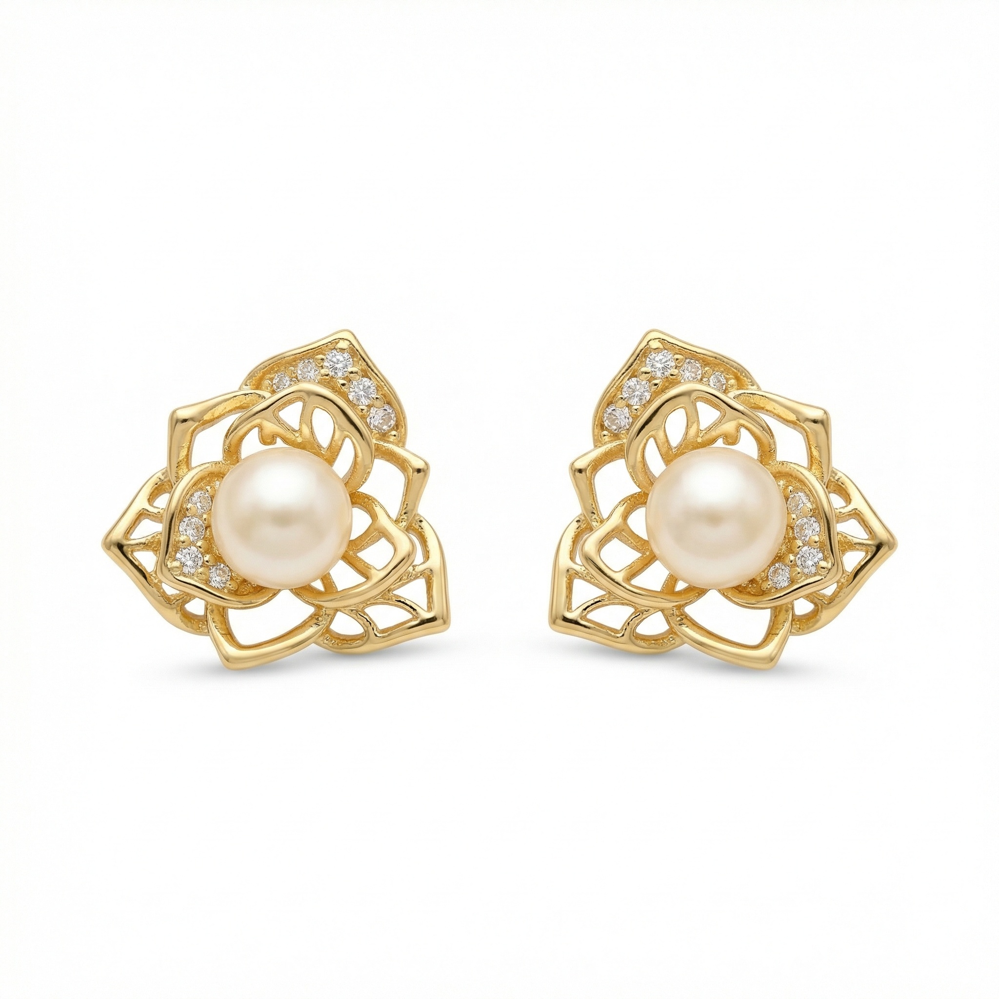 These stunning stud earrings feature a sophisticated floral design with intricate openwork petals. At the heart of each blossom is a perfectly round pearl with a radiant, creamy luster. The warm metallic finish beautifully complements the soft sheen of the pearls, while tiny sparkling stones are delicately set into the petals to add a touch of brilliant light. These earrings offer a timeless and feminine aesthetic, making them a versatile choice for both day and evening wear. Their unique combination of classic pearls and modern filigree work creates a piece of jewelry that is both elegant and eye-catching. Perfect for gifting or personal indulgence, these earrings celebrate nature's beauty with a refined and polished look. | Brand: jewelryodm