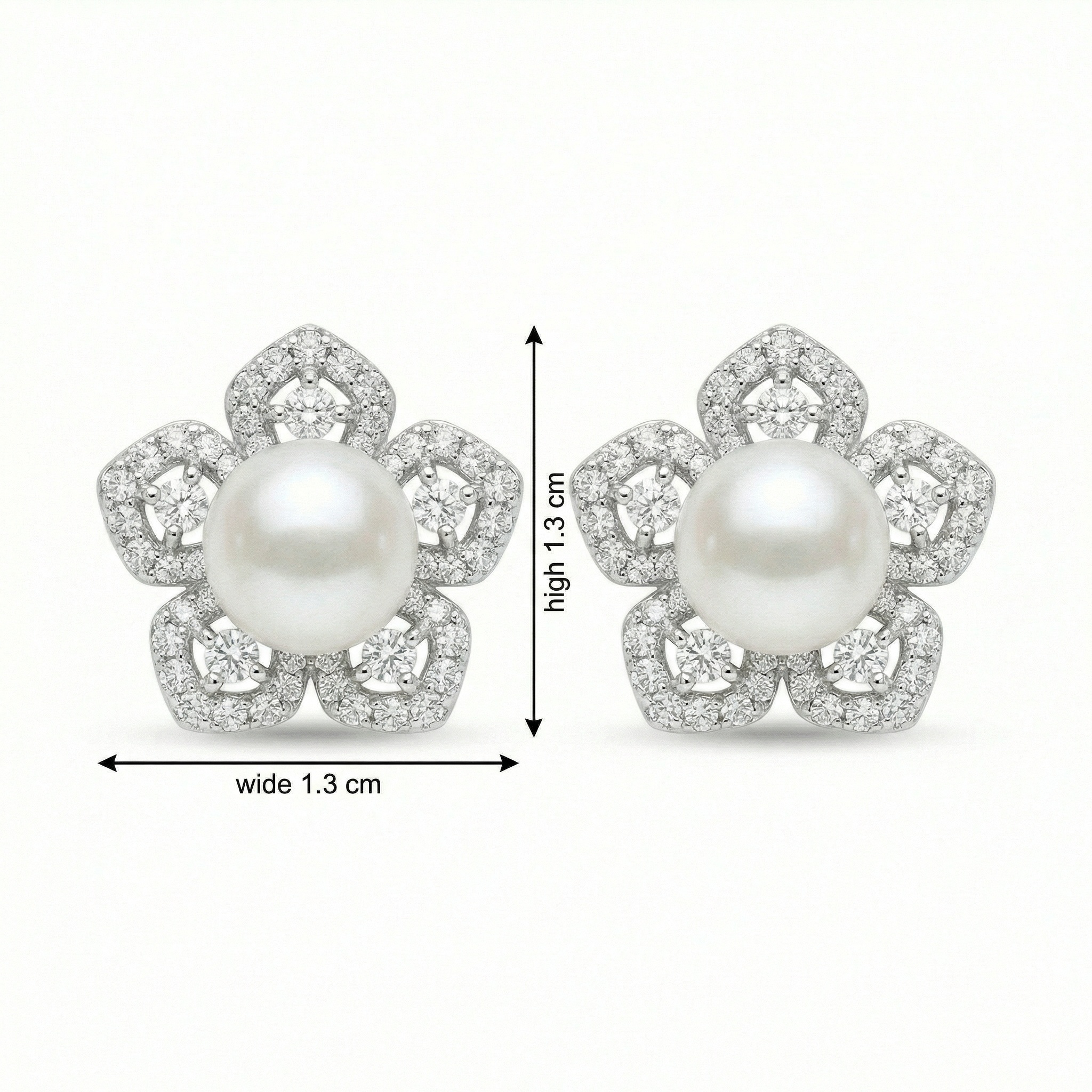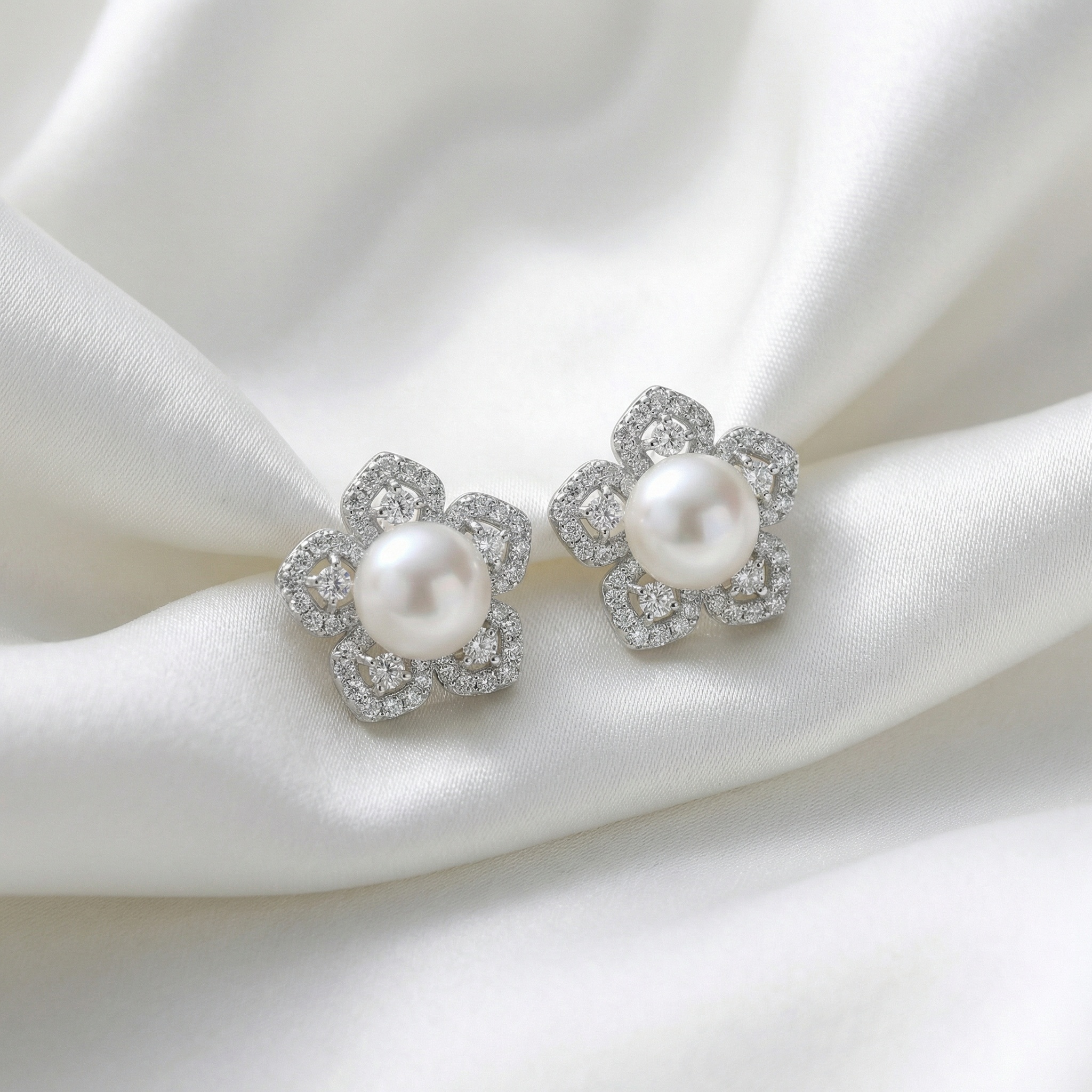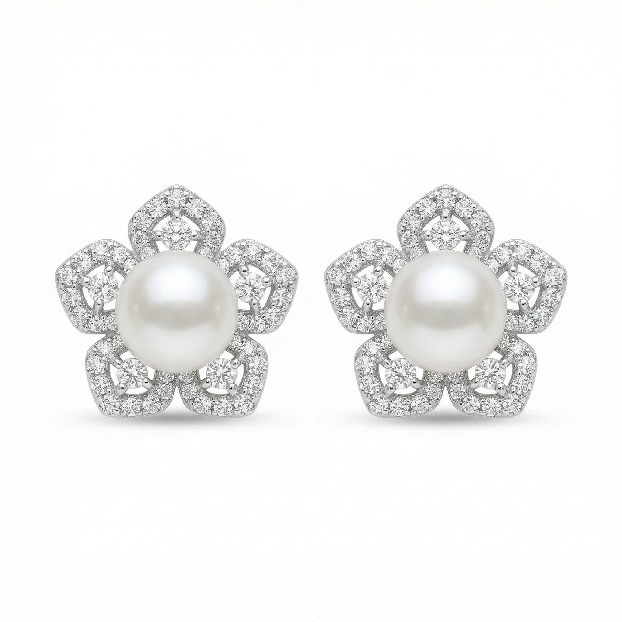 These exquisite stud earrings feature a breathtaking floral design that combines timeless elegance with sophisticated craftsmanship. At the heart of each earring sits a lustrous white pearl with a smooth, iridescent finish. Surrounding the center are five delicate petals crafted from polished white metal, meticulously embellished with sparkling pavé-set diamonds. Each petal also features a larger, brilliant-cut diamond at its core, enhancing the overall radiance and depth of the piece. The intricate openwork design adds a touch of lightness, making these earrings a perfect choice for bridal wear, formal galas, or a luxurious gift. With their classic flower motif and brilliant shimmer, these earrings offer a graceful and timeless aesthetic that beautifully frames the face for any special occasion. | Brand: jewelryodm