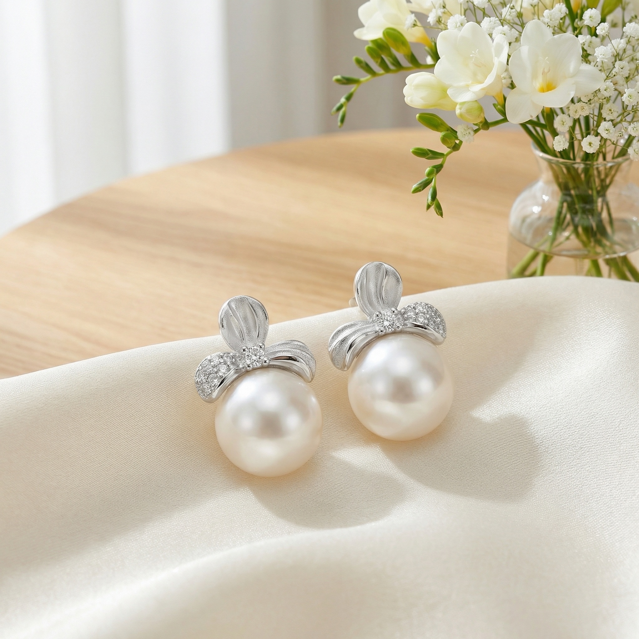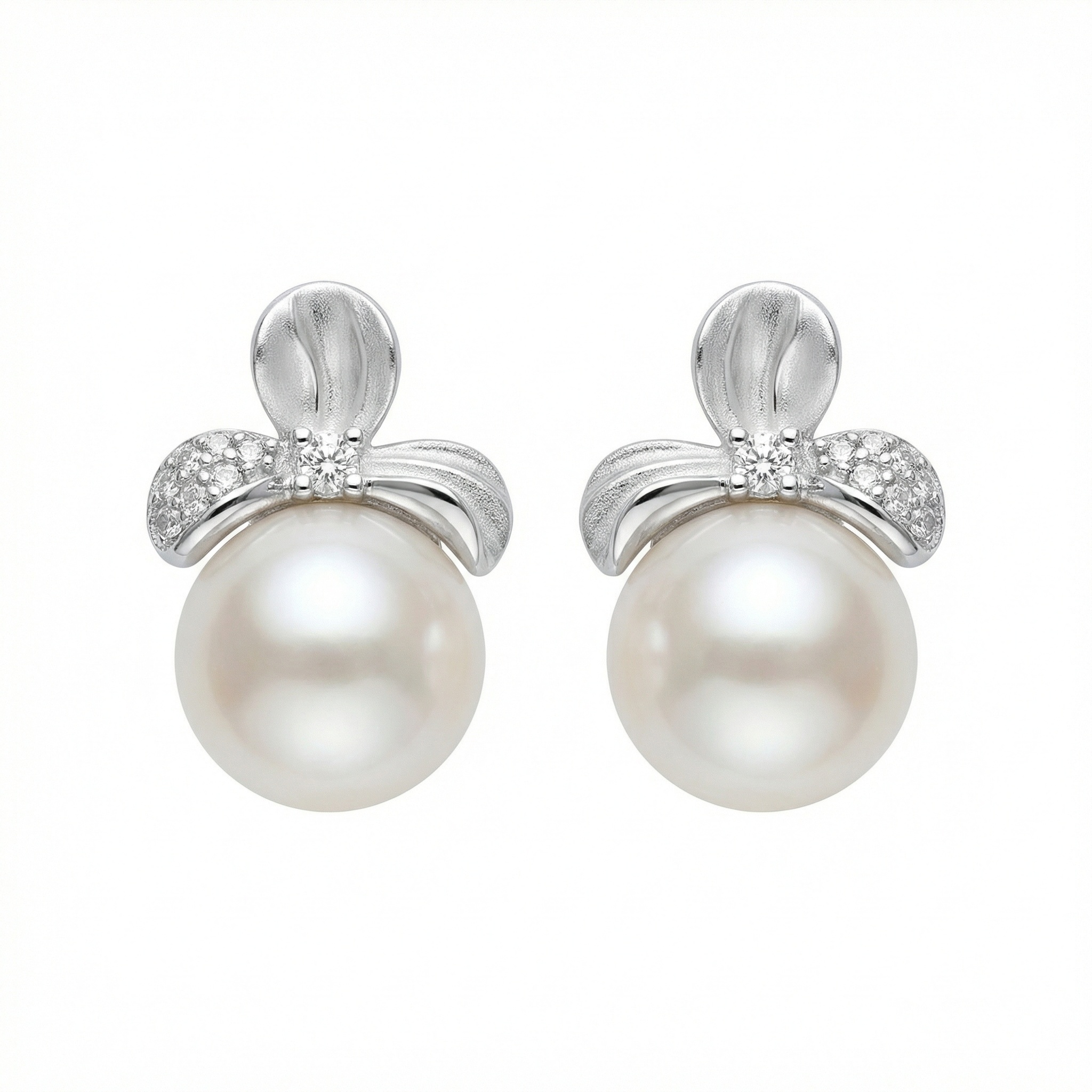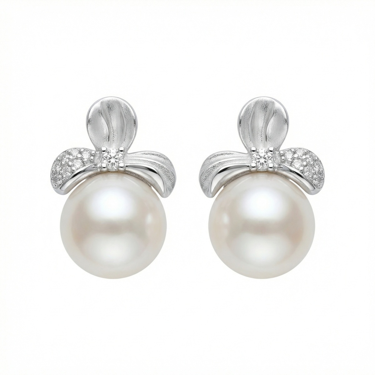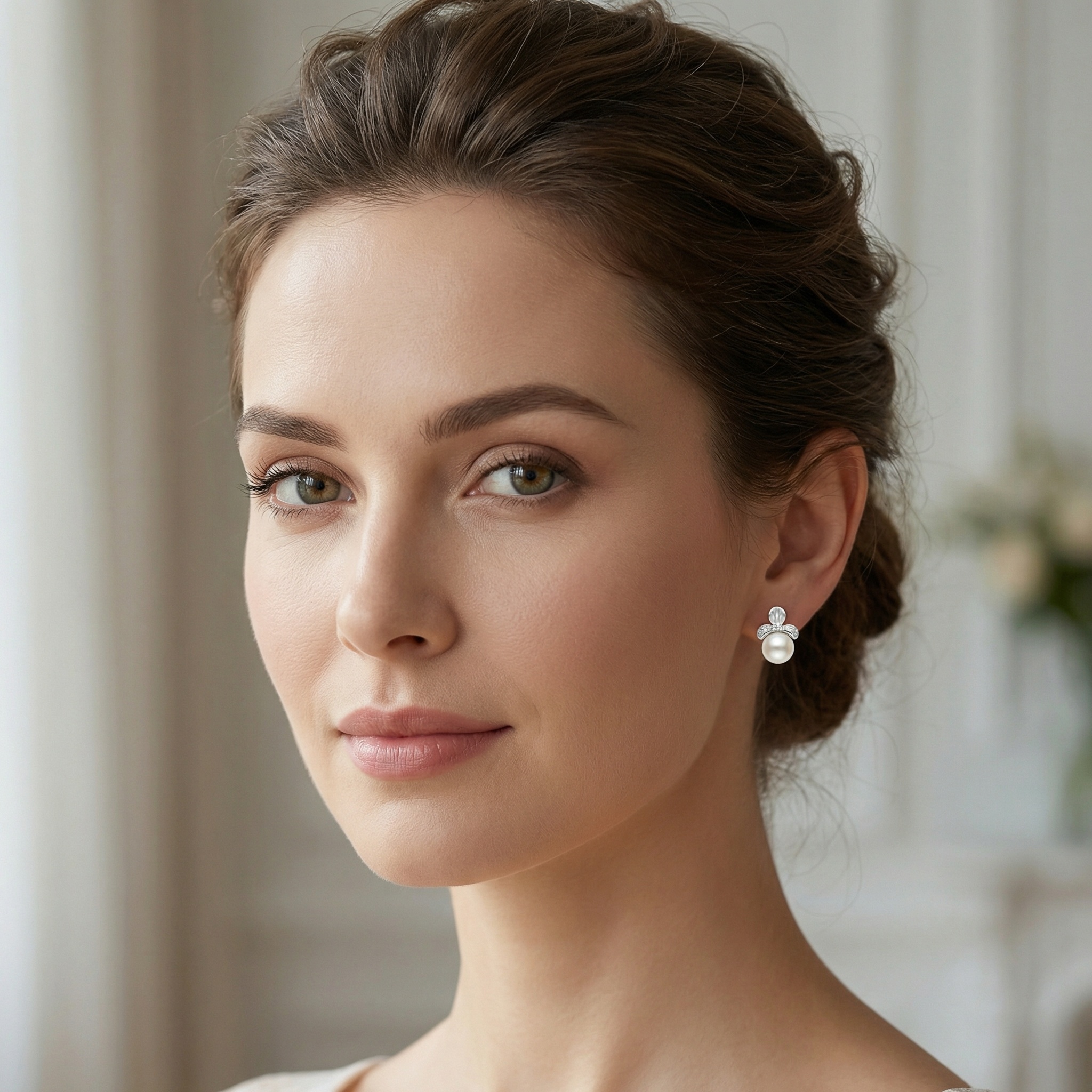 These exquisite pearl earrings feature large, perfectly round white pearls with a brilliant luster. Each pearl is gracefully topped with a sophisticated floral-inspired silver setting. The design includes a prominent central round-cut sparkling stone, surrounded by smaller pavé-set accents on delicate, petal-like motifs. The combination of the smooth, timeless pearl and the intricate, glittering metalwork creates a look of refined elegance and modern luxury. Ideal for weddings, formal galas, or as a thoughtful gift, these earrings offer a versatile charm that complements both classic and contemporary styles. Their high-polished finish ensures they catch the light beautifully, making them a stunning addition to any jewelry collection. | Brand: jewelryodm