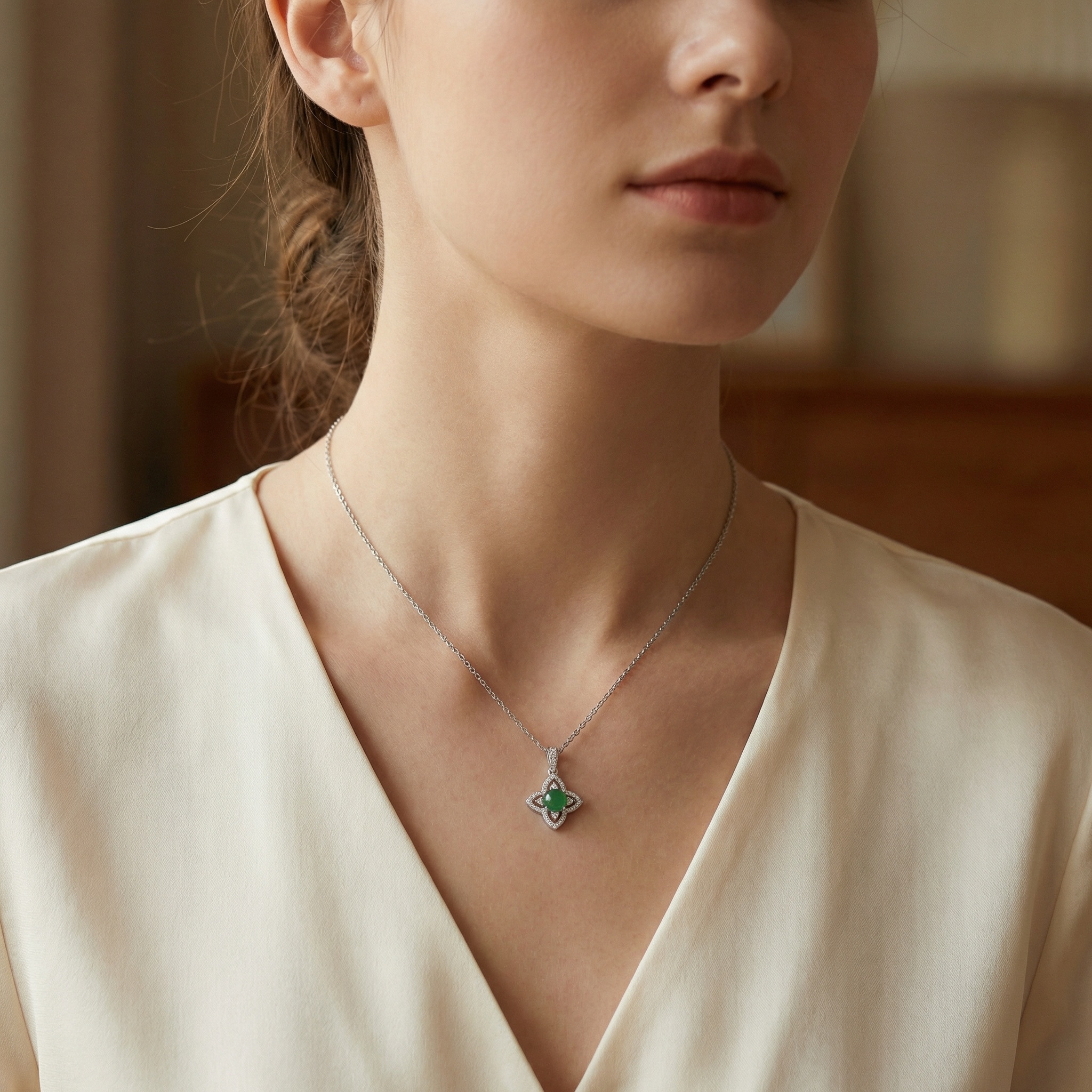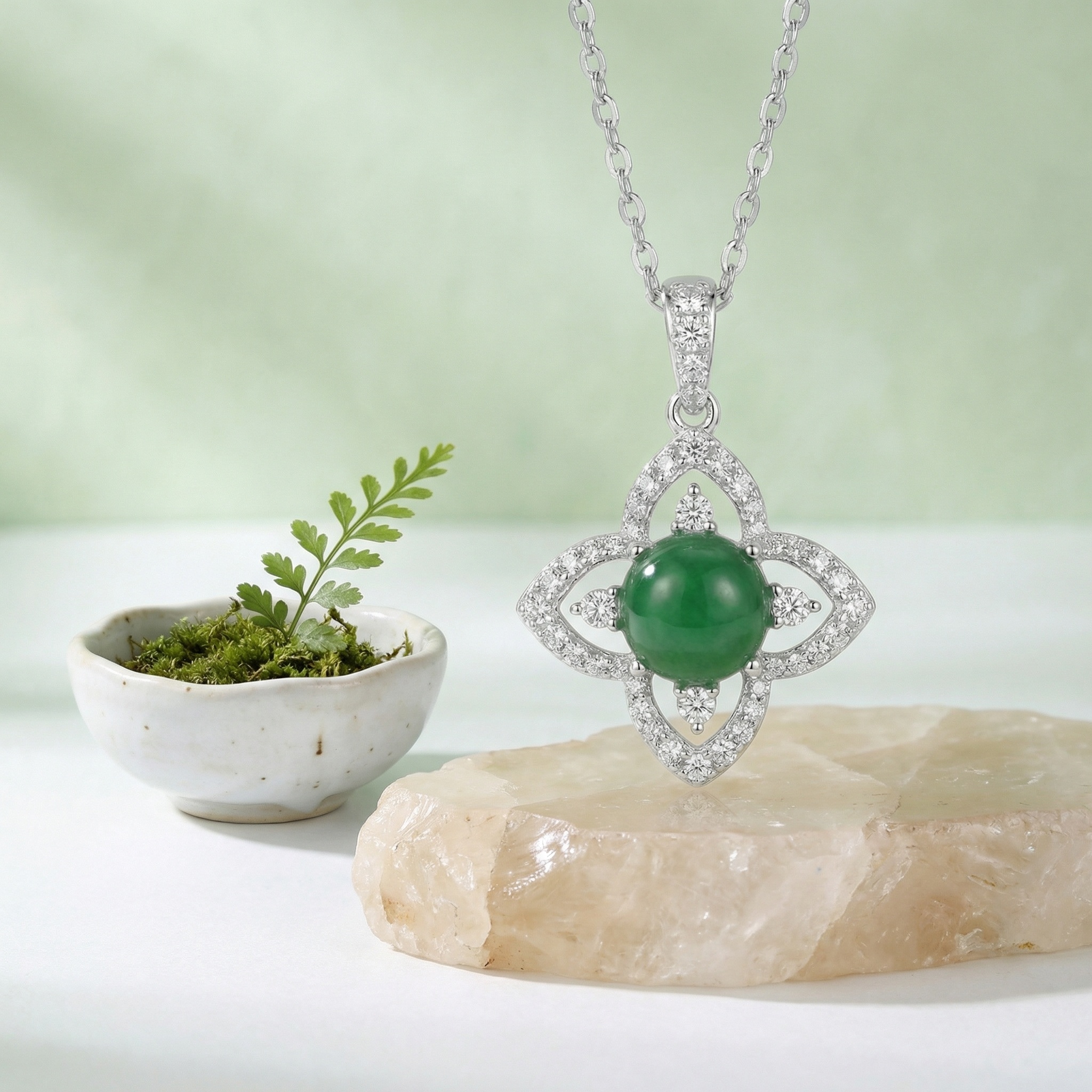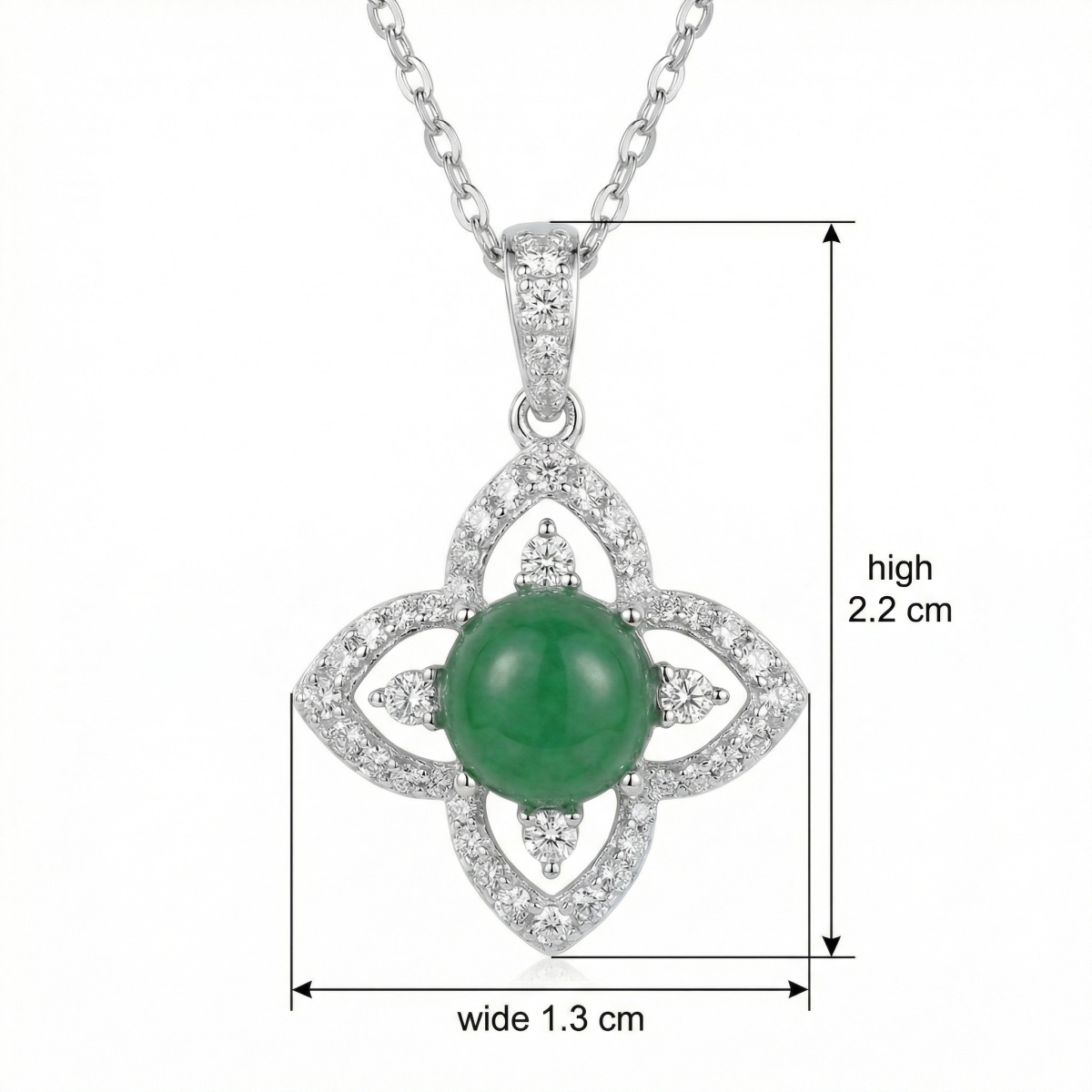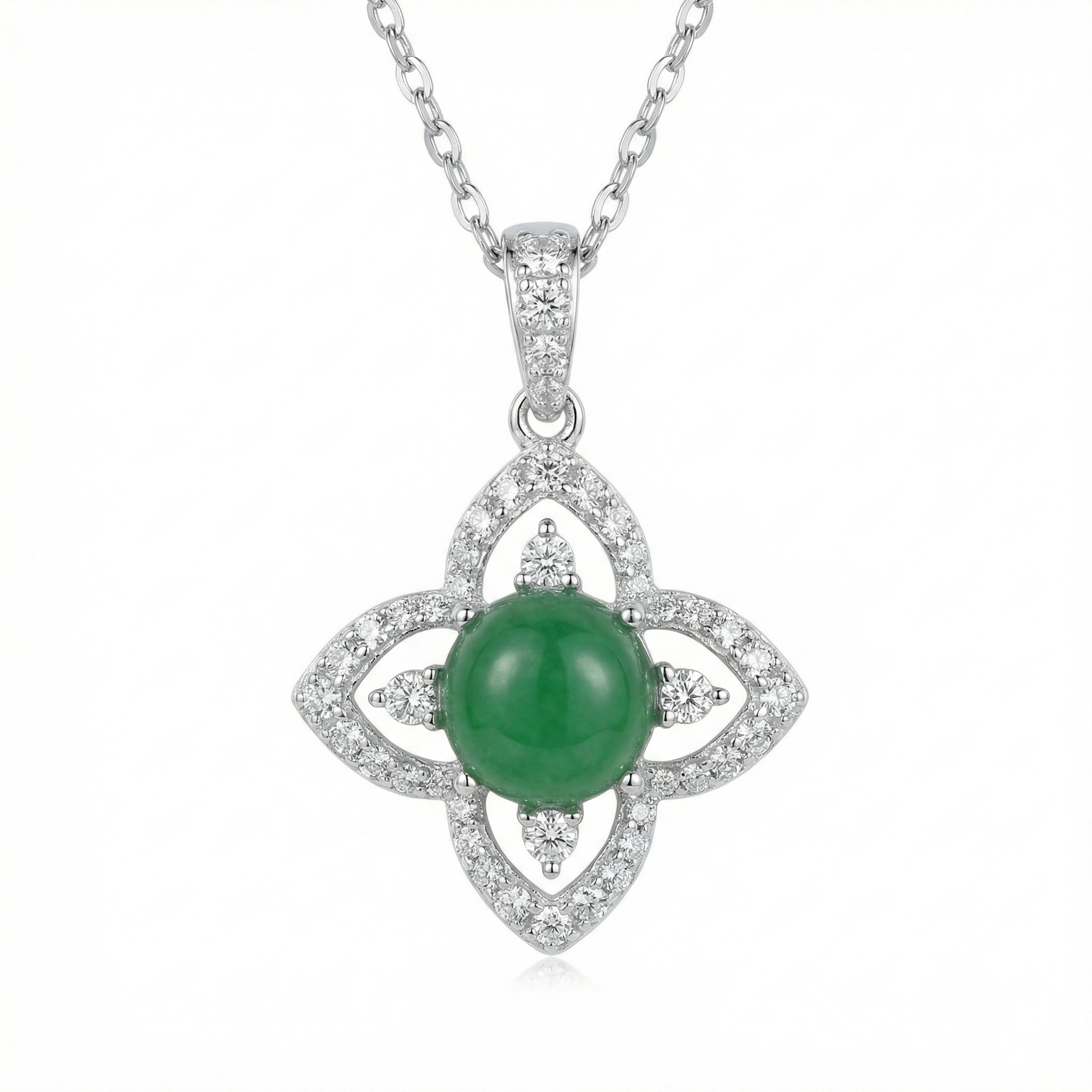 925 Sterling Silver Elegant Flower-Shaped Green Jade Pendant Necklace with Sparkling White Stone Accents