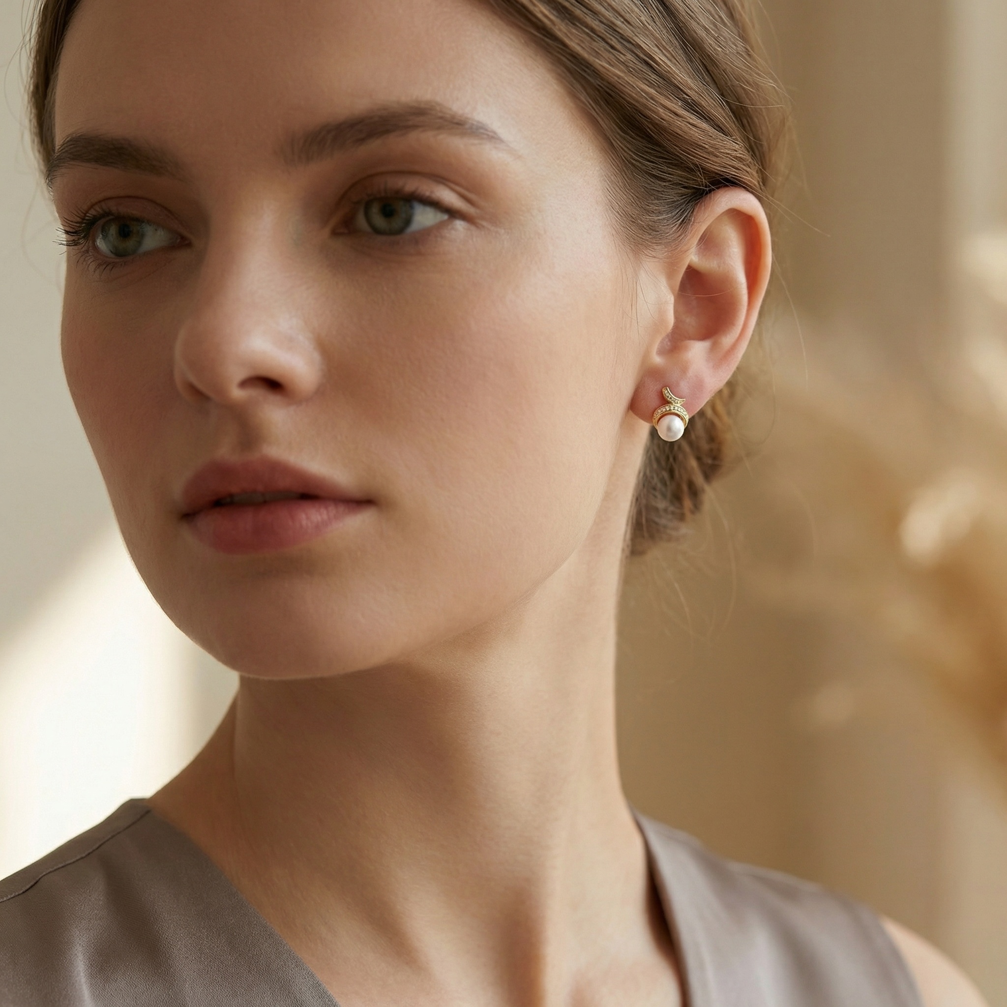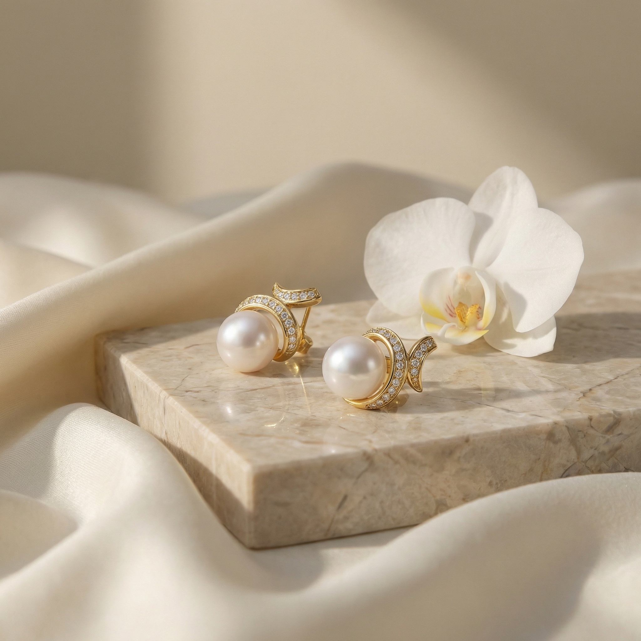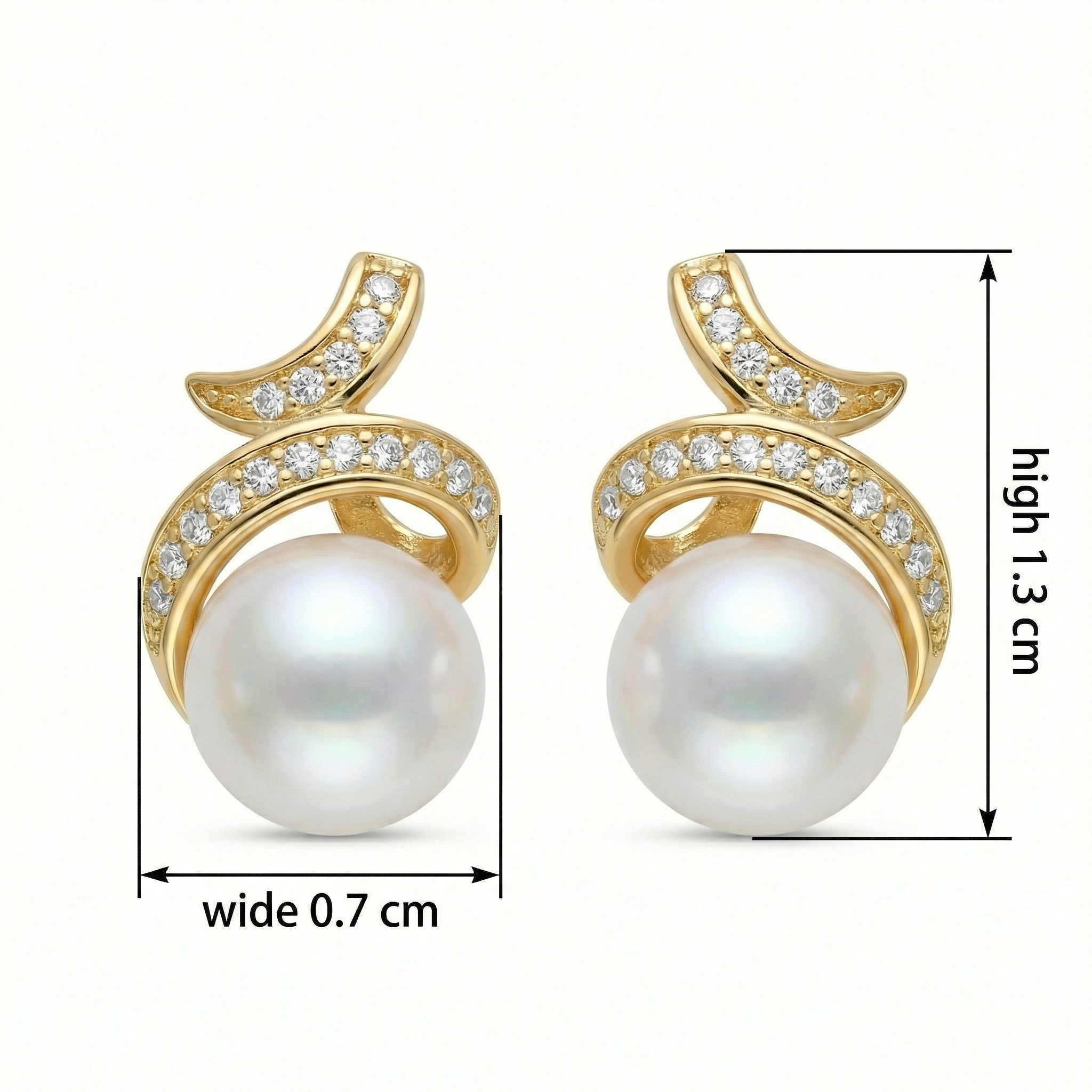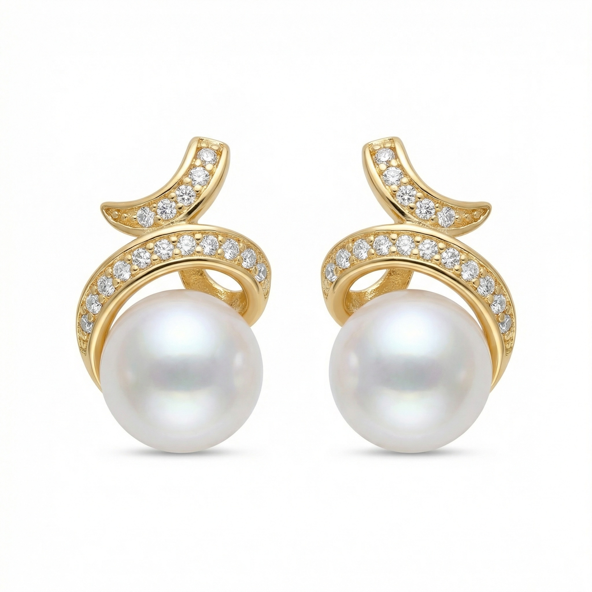 These stunning earrings feature a pair of lustrous white pearls, each cradled by a graceful, swirling metallic motif. The intricate scrollwork is meticulously pavé-set with shimmering clear stones that capture the light from every angle, adding a touch of glamour to the classic pearl design. Crafted with a warm, polished finish, these stud earrings offer a timeless look that effortlessly transitions from day to night. Whether for a special occasion or as a sophisticated addition to your everyday jewelry collection, these pieces radiate elegance and femininity. The combination of the smooth, iridescent pearl and the brilliant accent stones creates a harmonious balance of texture and shine, making them a perfect choice for those who appreciate refined and classic beauty. | Brand: jewelryodm