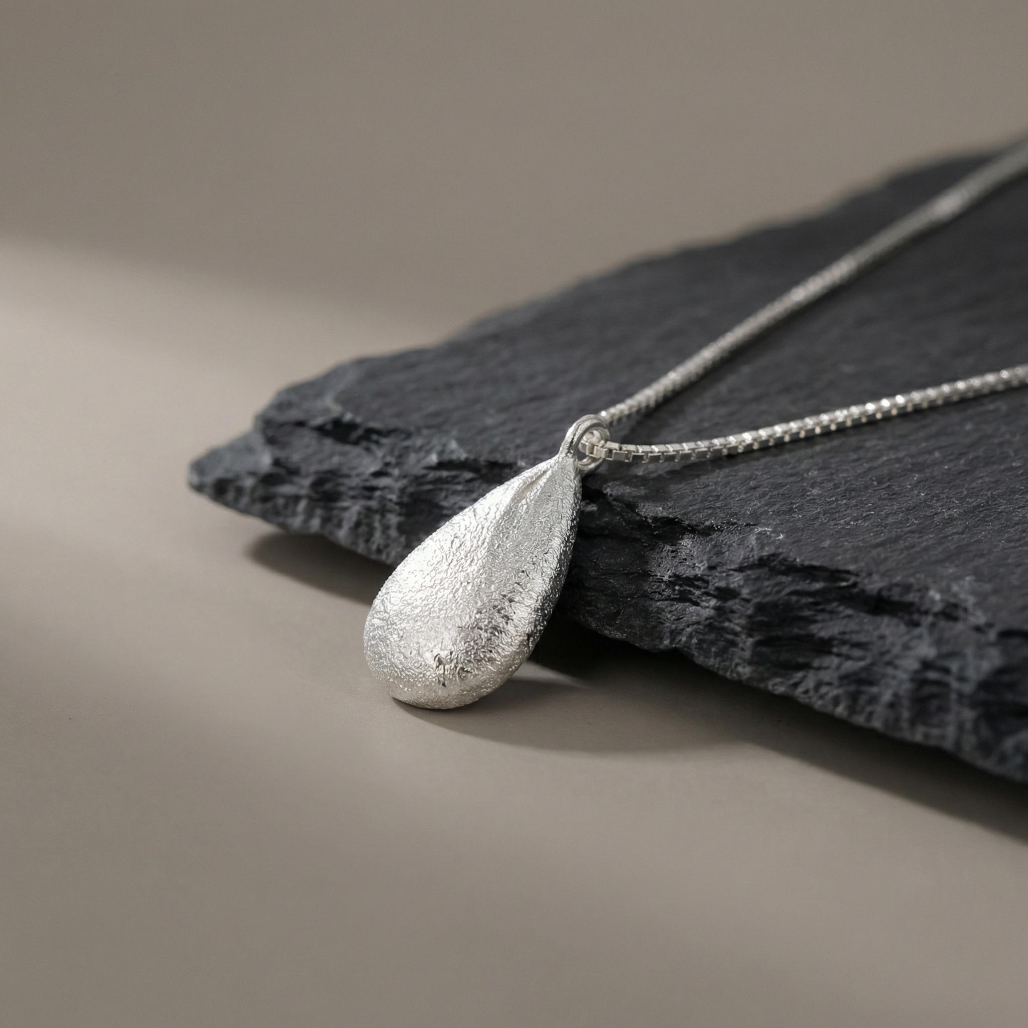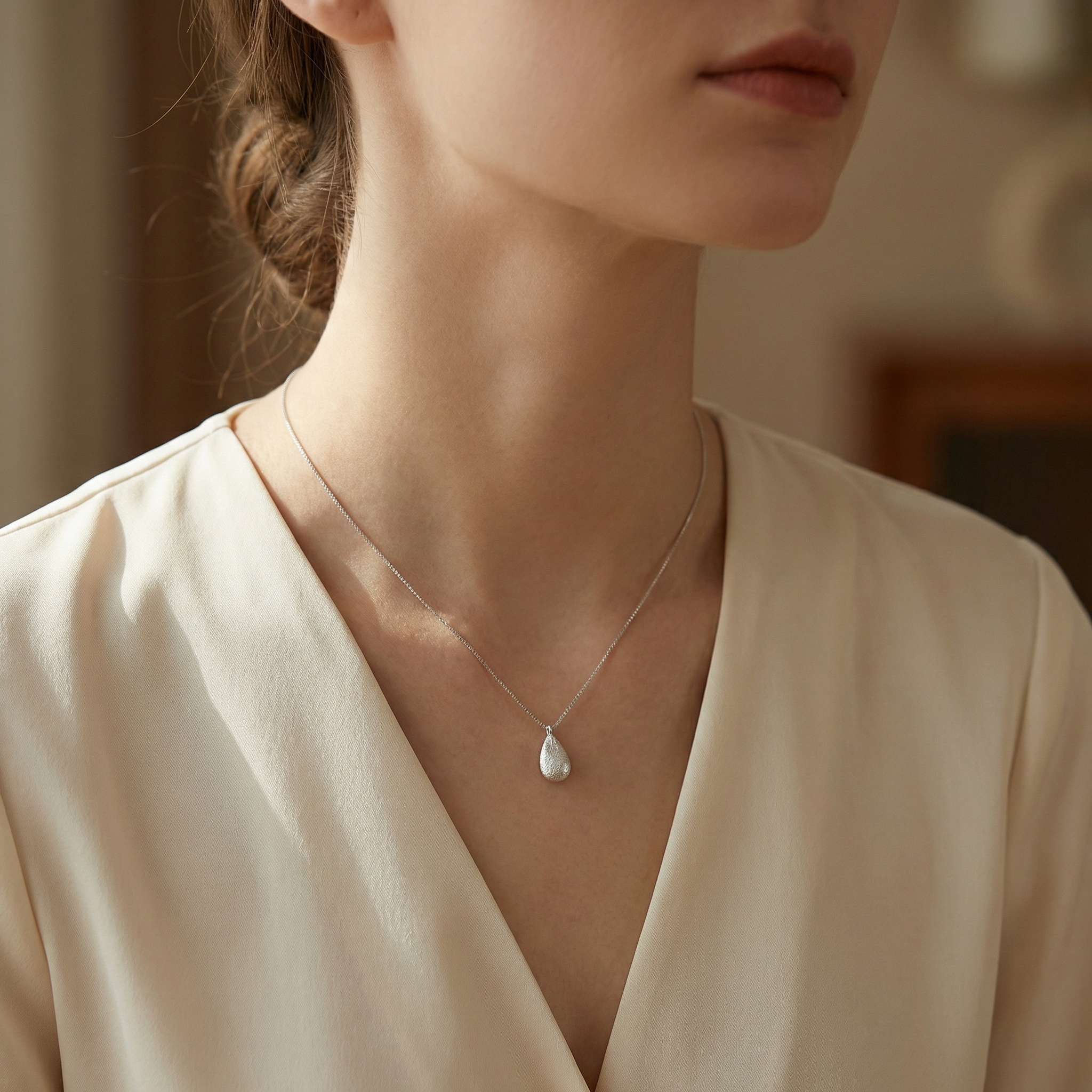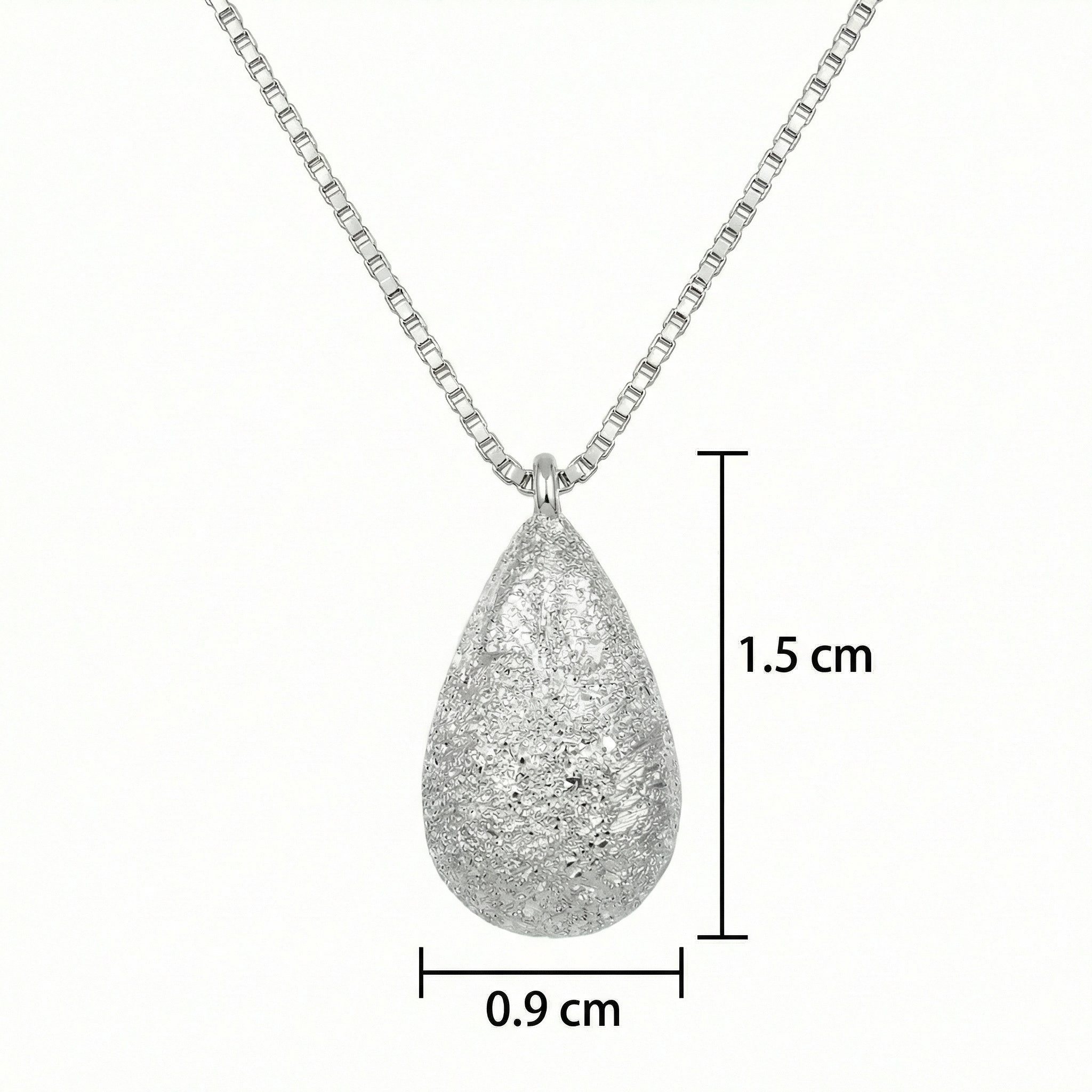 This exquisite necklace features a graceful teardrop pendant with a unique frosted, stardust-like texture that sparkles brilliantly in the light. Crafted with a sleek silver finish, the pendant hangs from a sophisticated box chain, blending modern minimalism with timeless elegance. The textured surface provides a captivating visual contrast against the smooth, polished bail and chain. This versatile piece is perfect for adding a touch of refined glamour to any attire, whether for casual daily wear or formal evening events. Its delicate yet striking design makes it a wonderful gift for a loved one or a beautiful addition to any personal jewelry collection. | Brand: jewelryodm