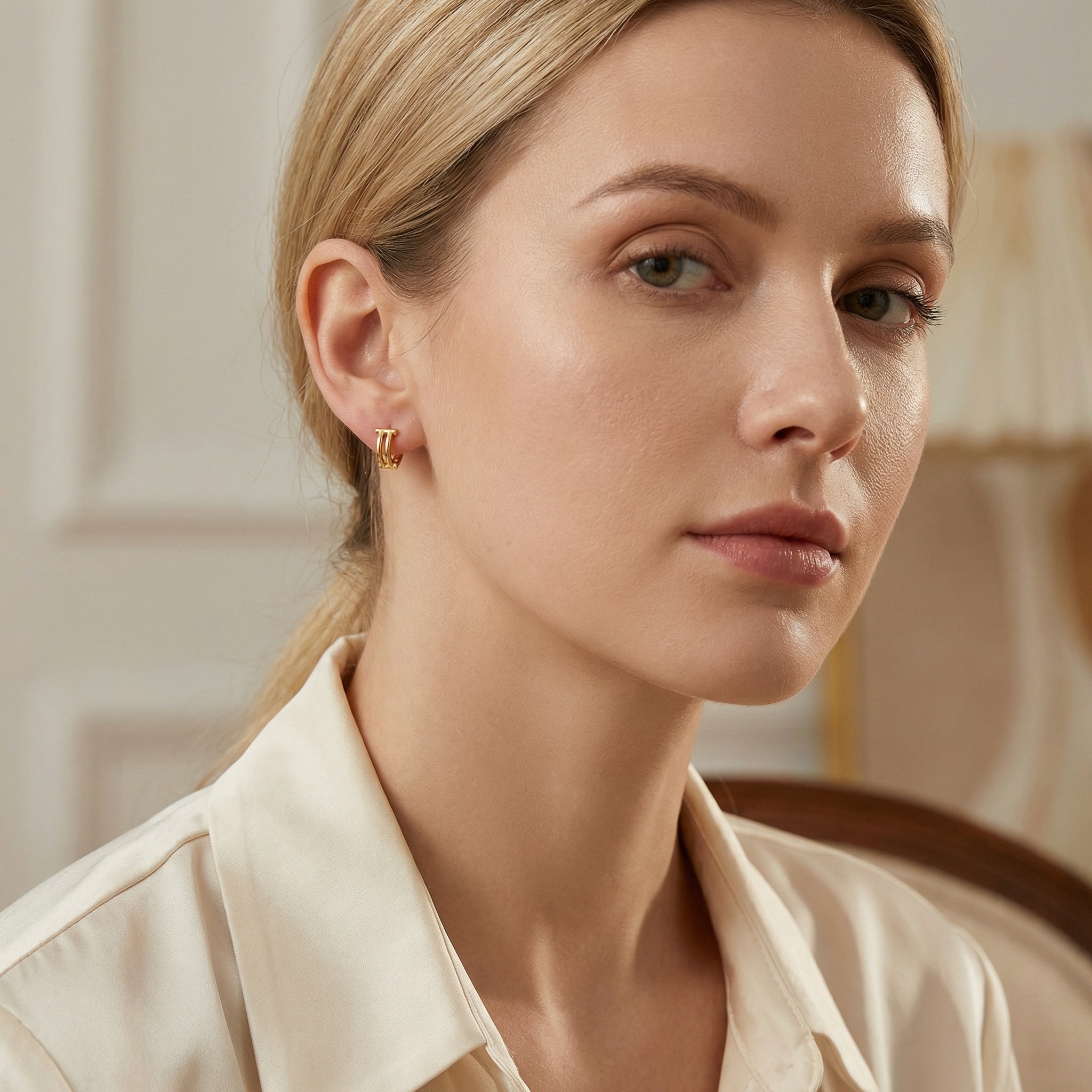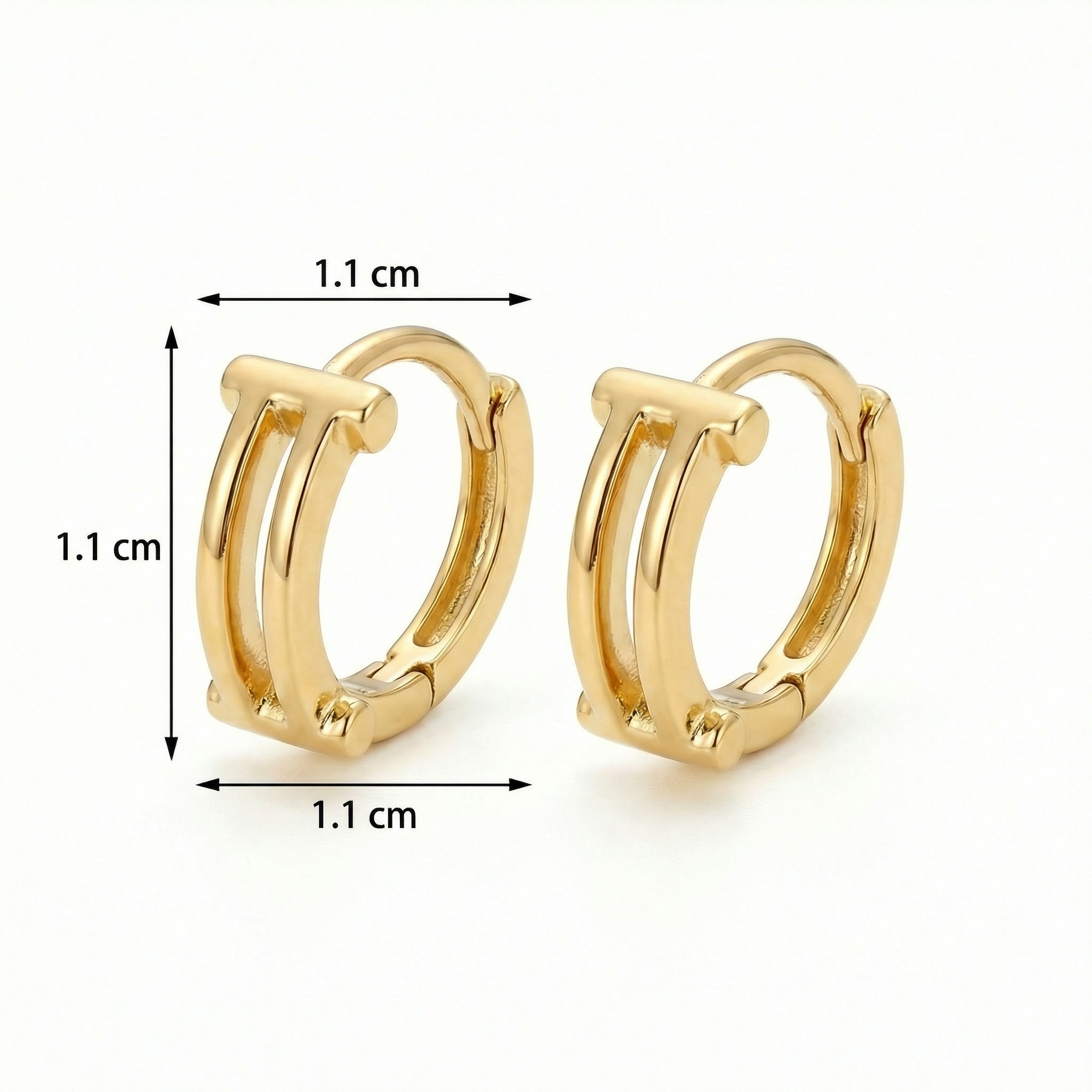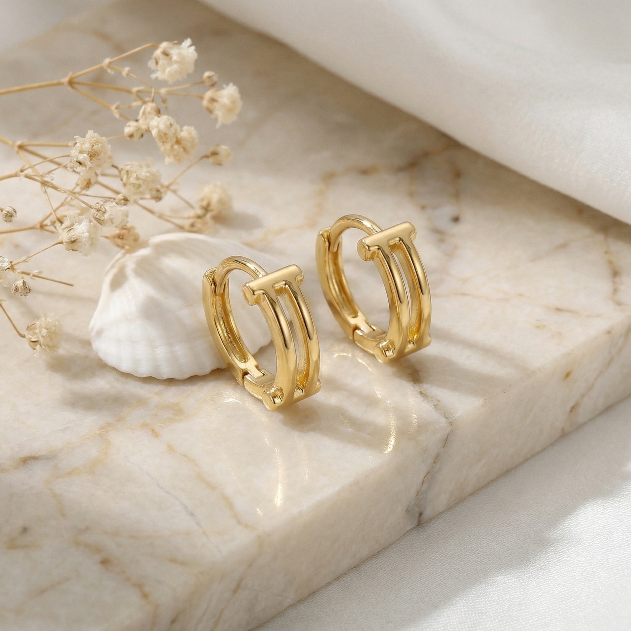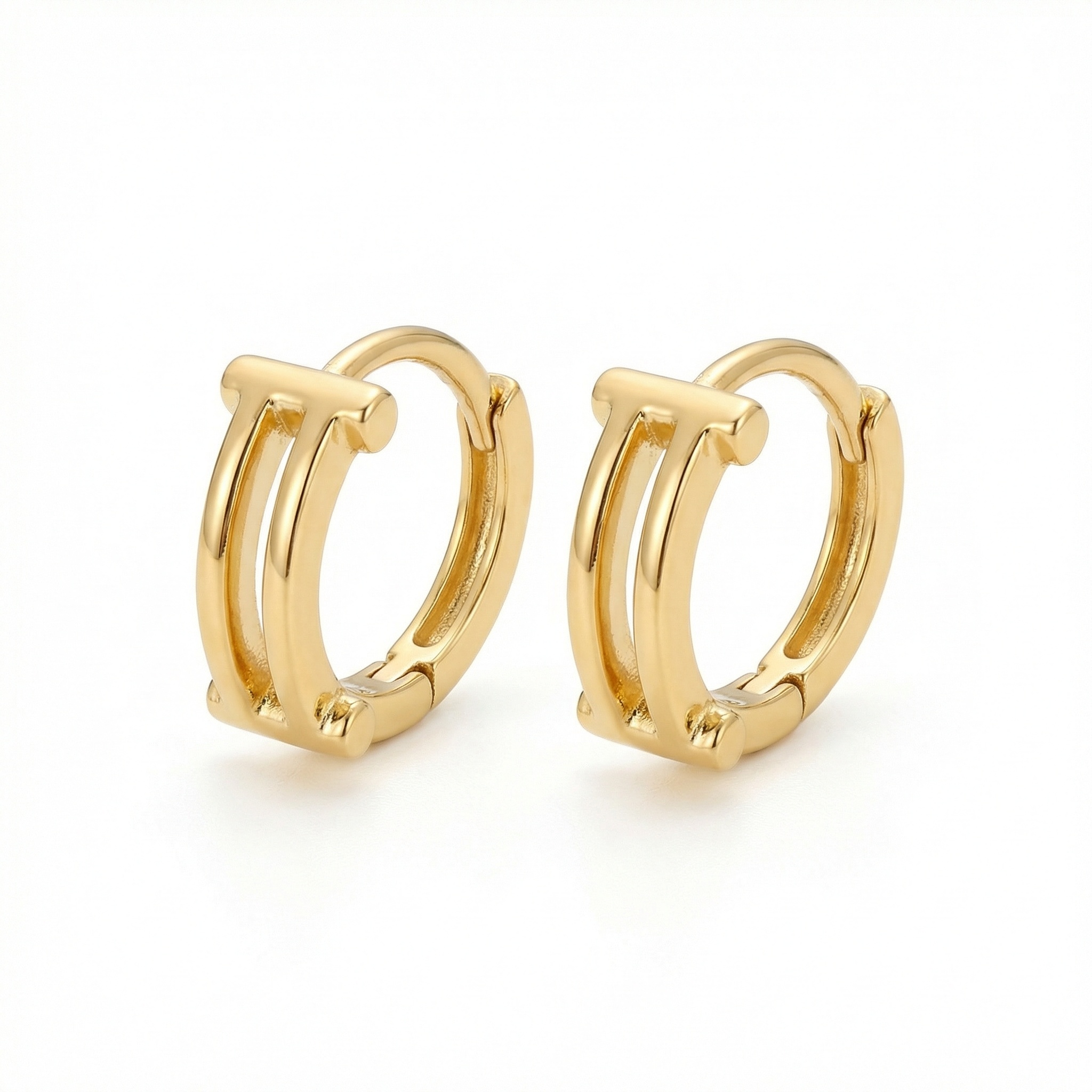 These sophisticated huggie hoop earrings feature a unique geometric design, showcasing two parallel bands connected by vertical bars to create a structured architectural look. The warm-toned metallic finish provides a radiant glow, perfect for adding a touch of contemporary elegance to any ensemble. With a convenient hinged clasp for secure and comfortable wear, these hoops are designed for both casual and formal occasions. The minimalist yet distinctive silhouette makes them an ideal choice for stacking or wearing alone as a refined statement piece. Crafted with a high-polished surface, they reflect light beautifully, enhancing their sleek and modern aesthetic. These versatile accessories are a must-have for anyone seeking timeless style with a modern twist. | Brand: jewelryodm