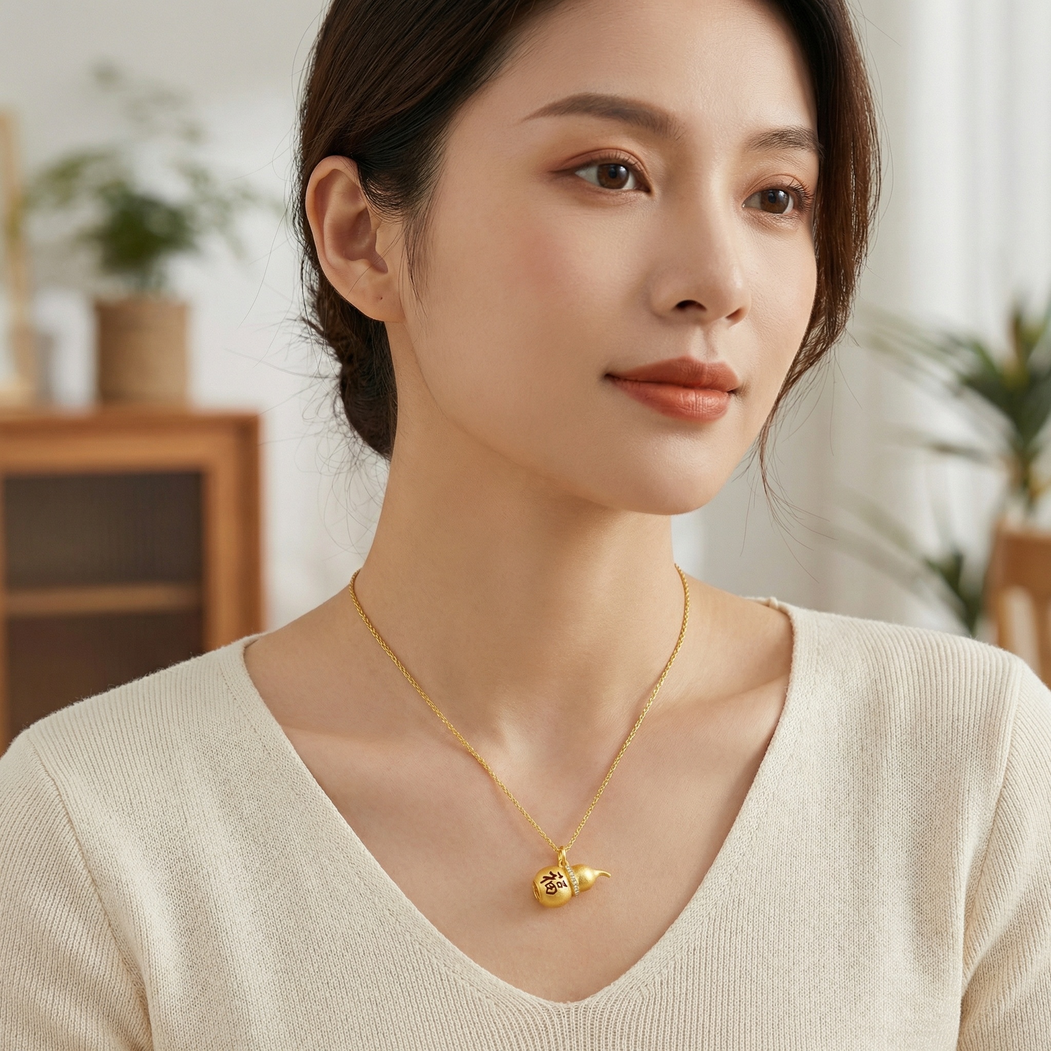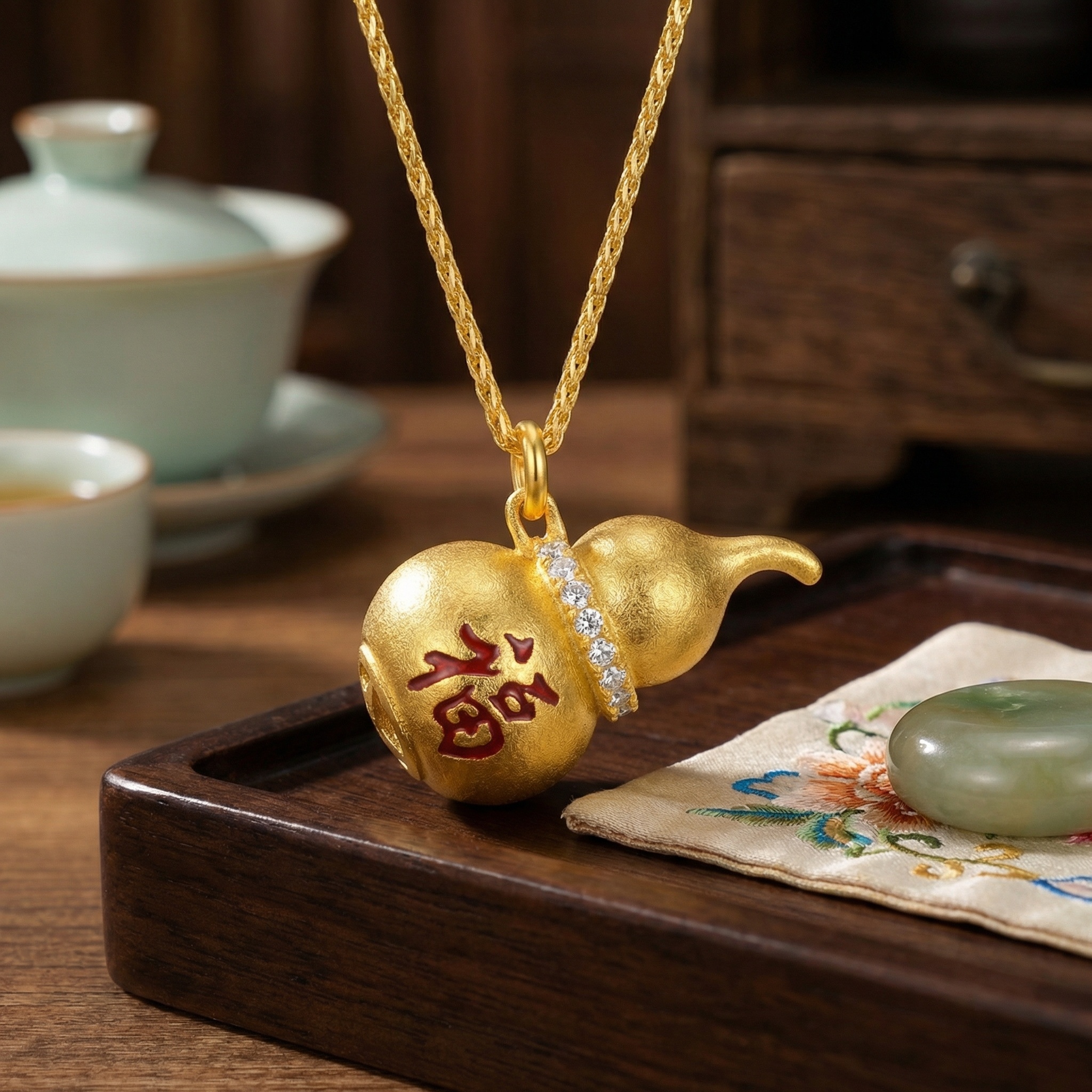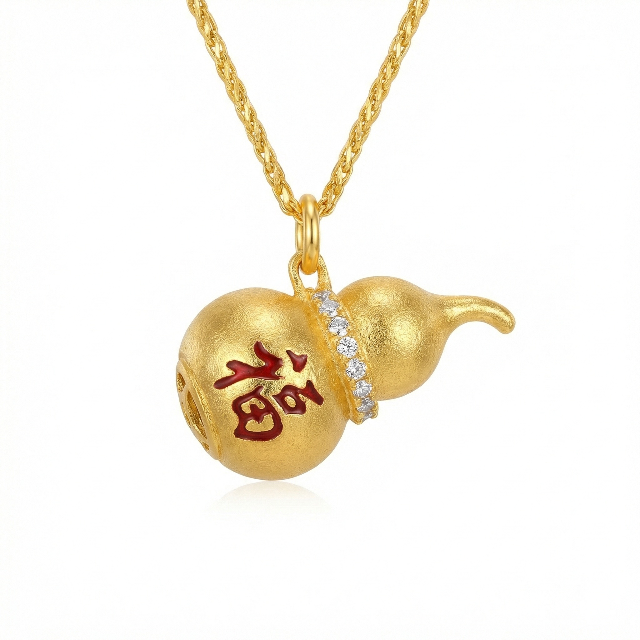 This exquisite pendant features a traditional gourd shape, known as a 'hulu,' which symbolizes prosperity and longevity. Crafted with a beautiful matte finish, the piece showcases a vibrant red character representing fortune and blessings. A sophisticated band of sparkling round-cut stones encircles the center, adding a touch of brilliance to the design. Suspended from a delicate matching chain, this necklace combines cultural heritage with modern elegance. The intricate detailing and warm metallic tones make it a perfect accessory for special occasions or a meaningful gift for loved ones. Its timeless appeal ensures it remains a cherished piece in any jewelry collection. | Brand: jewelryodm