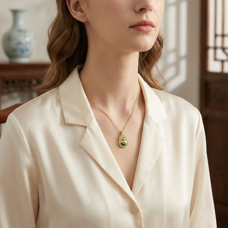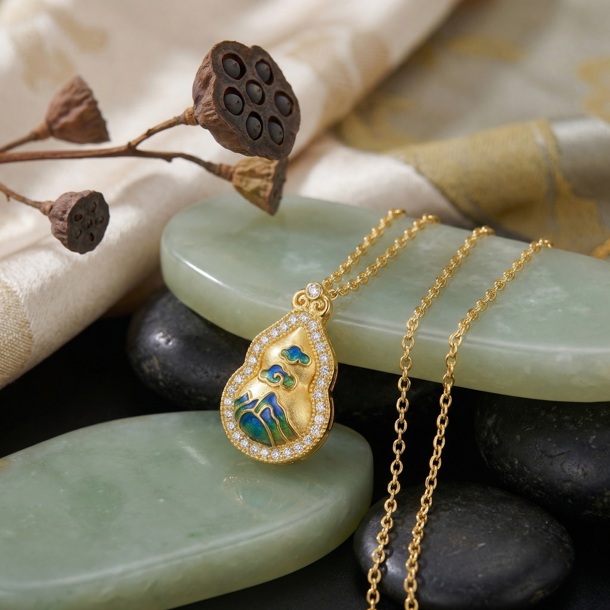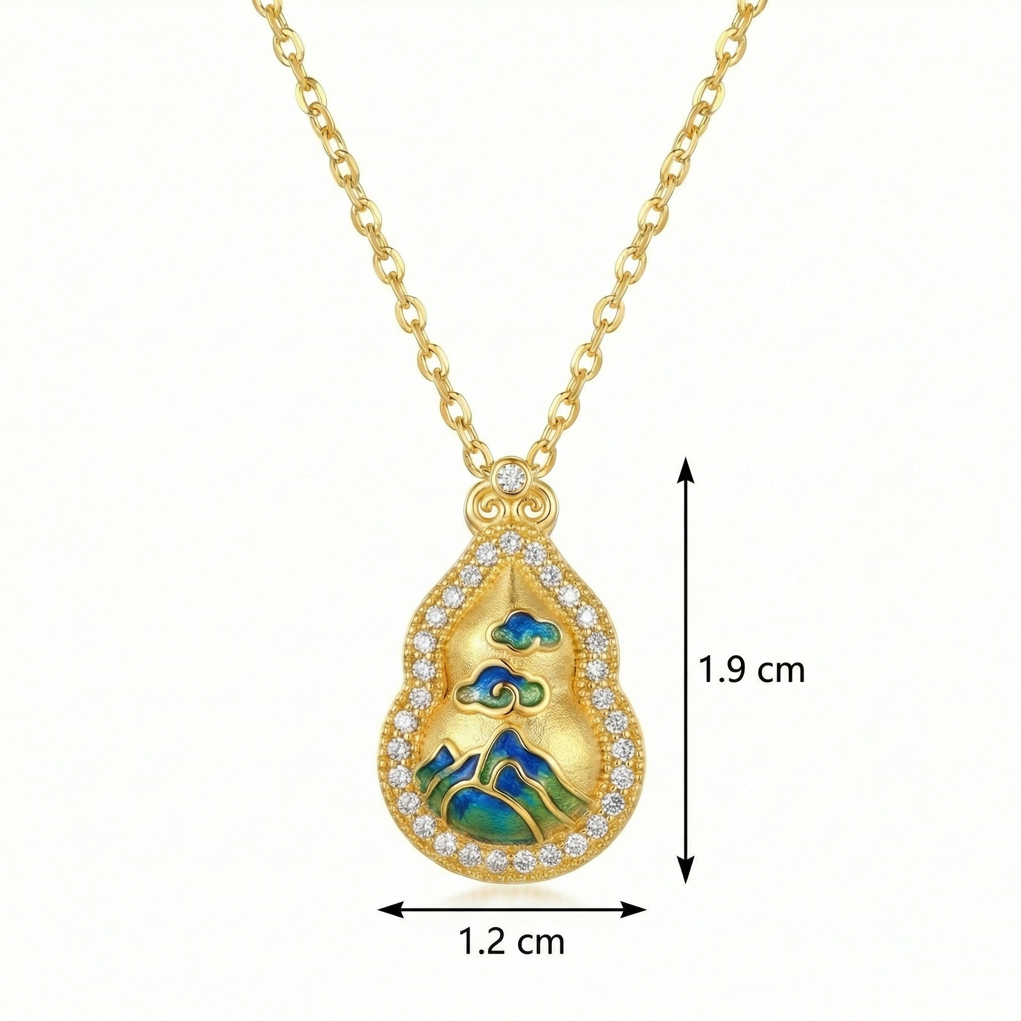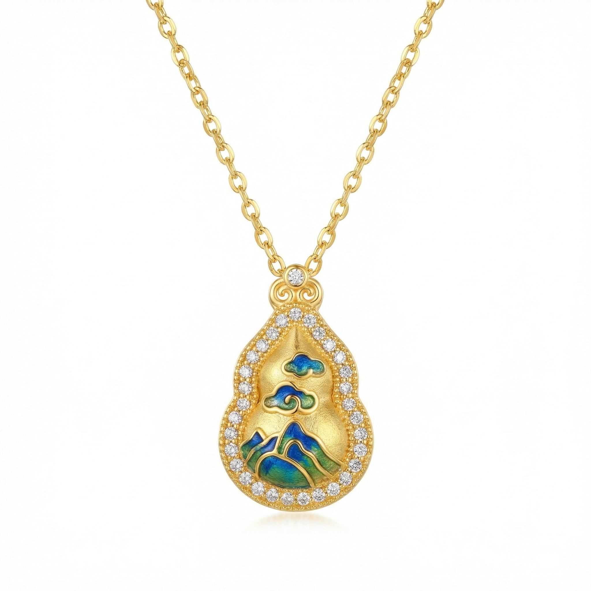 This exquisite necklace features a beautifully crafted gourd-shaped pendant, a traditional symbol of prosperity and longevity. At its heart lies a vivid landscape depicted in rich blue and green enamel, portraying majestic mountains and swirling clouds. The textured metallic surface adds depth to the design, while a halo of brilliant round-cut stones creates a radiant frame. Suspended from a classic link chain, this piece blends cultural heritage with contemporary elegance. Its intricate craftsmanship and meaningful symbolism make it a standout accessory for any occasion, offering a sophisticated touch of nature-inspired artistry to your ensemble. | Brand: jewelryodm