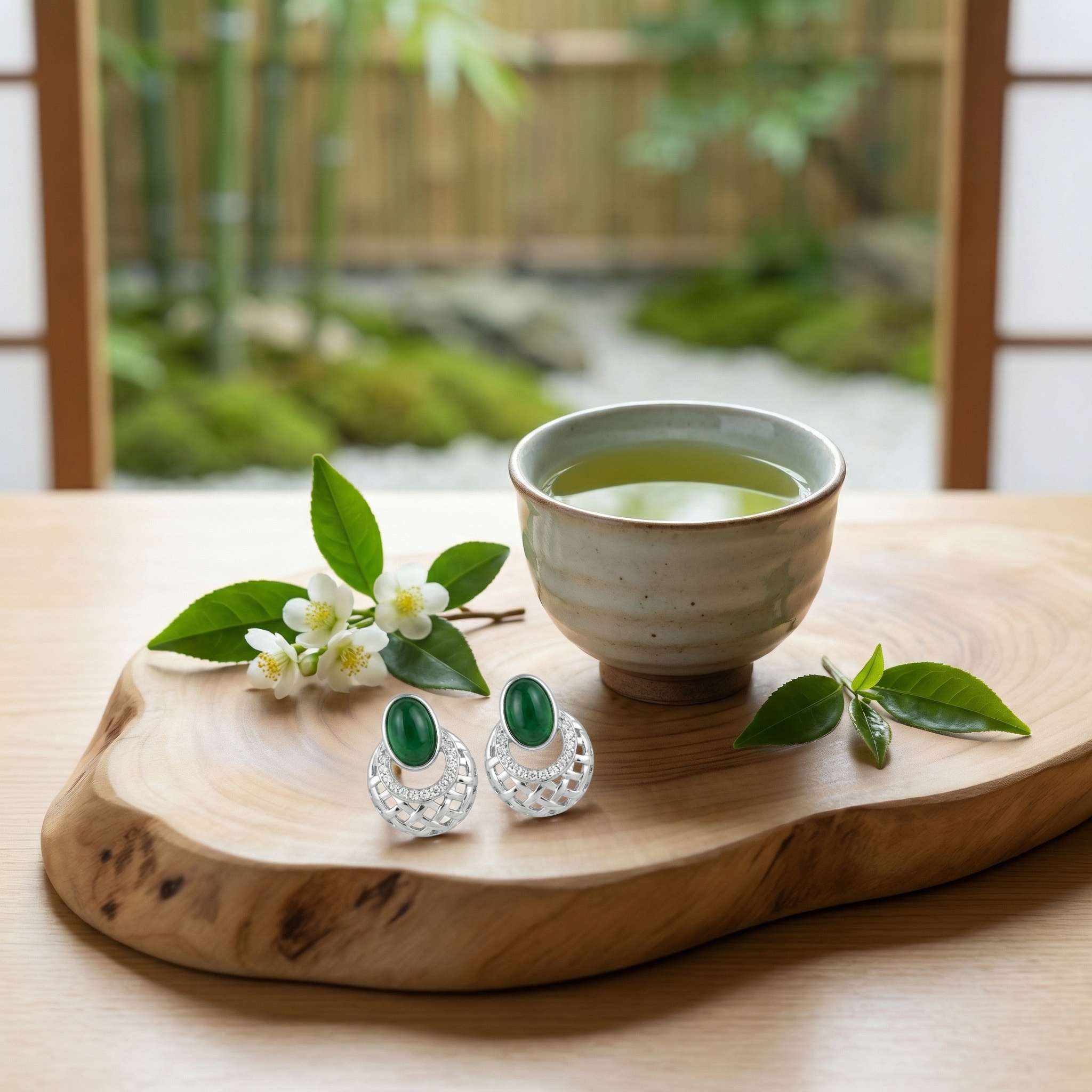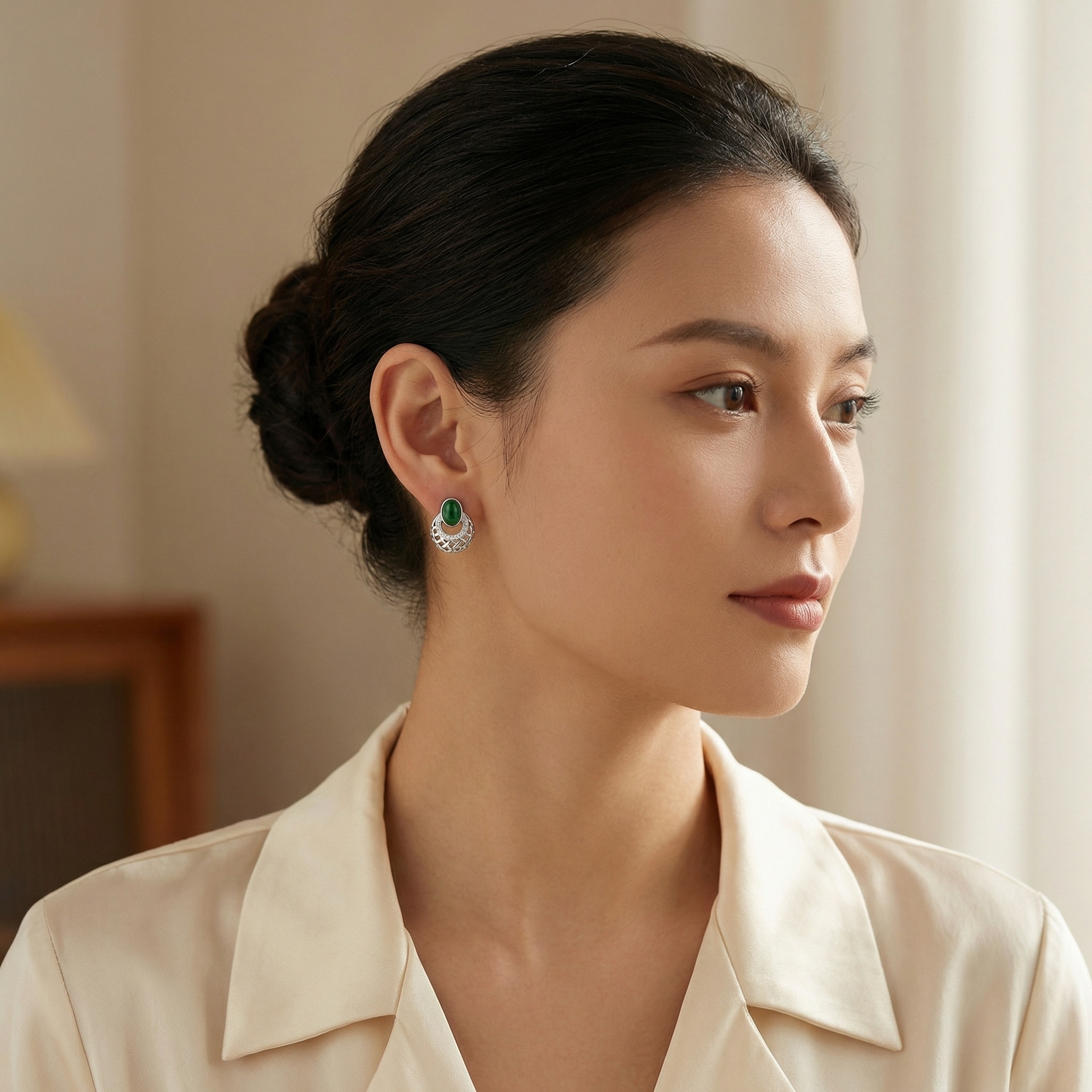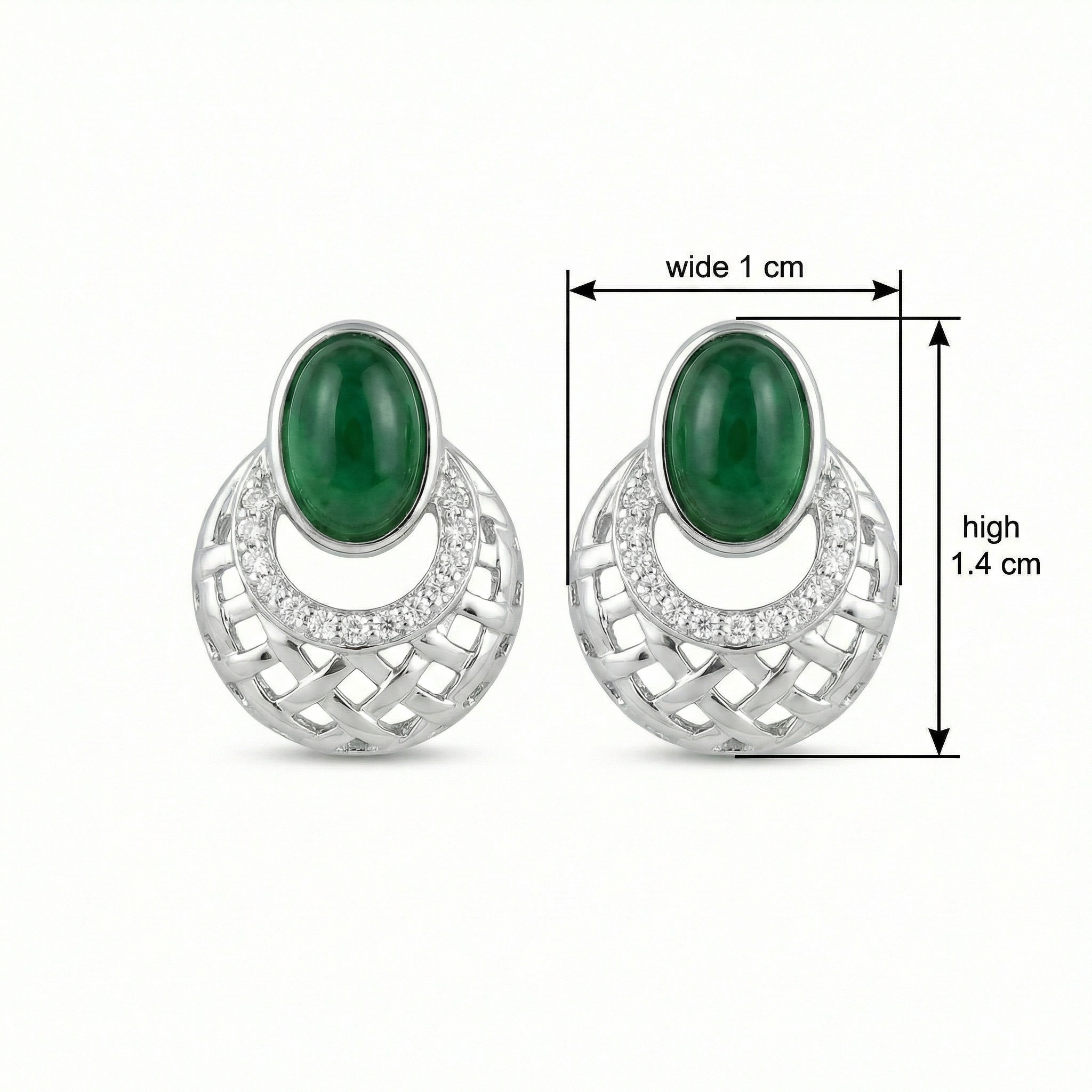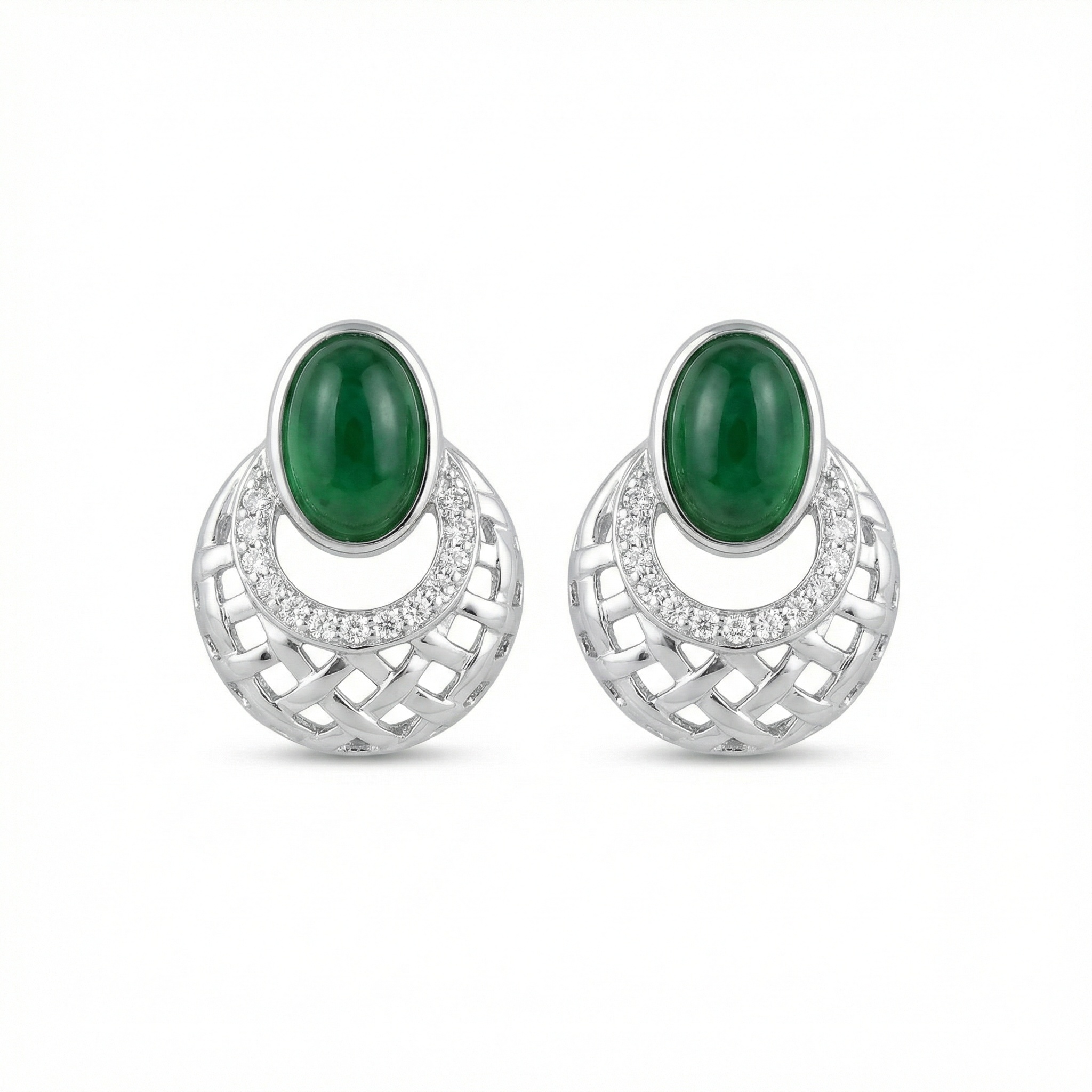 These stunning earrings feature vibrant, oval-cut green cabochon gemstones, exuding timeless elegance. Each stone is meticulously set in a polished silver frame, accented by a shimmering row of pavé-set diamonds that curve gracefully along the base. Below the central gemstone, a sophisticated circular drop showcases an intricate basket-weave lattice design, adding a contemporary architectural touch to the classic silhouette. The openwork metal craftsmanship creates a delicate play of light and shadow, making these earrings a captivating accessory. Perfectly blending traditional charm with modern artistry, these earrings are an ideal choice for adding a touch of luxury to evening attire or special occasions. Their high-shine finish and bold contrast between the deep green and bright silver ensure they stand out with refined beauty. | Brand: jewelryodm