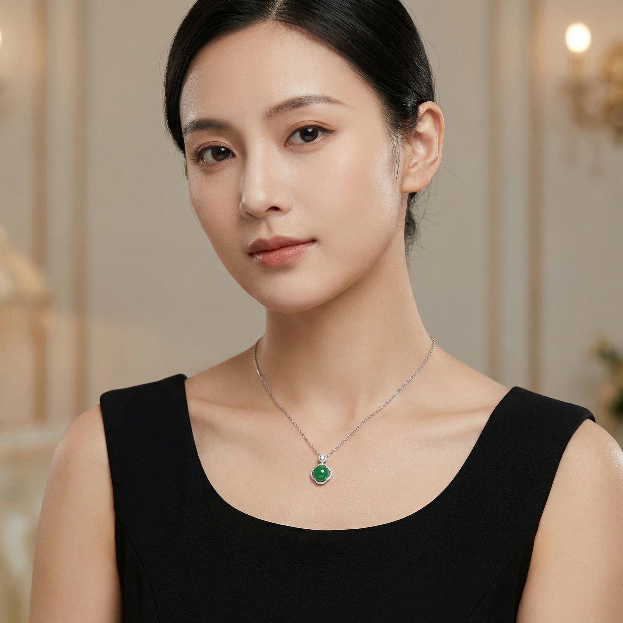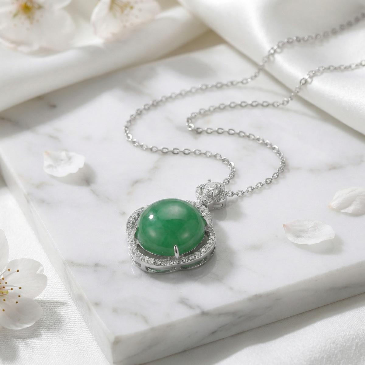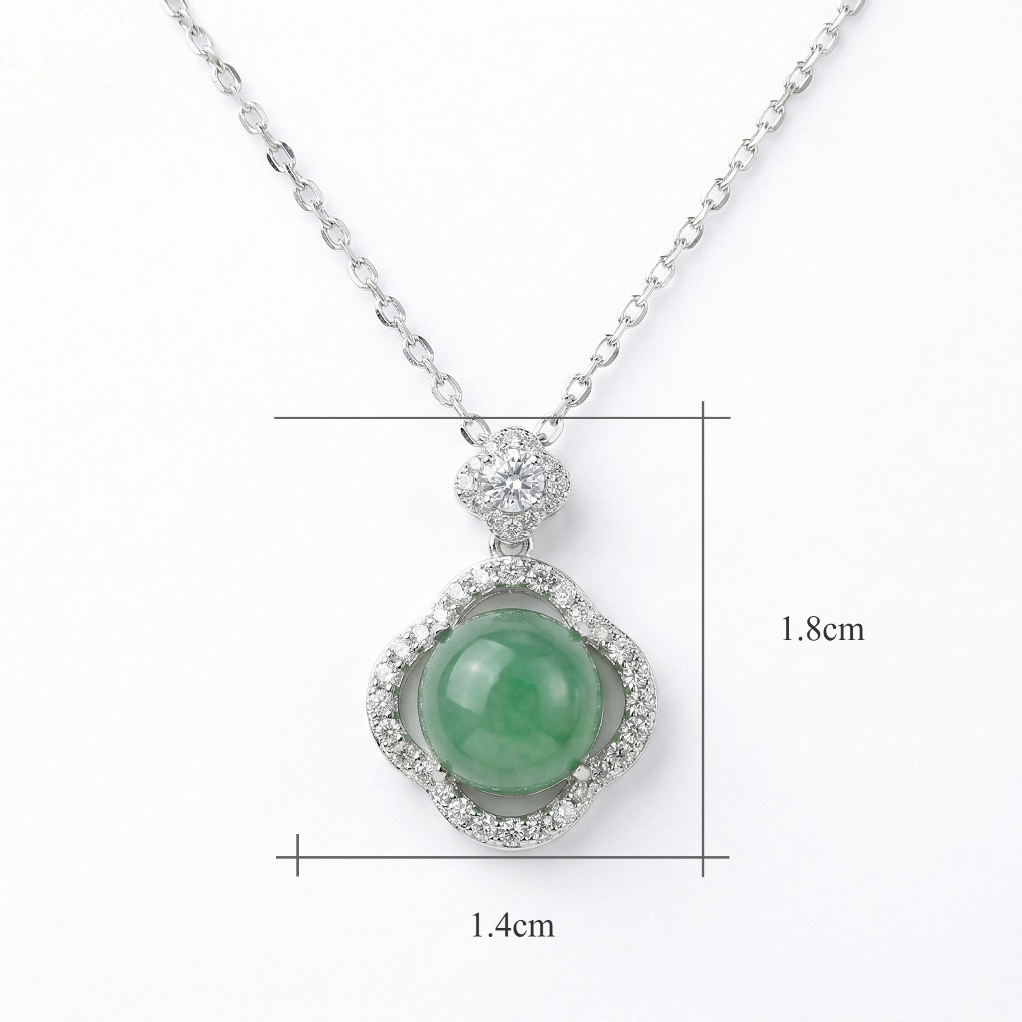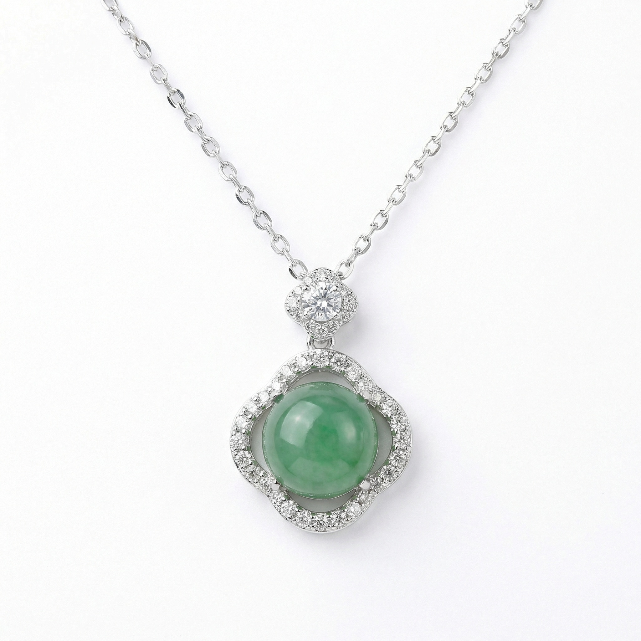 This sophisticated necklace features a round, translucent green jade cabochon at its heart, radiating a timeless and serene beauty. The central gemstone is framed by a striking quatrefoil-shaped border meticulously pavé-set with brilliant white diamonds, adding a luxurious sparkle. A smaller, diamond-studded floral motif serves as a delicate bail, connecting the pendant to a polished silver cable chain. The harmonious blend of deep green jade and shimmering accents creates a refined aesthetic suitable for both formal events and everyday elegance. Crafted with precision, this piece is an ideal choice for those who appreciate classic jewelry with a modern, artistic flair. | Brand: jewelryodm