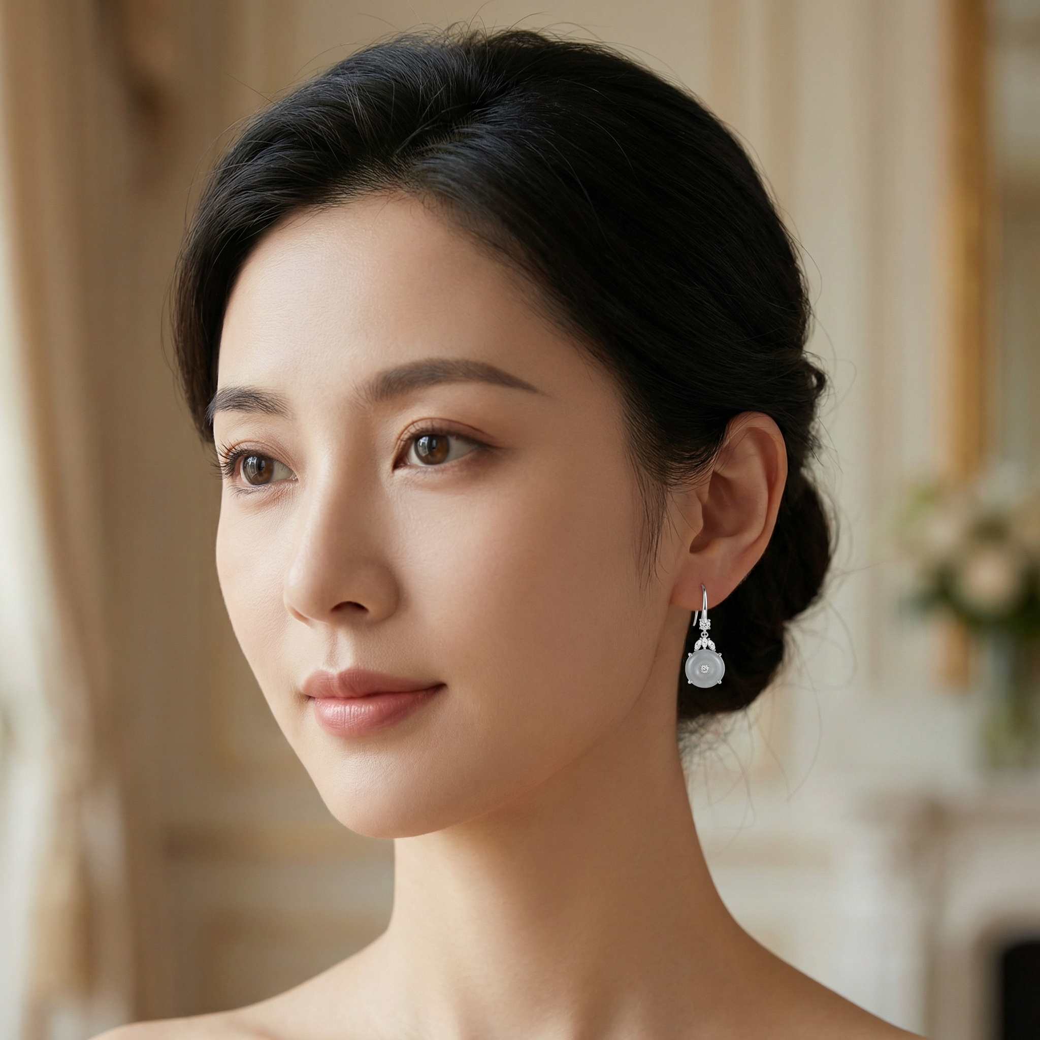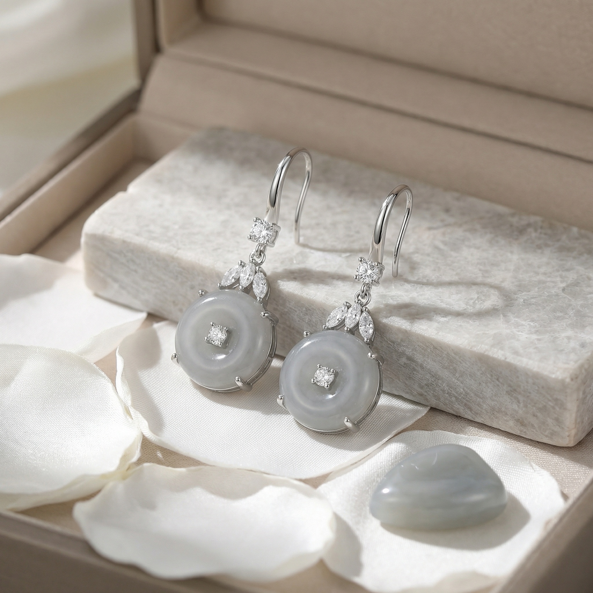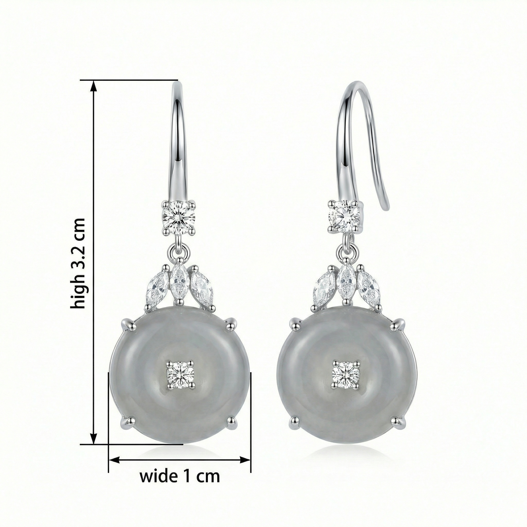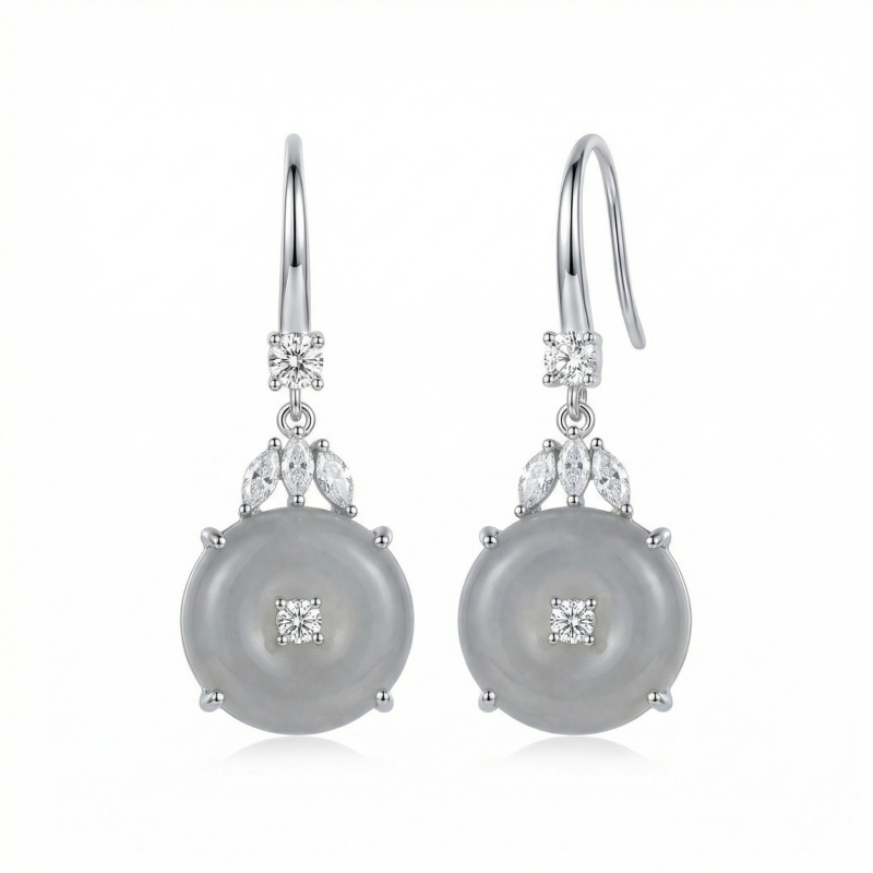 These sophisticated drop earrings feature a timeless design blending traditional symbols with modern elegance. Each piece showcases a translucent grey jadeite "Ping An Kou" disc, representing safety and peace, with a brilliant round-cut stone at its center. Above the jadeite, a delicate arrangement of three marquise-shaped stones creates a graceful leaf pattern, topped with an additional sparkling round accent for enhanced radiance. Crafted with a sleek silver-toned finish, these earrings utilize comfortable hook wires for effortless wear. The neutral, understated grey tones paired with shimmering accents make them a versatile accessory suitable for both formal events and everyday luxury. Balancing cultural heritage with contemporary style, these earrings serve as a perfect gift or a refined addition to any jewelry collection. | Brand: jewelryodm