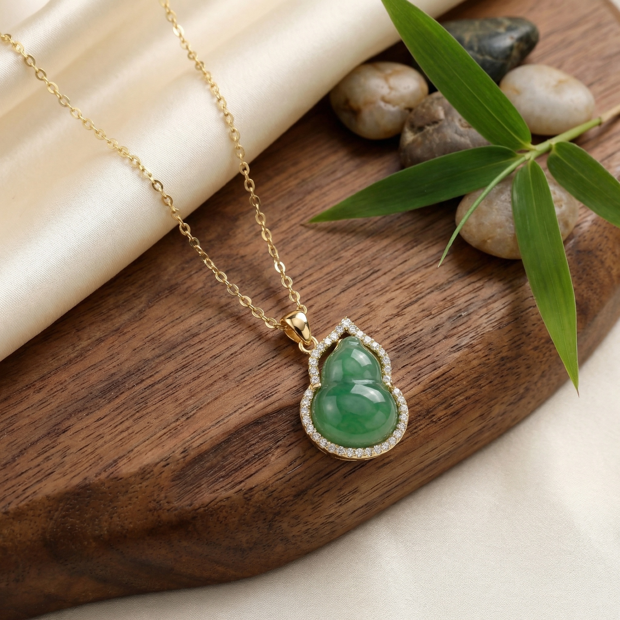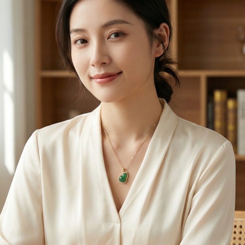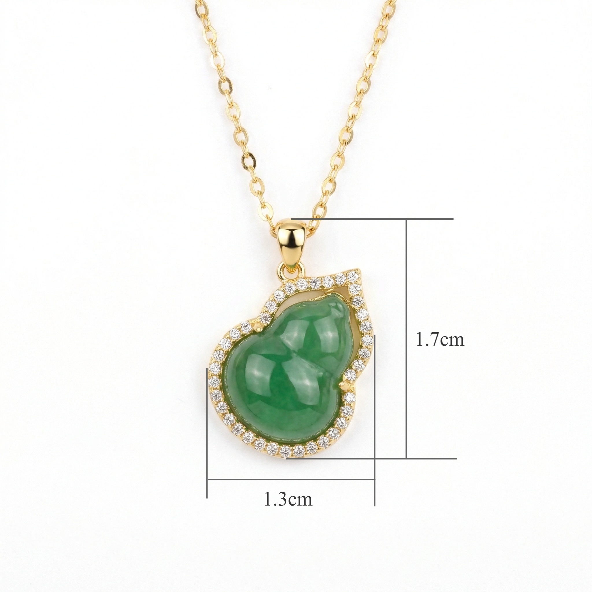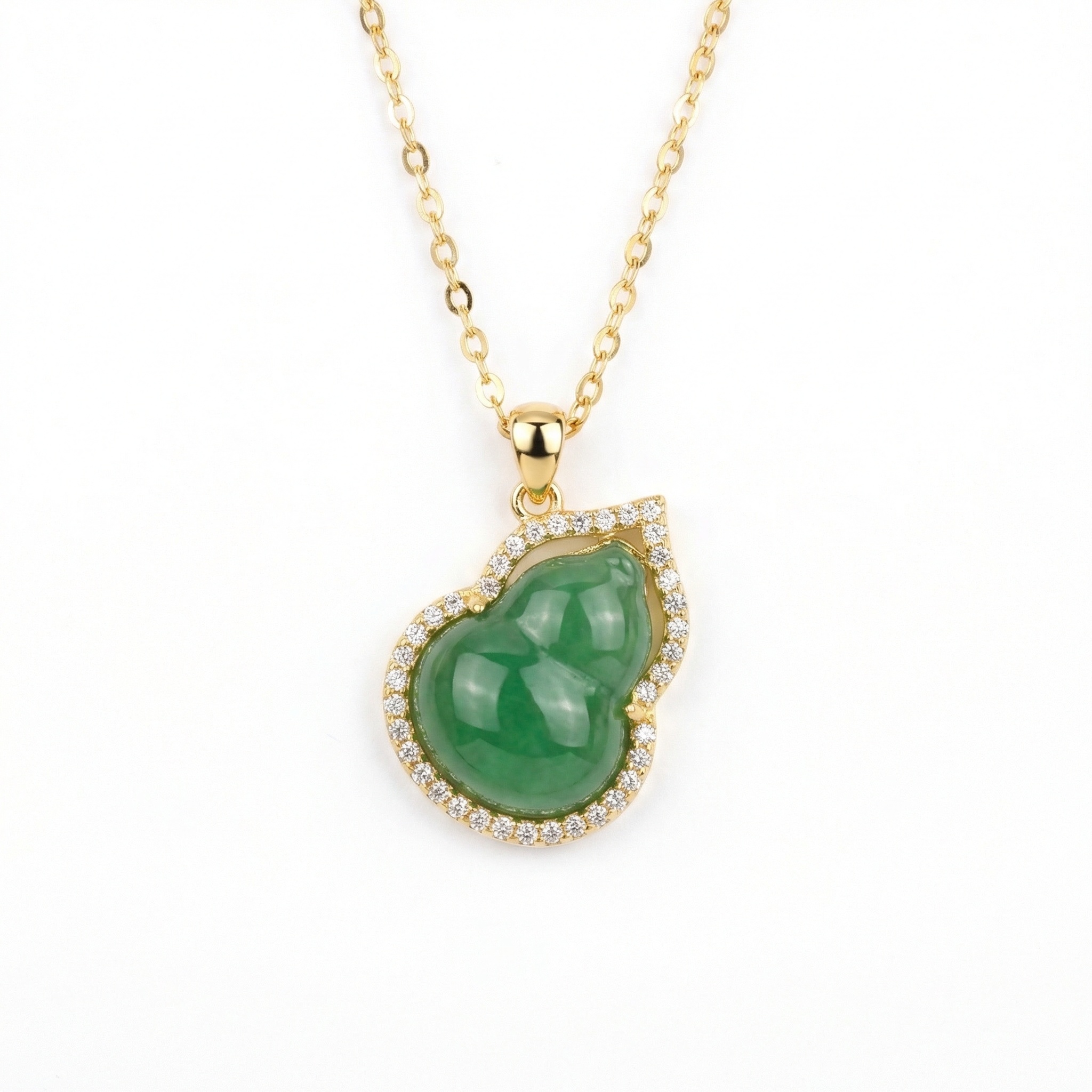 This sophisticated pendant features a translucent green jadeite gemstone masterfully carved into a traditional gourd silhouette, a timeless symbol of prosperity and well-being. The central piece is beautifully framed by a radiant halo of brilliant pavé-set accents that add a touch of sparkle and luxury. Suspended from a dainty link chain, the warm metallic setting enhances the natural depth and richness of the jade. Perfect for both formal events and everyday wear, this piece combines classic heritage with contemporary jewelry design. Its polished finish and intricate detailing make it a stunning centerpiece that symbolizes harmony and good fortune, making it a thoughtful gift for any jewelry lover seeking a touch of natural beauty and elegance. | Brand: jewelryodm