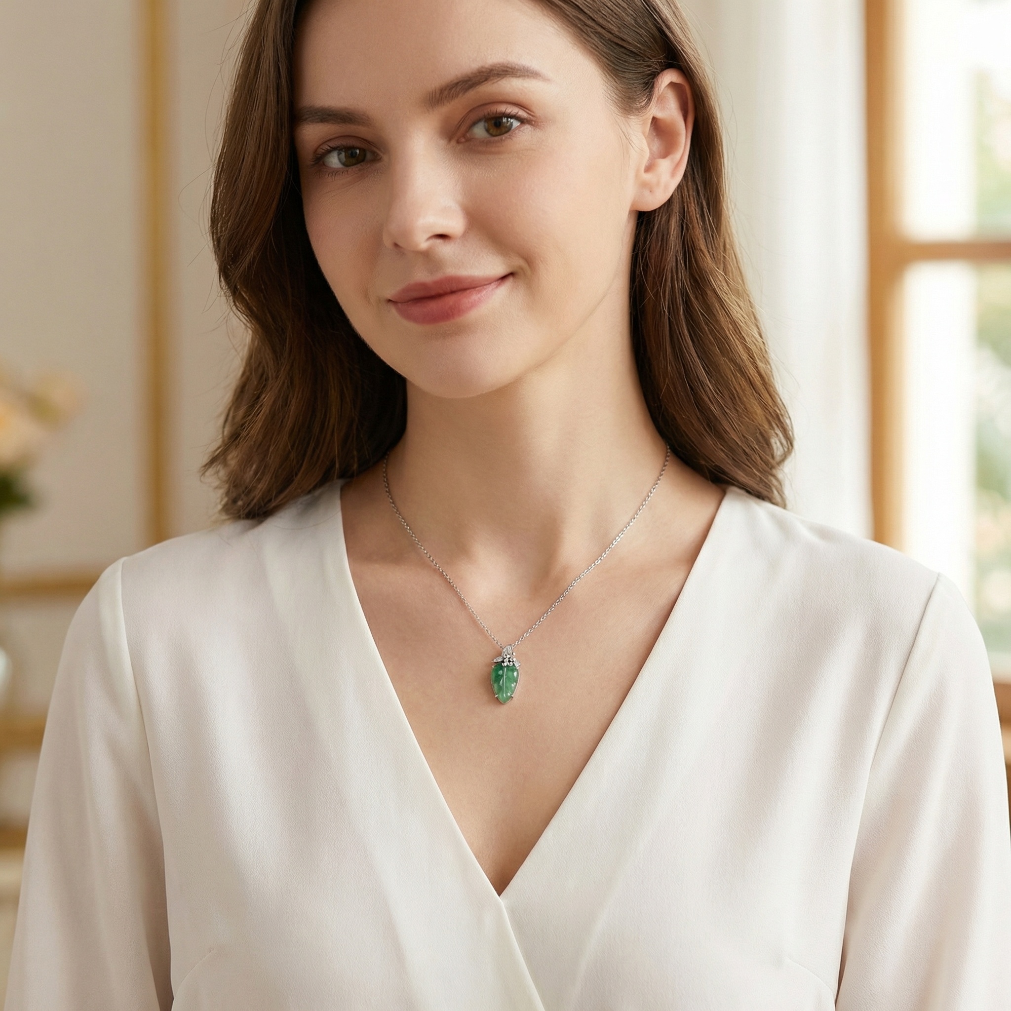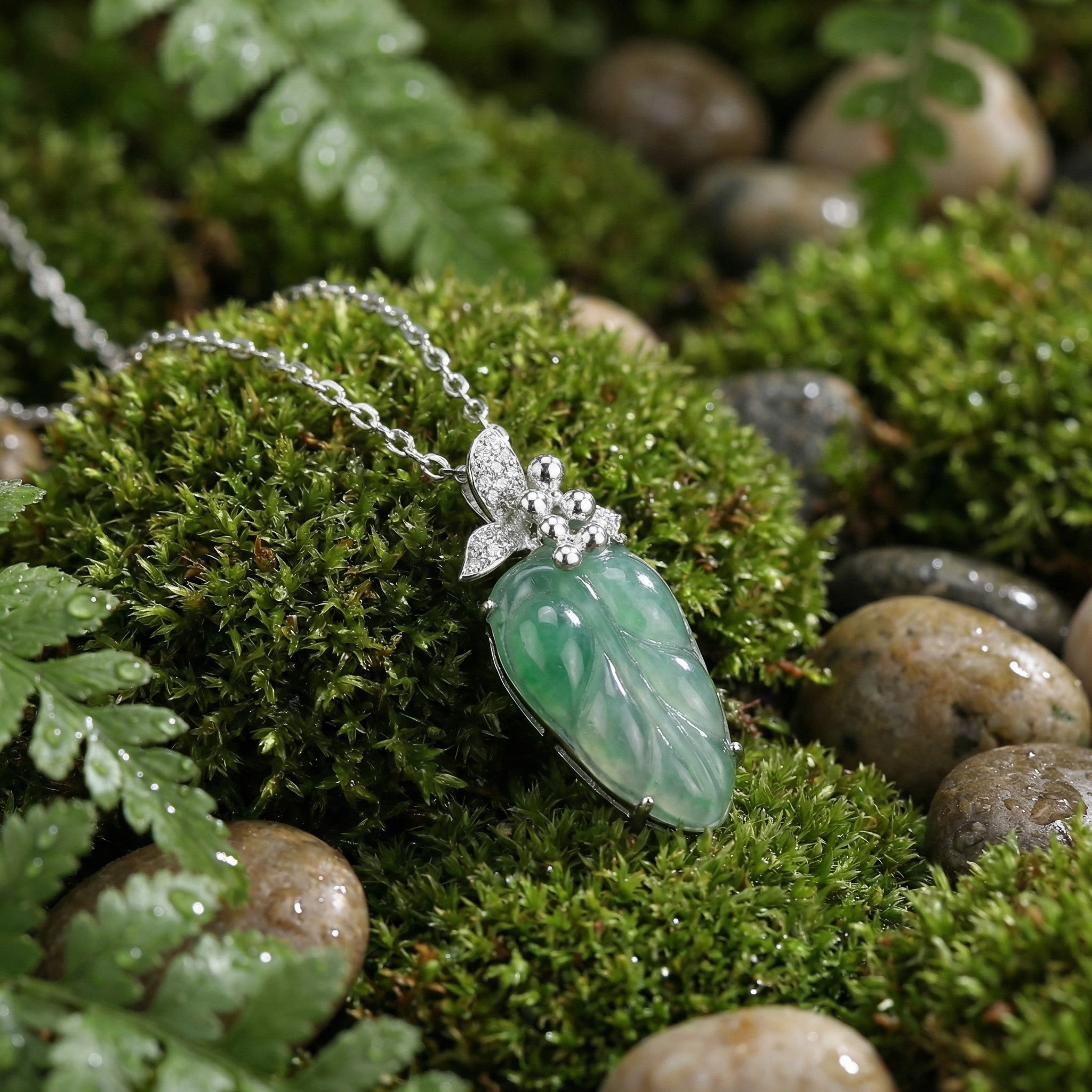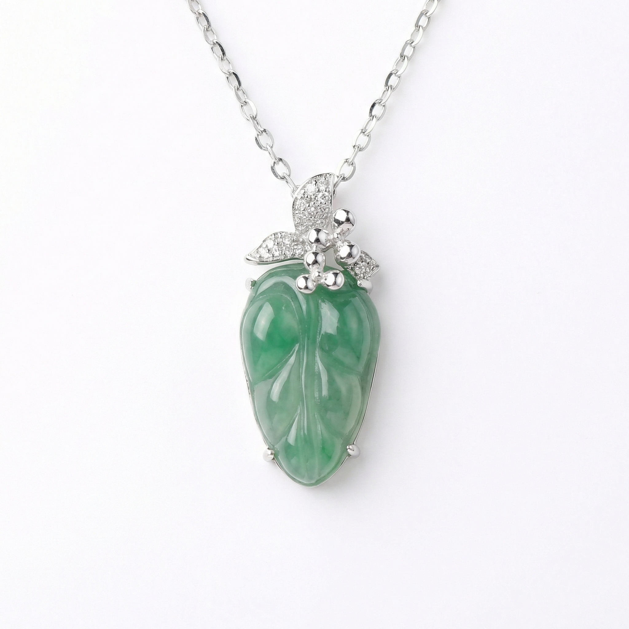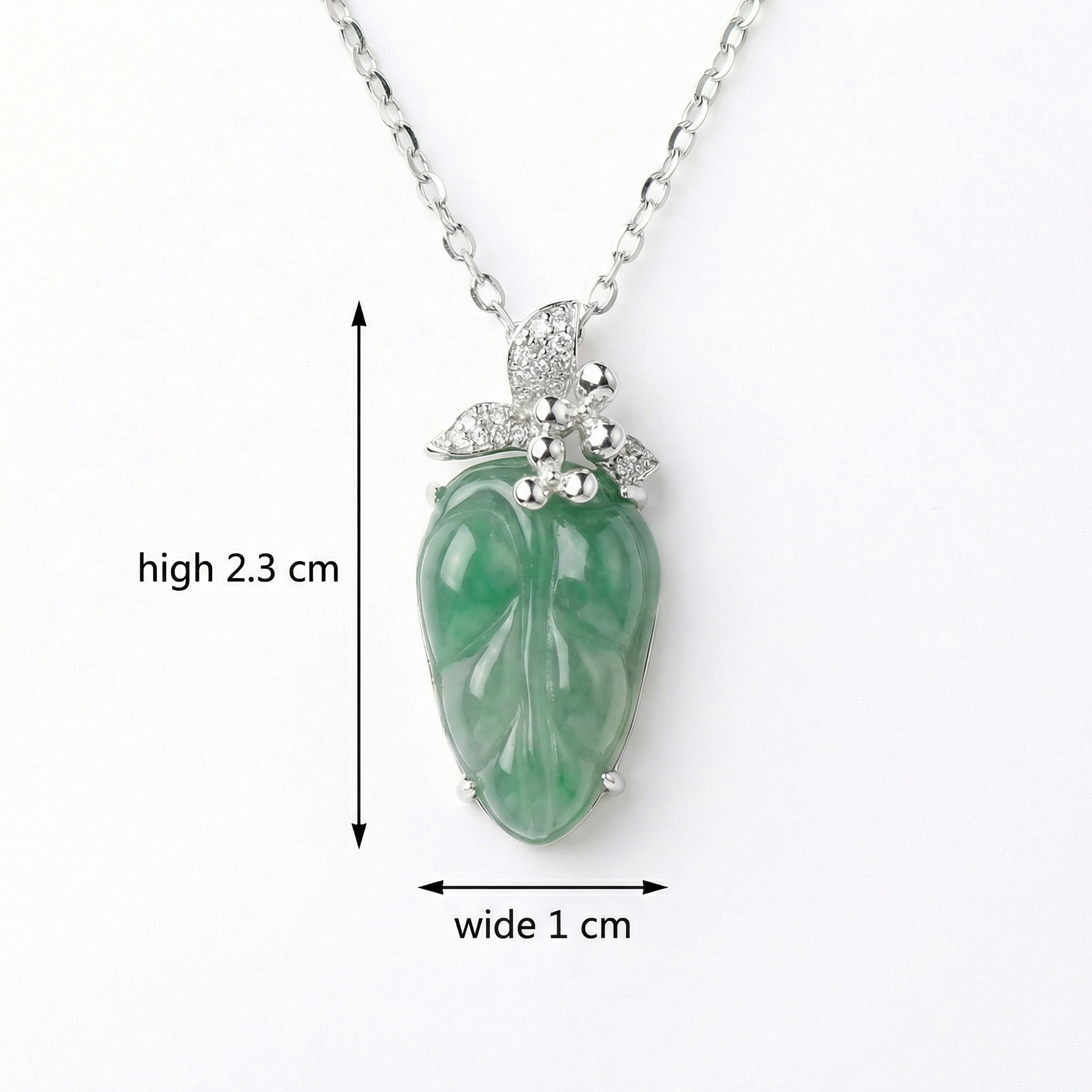 This exquisite necklace features a stunning leaf-shaped pendant carved from translucent green jade. The jade's rich, natural green hues are beautifully complemented by a delicate silver-toned setting at the top, intricately designed with smaller leaf motifs and shimmering diamond-like accents. A cluster of polished silver beads adds a modern touch to the classic botanical design. Suspended from a graceful cable chain, this piece blends traditional gemstone craftsmanship with contemporary elegance. Perfect for adding a touch of nature-inspired beauty to any ensemble, the pendant captures light through its smooth, polished surface and brilliant stone embellishments. This timeless accessory symbolizes vitality and growth, making it a sophisticated addition to any fine jewelry collection. | Brand: jewelryodm