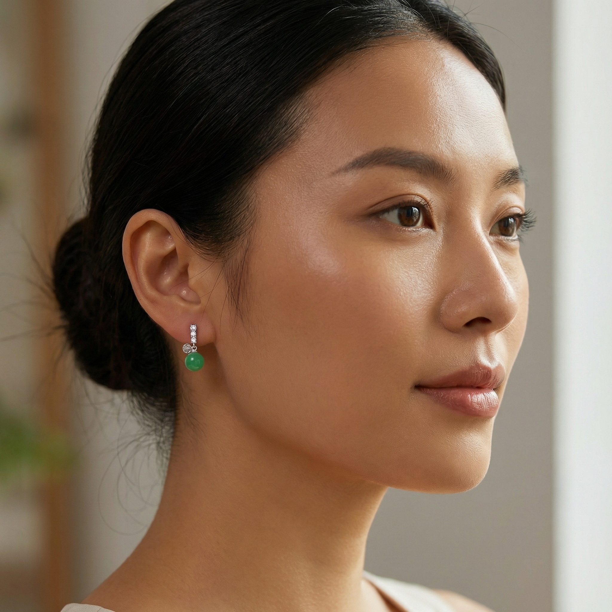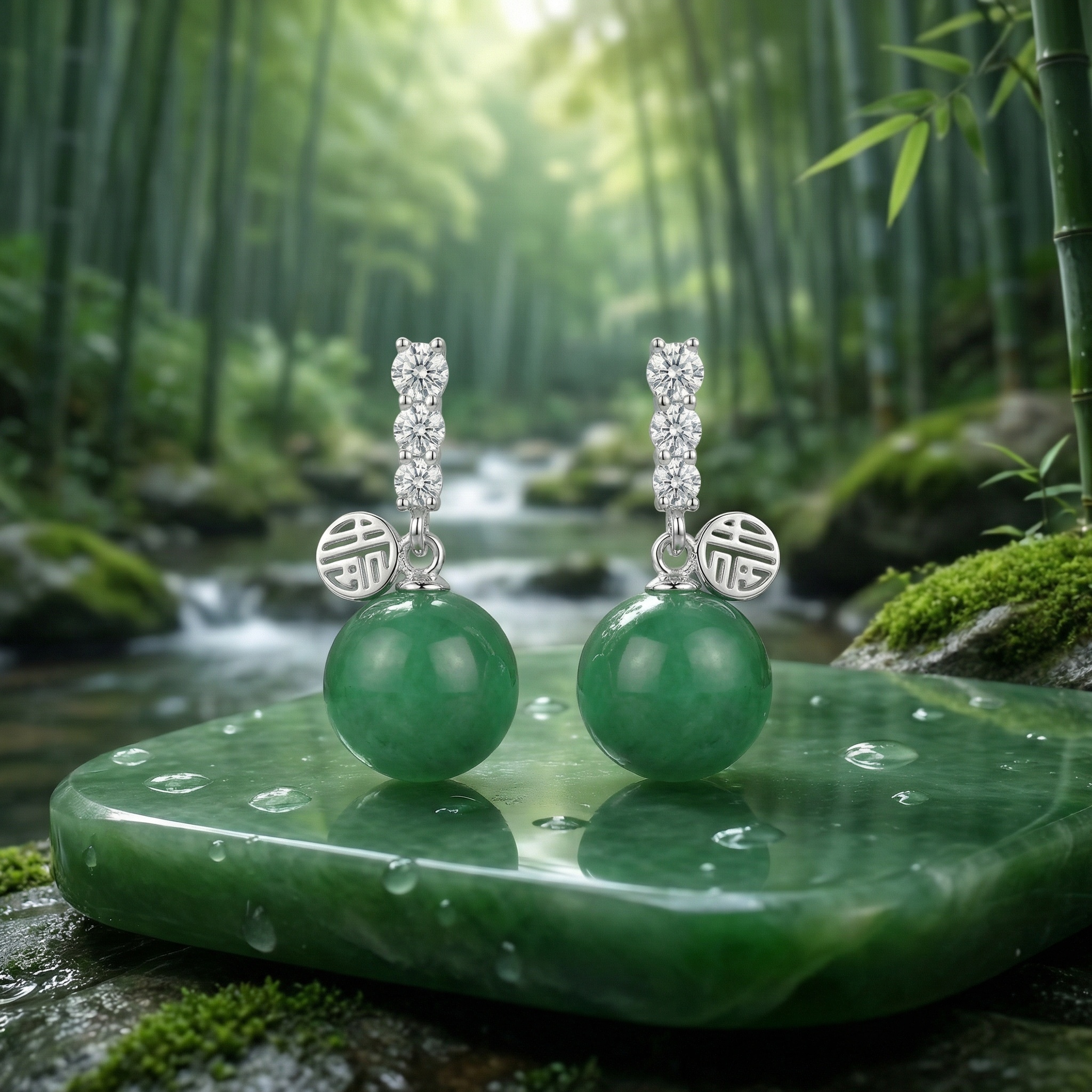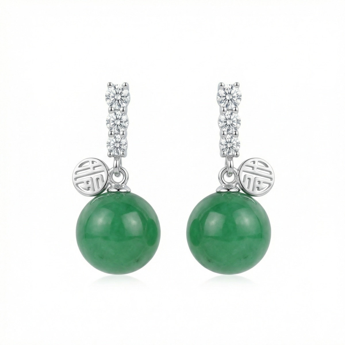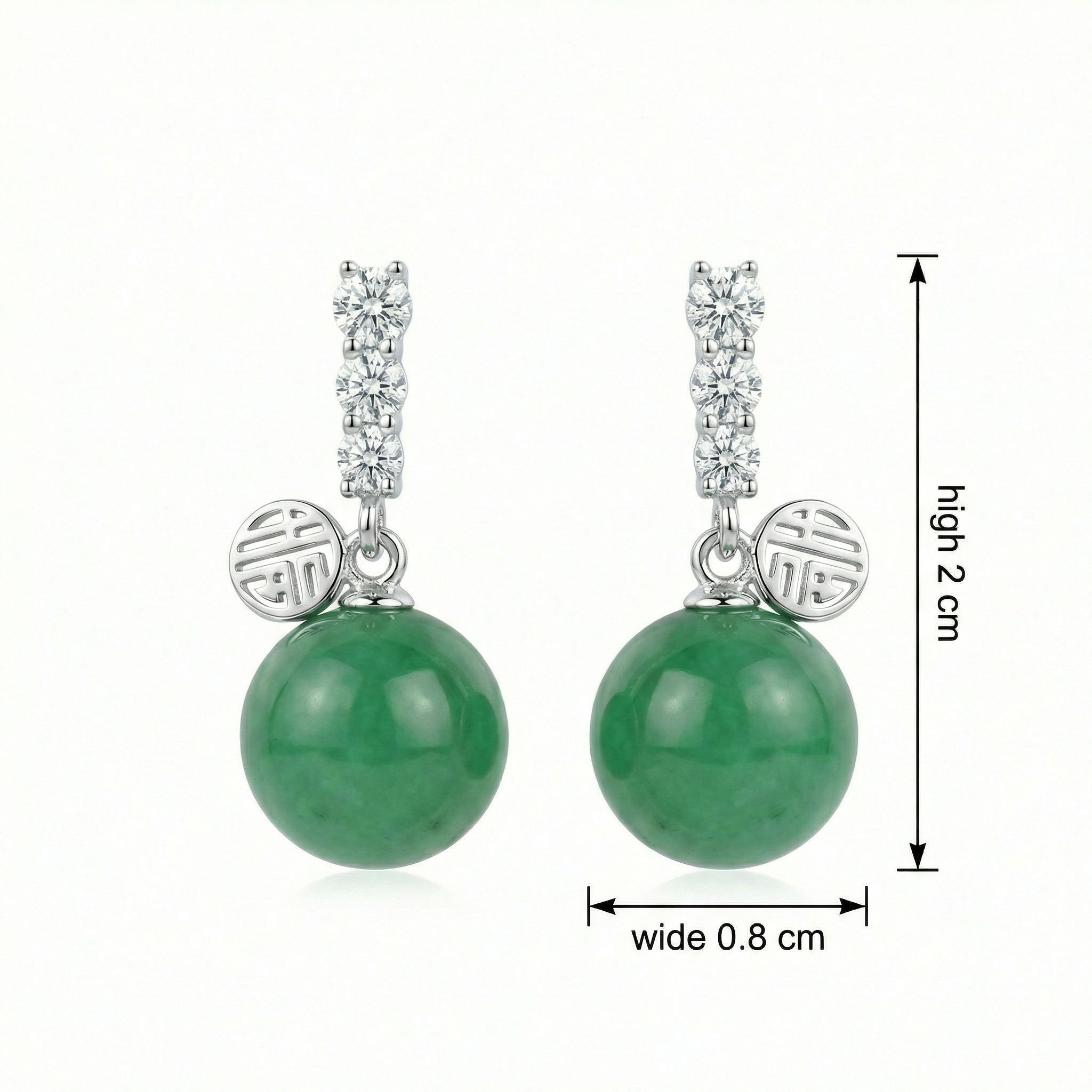 This exquisite pair of drop earrings features vibrant green jade-colored spheres suspended from a polished silver-tone setting. The upper post is elegantly adorned with three vertically stacked clear brilliant-cut gemstones that capture and reflect light beautifully. Adding a unique cultural touch, each earring includes a delicate circular charm featuring a traditional Chinese character, symbolizing "Fortune" or "Good Luck." The striking contrast between the rich green stones and the shimmering silver finish creates a sophisticated and timeless aesthetic. Blending traditional Eastern symbolism with modern jewelry design, these earrings are perfect for adding a touch of refined elegance to any ensemble. Their graceful drop design ensures they sway subtly with movement, making them a captivating and meaningful addition to any fine jewelry collection. | Brand: jewelryodm