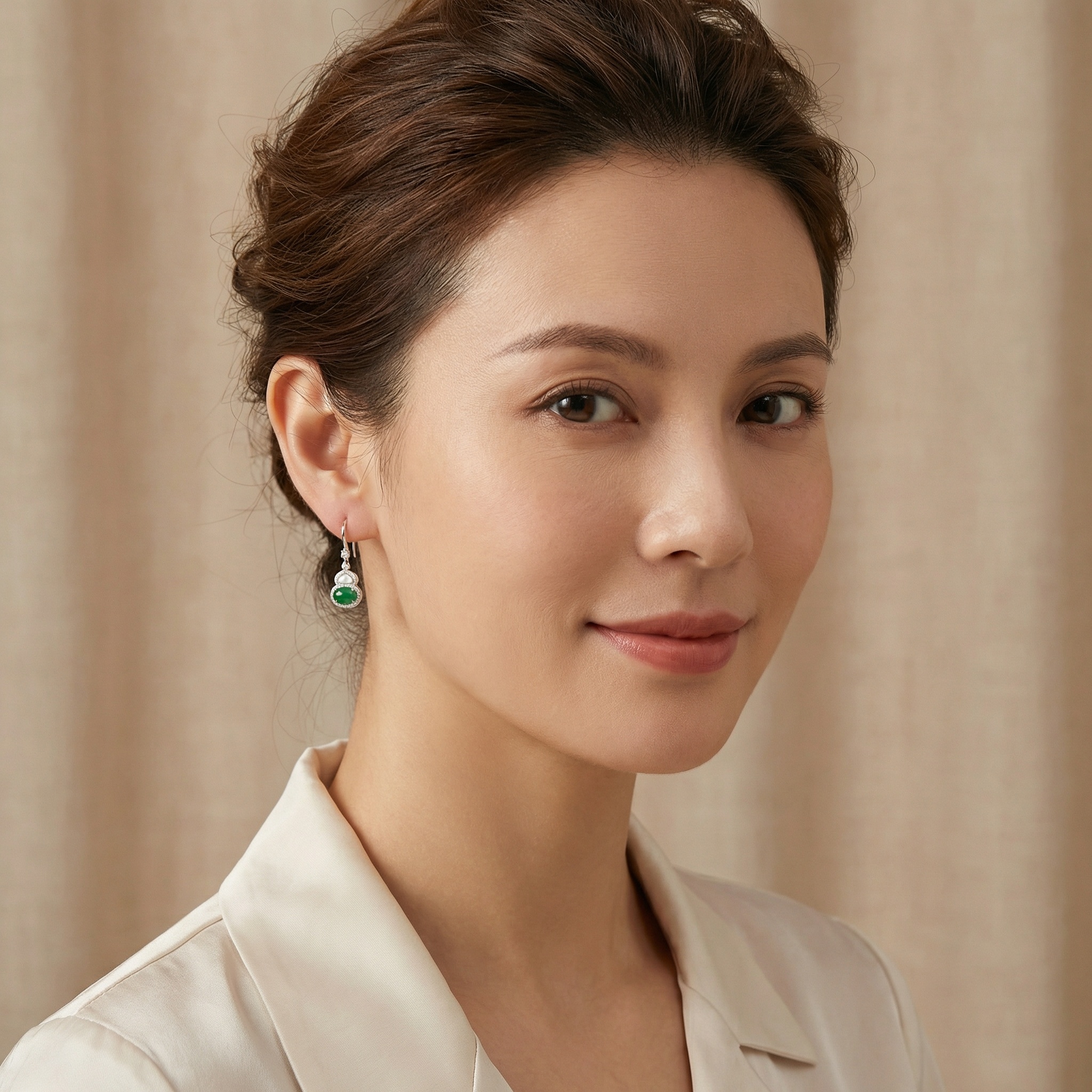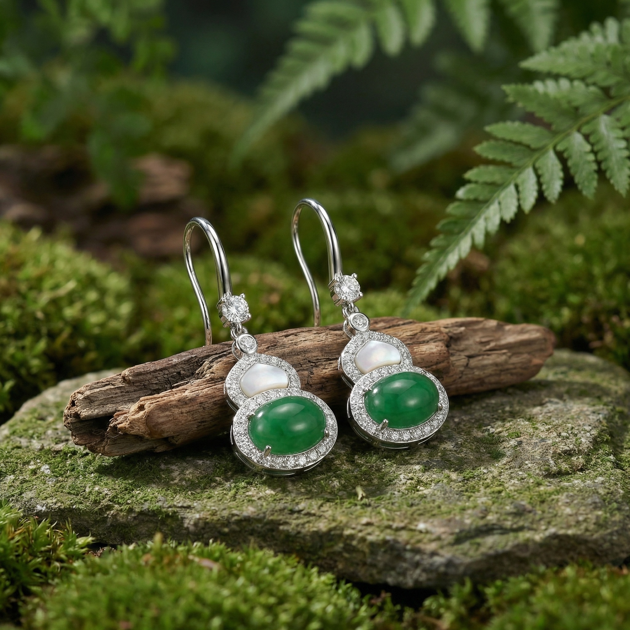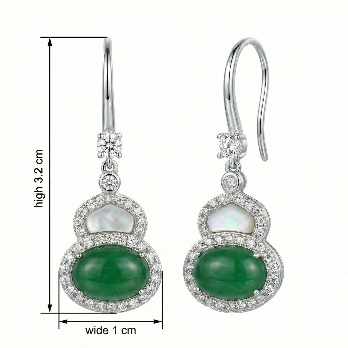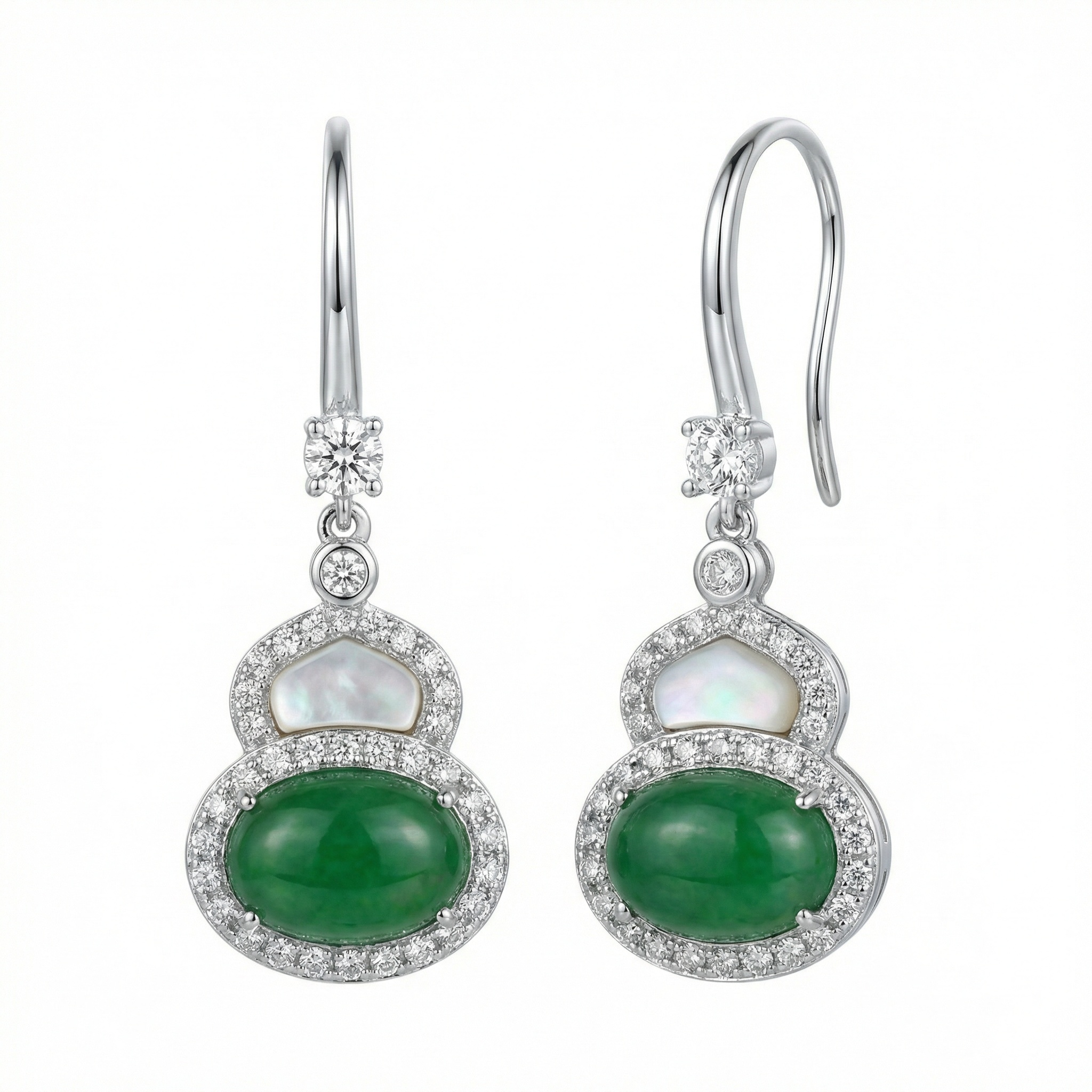 These exquisite drop earrings feature a modern interpretation of the traditional Chinese "Hulu" or gourd design, a symbol of longevity and prosperity. Each earring showcases a vibrant green jadeite cabochon at the bottom, topped with a shimmering mother-of-pearl inlay. The entire silhouette is outlined with a halo of brilliant-cut diamonds, adding a luxurious touch of sparkle. Crafted in polished white metal, the earrings hang gracefully from diamond-accented hook fasteners. This elegant blend of traditional symbolism and contemporary craftsmanship makes them a perfect statement piece for special occasions. The contrast between the rich green jade, the soft iridescence of the mother-of-pearl, and the radiance of the diamonds creates a sophisticated and timeless aesthetic. | Brand: jewelryodm