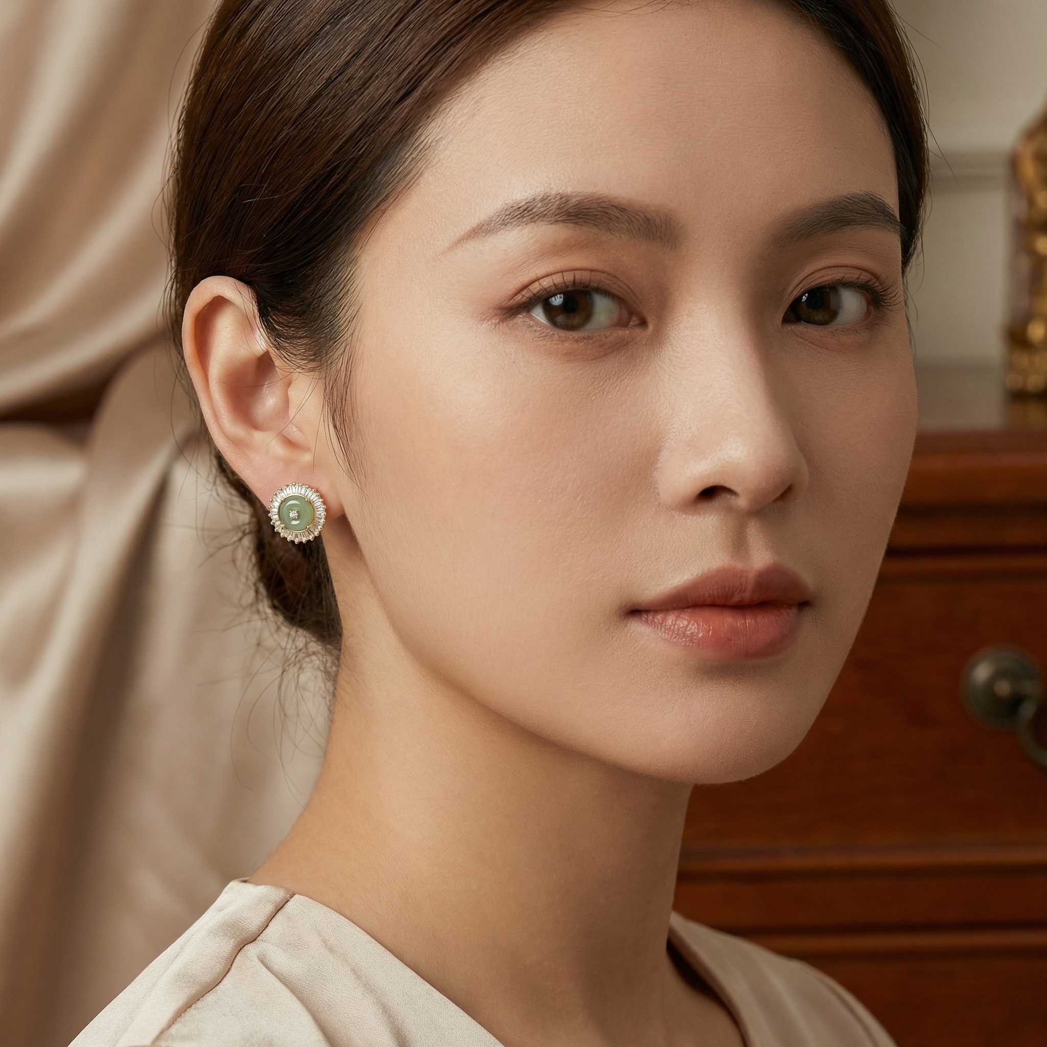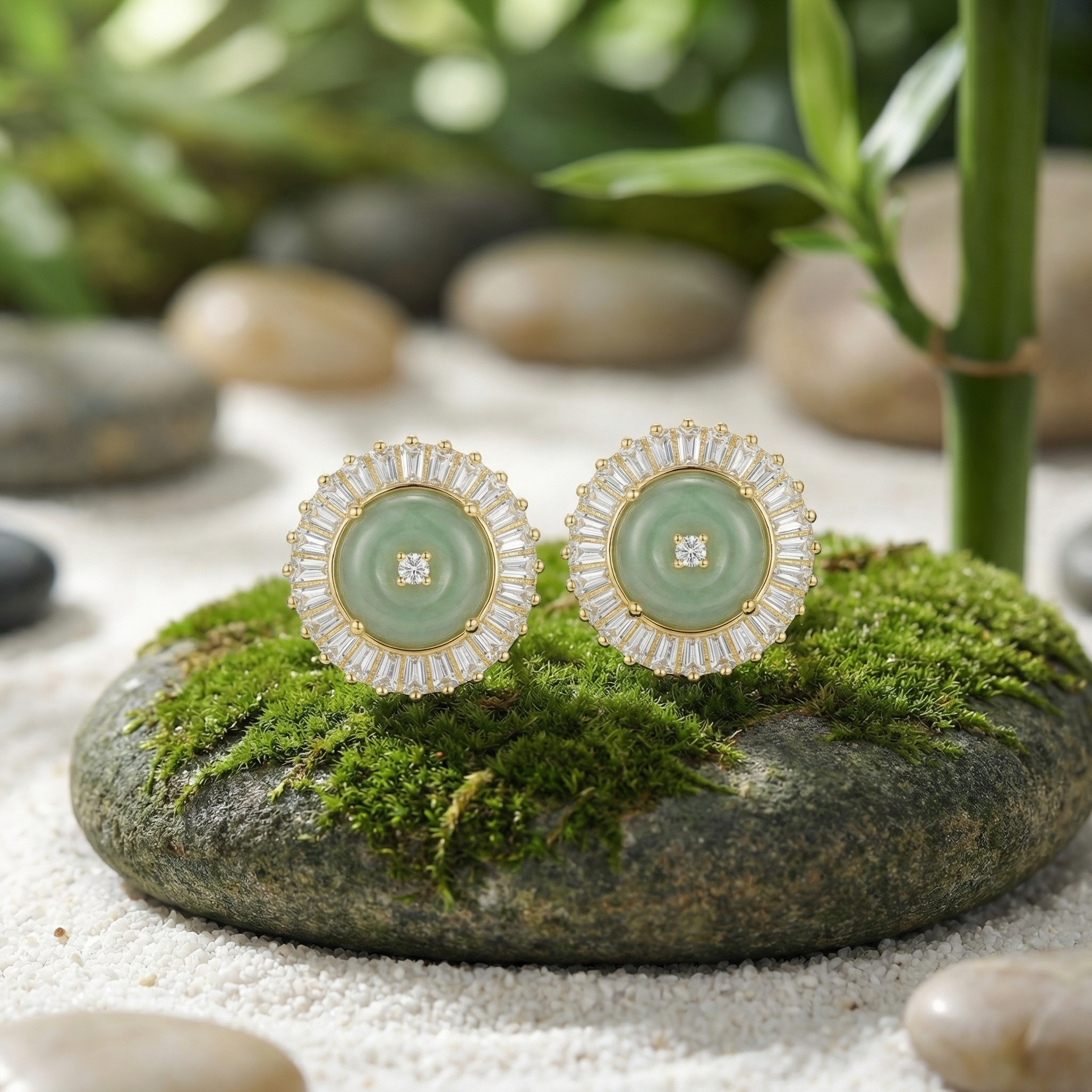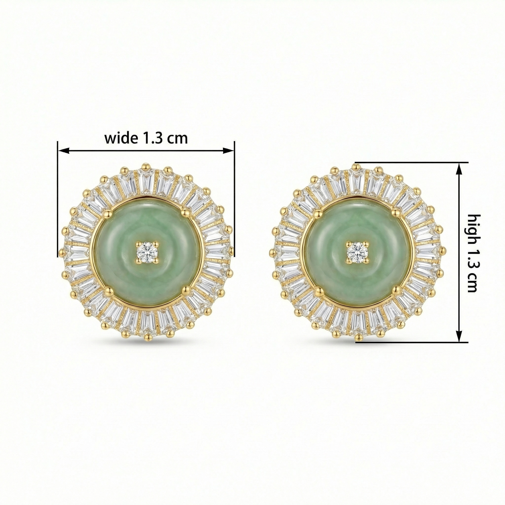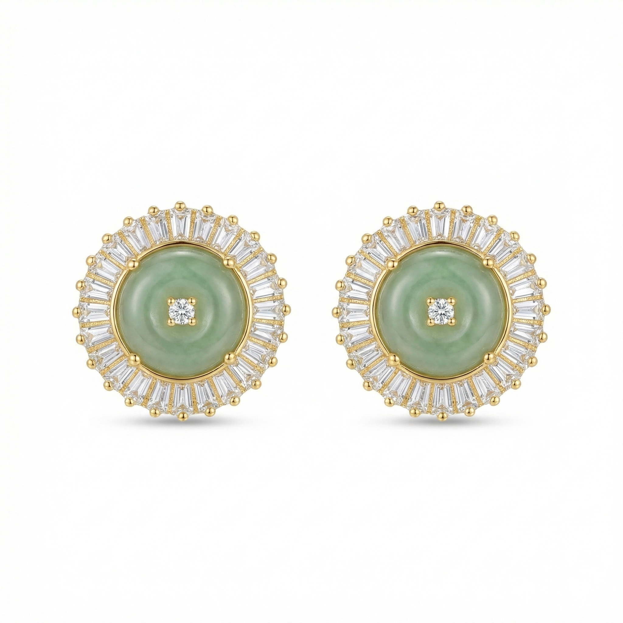 These sophisticated stud earrings showcase a central, polished green jadeite disc, prized for its tranquil hue and smooth finish. Nestled at the core of the jadeite is a sparkling round diamond, providing a central point of light. A halo of brilliant baguette-cut diamonds surrounds the jade, arranged in a radiant sunburst pattern that enhances the jewelry's overall brilliance. The warm metal setting provides a luxurious contrast to the cool tones of the green jadeite. Designed for the modern woman who appreciates classic elegance, these earrings are a perfect blend of natural gemstone beauty and refined artistry. They offer a timeless aesthetic that effortlessly elevates both formal and contemporary ensembles, making them a precious addition to any jewelry collection. | Brand: jewelryodm