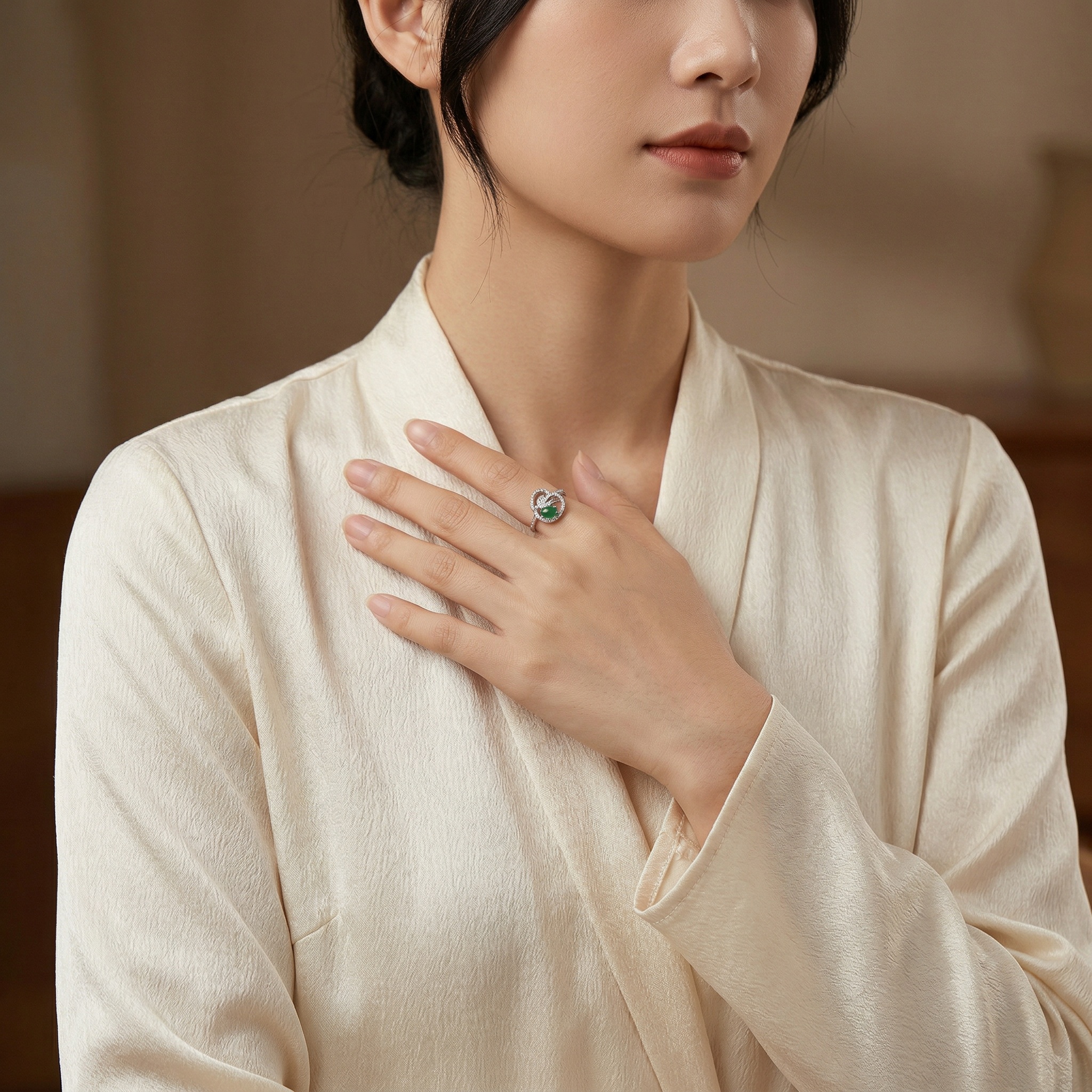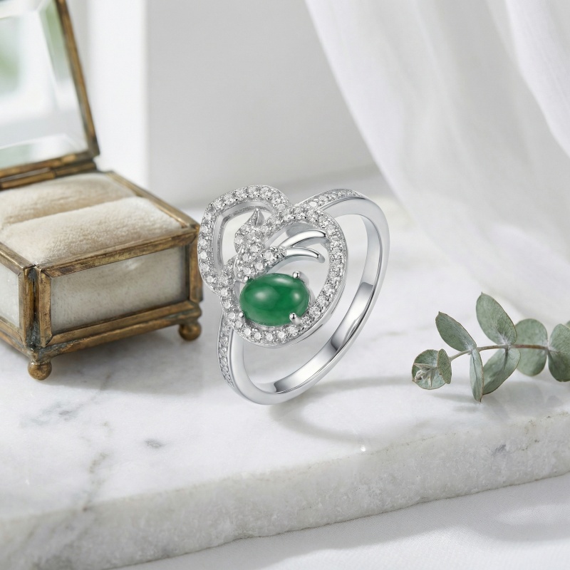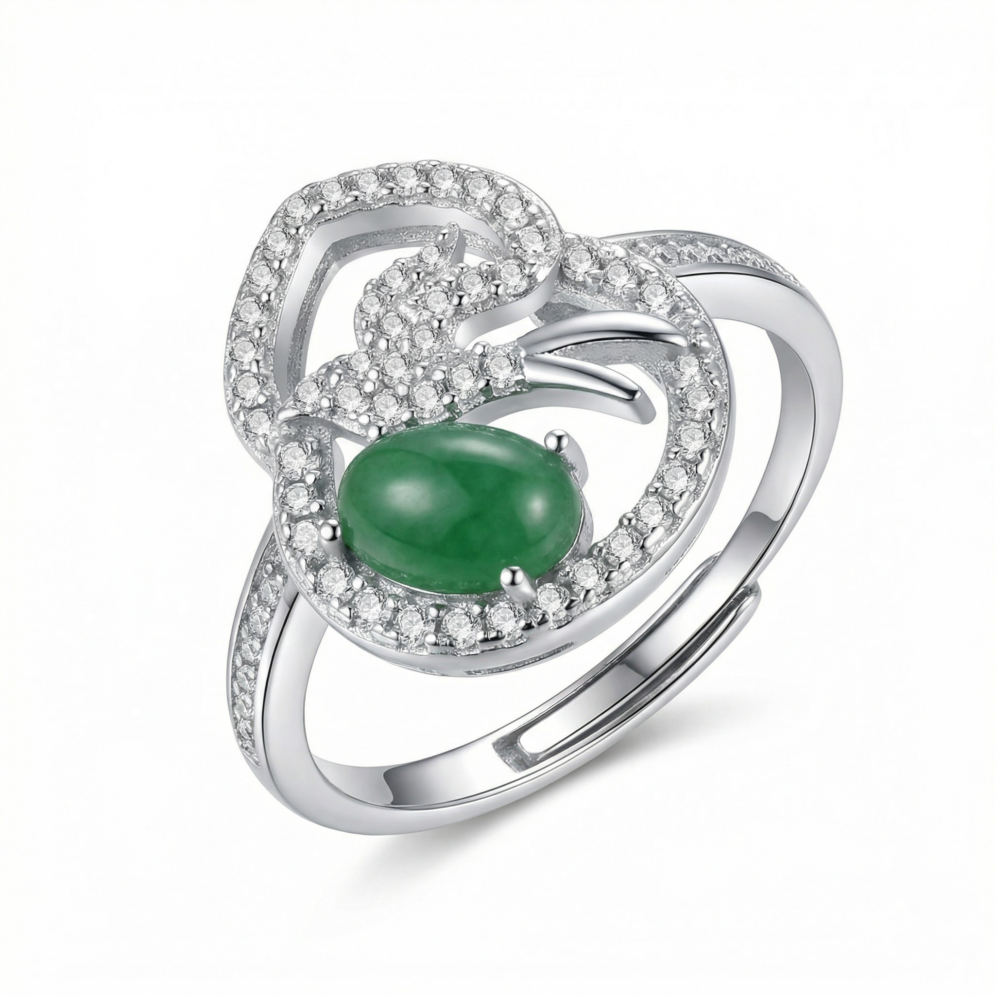 This elegant ring features a vibrant, oval-shaped green jadeite cabochon set in a sophisticated silver-toned mount. The center stone is surrounded by an intricate, flowing swirl design that evokes a sense of organic movement and grace. Each delicate ribbon of metal is meticulously embellished with sparkling pavé-set clear stones, which add a brilliant contrast to the deep green hue of the jade. The shimmering accents continue along the upper portion of the band, ensuring a radiant glow from every angle. With its unique asymmetrical silhouette and luxurious finish, this piece combines classic gemstone beauty with modern artistic flair, making it an ideal choice for formal wear or as a distinguished gift for someone special. | Brand: jewelryodm