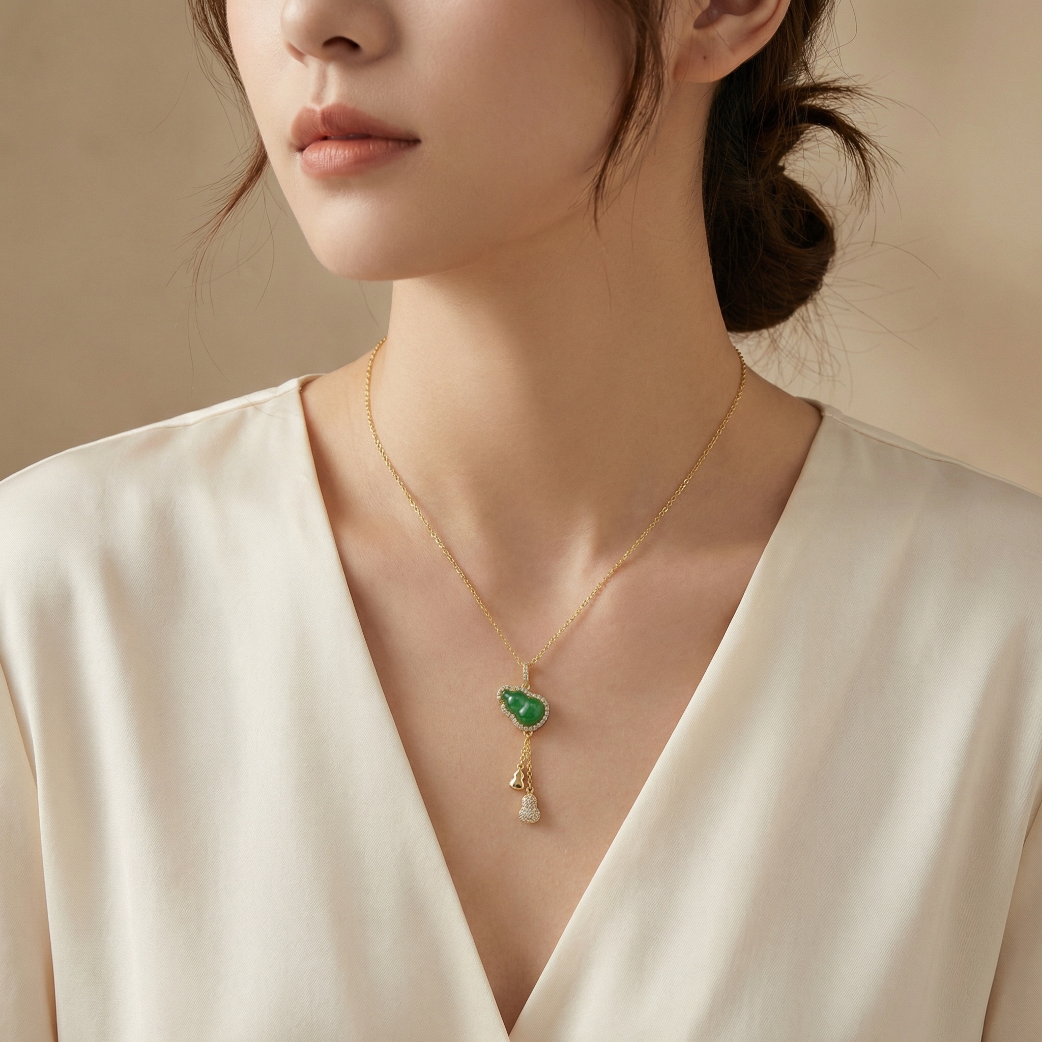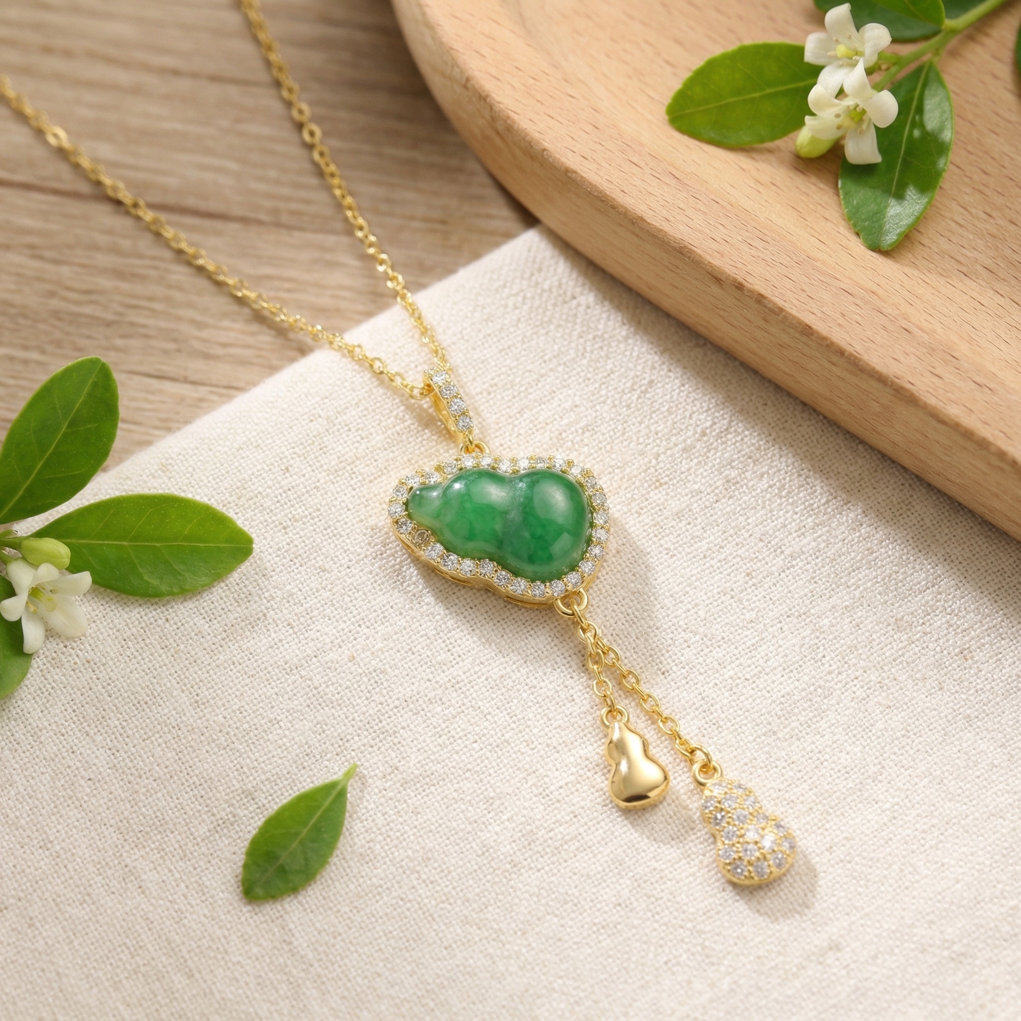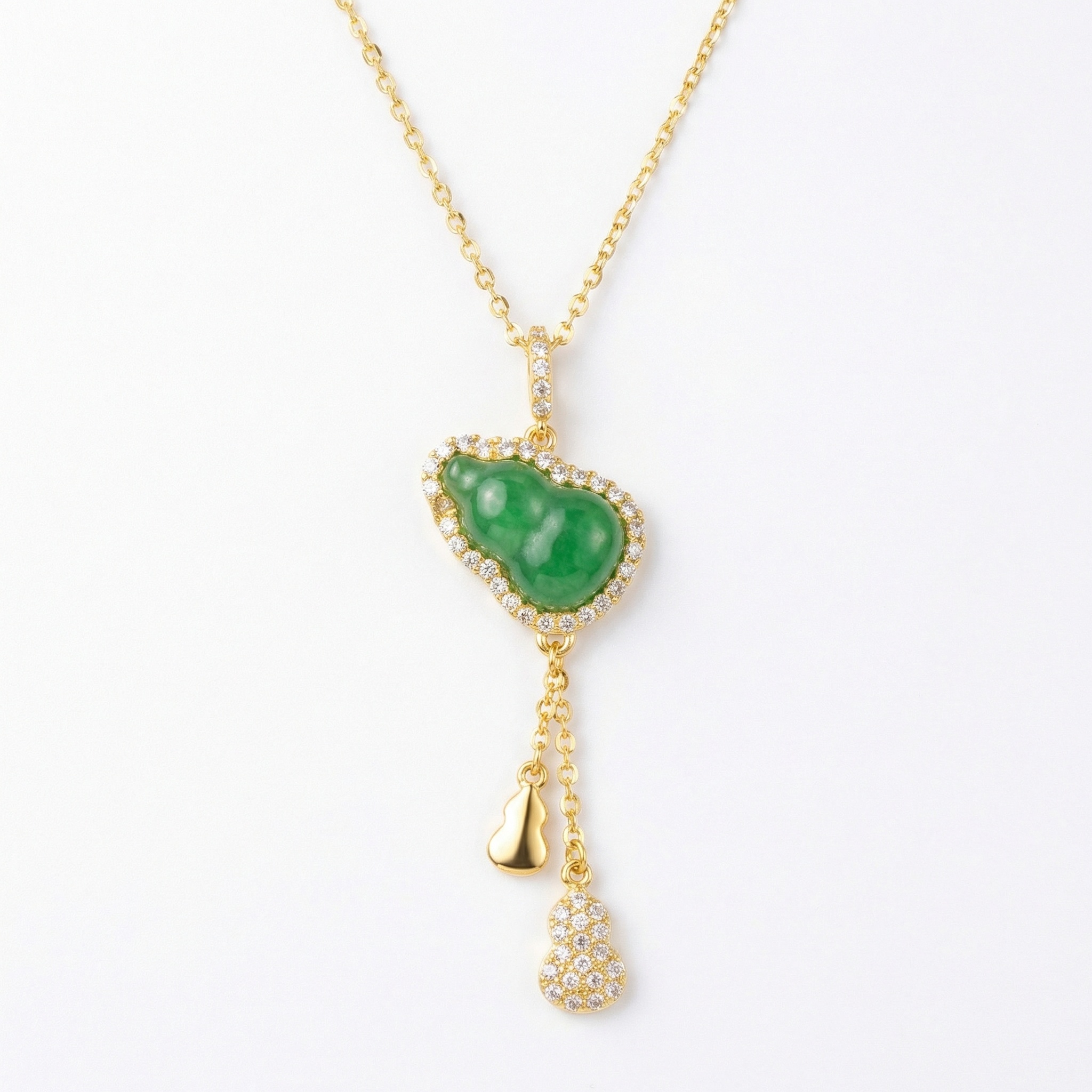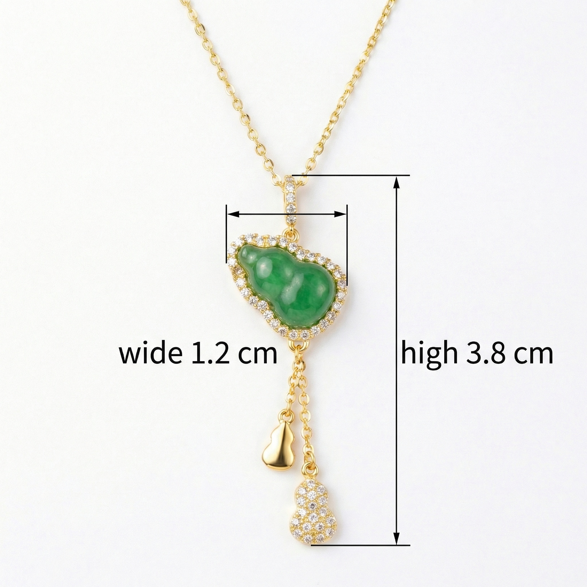 【Delivery Includes】 1 x Gourd Pendant Necklace with Jade and Diamond 1 x Exquisite Gift Box 1 x Jewelry Cleaning Cloth 【Care Instructions】 1. Wipe the necklace gently with the included cleaning cloth after each use to remove oils and residue. 2. Store the necklace in the gift box or a soft pouch when not in use to prevent scratches and tarnishing. 3. Avoid exposure to harsh chemicals, perfumes, and direct sunlight for prolonged shine and durability. 4. Remove jewelry before bathing, swimming, or exercising to preserve the gemstones and gold luster. 5. Handle with care to prevent any impact on the jade or diamonds. | Brand: jewelryodm