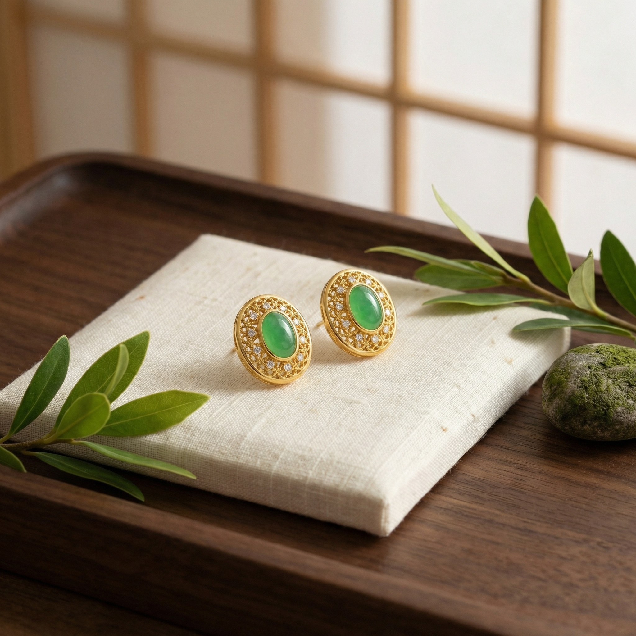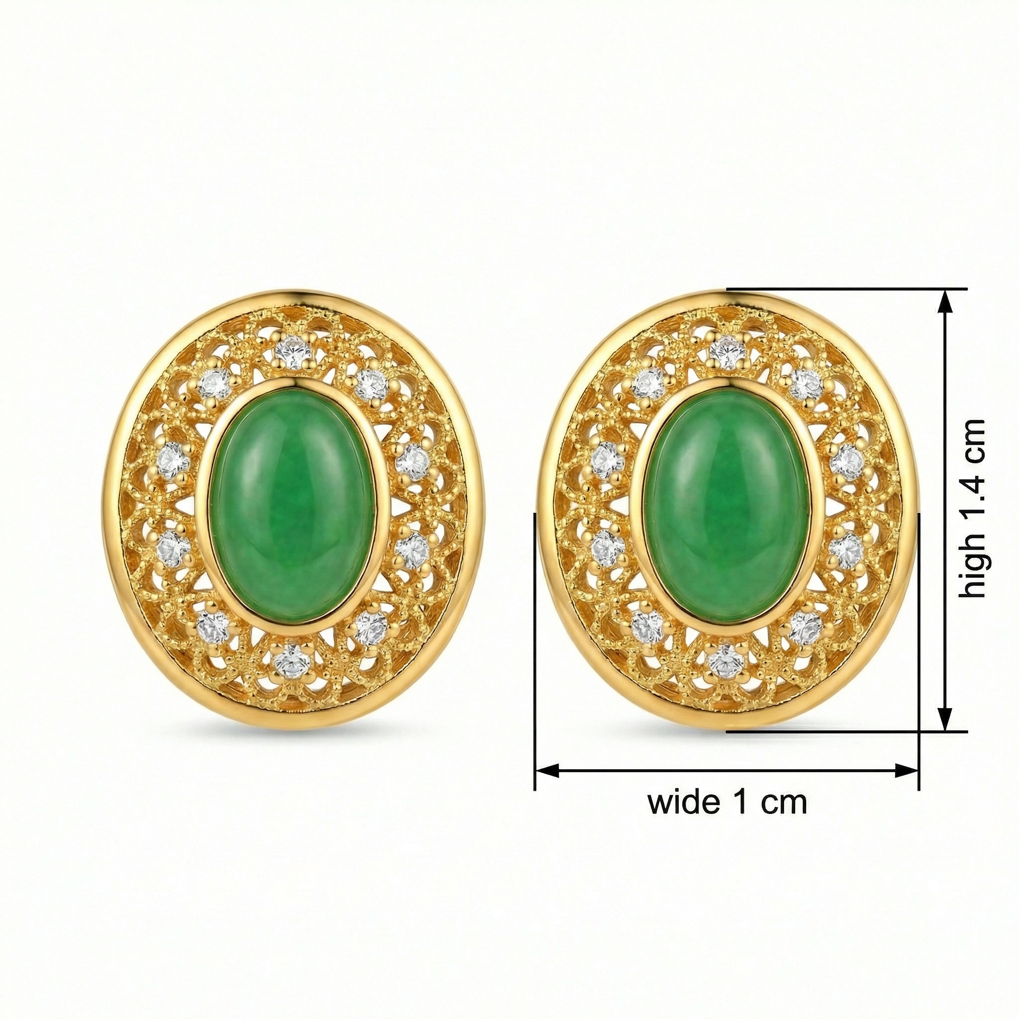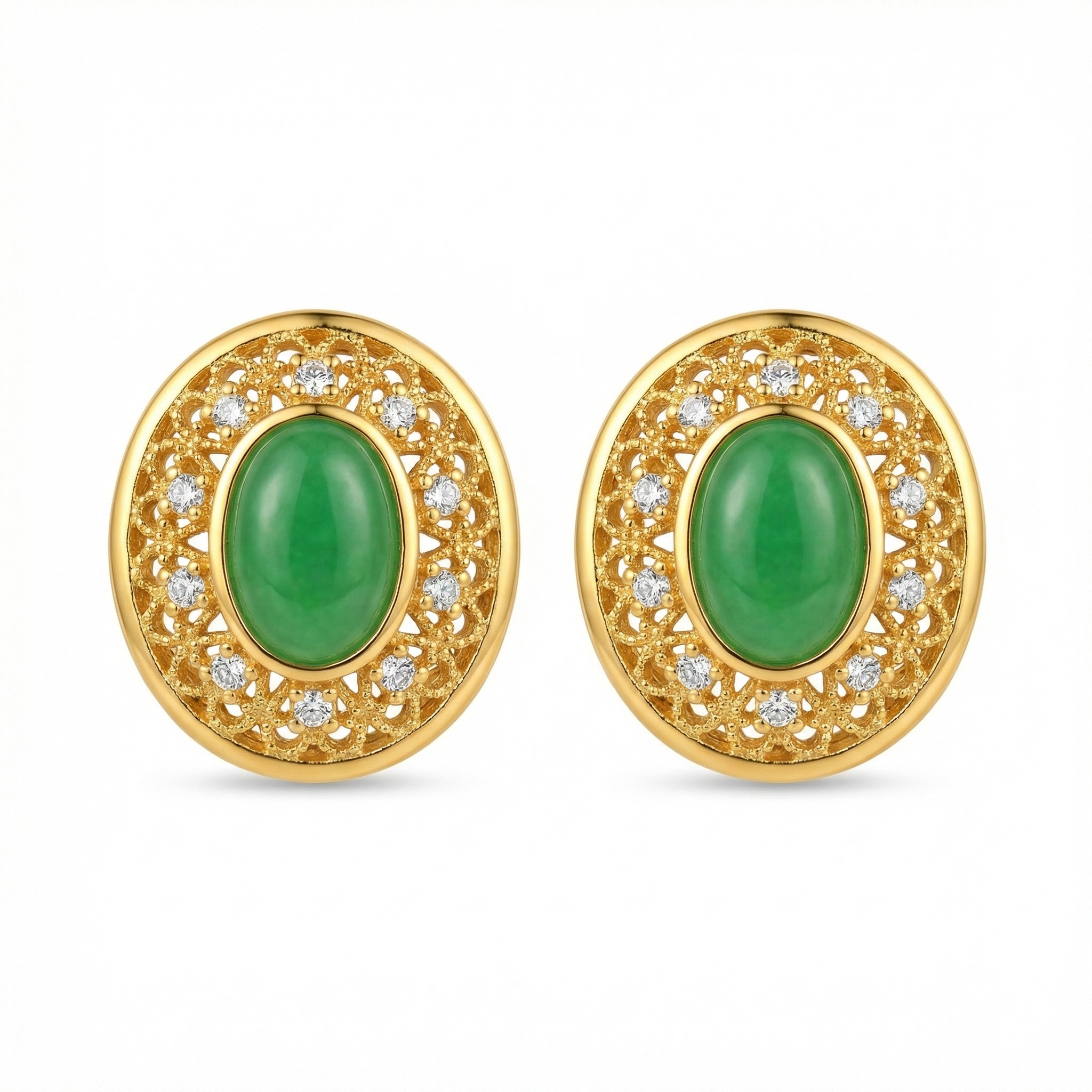 These exquisite stud earrings showcase a timeless design that combines classic elegance with intricate craftsmanship. Each earring features a stunning oval-shaped green cabochon at its center, reminiscent of high-quality jadeite. The vibrant green stone is securely set within a beautiful frame of delicate filigree metalwork. Adding a touch of brilliance, sparkling round-cut clear gems are strategically placed within the ornate patterns, catching the light from every angle. The warm-toned metallic finish provides a rich contrast to the lush green centerpiece and the icy white accents. With their sophisticated oval silhouette and vintage-inspired charm, these earrings are perfect for adding a touch of luxury to any ensemble, whether for a special occasion or as a standout daily accessory. Their secure backings ensure comfortable wear while maintaining an air of regal sophistication and artistic flair. | Brand: jewelryodm