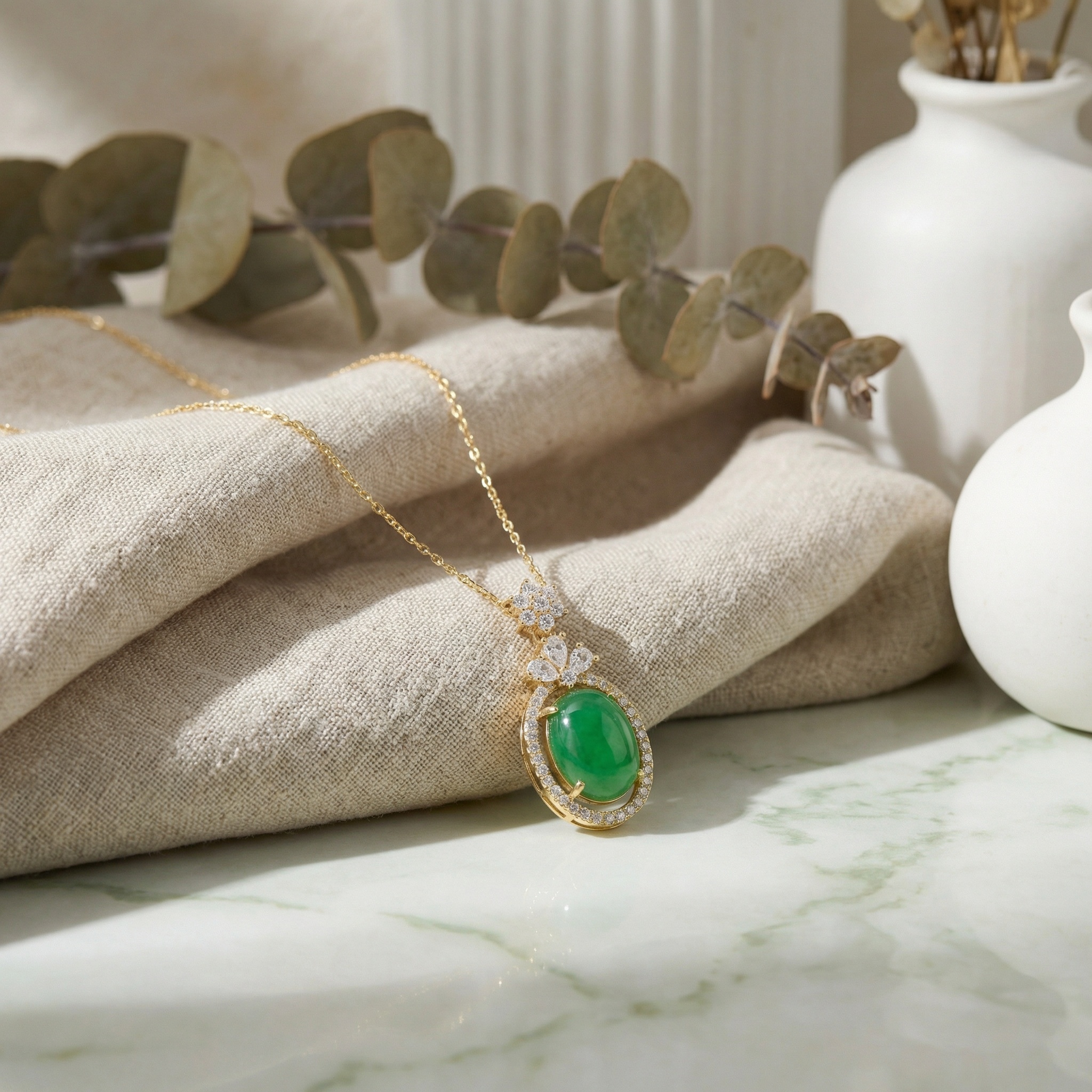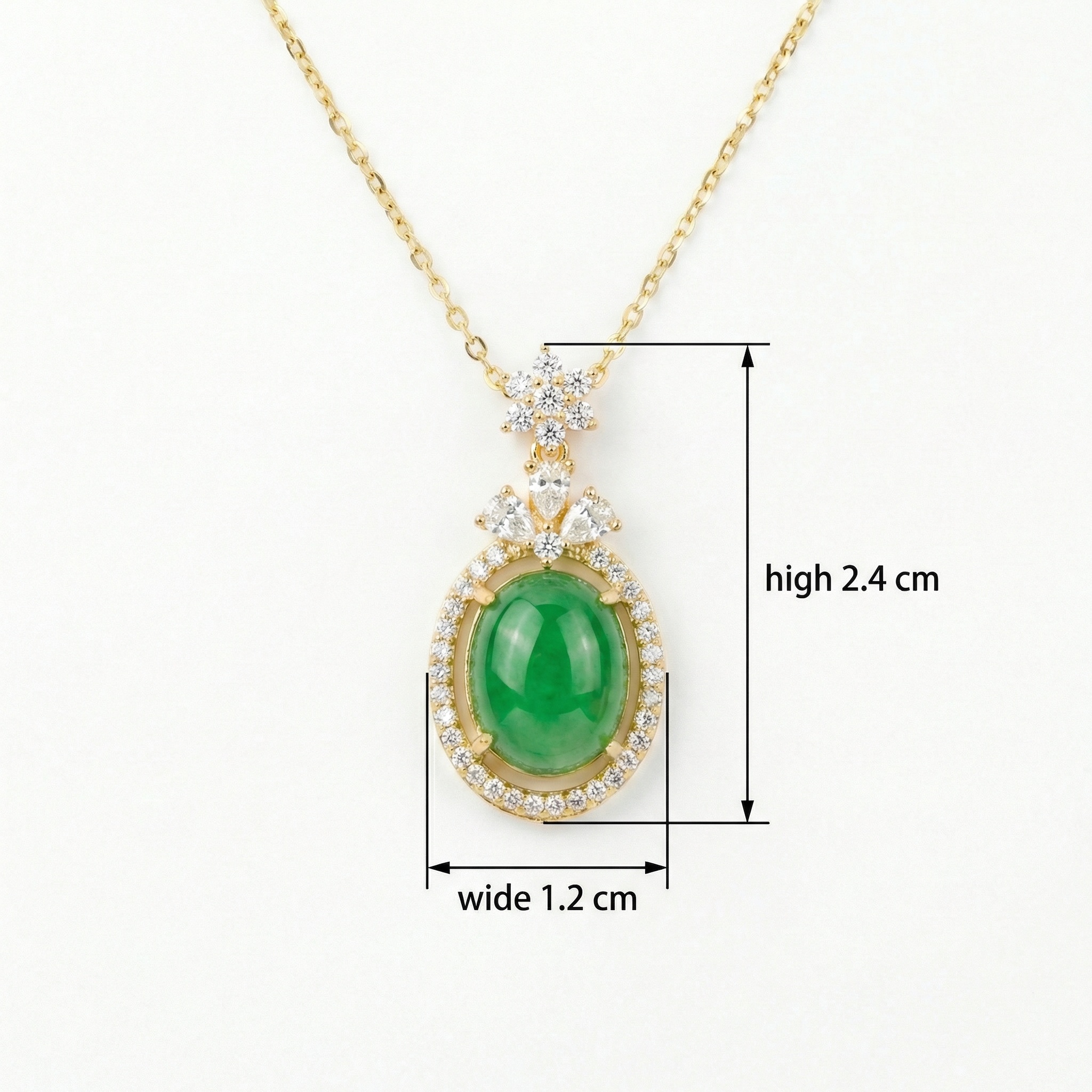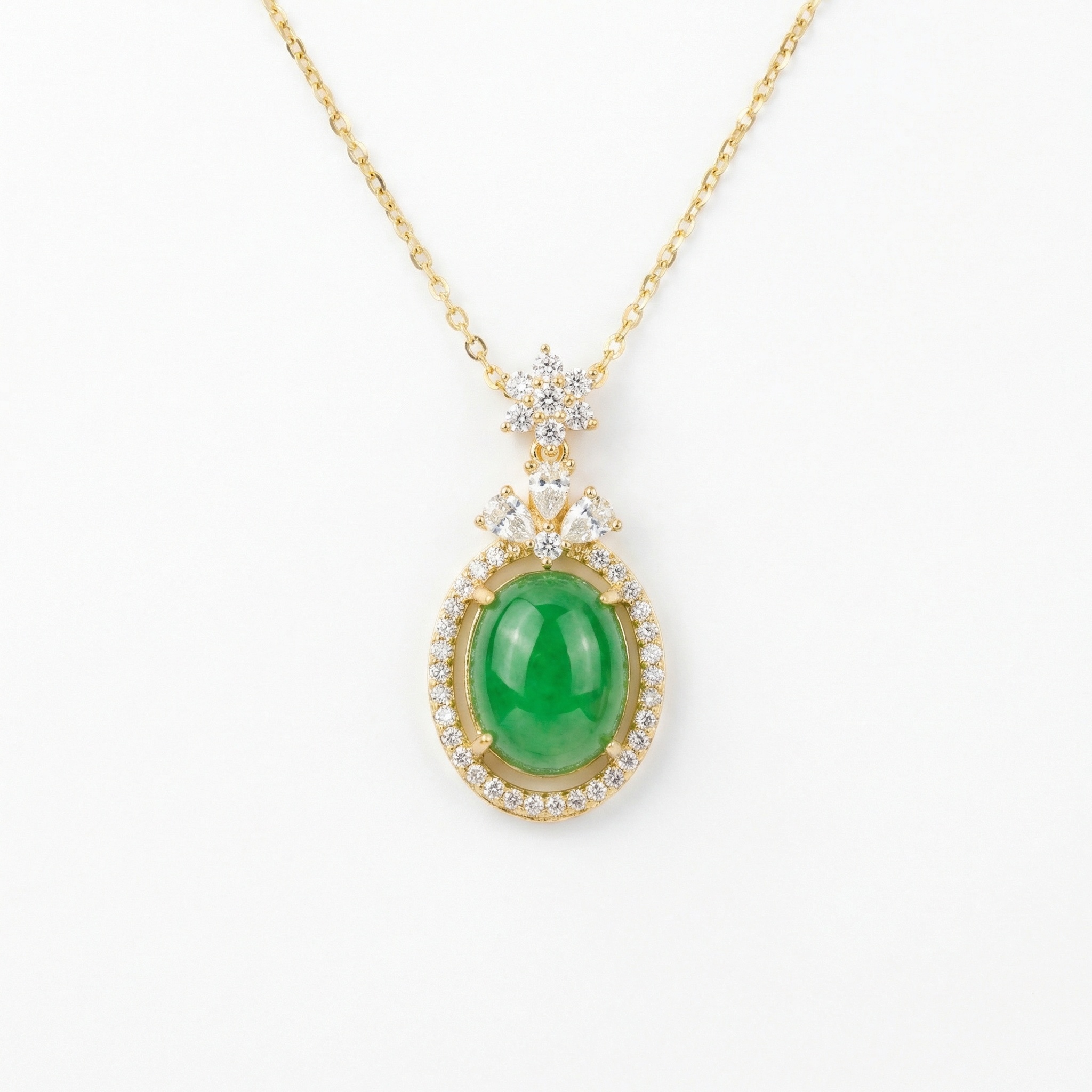 This exquisite necklace features a vibrant green jadeite cabochon, meticulously cut into a smooth oval and surrounded by a brilliant halo of sparkling white stones. Above the main stone, delicate floral clusters and marquise-shaped accents add an extra layer of sophisticated elegance. The pendant is suspended from a fine, lustrous chain, perfectly complementing the rich green hues of the jade. Designed to capture light from every angle, this piece blends traditional gemstone allure with timeless craftsmanship. It serves as a stunning focal point, suitable for formal events or as a meaningful gift for someone who appreciates fine jewelry. The harmonious combination of the translucent green stone and the shimmering accents creates a look of unparalleled grace and luxury. | Brand: jewelryodm
