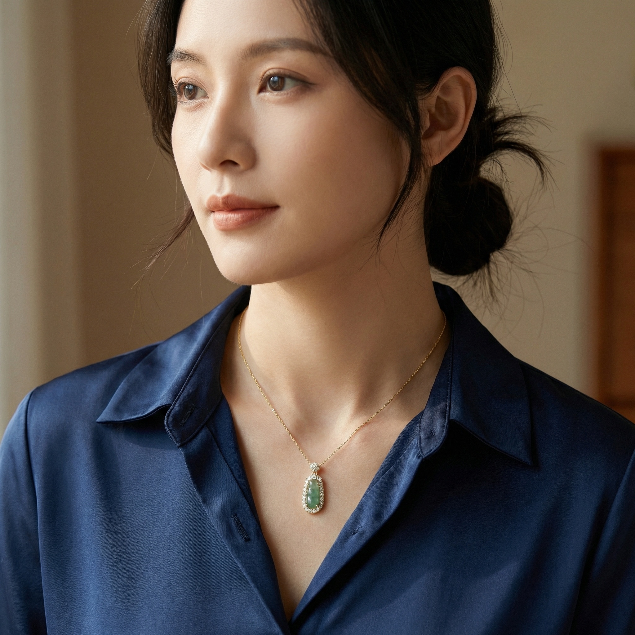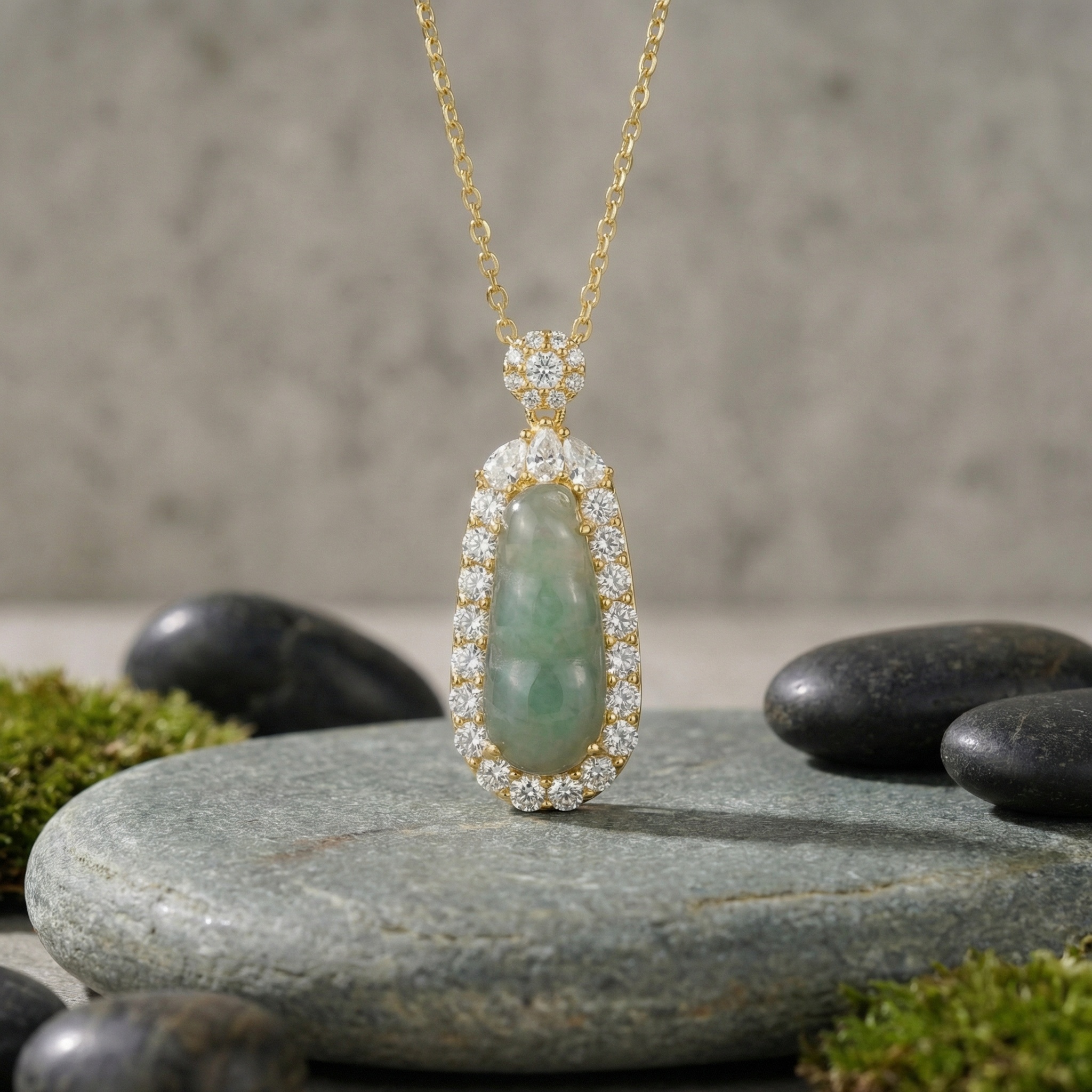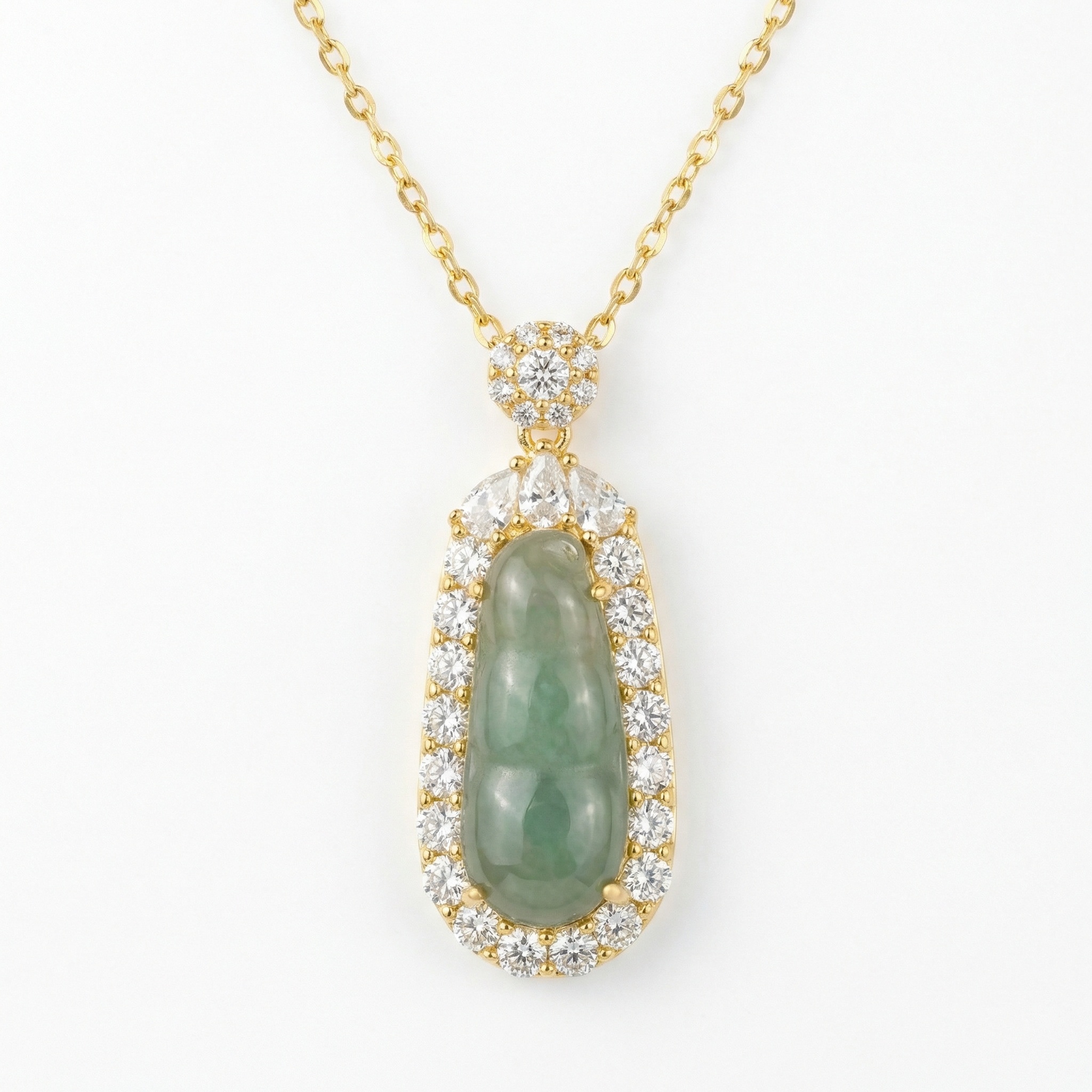 This exquisite necklace features a captivating green jadeite pendant, expertly carved into a traditional pea pod shape, symbolizing longevity and prosperity. The translucent jadeite stone is framed by a dazzling halo of round brilliant white gemstones that catch the light from every angle. Above the main pendant, a matching circular cluster of stones adds an extra touch of brilliance to the design. The pendant hangs gracefully from a delicate link chain, creating a sophisticated and timeless look. Perfect for special occasions or adding a touch of elegance to your daily attire, this piece beautifully combines classic inspiration with contemporary jewelry craftsmanship. The polished setting enhances the natural luster of the jade, making it a stunning statement piece for any jewelry lover. | Brand: jewelryodm