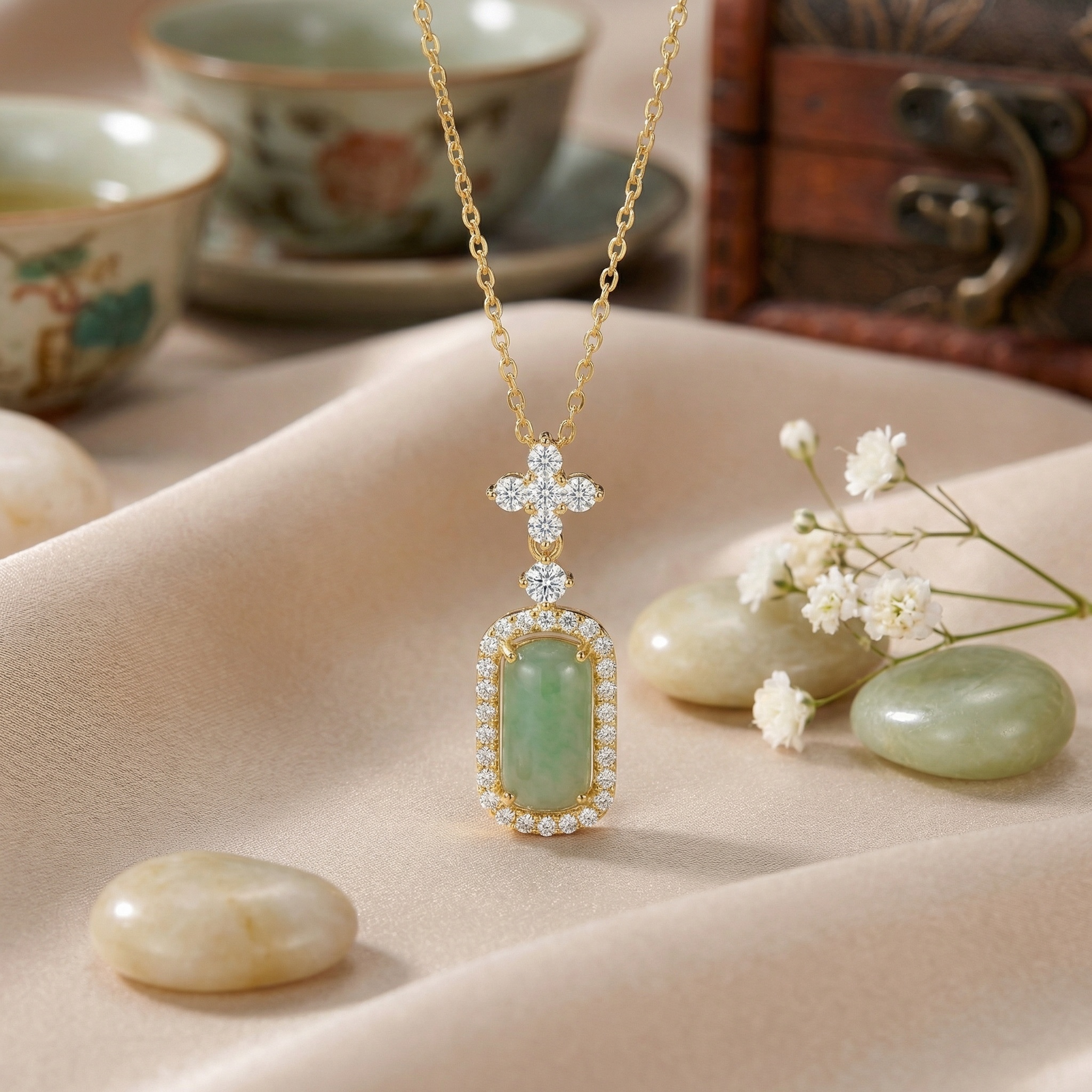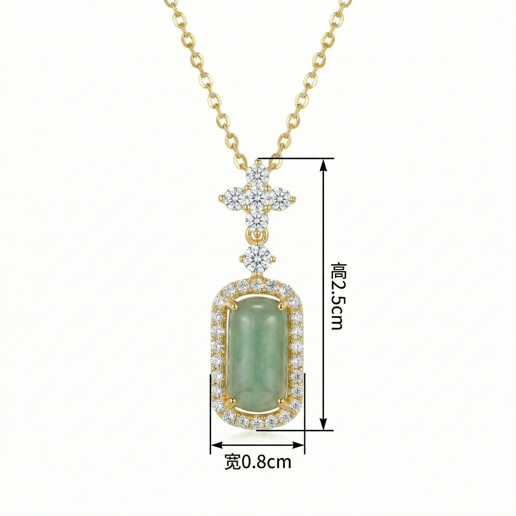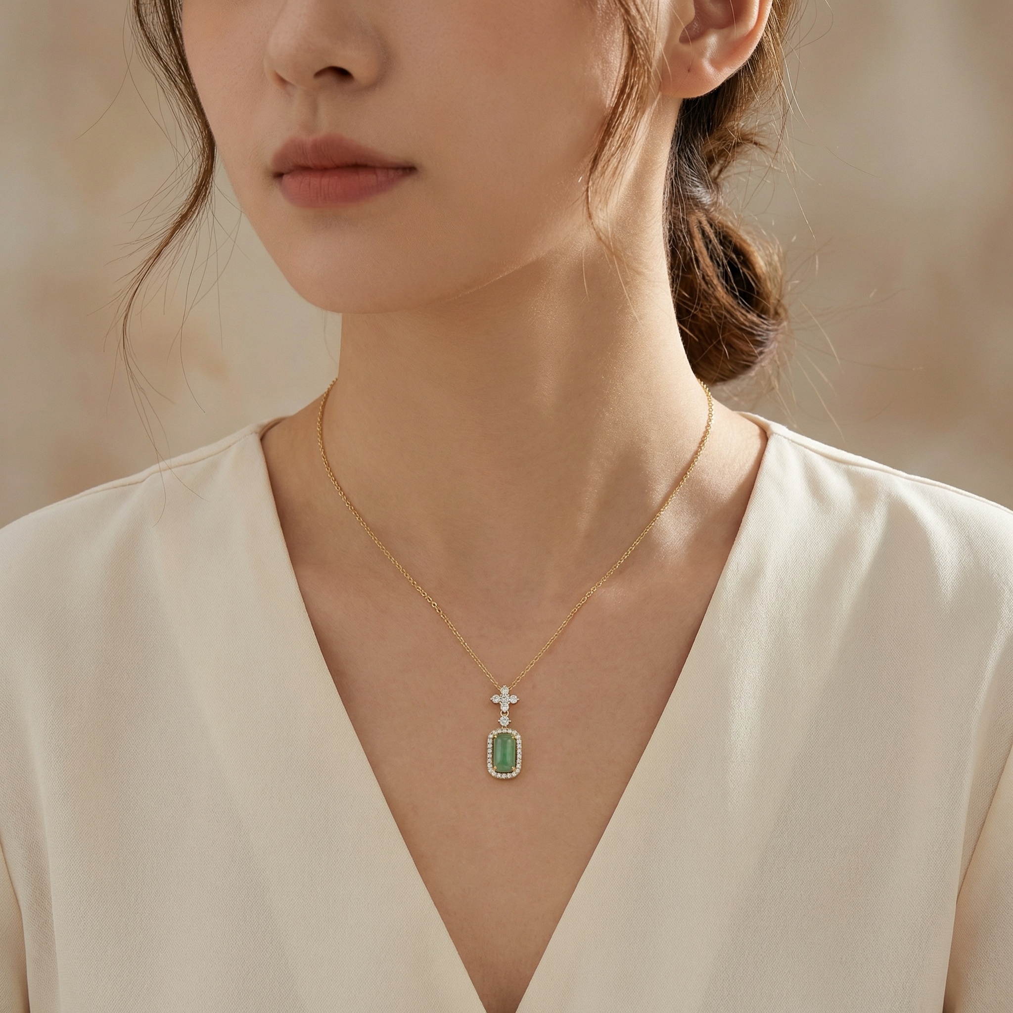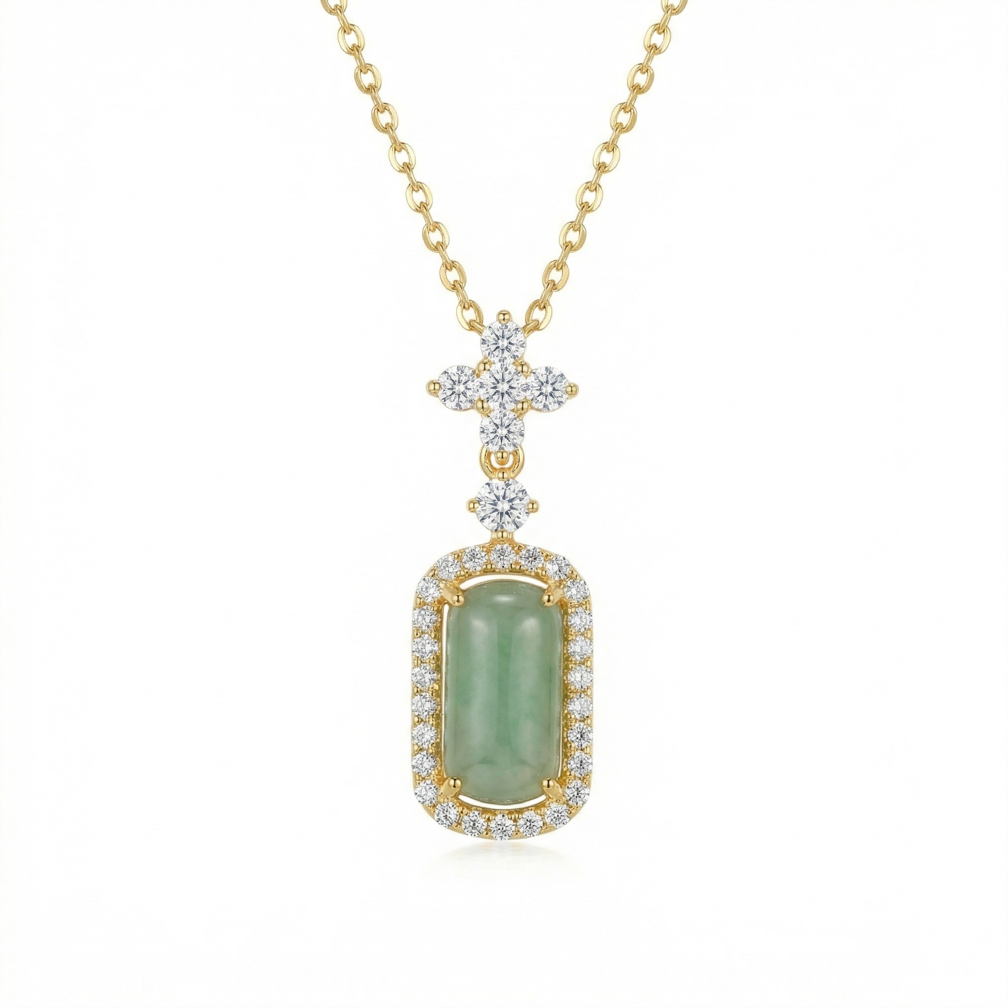 This exquisite piece features a stunning rectangular green jadeite centerpiece, radiating a soft and translucent glow. The gemstone is elegantly framed by a halo of brilliant round-cut diamonds, enhancing its natural vibrant hue. Adding a touch of sophisticated detail, the bail is designed as a delicate floral cluster, encrusted with shimmering stones. Suspended from a dainty chain, the design beautifully balances traditional charm with contemporary luxury. Perfect for special occasions or as a meaningful gift, this necklace symbolizes serenity and wisdom. The contrast between the verdant jade and the sparkling diamond accents makes it a standout accessory that complements any attire, offering a timeless appeal that transcends trends. | Brand: jewelryodm