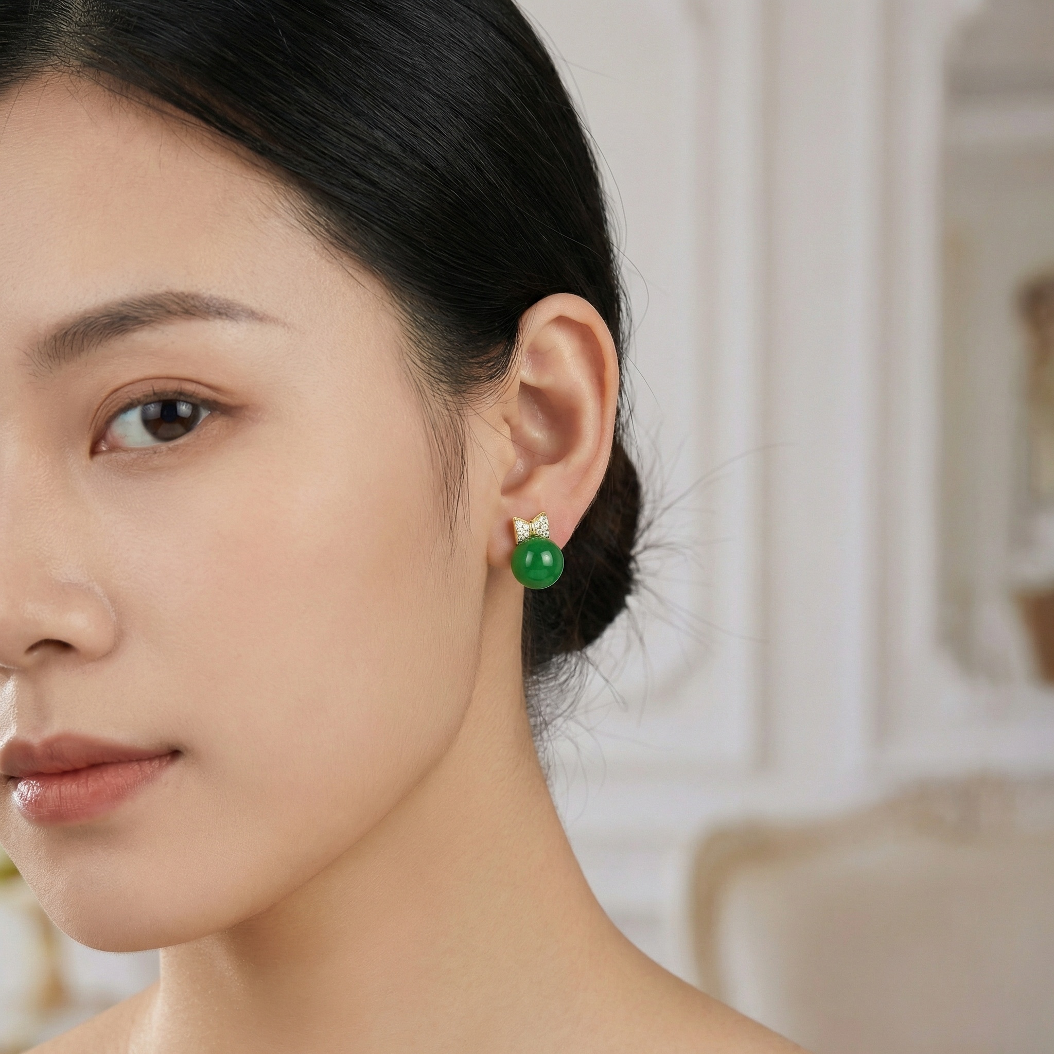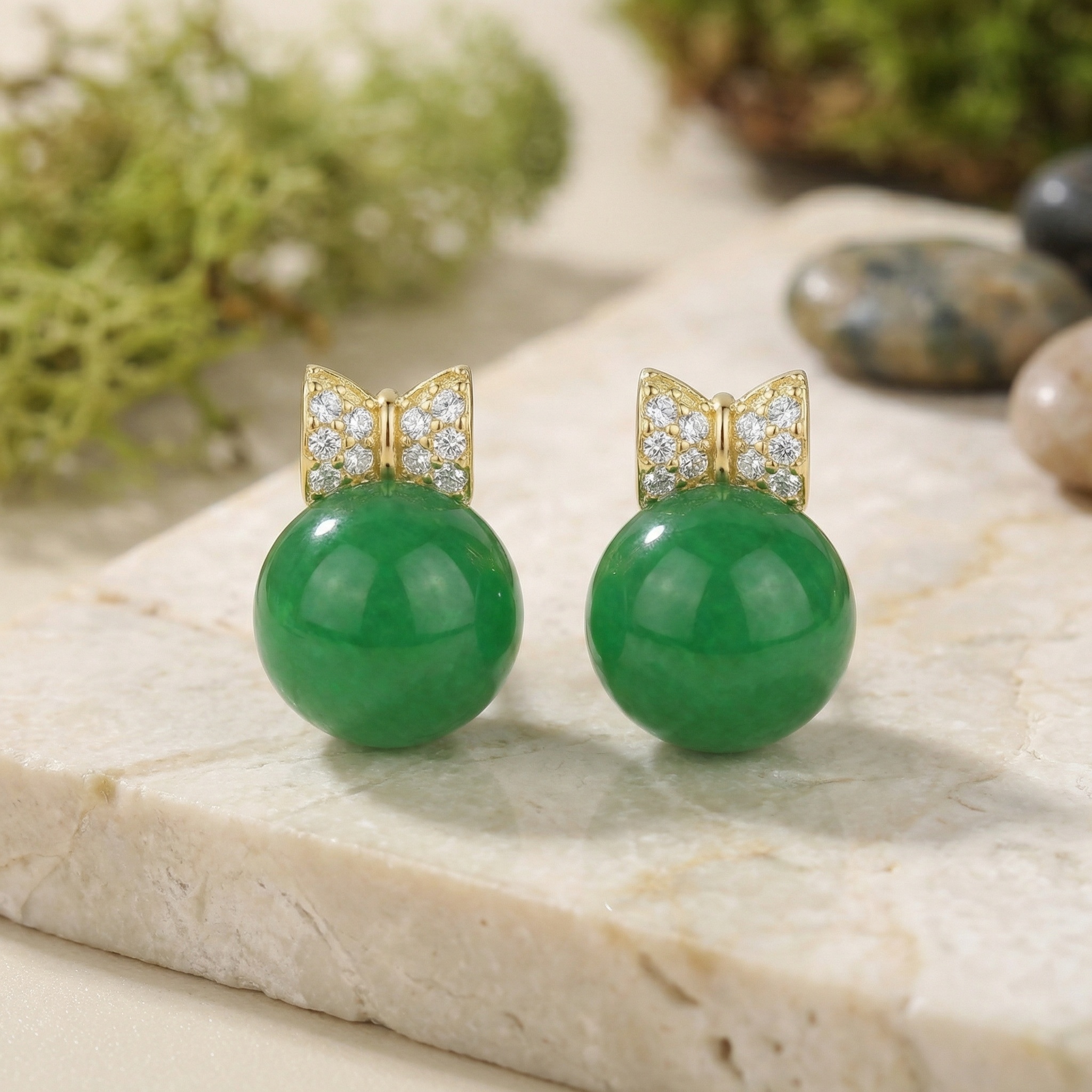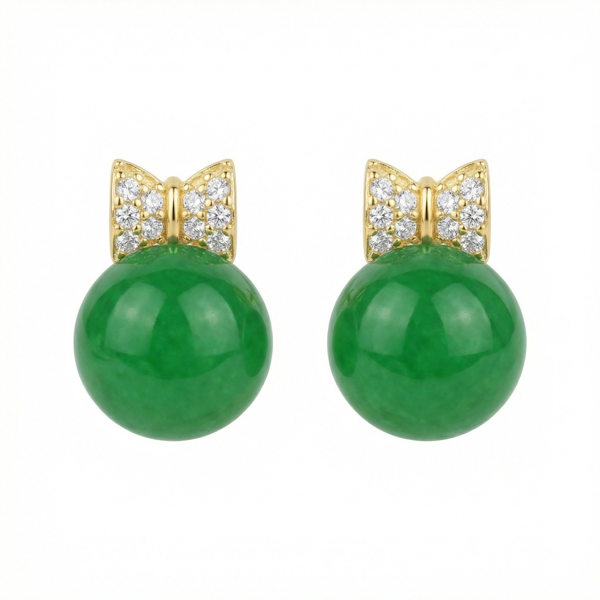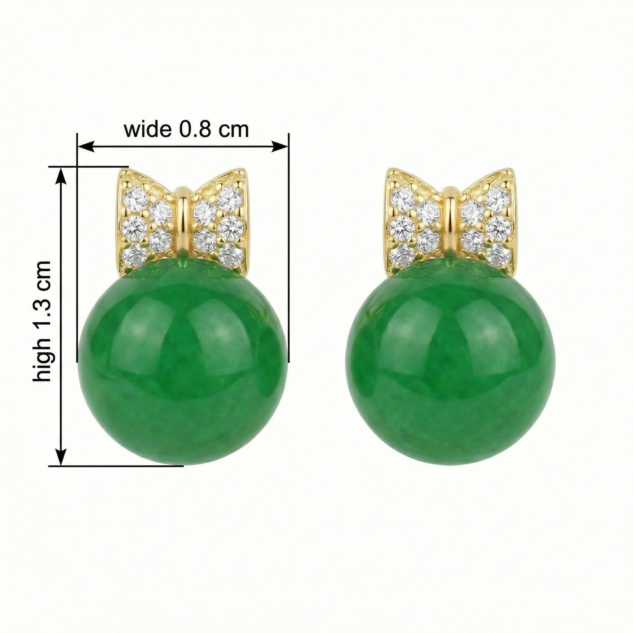 These exquisite stud earrings feature a stunning combination of classic charm and playful elegance. Each earring showcases a perfectly polished, vibrant green jadeite sphere that captures the light with its rich, natural hue. Perched gracefully atop the jade beads are delicate bow-tie motifs crafted from a lustrous yellow-toned metal. Each bow is meticulously pavé-set with shimmering clear stones, adding a touch of sophisticated brilliance to the design. The contrast between the deep green of the jade and the sparkling accents creates a captivating visual appeal. Perfect for both formal occasions and adding a pop of color to everyday attire, these earrings are a timeless addition to any jewelry collection. The secure post backs ensure comfortable wear throughout the day. | Brand: jewelryodm