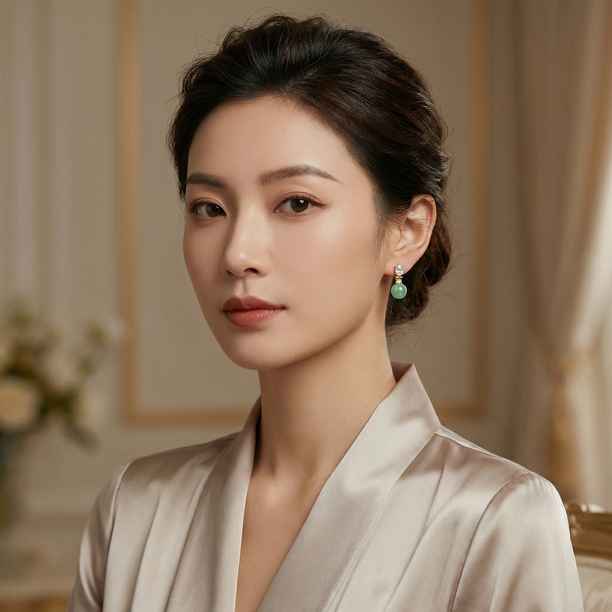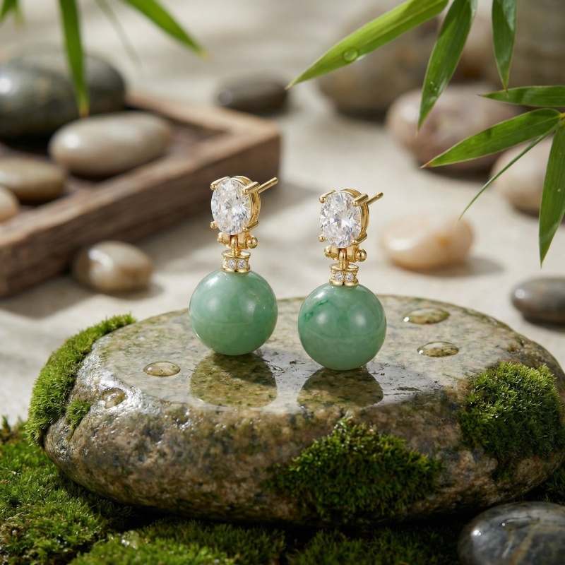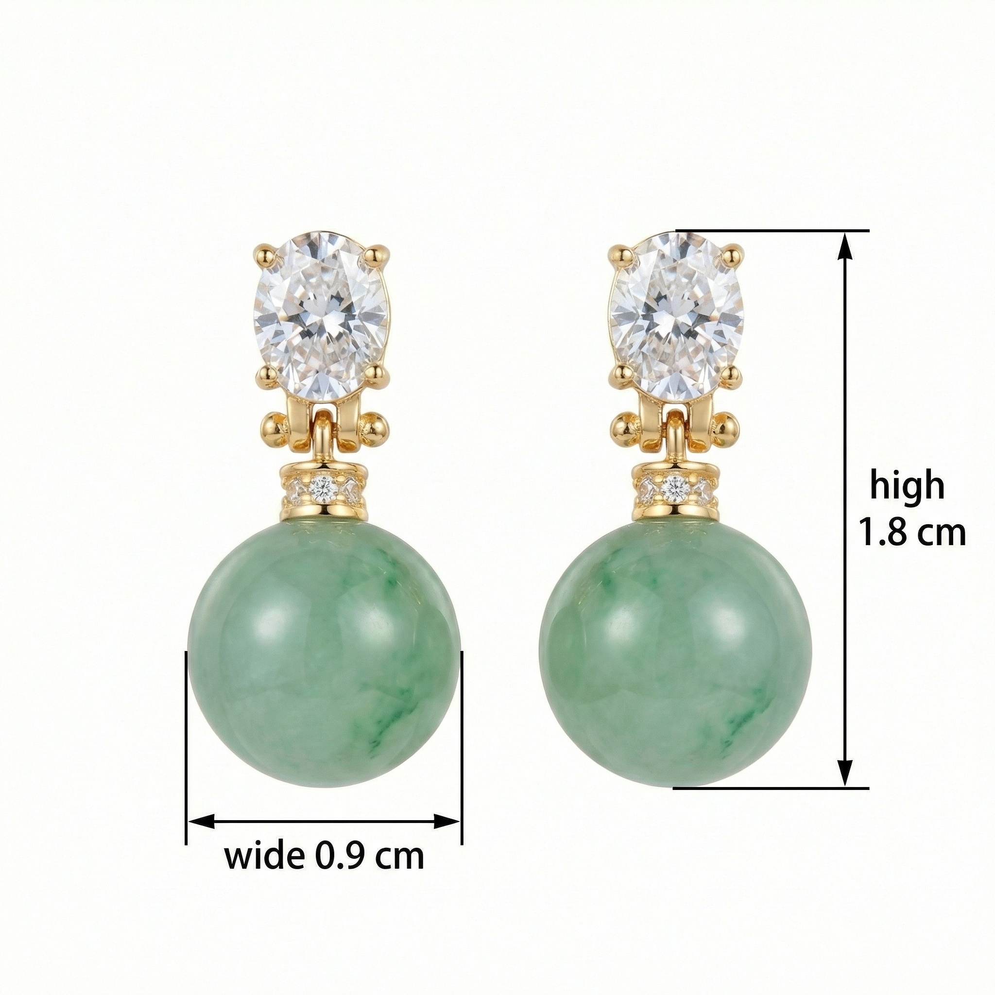 These exquisite drop earrings combine timeless elegance with natural beauty. Each piece features a lustrous, round green jadeite sphere, showcasing vibrant, marbled tones of deep green. The jade is suspended from a sophisticated yellow-toned metal setting that adds a touch of warmth. At the top, a brilliant oval-cut clear gemstone is secured by delicate prongs, capturing and reflecting light with every movement. A decorative cap, adorned with tiny shimmering accent stones, seamlessly connects the upper stud to the smooth jade bead. This design offers a perfect balance of modern luxury and classic charm, making them a versatile accessory for formal events or everyday refinement. The secure post-back closure ensures comfortable wear. Enhance your jewelry collection with these captivating earrings that celebrate the unique allure of green jade and sparkling clarity. | Brand: jewelryodm