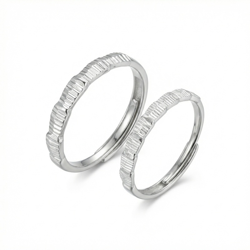 This pair of rings features a striking hammered texture that creates a unique, rugged aesthetic. Crafted from high-quality silver, the bands showcase a series of vertical ridges that catch the light beautifully, resembling a mountainous landscape. The open-back design makes them conveniently adjustable, ensuring a perfect fit for any finger size. These matching rings are perfect for couples looking for a modern and symbolic way to express their bond. Their minimalist yet distinctive style makes them versatile for everyday wear or special occasions. Whether as promise rings or a thoughtful gift, these textured bands offer a timeless look that blends elegance with a touch of organic nature. | Brand: jewelryodm