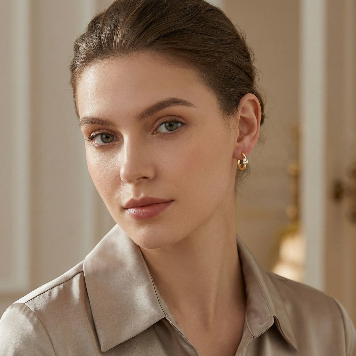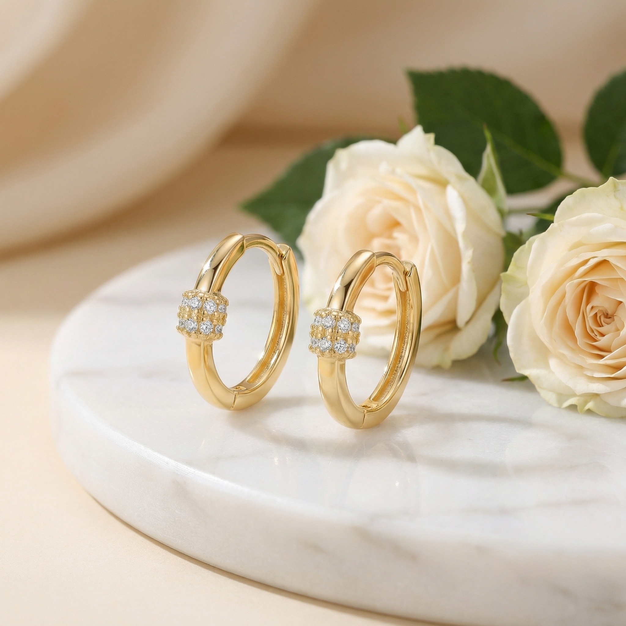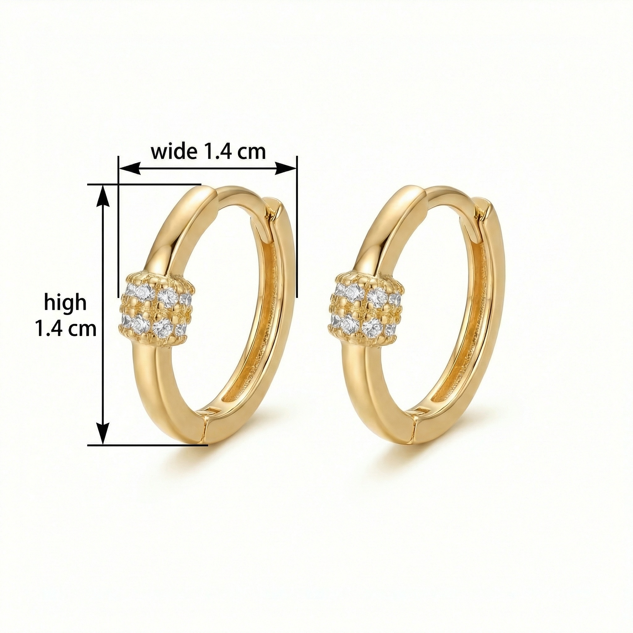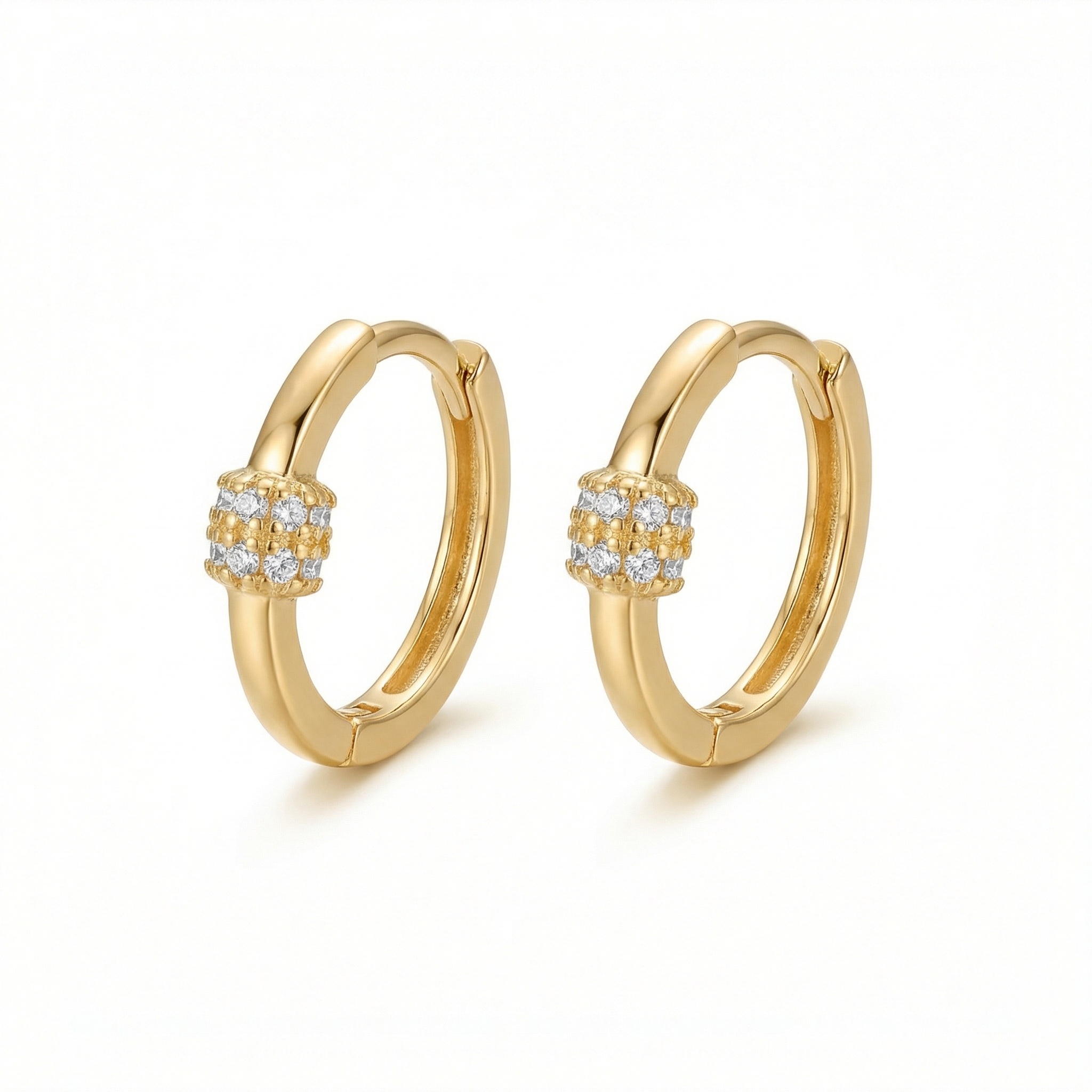 These sophisticated huggie hoop earrings offer a timeless appeal with a touch of modern brilliance. Crafted with a high-polish warm-toned metallic finish, each earring features a uniquely textured center band meticulously set with clear, sparkling stones. The radiant glow of the honey-hued metal provides a stunning contrast to the brilliant-cut gems, creating a versatile accessory perfect for both day and night. Designed for comfort and security, they feature a convenient hinged closure that ensures a snug fit. Whether worn as a standalone statement or layered with other pieces, these earrings add a subtle yet captivating sparkle to any ensemble. Their minimalist yet detailed design makes them an essential addition to any jewelry collection, offering understated luxury and effortless style. Perfect for gifting or a personal treat, these hoops elevate any look with their refined charm. | Brand: jewelryodm