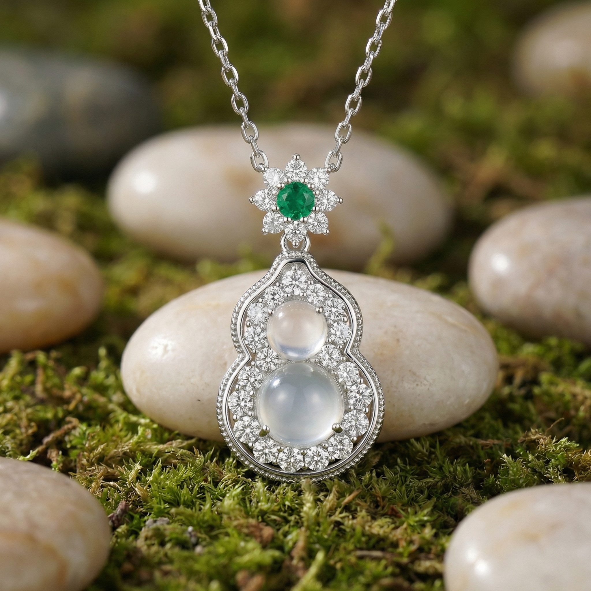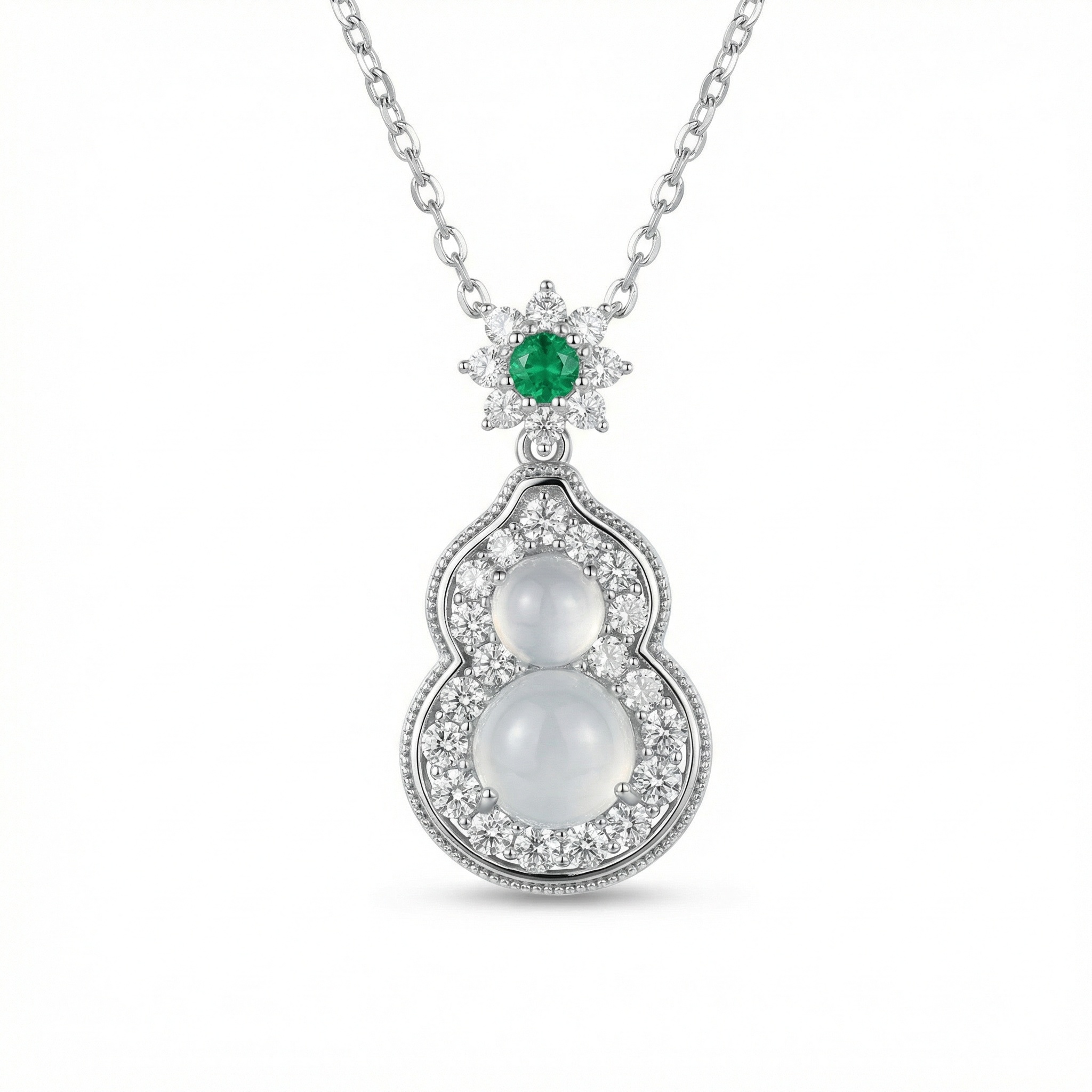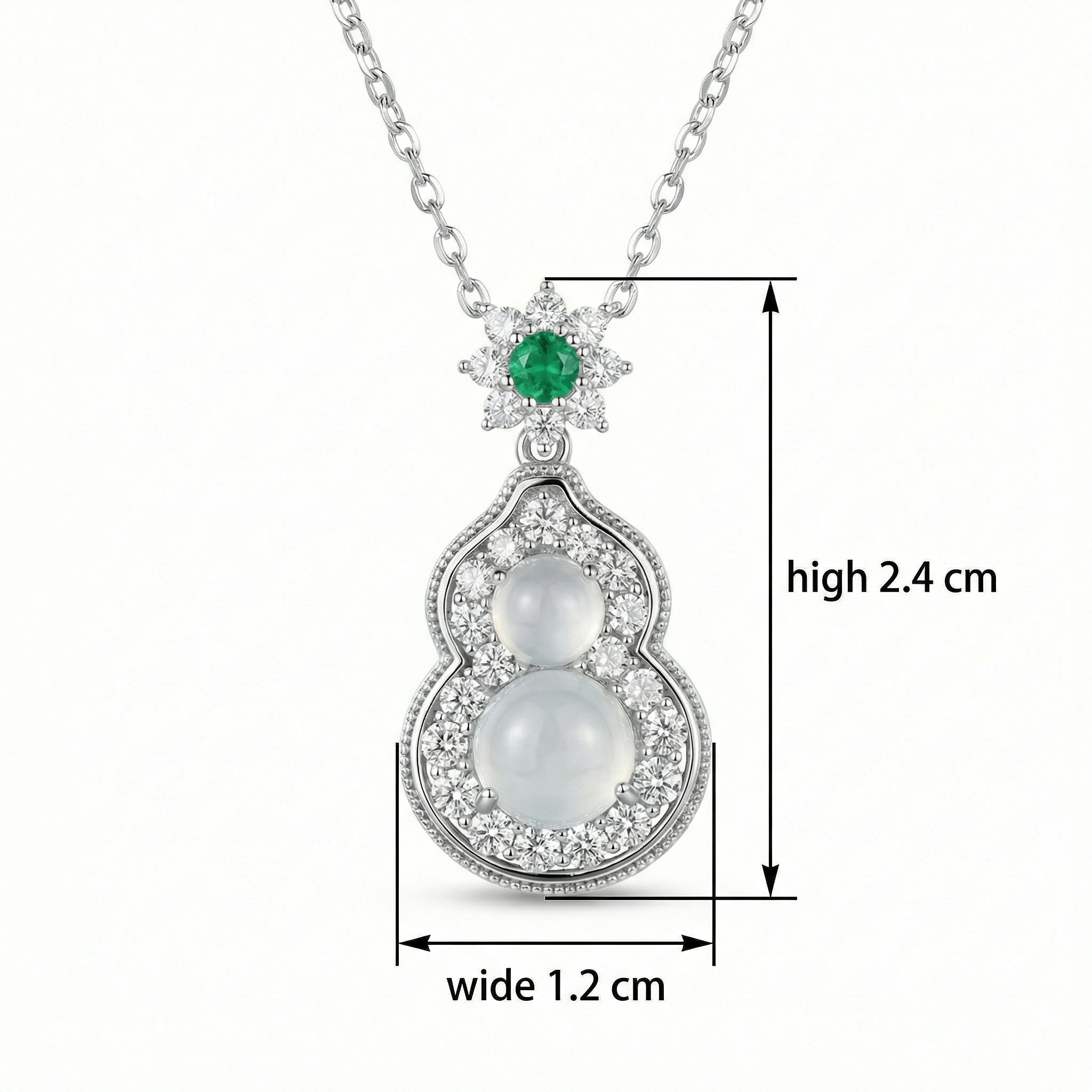 【Delivery Includes】 1 x 925 Silver Necklace with Gourd & Flower Round Pendant (featuring Emerald Center, Diamond, and Moonstone accents) 1 x Luxury Gift Box 1 x Cleaning Cloth 【Care Instructions】 1. Store the necklace in a soft pouch or jewelry box when not in use to prevent scratches and tangling. 2. Gently wipe the necklace with the included cleaning cloth after each use to maintain its shine. 3. Avoid contact with harsh chemicals, perfumes, or cosmetics to protect the gemstones and gold finish. | Brand: jewelryodm