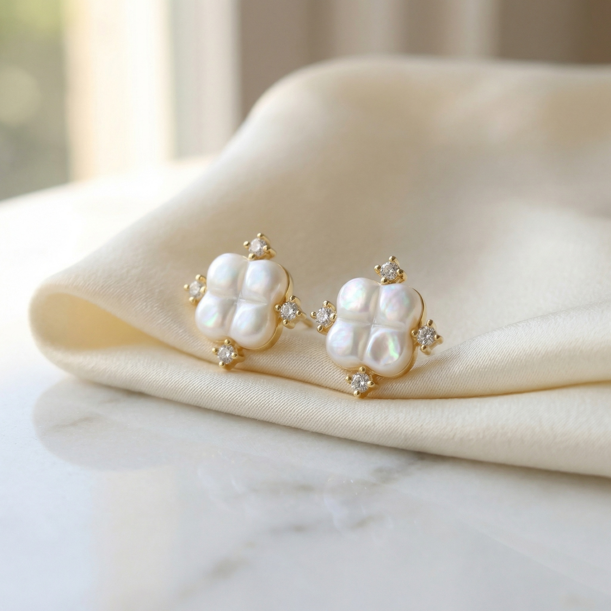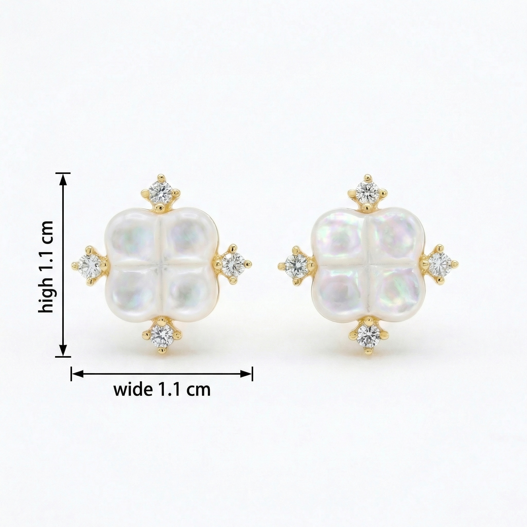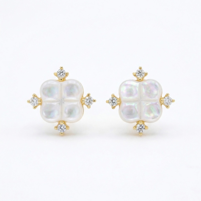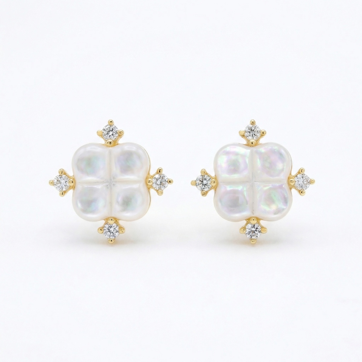 These exquisite stud earrings feature a central quatrefoil-shaped mother-of-pearl, showcasing a captivating iridescent luster that shifts beautifully in the light. Each pearl is meticulously framed by four brilliant-cut gemstones, set at the cardinal points in a warm-toned yellow setting. The combination of the soft, pearlescent sheen and the sharp sparkle of the accent stones creates a sophisticated and timeless aesthetic. Perfect for both everyday elegance and special occasions, these earrings offer a unique take on a classic clover design. The delicate craftsmanship is evident in the precise prongs and the seamless integration of the organic pearl shape with the geometric gemstone arrangement. These studs provide a refined touch of radiance to any ensemble, making them a versatile addition to any fine jewelry collection. | Brand: jewelryodm