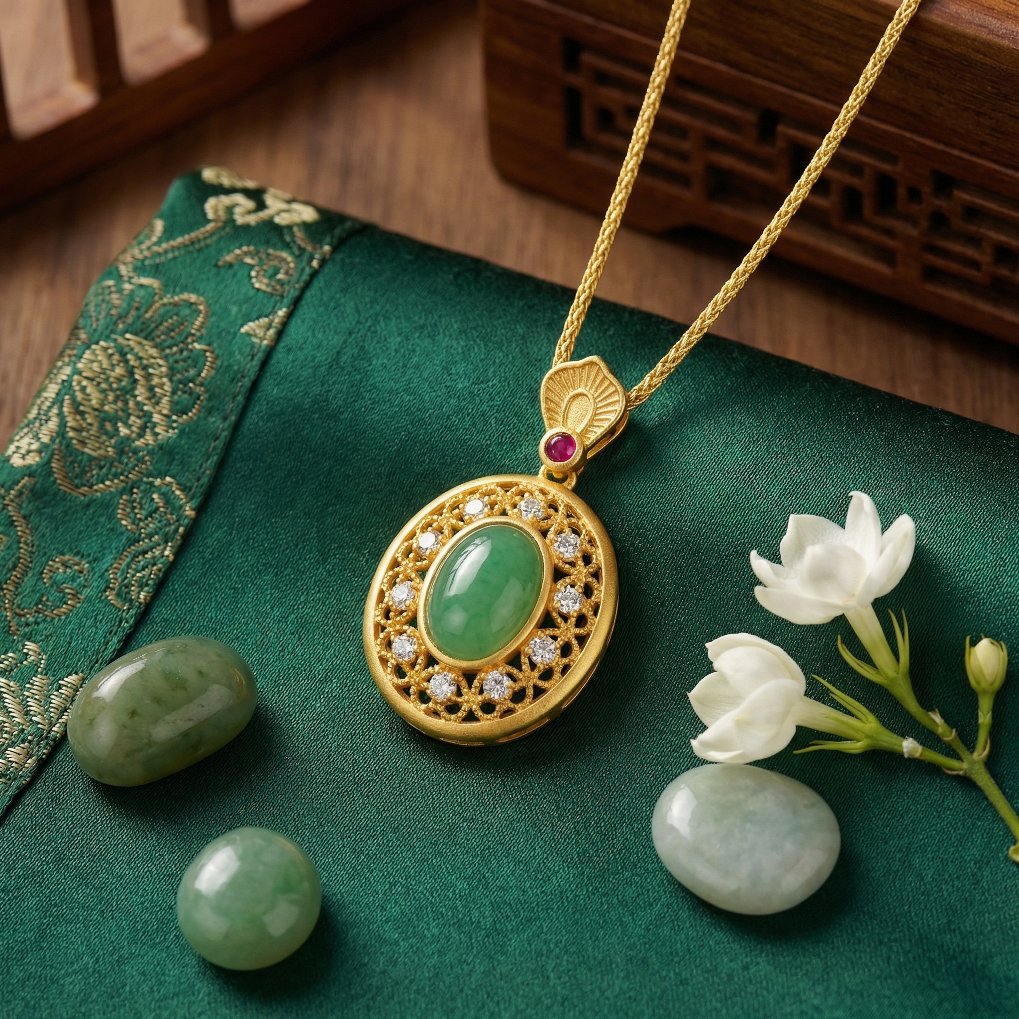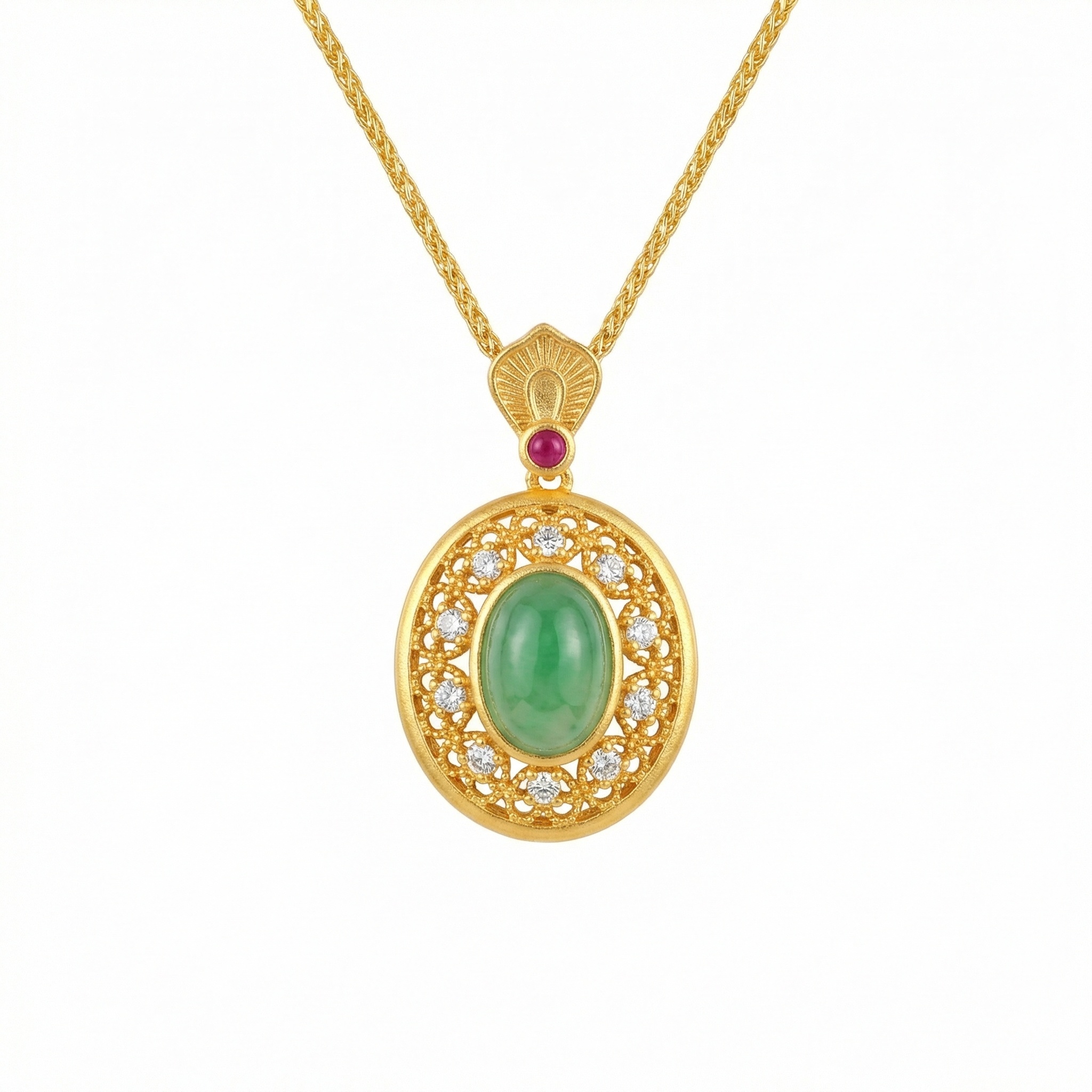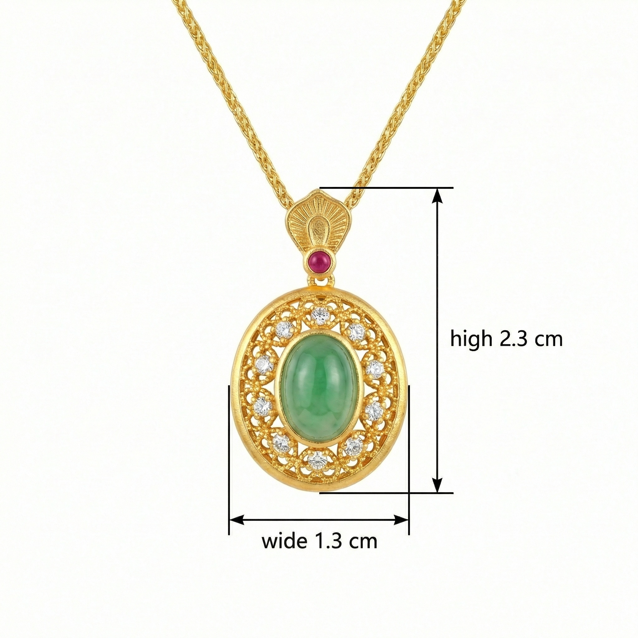 【Delivery Includes】 1 x Necklace featuring Oval Jade centerpiece surrounded by Diamond Halo and Ruby Accents 1 x Elegant Jewelry Gift Box 1 x Cleaning Cloth 【Care Instructions】 1. Store the necklace in a dry, sealed jewelry box or pouch to avoid exposure to air and humidity. 2. Gently wipe with a soft cloth after each wear to maintain its shine and remove oils or residues. 3. Avoid contact with harsh chemicals, perfumes, and cosmetics. 4. Remove the necklace before bathing, swimming, or engaging in strenuous activities. 5. For professional cleaning or inspection, visit a certified jeweler periodically. | Brand: jewelryodm