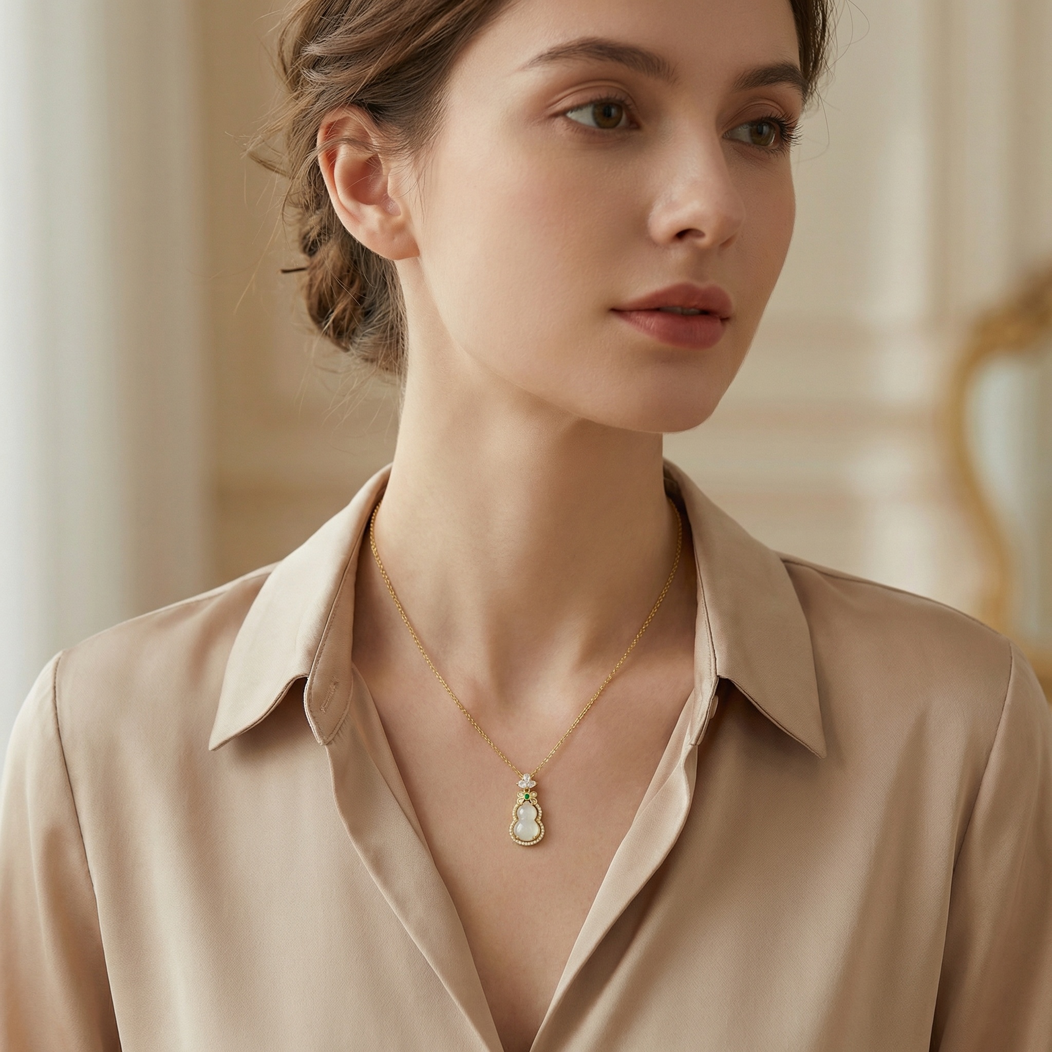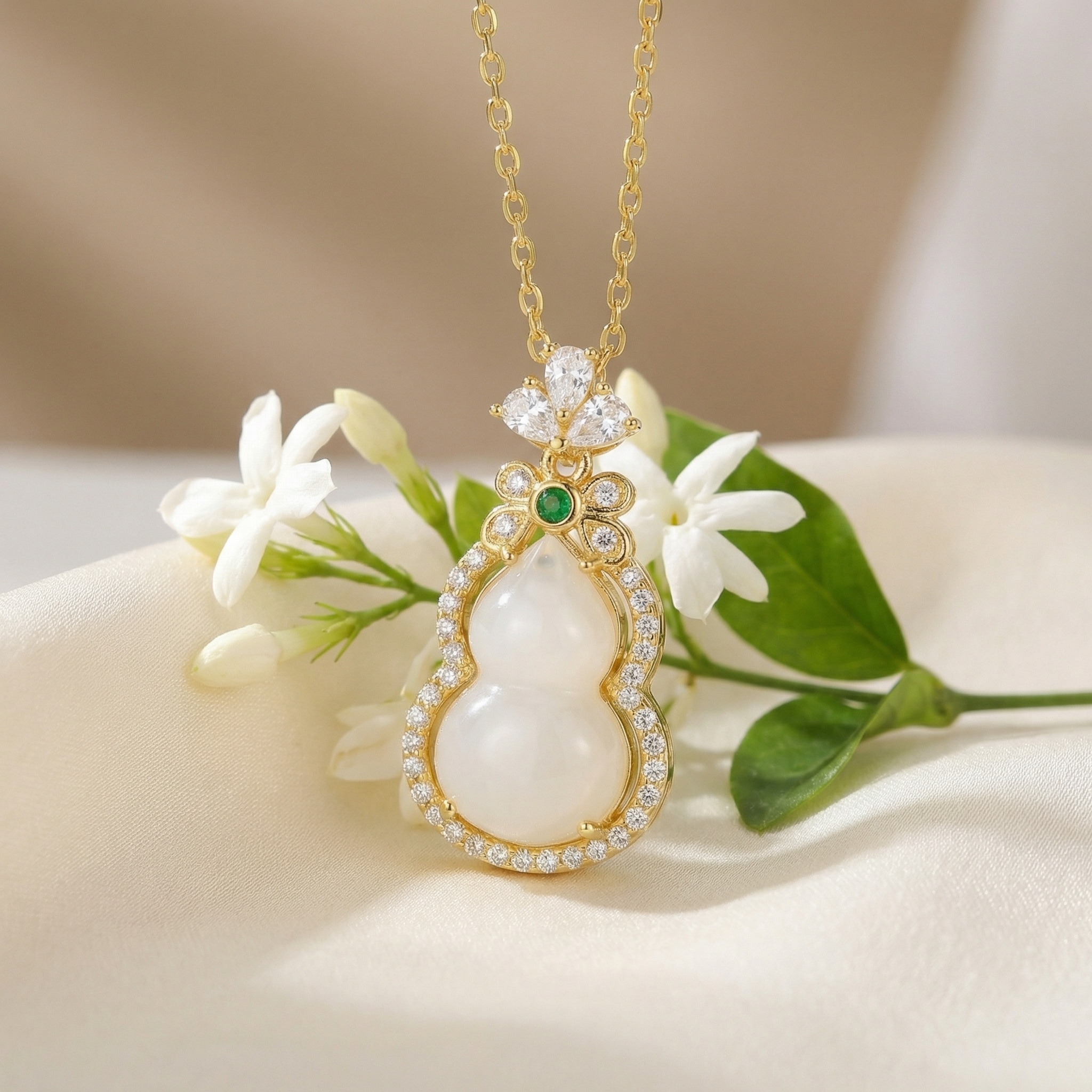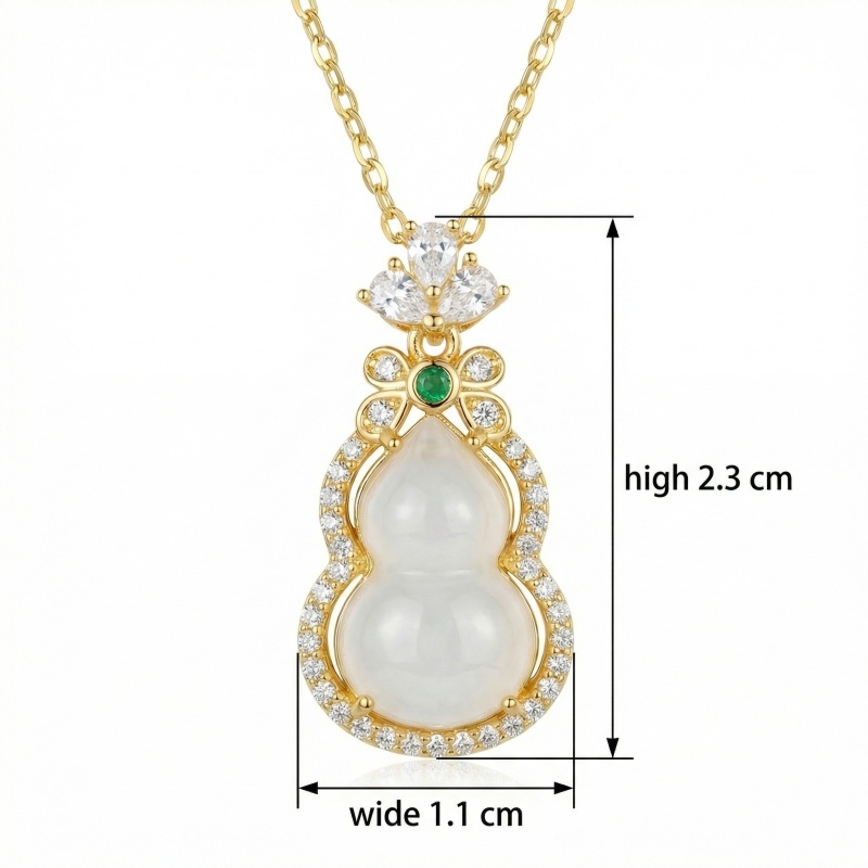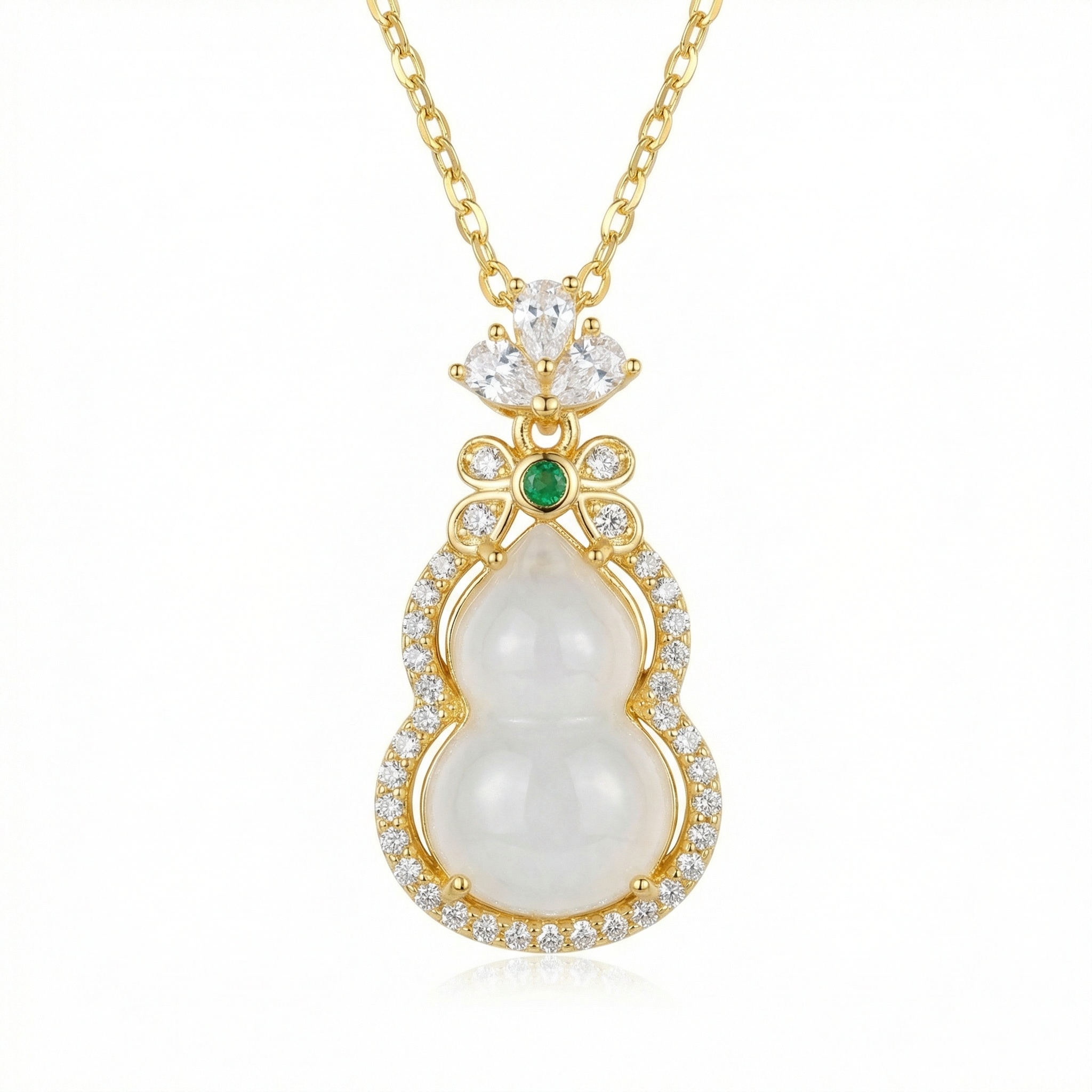 This stunning necklace features a traditional wulu (gourd) pendant, a symbol of health and longevity. The centerpiece is a smooth, milky white jade stone delicately shaped into a double gourd. It is elegantly framed by a halo of shimmering diamonds that catch the light from every angle. At the top of the gourd sits a vibrant green emerald, adding a pop of color and sophistication. The pendant is further adorned with three pear-shaped diamonds arranged like a crown, connecting to a classic link chain. Crafted with meticulous attention to detail, this piece combines cultural heritage with modern luxury. Whether worn for a special occasion or as a meaningful daily accessory, this pendant exudes grace and timeless beauty. It makes a perfect gift for someone special, representing good fortune and prosperity. | Brand: jewelryodm