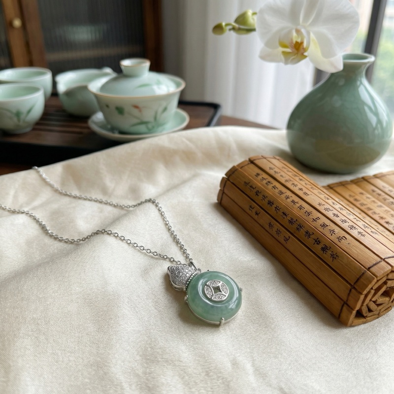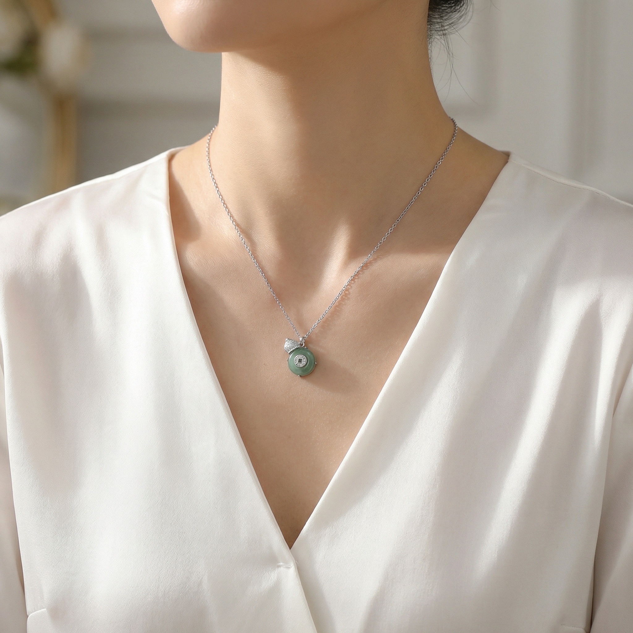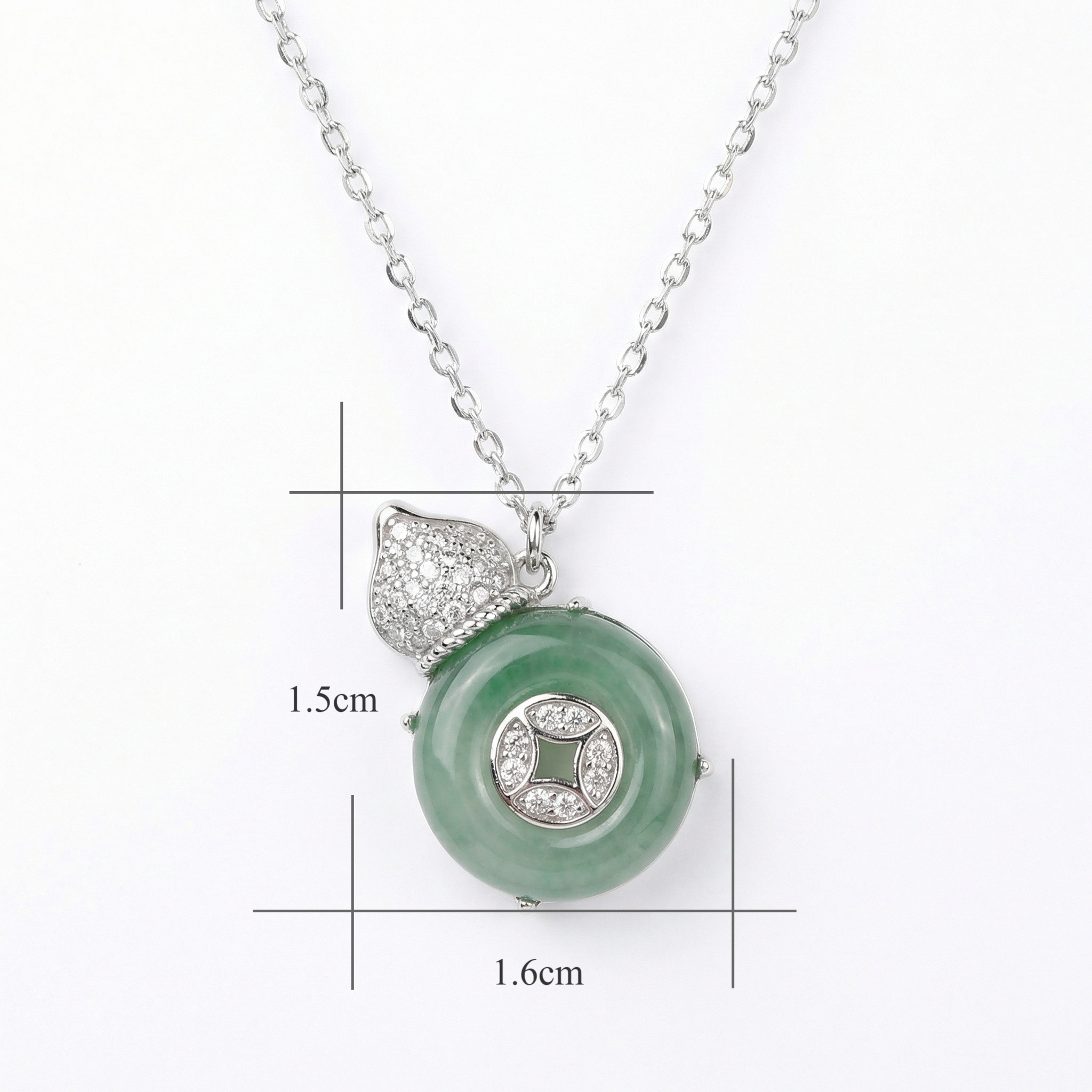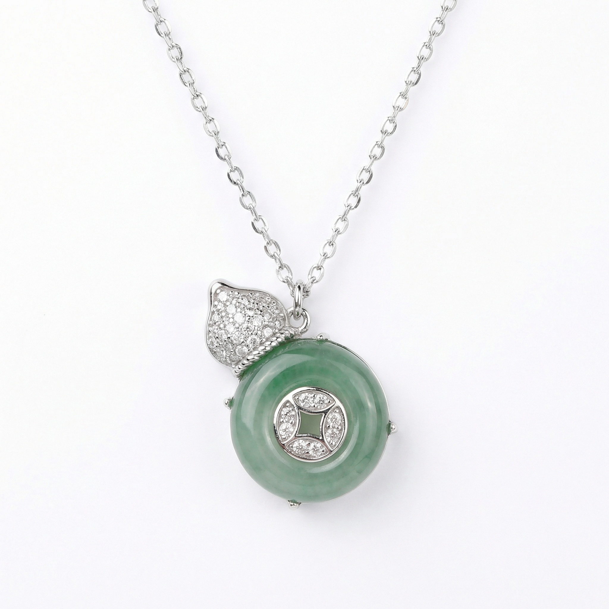 This exquisite pendant necklace features a stunning combination of traditional Chinese symbolism and modern luxury. At its heart is a translucent green jadeite ring, showcasing a beautiful, natural mottled texture. Suspended above the jade is a meticulously crafted calabash (hulu) shape, adorned with a pavé of shimmering brilliant-cut diamonds. The center of the jade ring contains a stylized ancient coin motif, also set with diamonds, representing wealth and prosperity. The entire piece is elegantly set in polished white metal and hangs from a delicate matching cable chain. The blend of vibrant green jade and the brilliance of diamonds creates a timeless piece that symbolizes luck, longevity, and elegance. Perfect for special occasions or as a meaningful gift, this necklace is a masterpiece of fine jewelry craftsmanship that beautifully bridges cultural heritage with contemporary style. | Brand: jewelryodm
