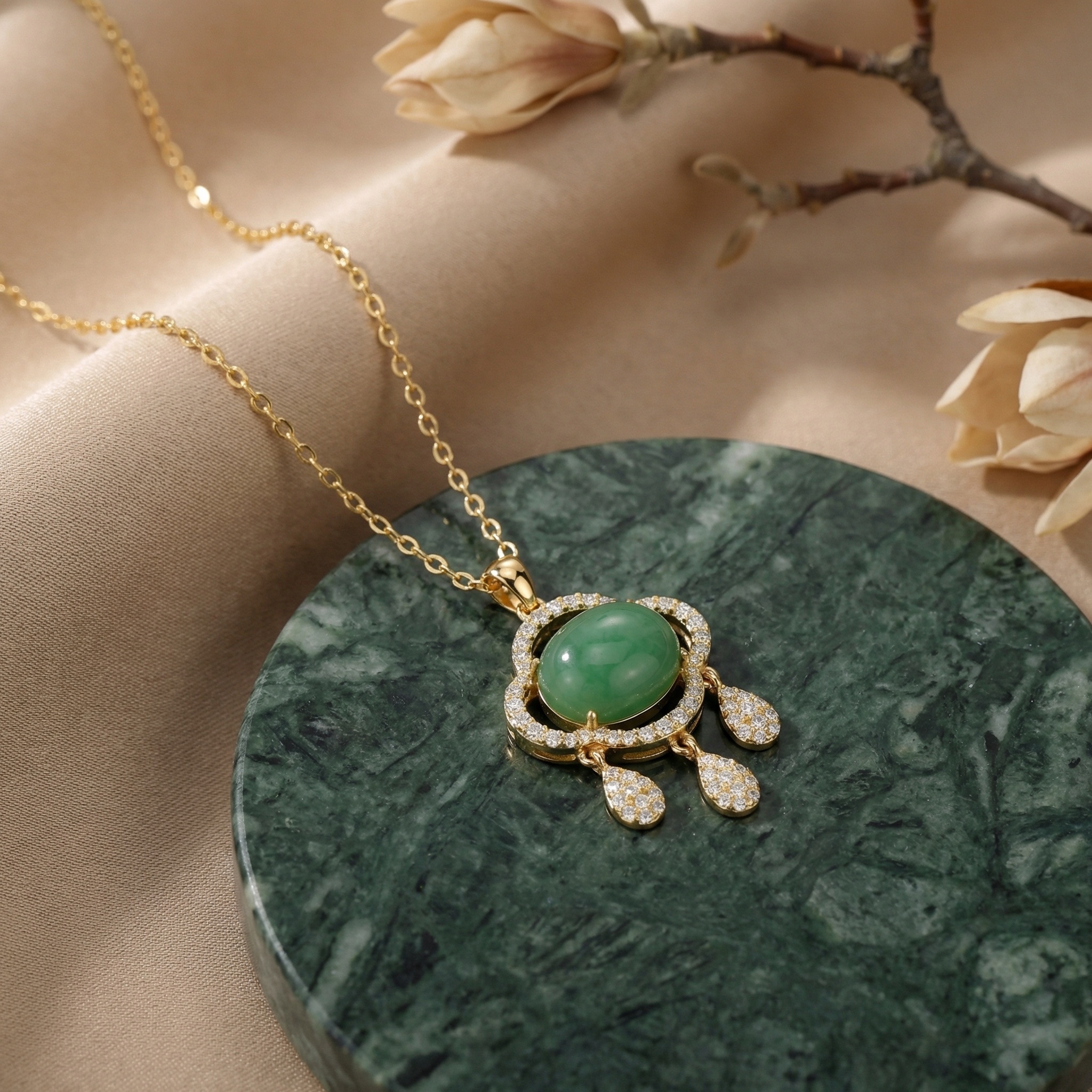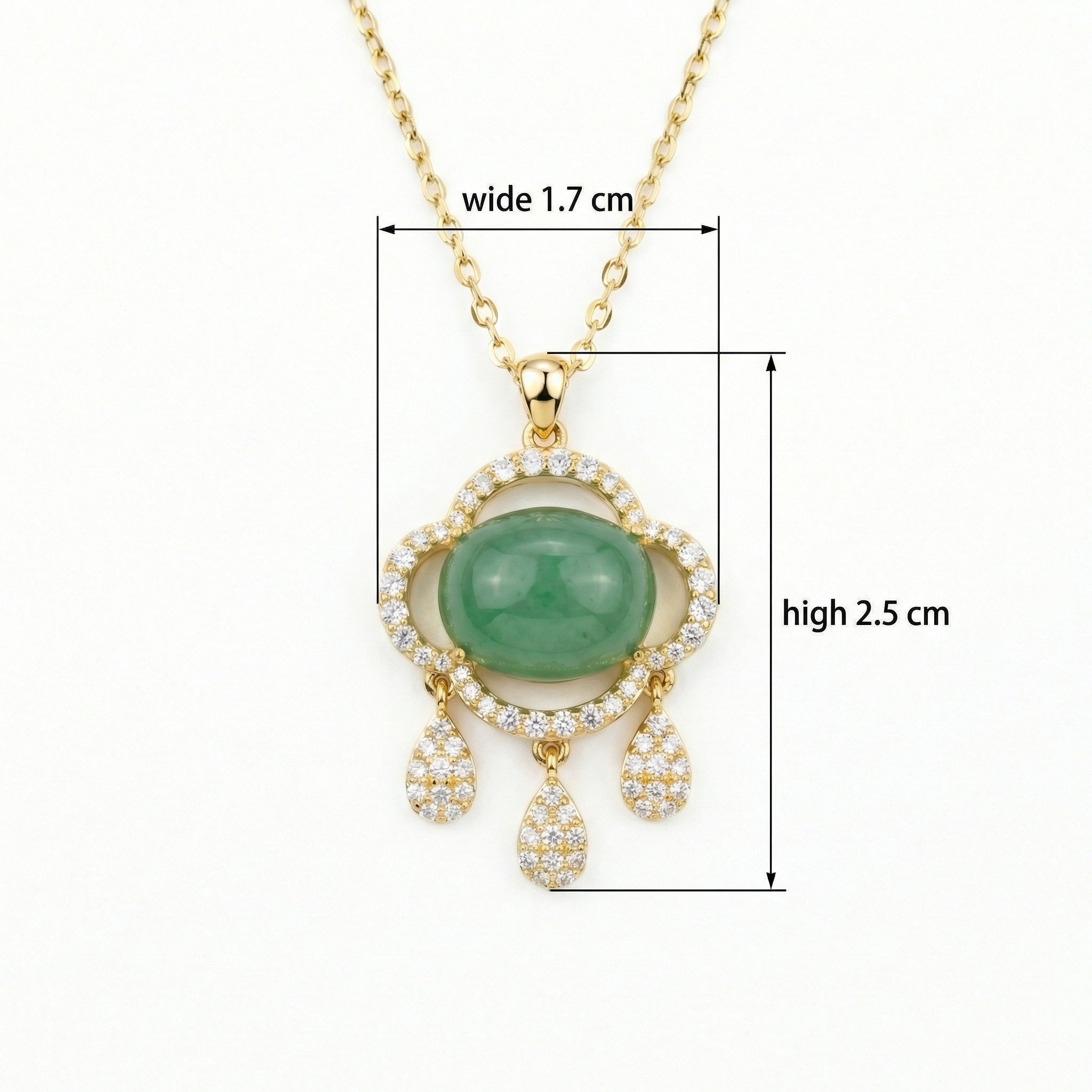 This exquisite jewelry piece features a translucent green jadeite cabochon at its heart, radiating a serene and timeless beauty. The central stone is elegantly framed by a decorative border inspired by traditional Ruyi motifs, meticulously adorned with shimmering pave-set stones. From the base of the ornate pendant hang three delicate teardrop-shaped charms, each encrusted with brilliant accents that catch the light with every movement. Suspended from a slender and polished link chain, this necklace combines classic elegance with contemporary craftsmanship. The vibrant green hue of the jadeite contrasts beautifully with the warm metallic tones and the brilliant white stones, making it a sophisticated choice for special occasions or daily elegance. This piece captures the essence of refined luxury and cultural significance in one stunning design, perfect for adding a touch of grace to any ensemble. | Brand: jewelryodm
