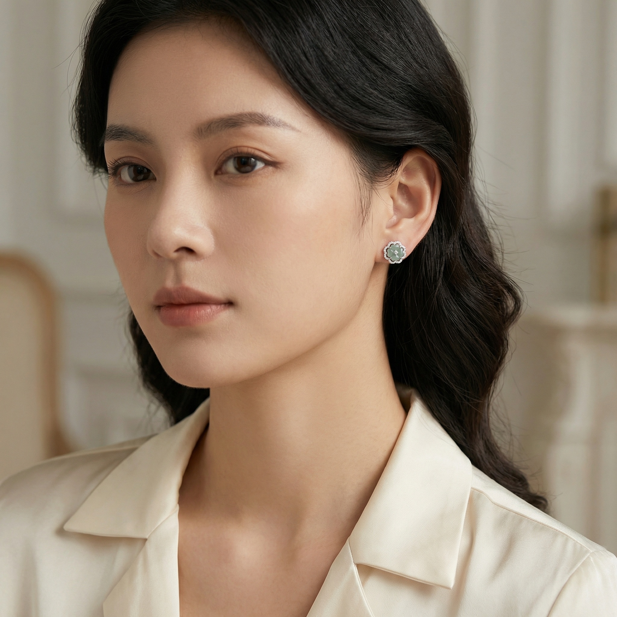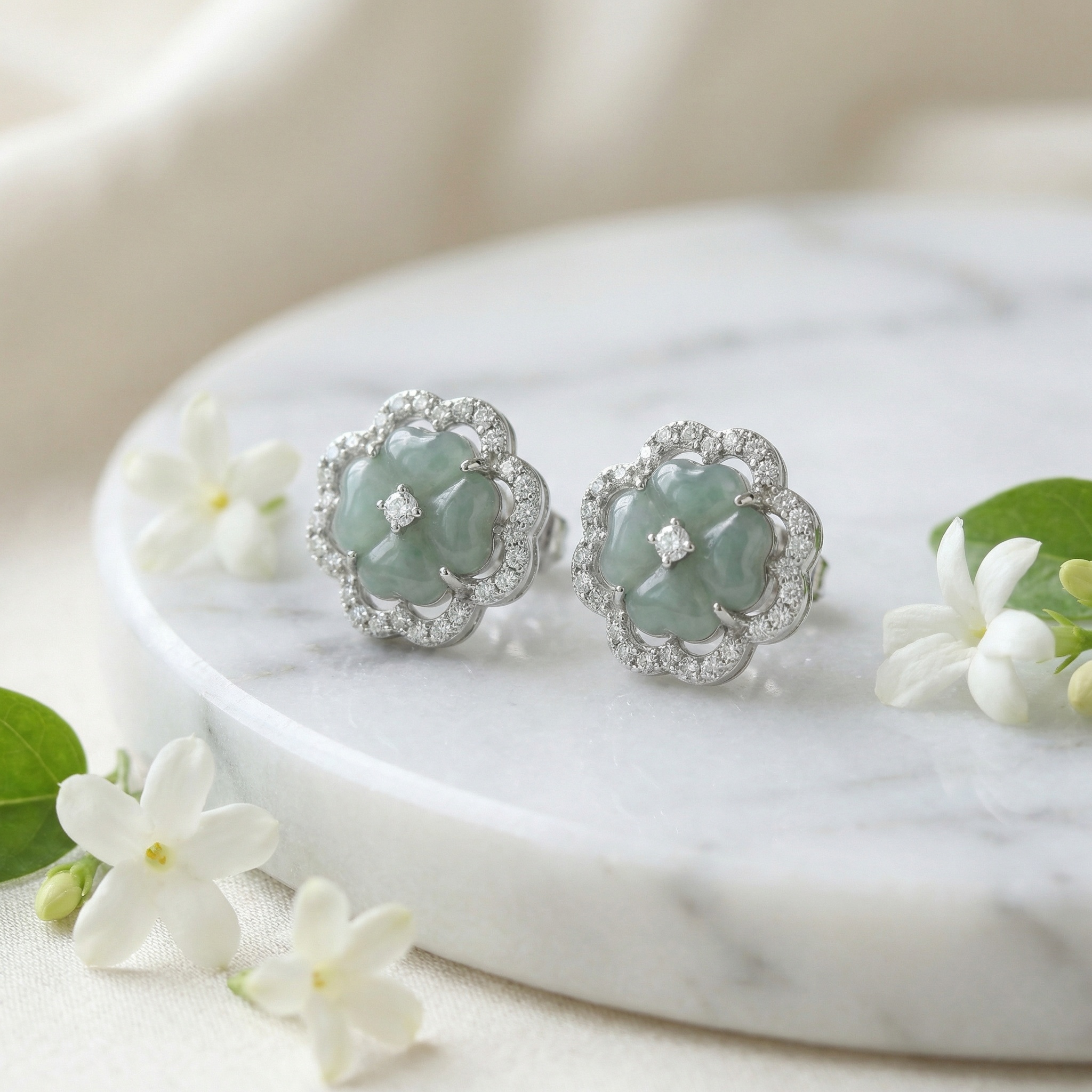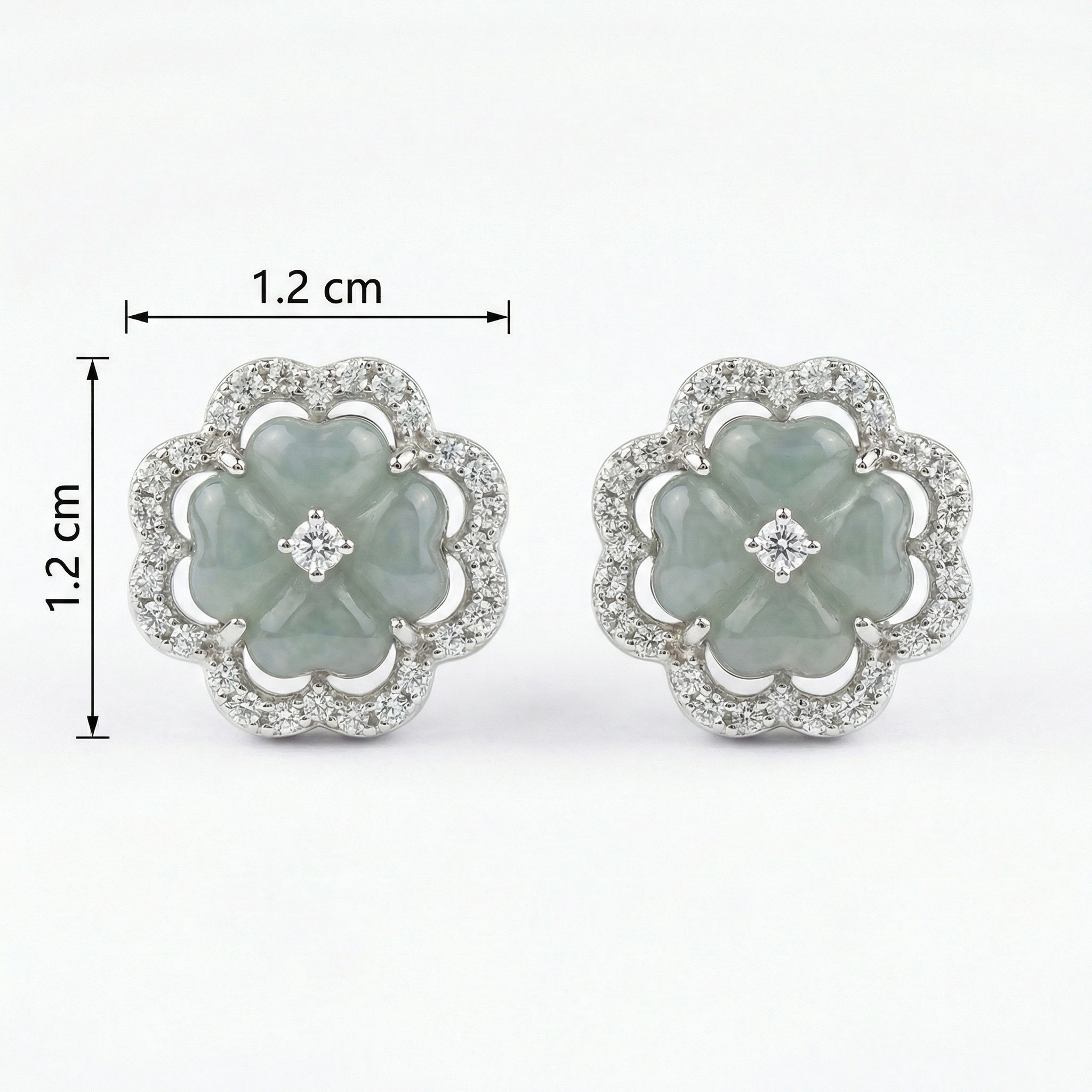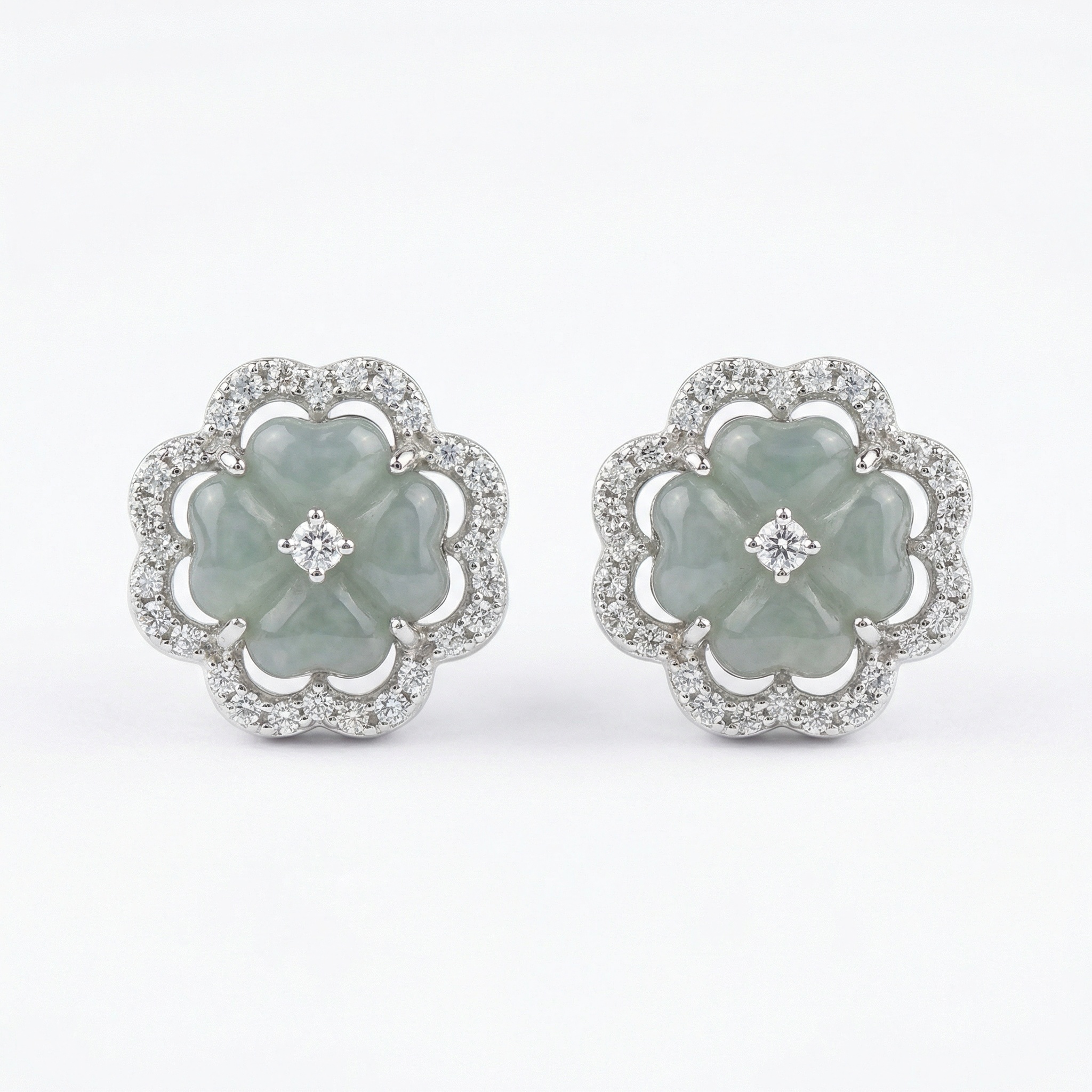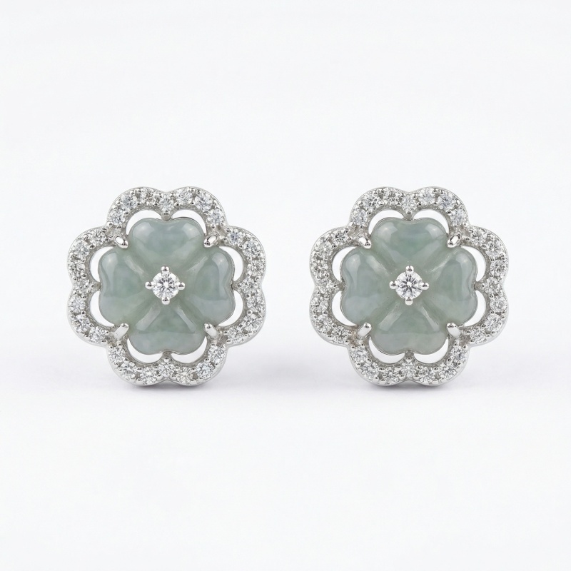 These exquisite stud earrings feature a central carved jadeite piece in a delicate four-petal floral design. The jade boasts a soft, translucent light green hue that exudes serenity and elegance. Each floral centerpiece is beautifully framed by an ornate halo of shimmering round-cut stones, adding a touch of brilliance to the classic aesthetic. A single sparkling accent is meticulously set in the heart of each flower using a four-prong mount. Crafted with fine silver-toned metal, these earrings combine traditional jade artistry with modern luxury. Their timeless appeal makes them a perfect choice for weddings, formal galas, or as a sophisticated gift. The harmonious blend of cool-toned metal and the soft, earthy jade creates a refined look suitable for any jewelry collection. | Brand: jewelryodm