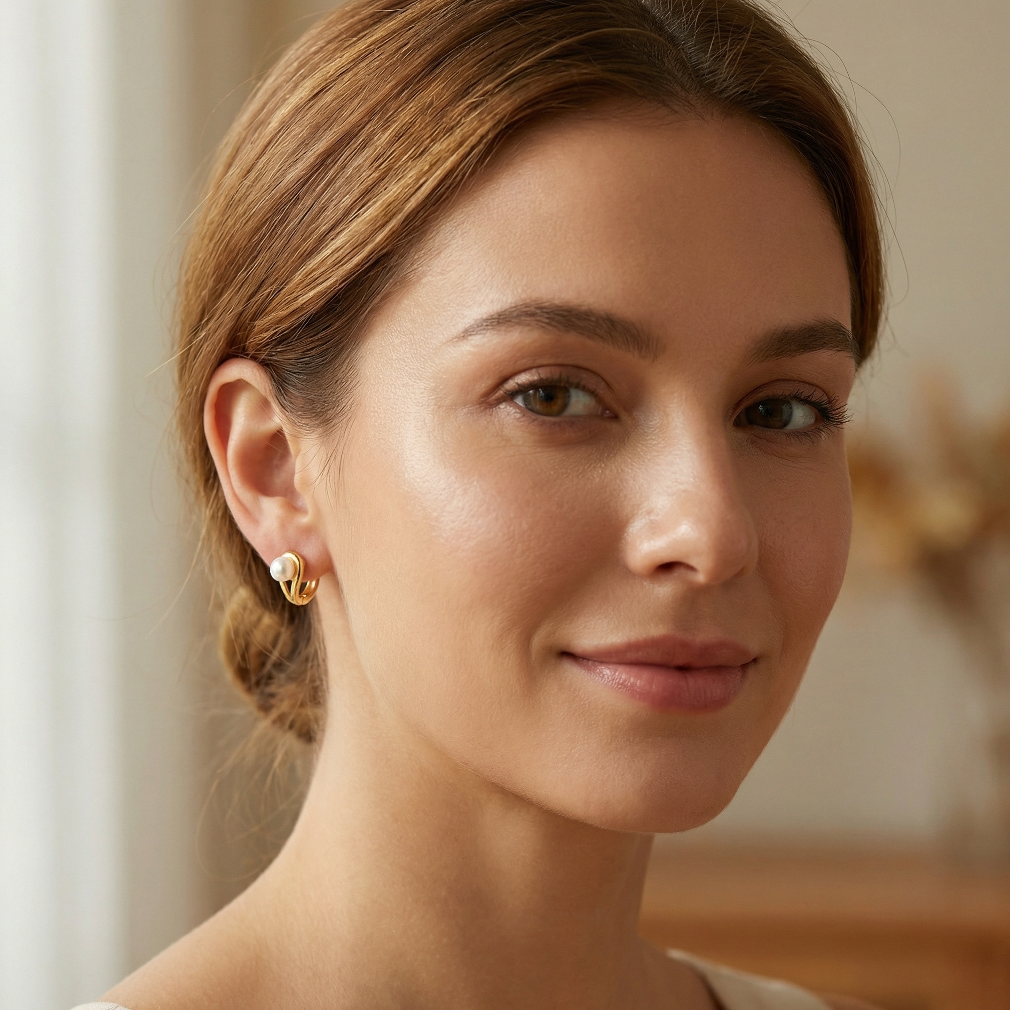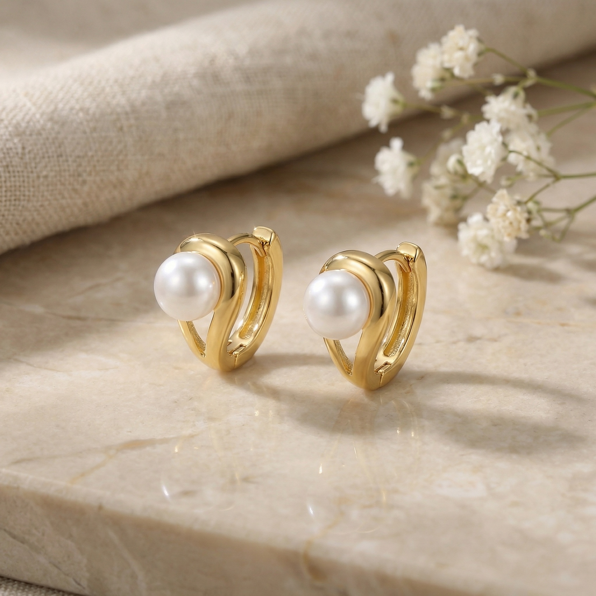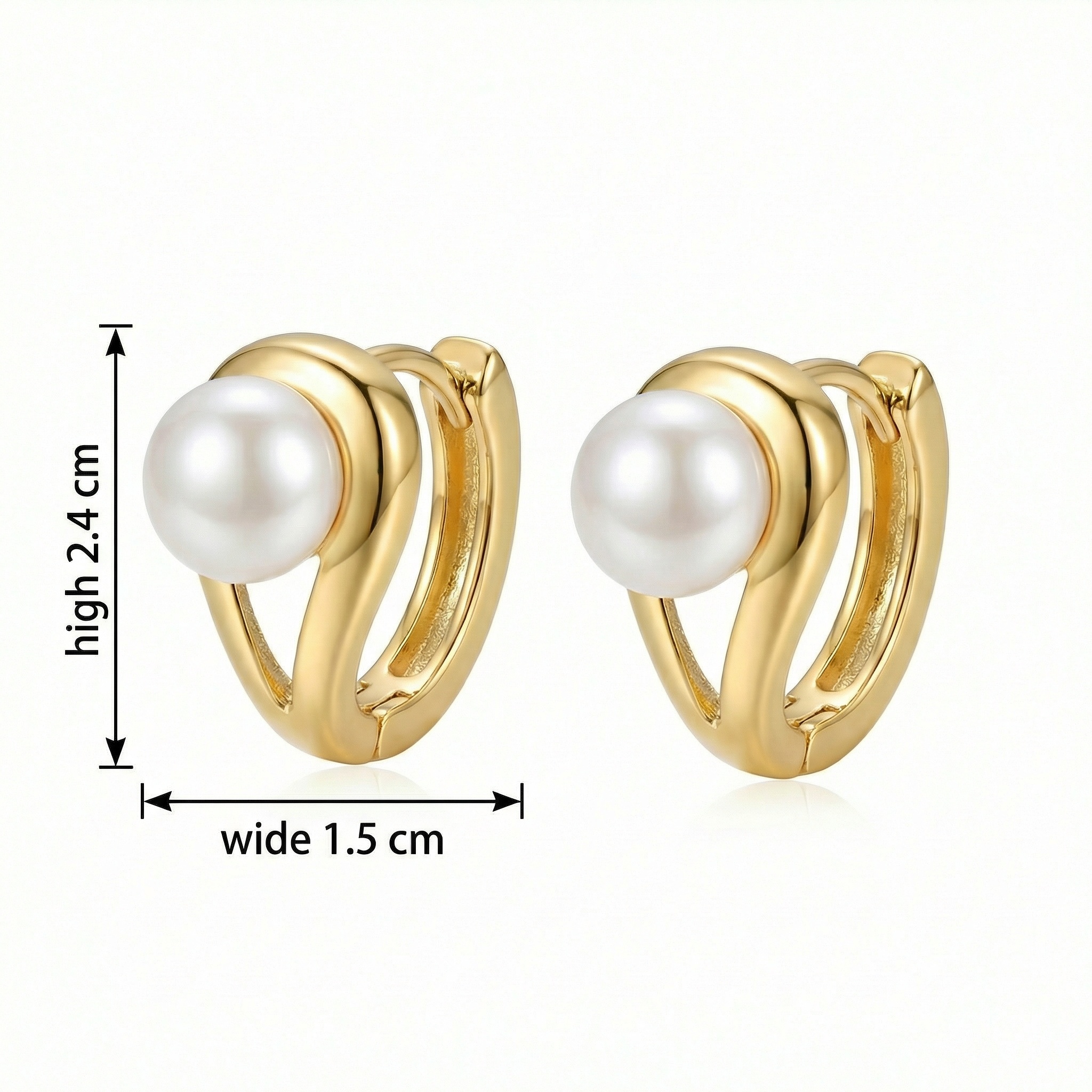 These sophisticated huggie hoop earrings showcase a perfect blend of classic elegance and contemporary design. Each earring features a radiant, high-luster white pearl nestled within a gracefully curved metallic frame. The polished yellow-toned finish adds a touch of warmth and luxury to the piece, making it a versatile accessory for any occasion. Designed for comfort and security, these hoops come with a sturdy snap-closure mechanism, ensuring they stay in place throughout the day. Whether you are dressing up for a special event or adding a subtle glow to your everyday look, these pearl hoops are the ideal choice. Their minimalist yet artistic silhouette makes them a thoughtful gift for someone special or a timeless addition to your own jewelry collection. Experience the charm of pearls redefined in a modern, stylish setting. | Brand: jewelryodm